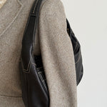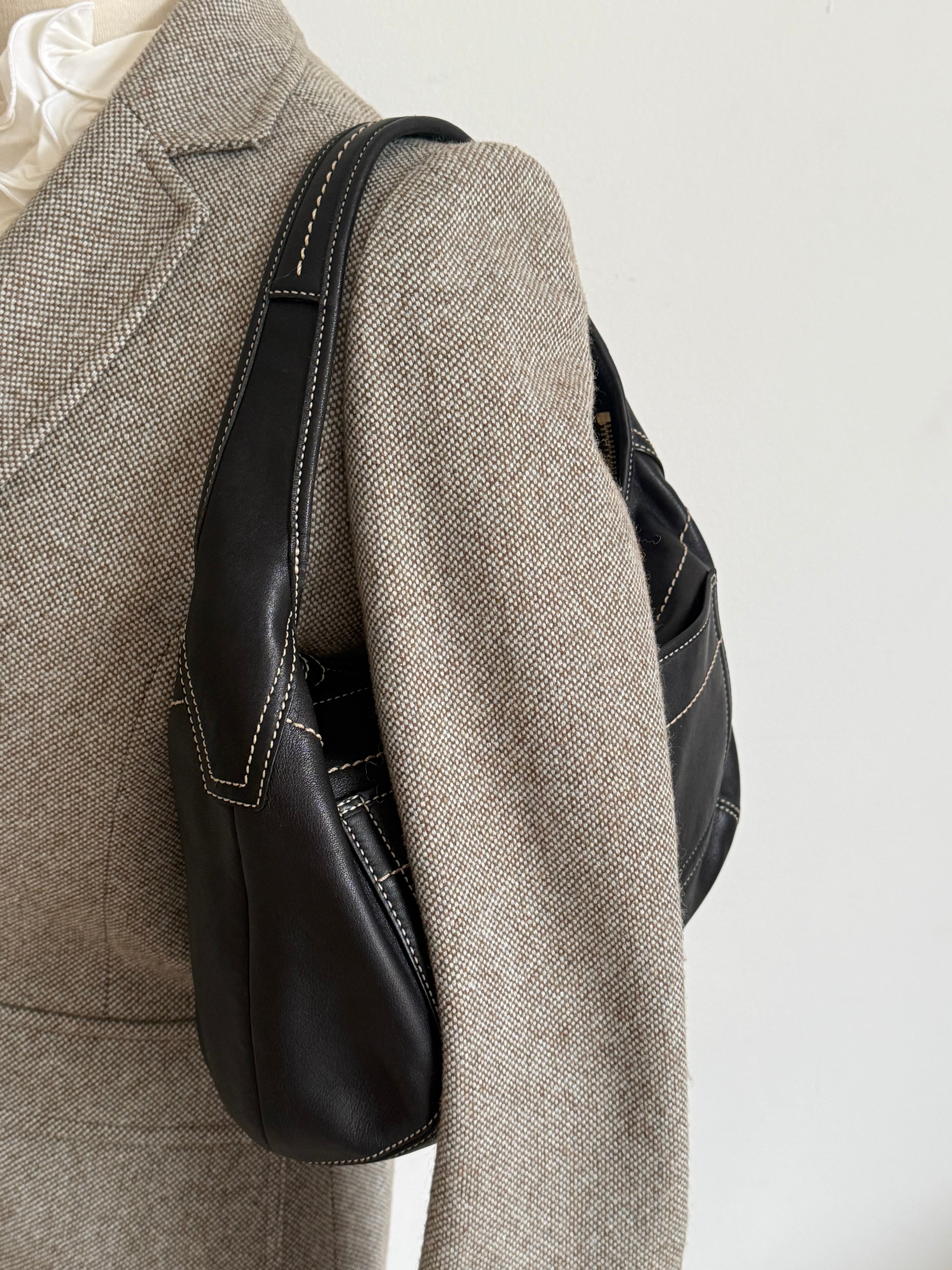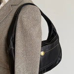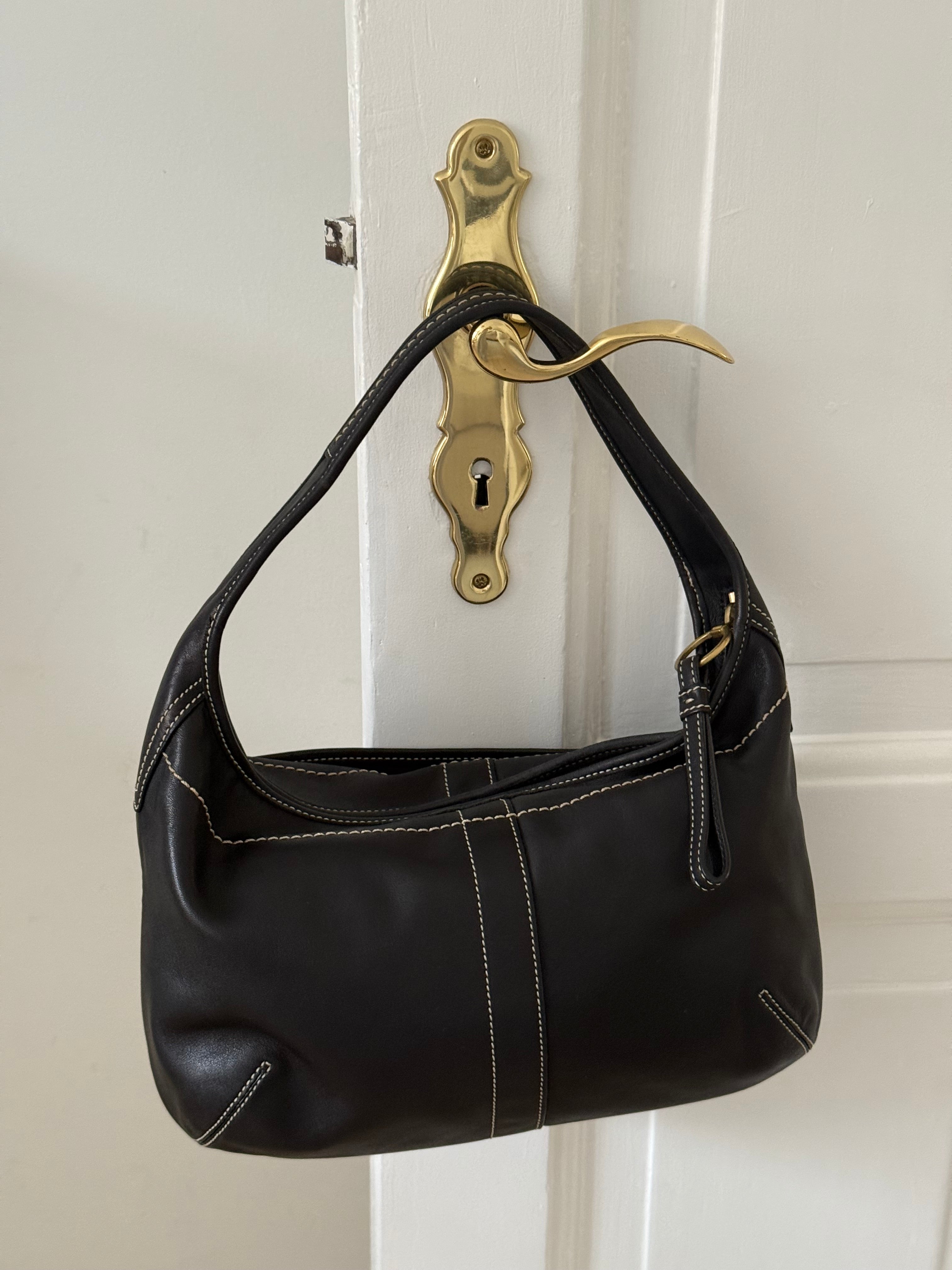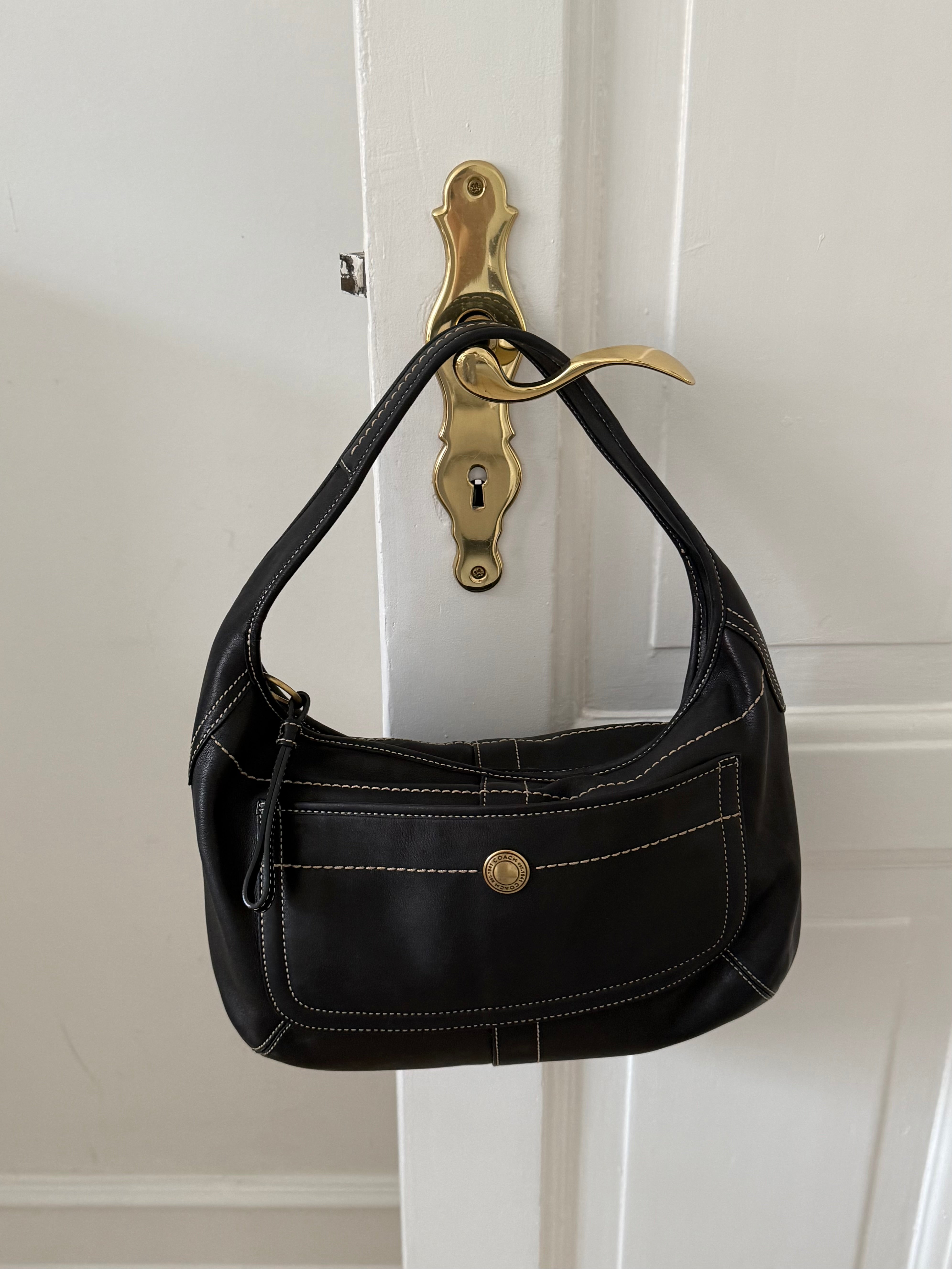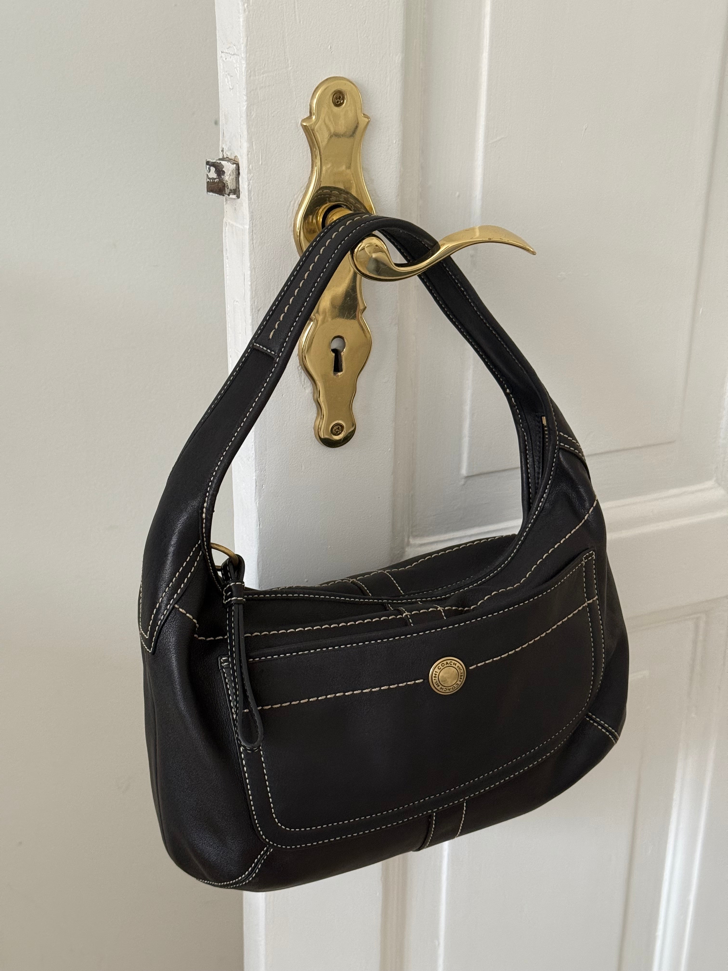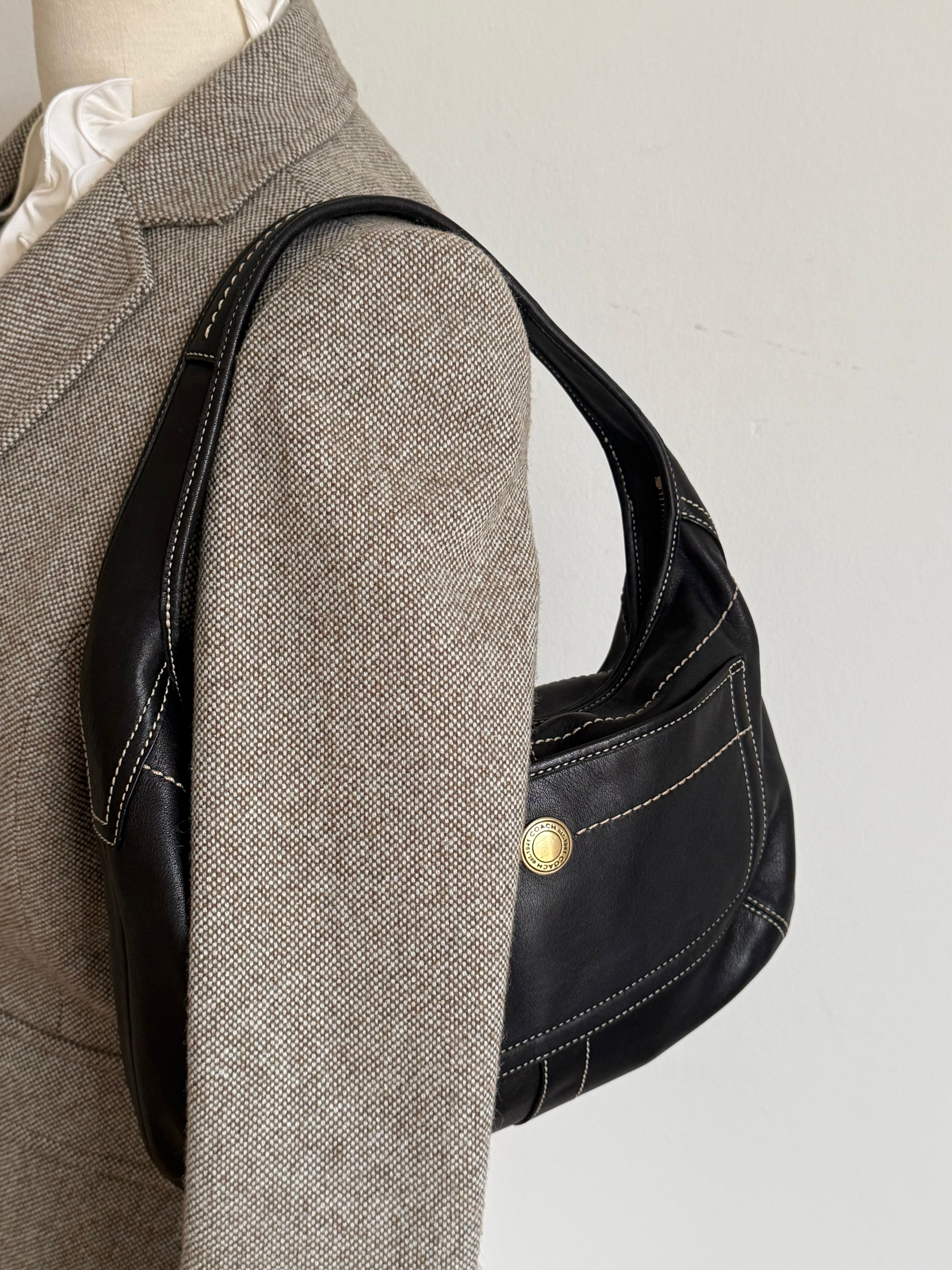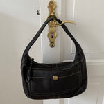 Vintage Coach shoulder leather bag in black leather with creme stitching and with gold-tone hardware.