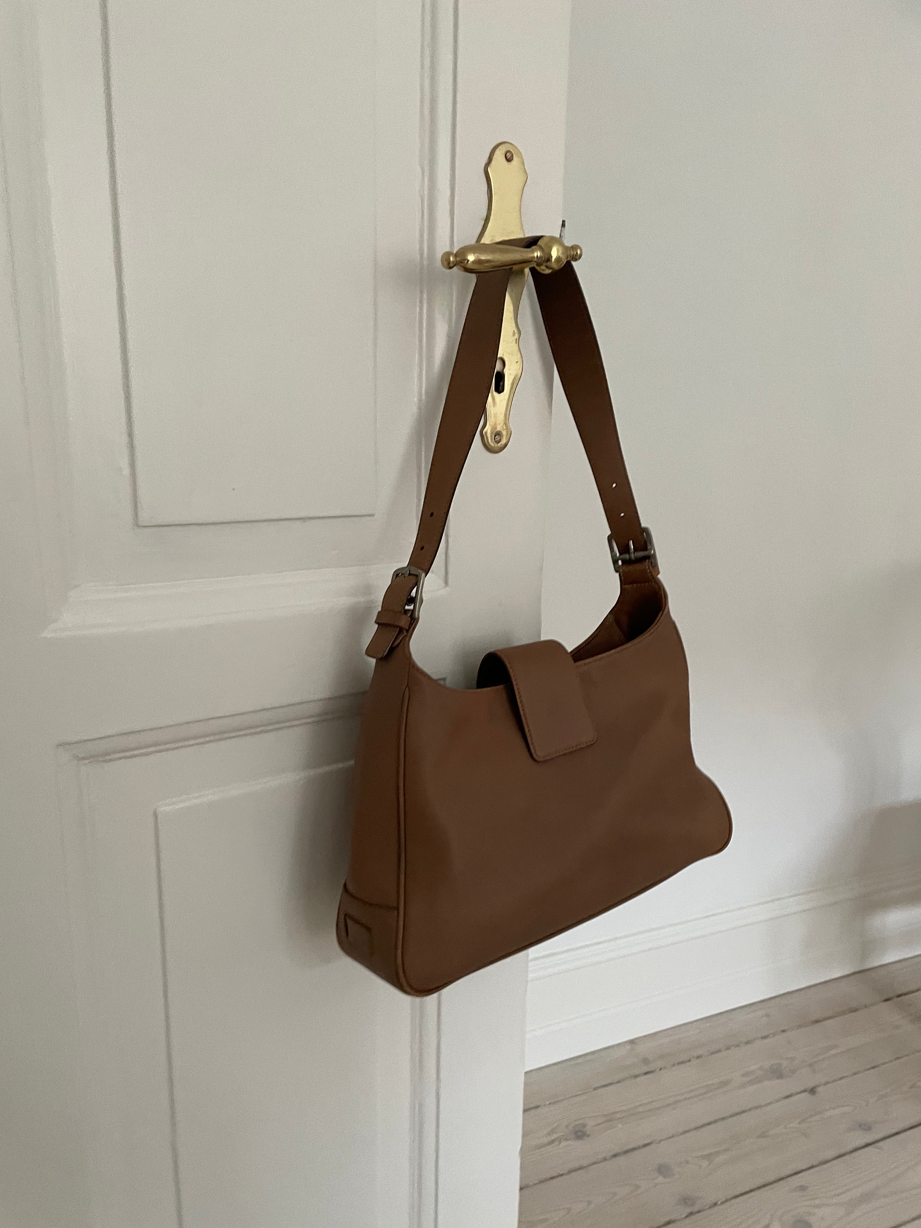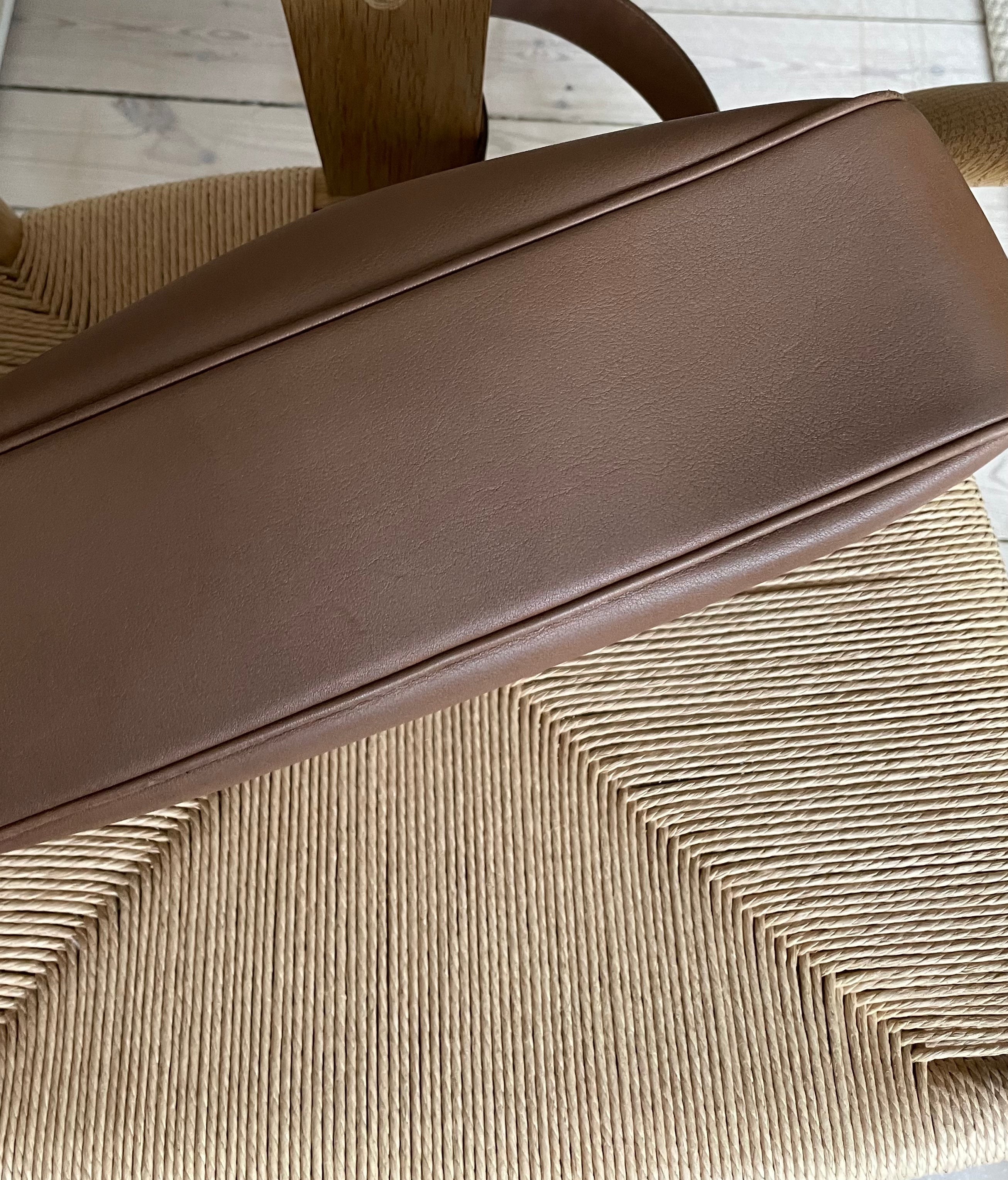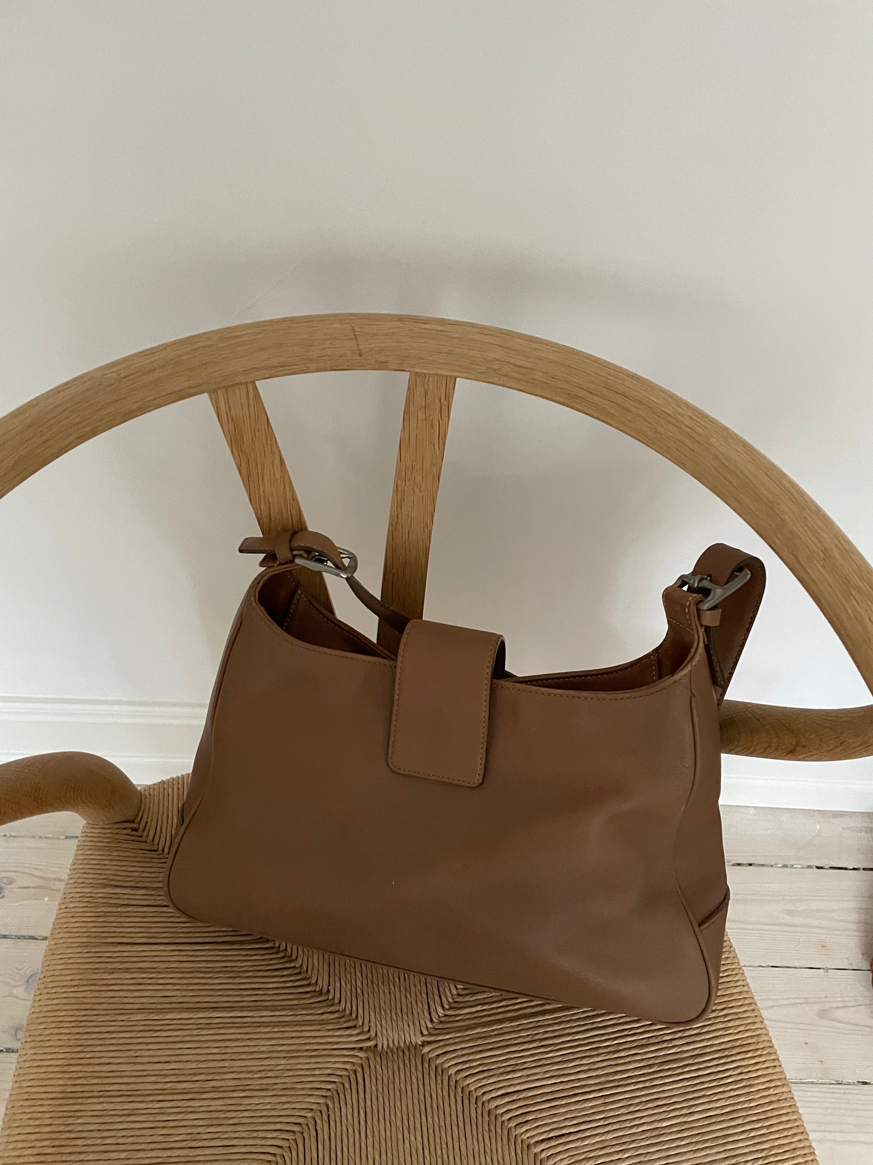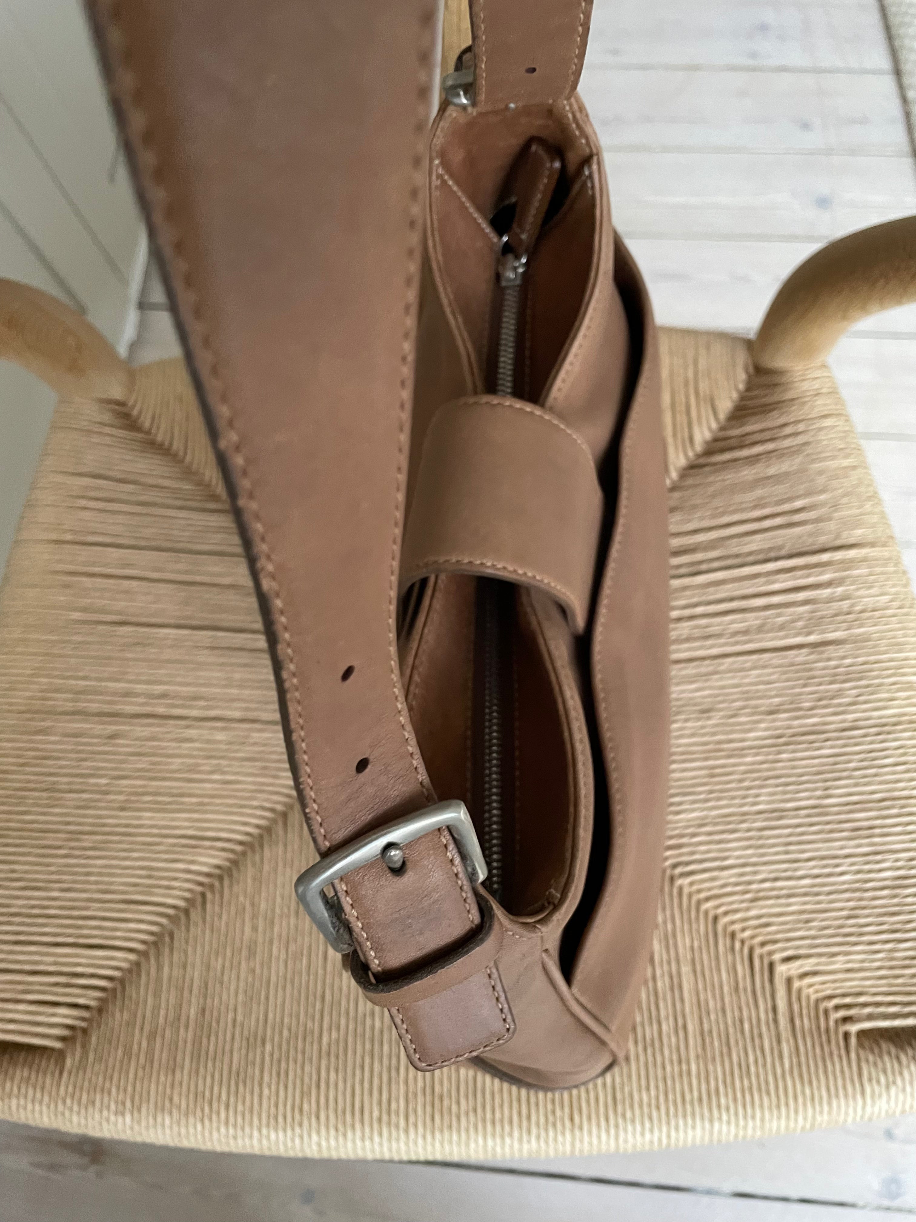 Classic Coach Hampton Hobo Shoulder Bag in brown leather with silver hardware, white stitching, and one exterior pocket. The bag is in a good vintage condition.