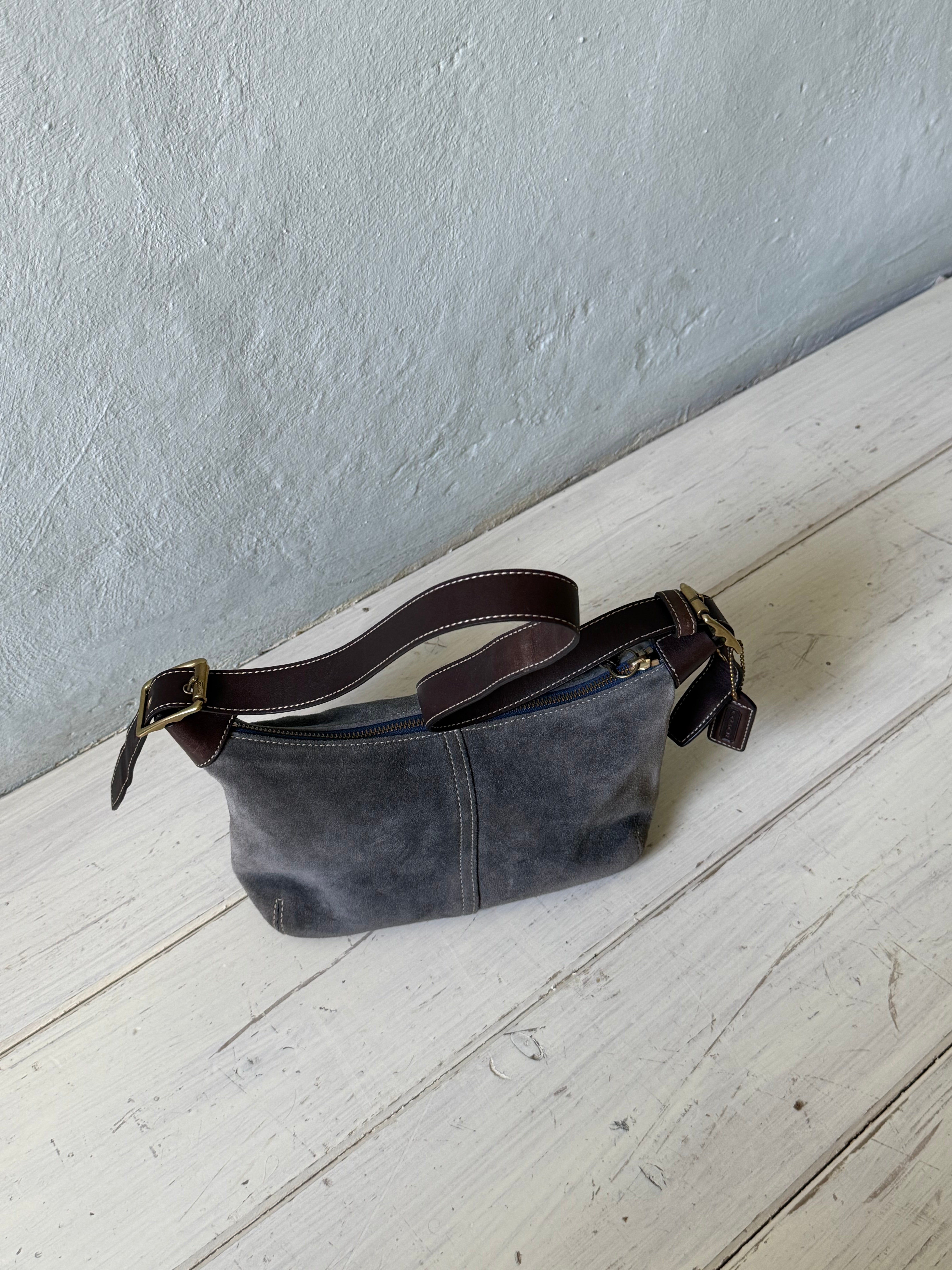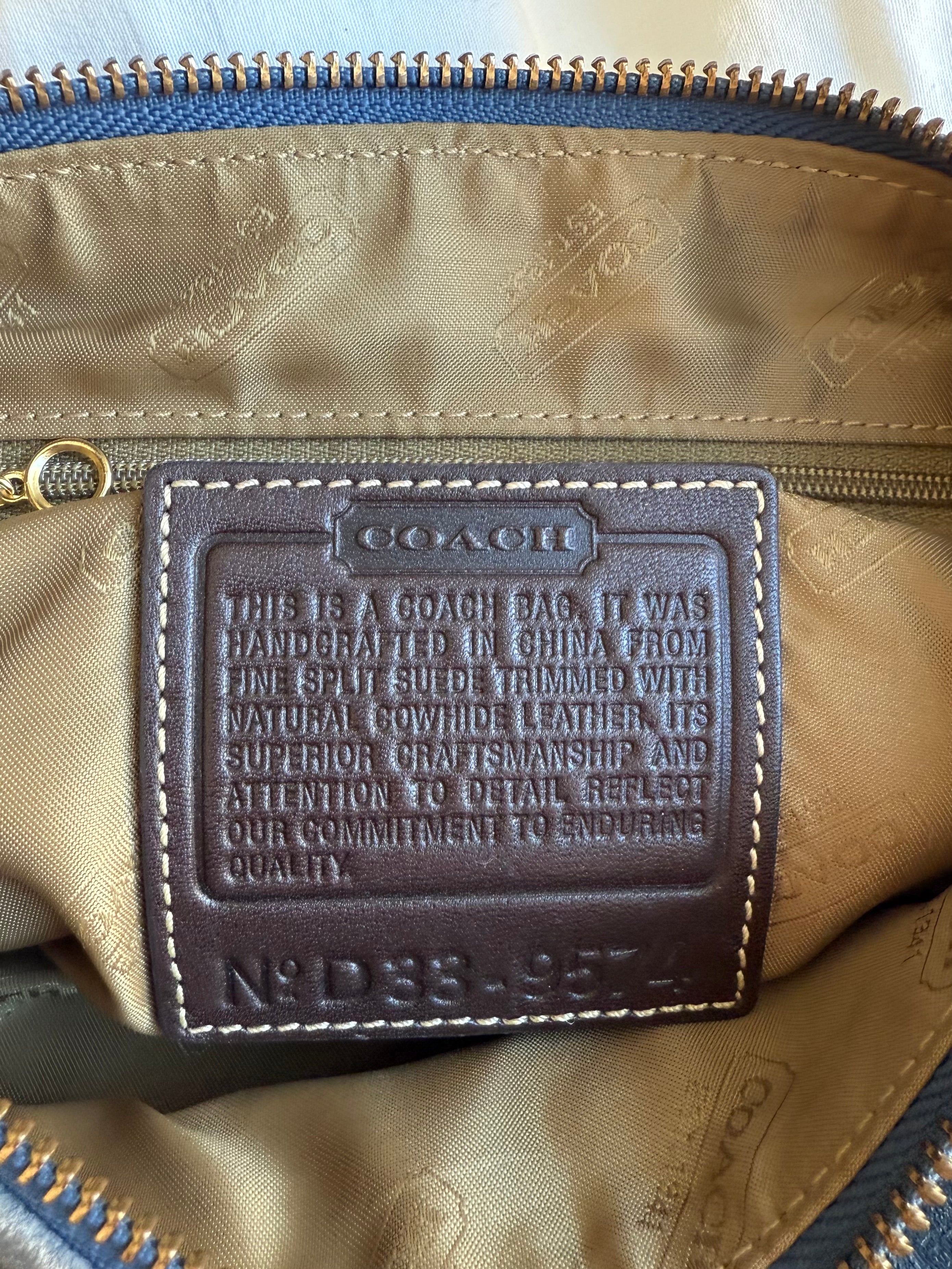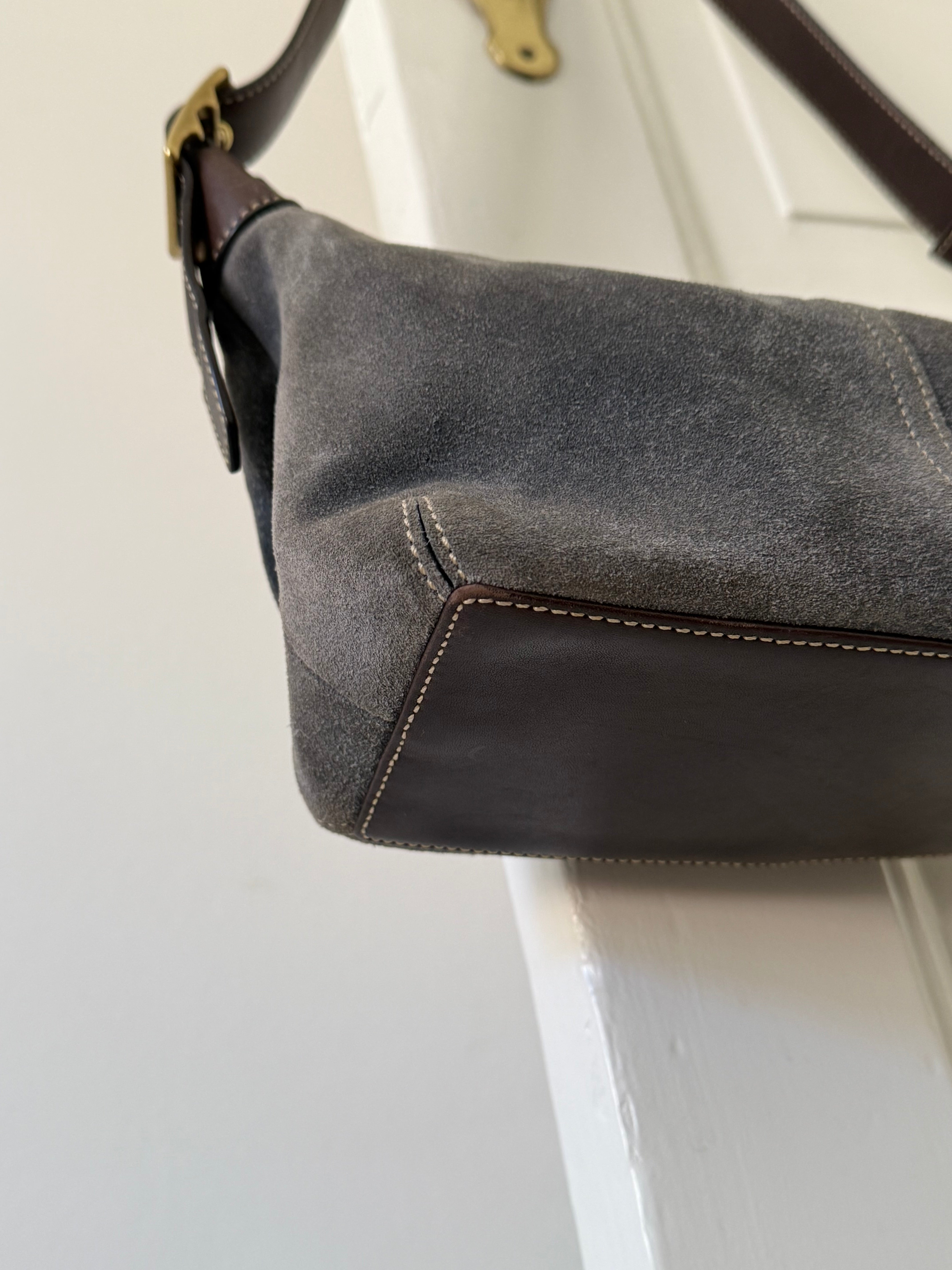 Vintage Coach suede bag with brown leather straps, white stitching, and gold-tone hardware. Features an inner pocket that can be securely closed.
