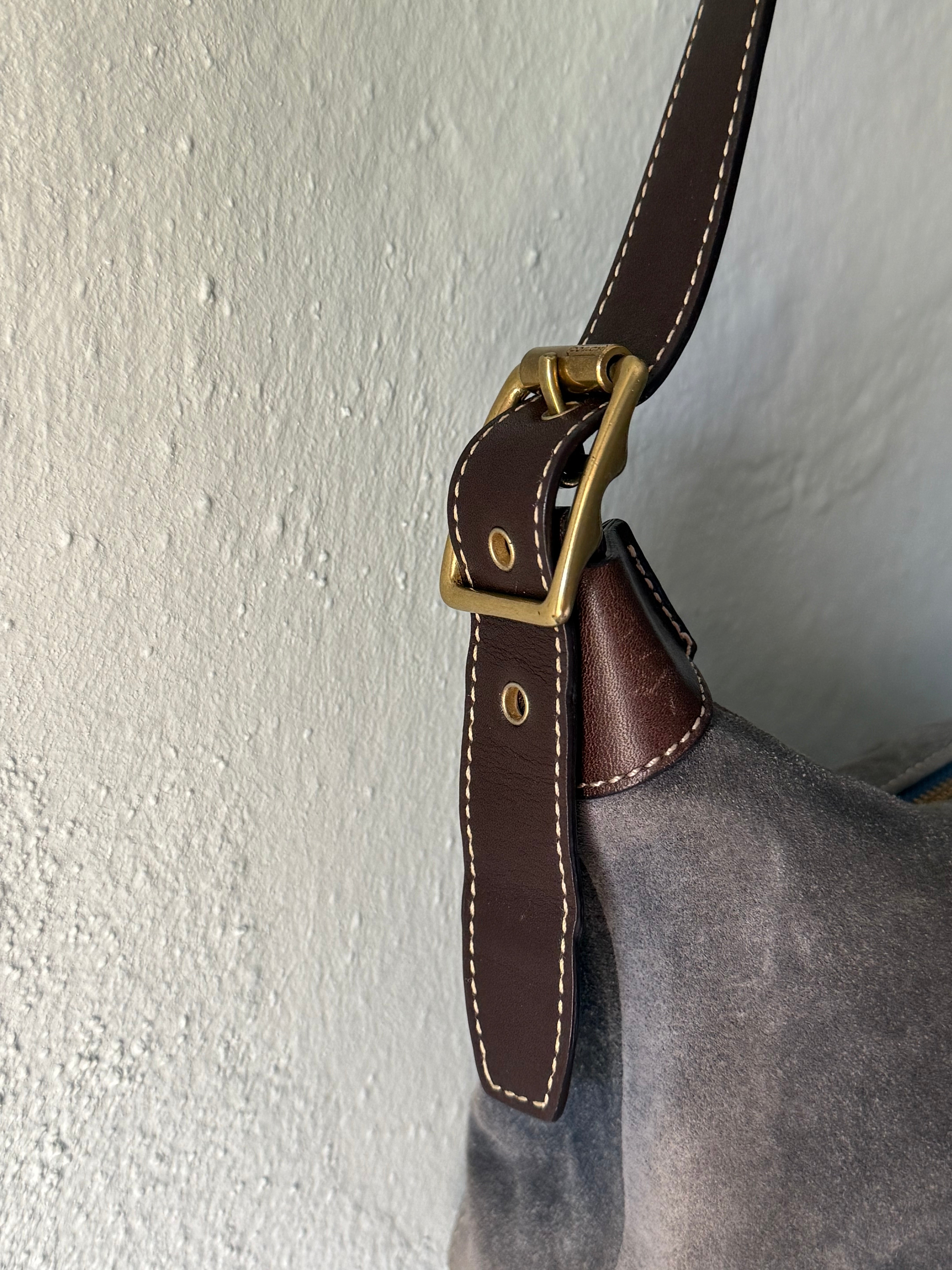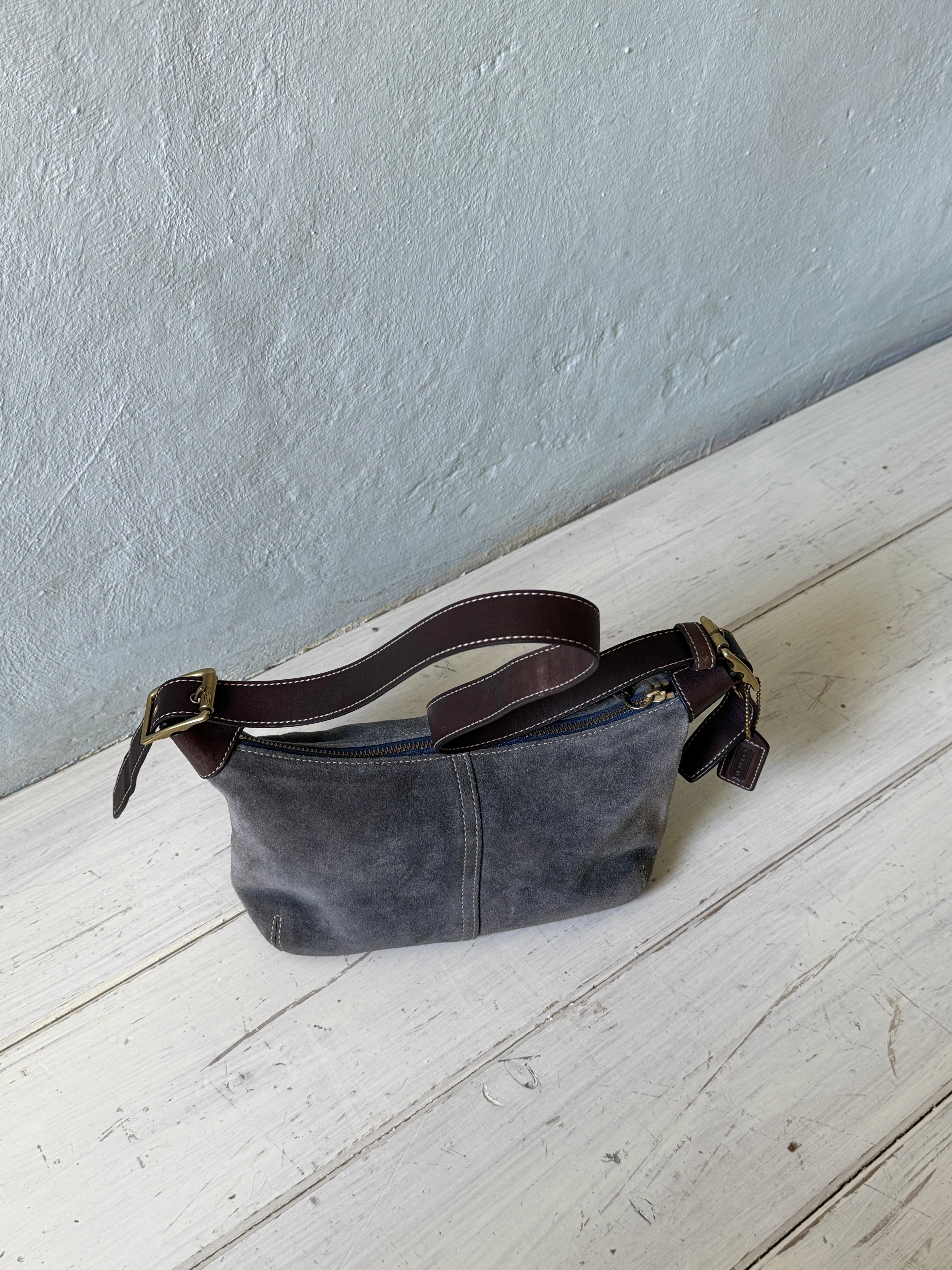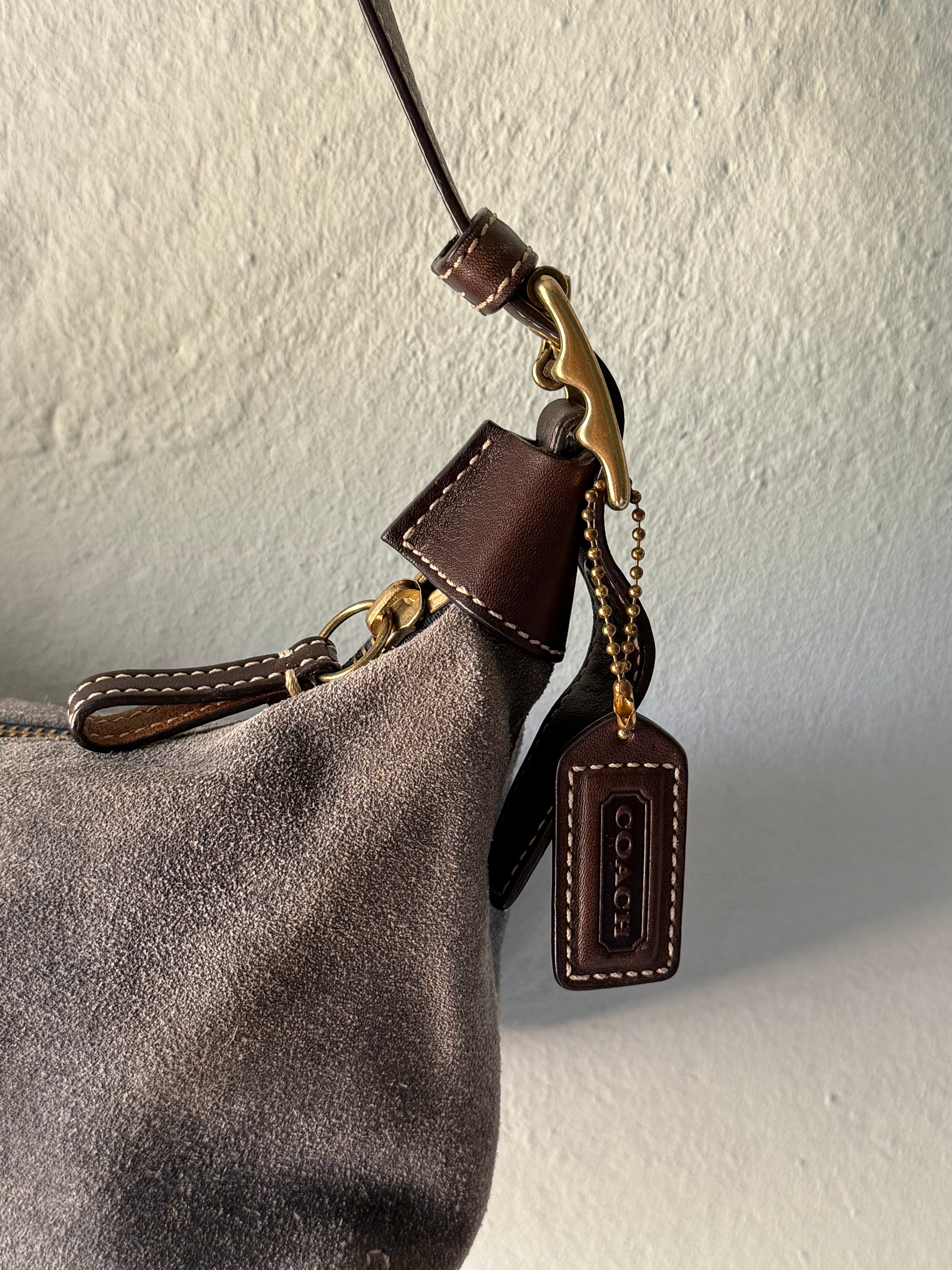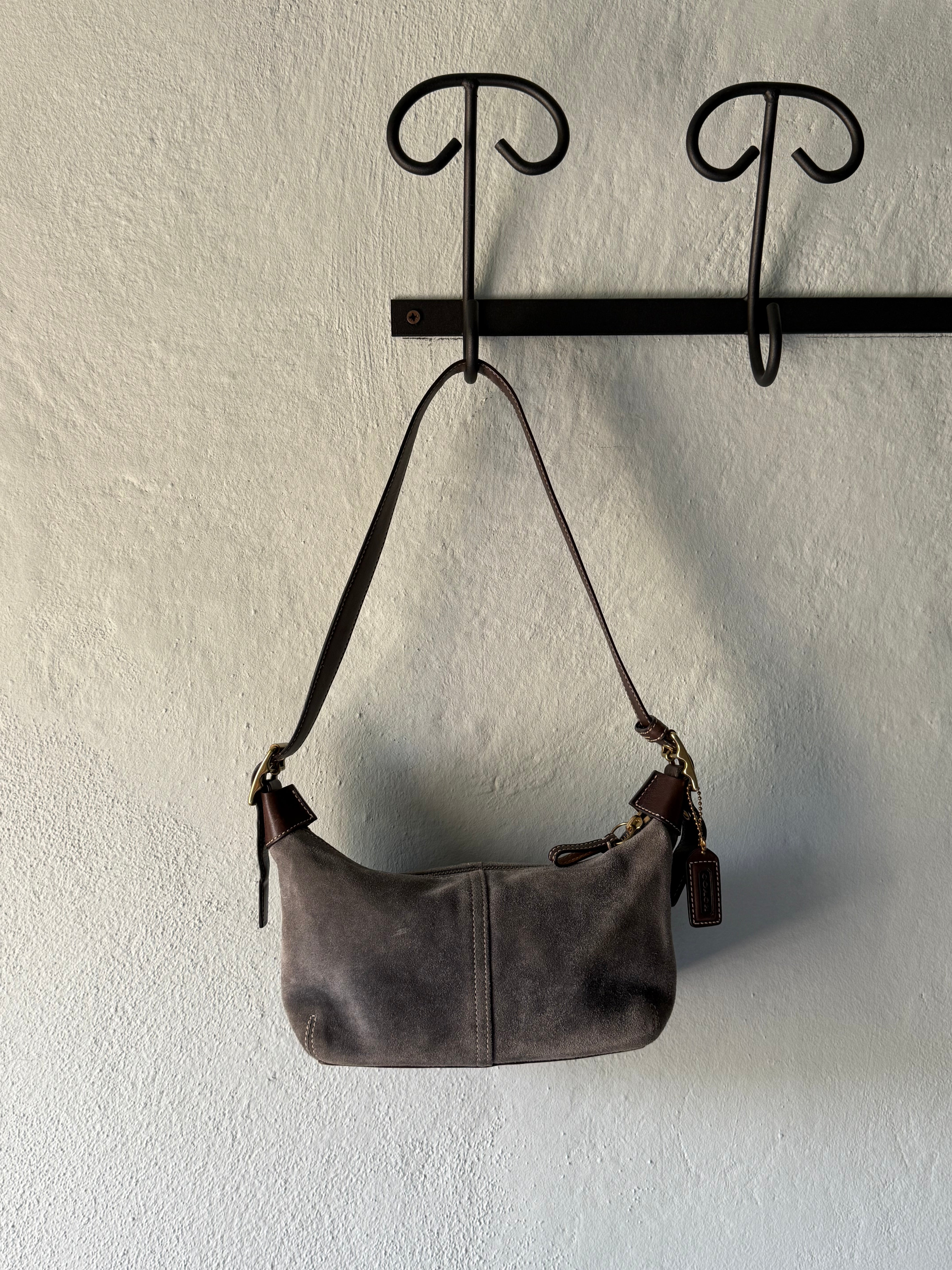 Vintage Coach suede bag with brown leather straps, white stitching, and gold-tone hardware. Features an inner pocket that can be securely closed.