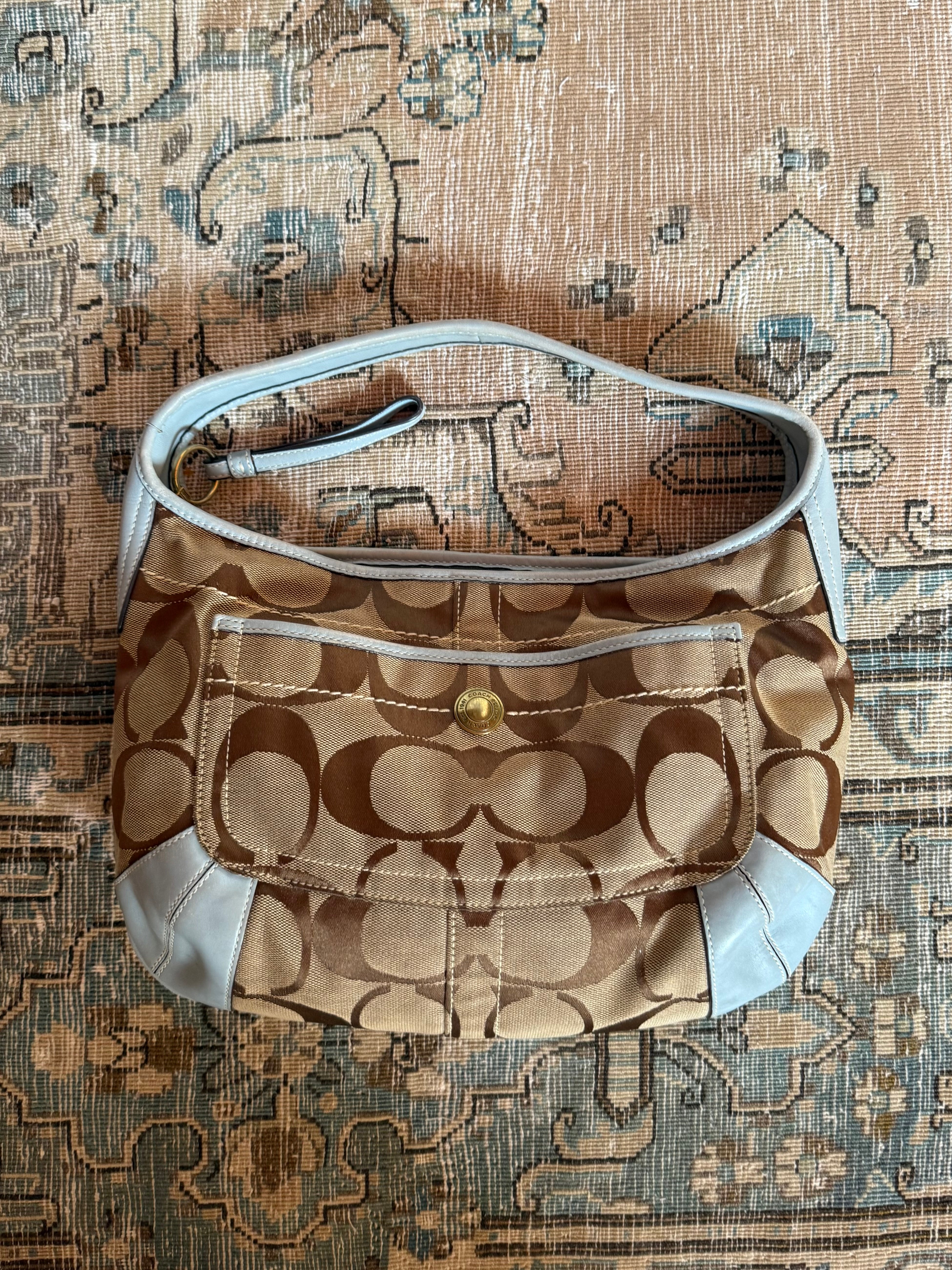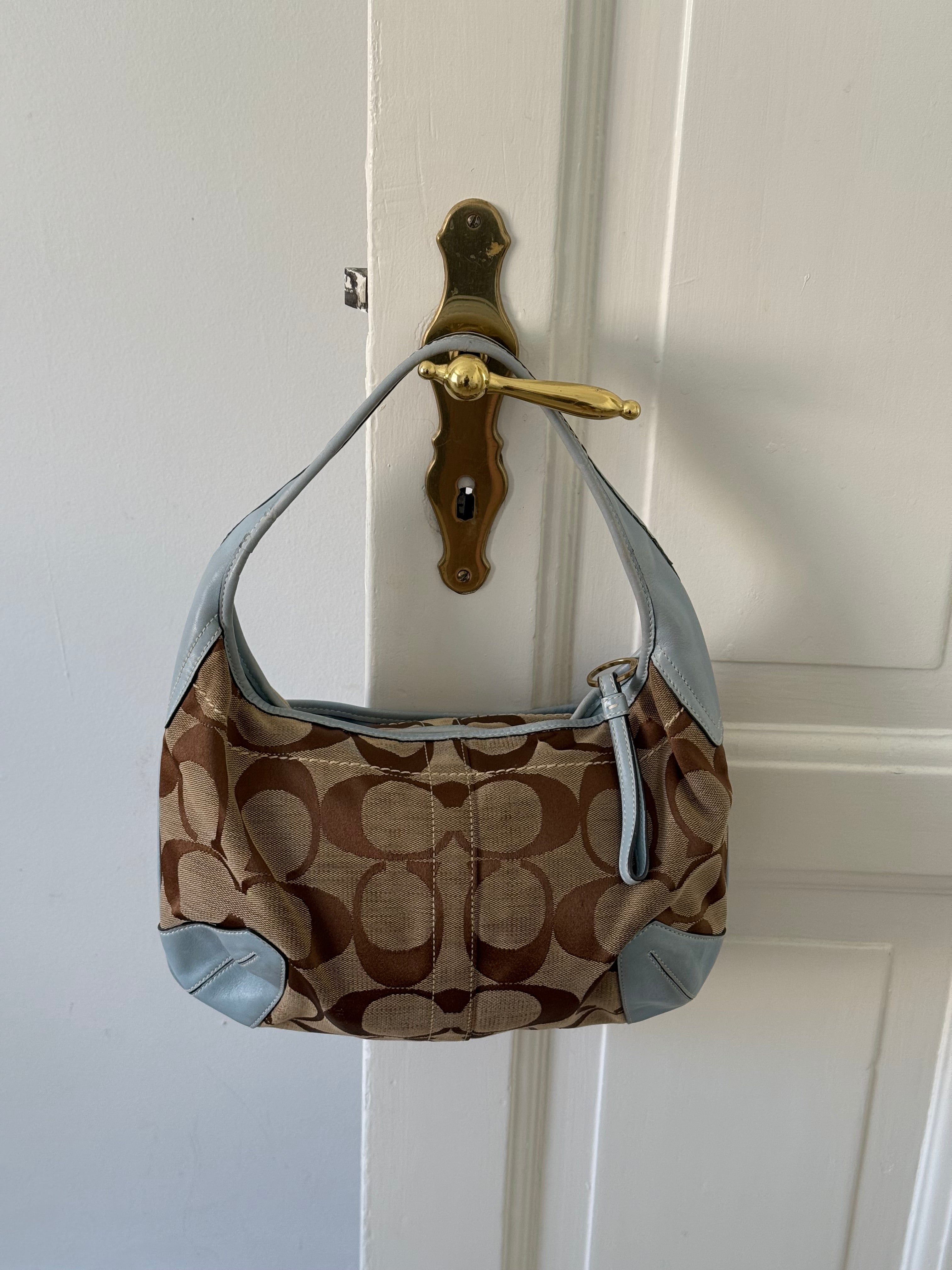 Cute vintage Coach bag in signature canvas and light blue leather.