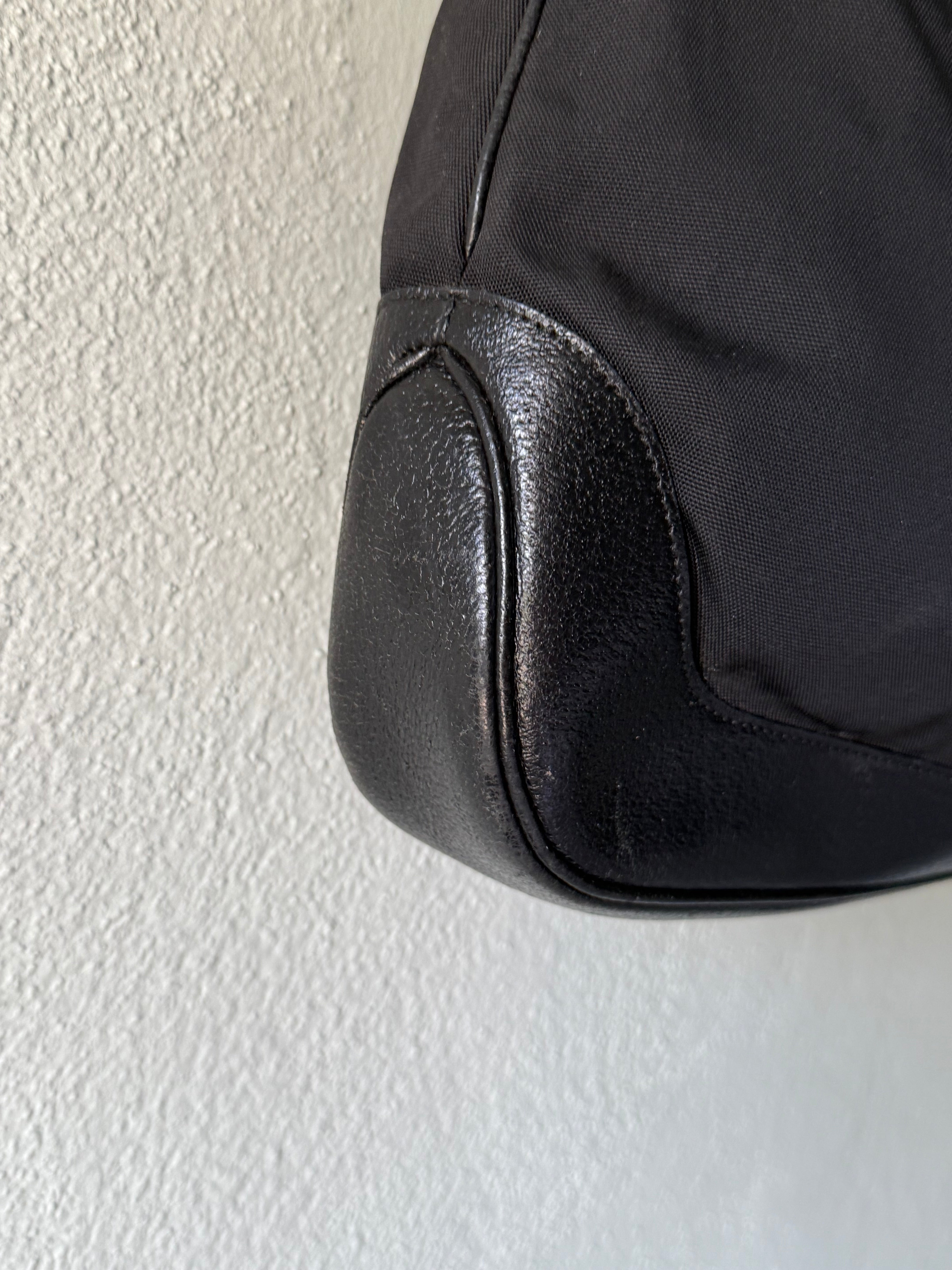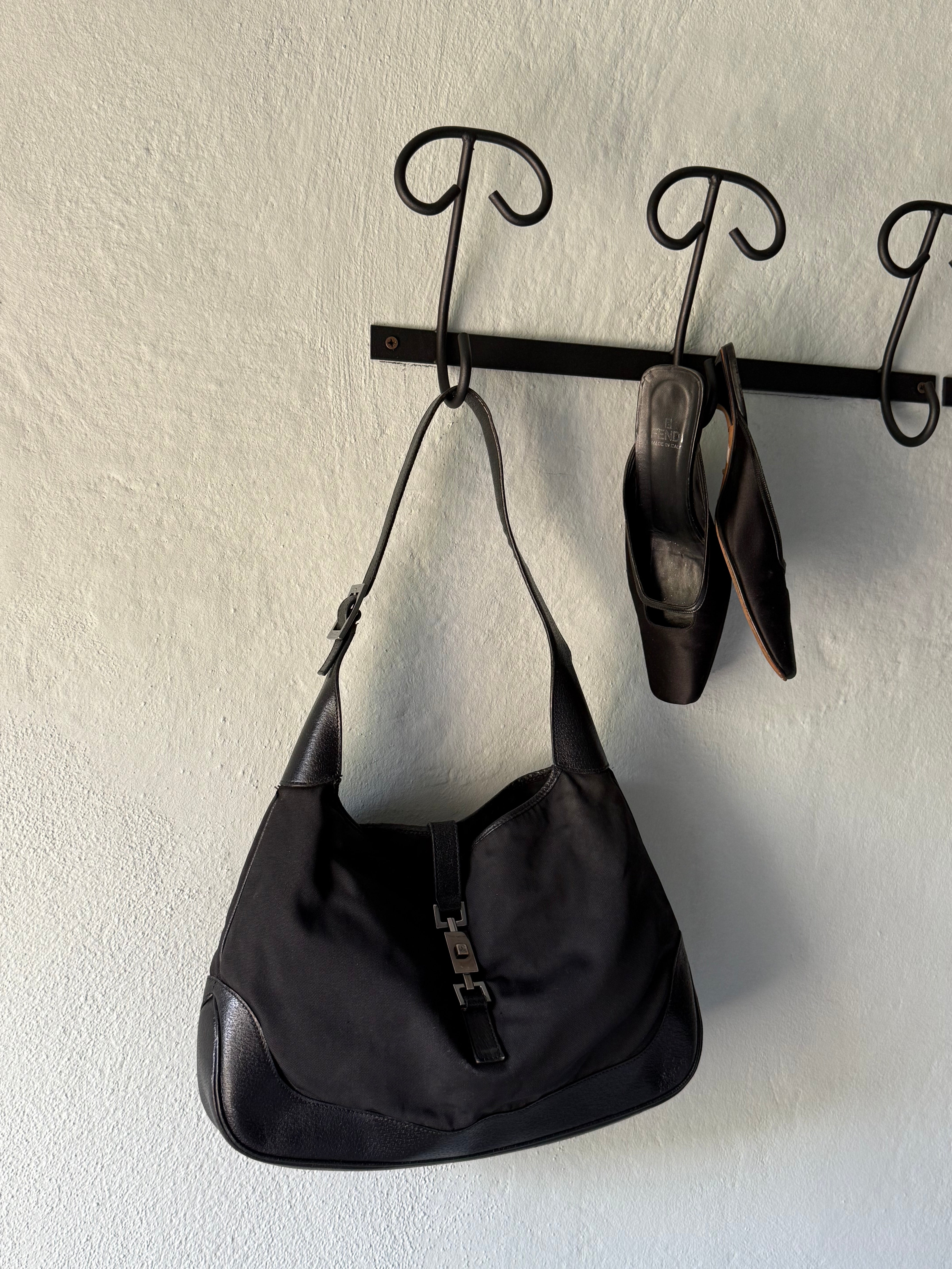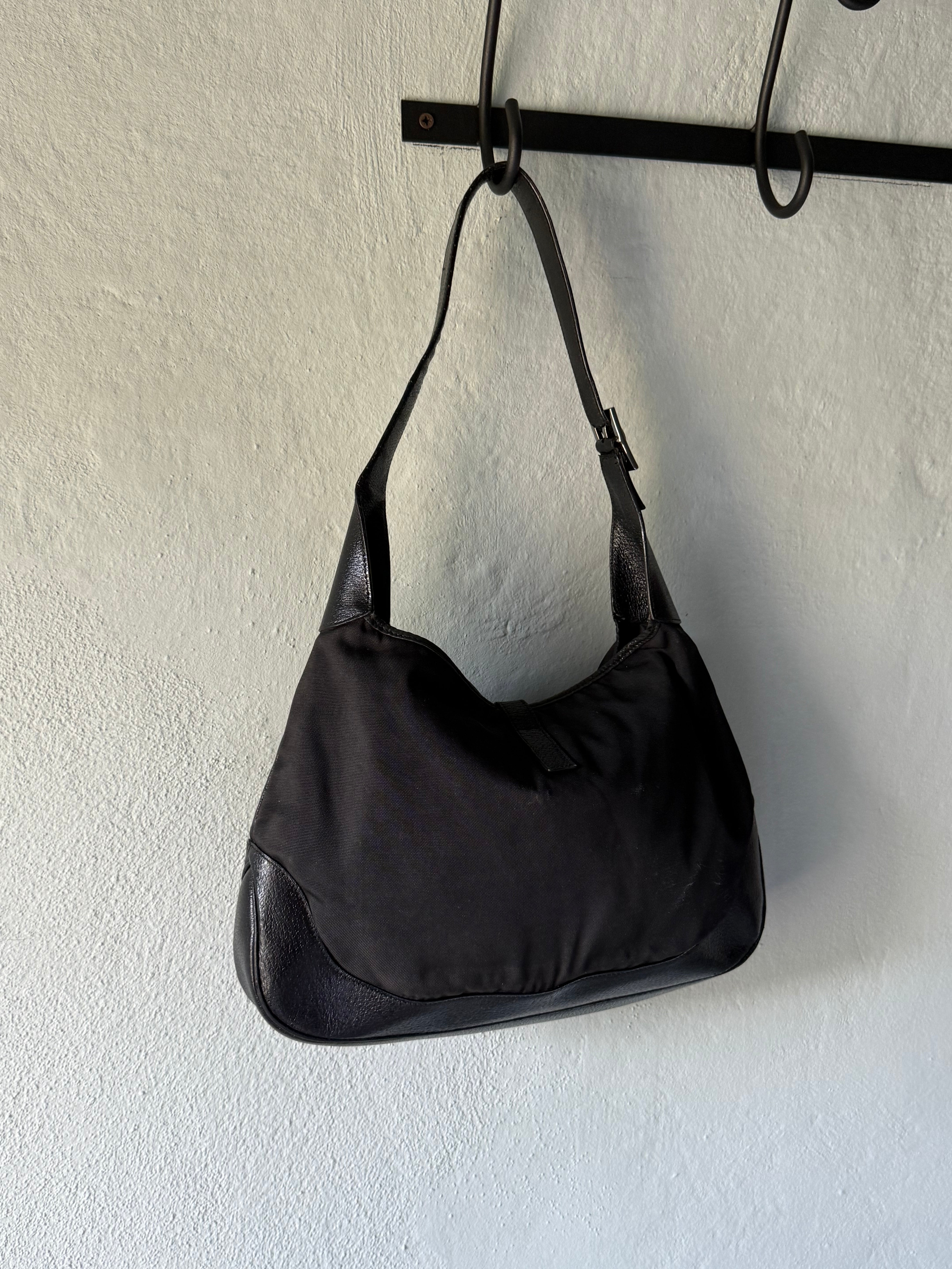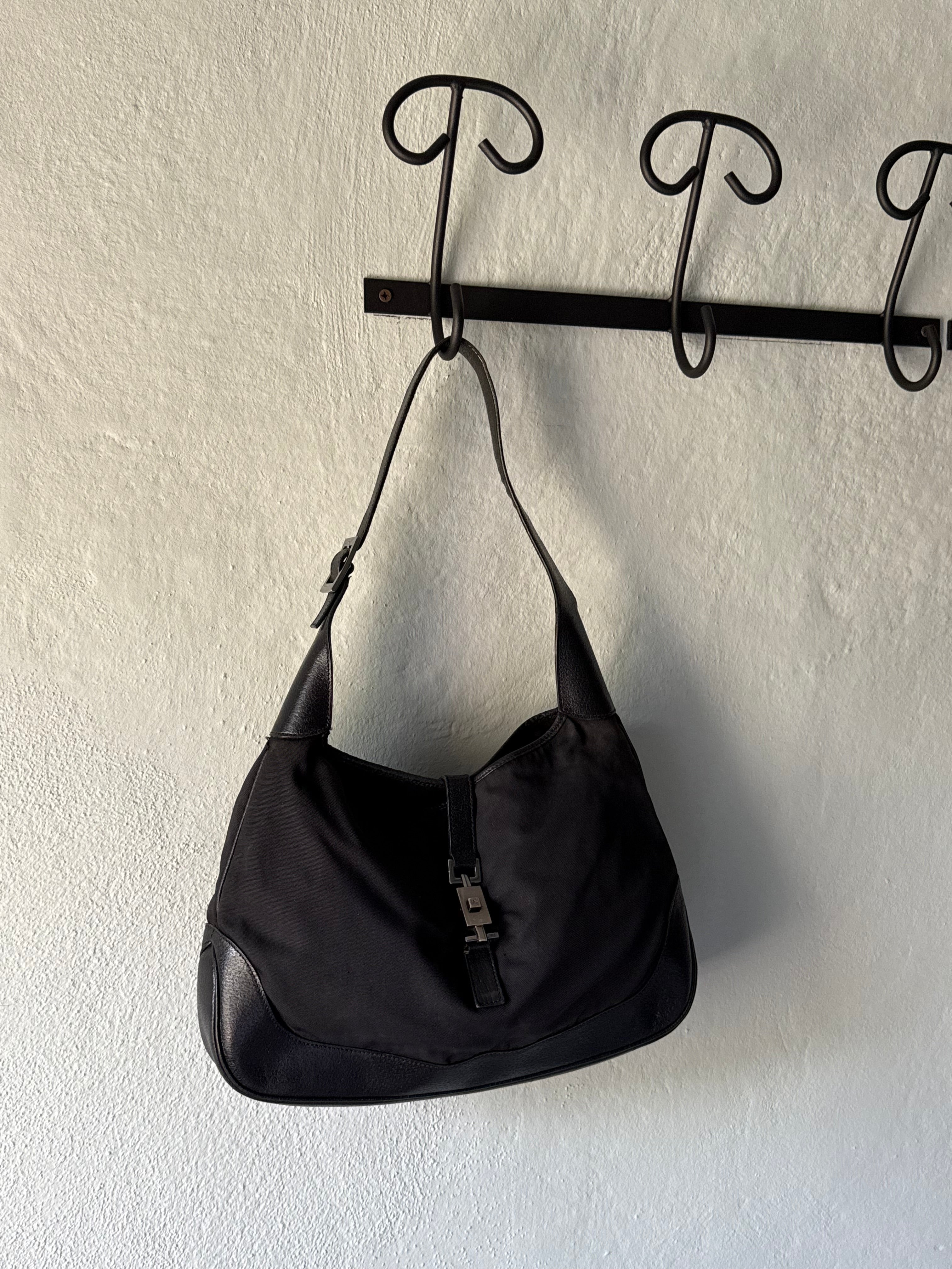 A Large Gucci Jackie in black leather and nylon. The bag features a stylish buckle closure and a spacious interior. Comes with original dustbag.