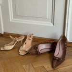 Beautiful vintage Prada cream lace strappy sandals with adjustable straps, a delicate bow front, light pink insoles and a slim stiletto heel.