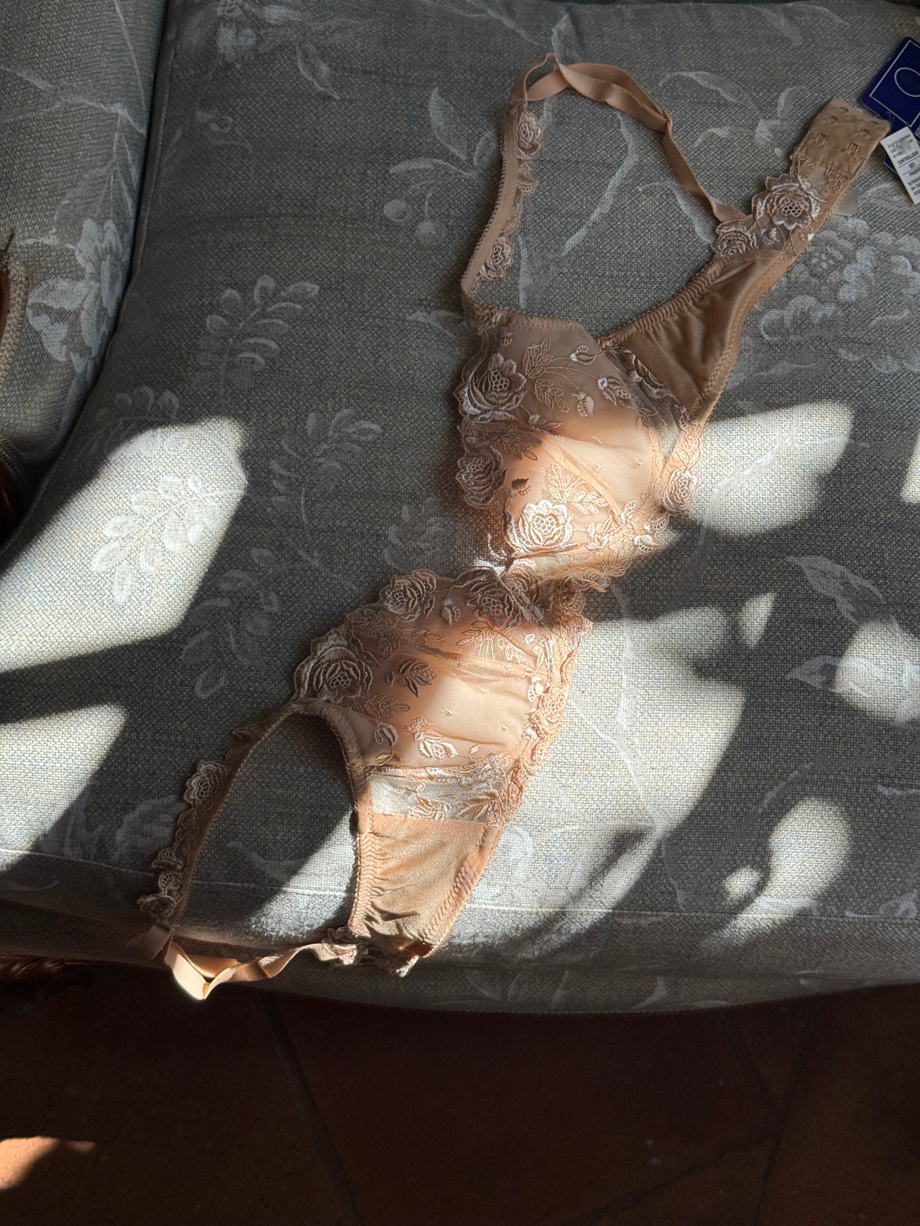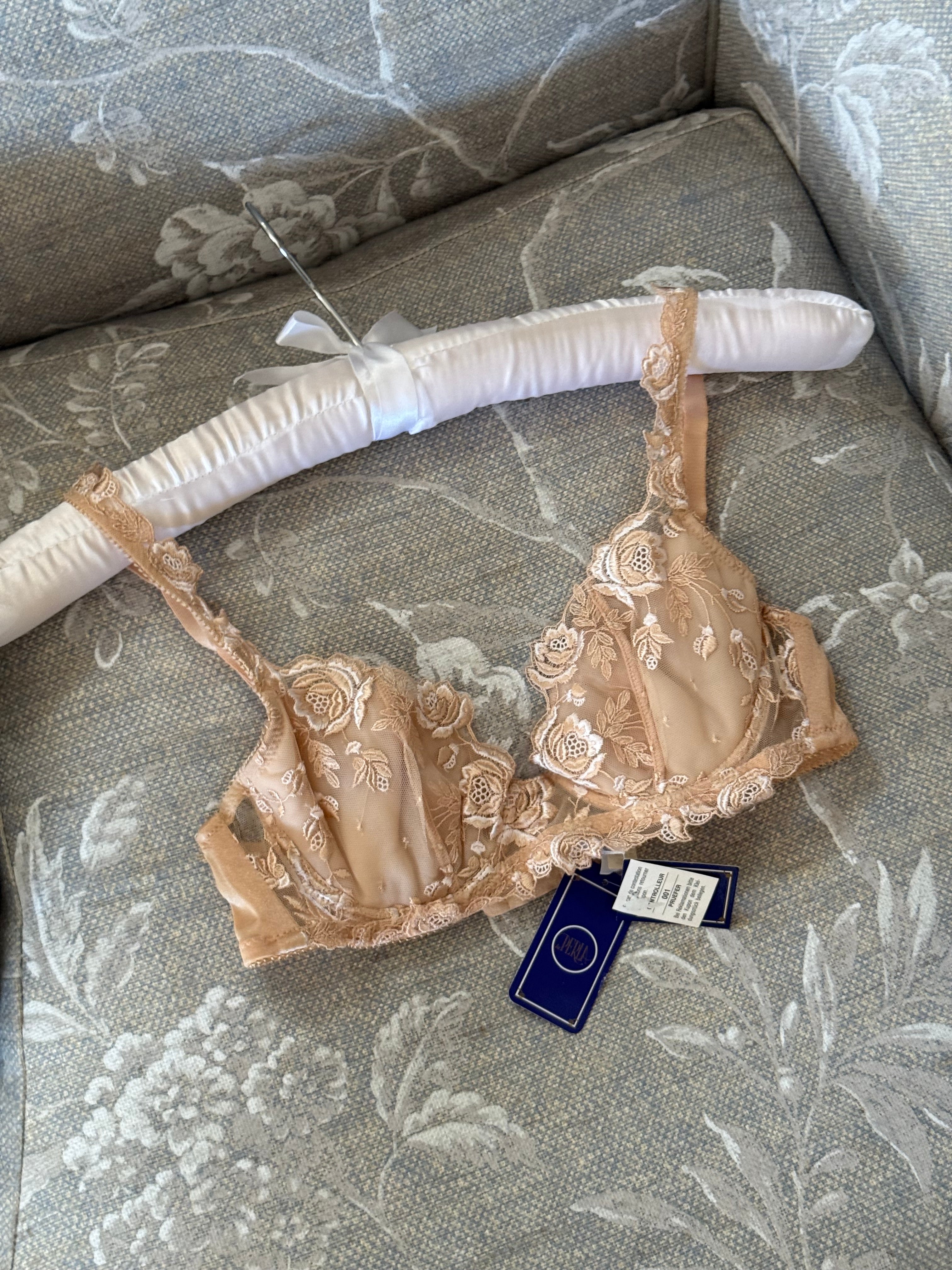 Vintage La Perla bra in nude mesh with floral embroidery and satin details.