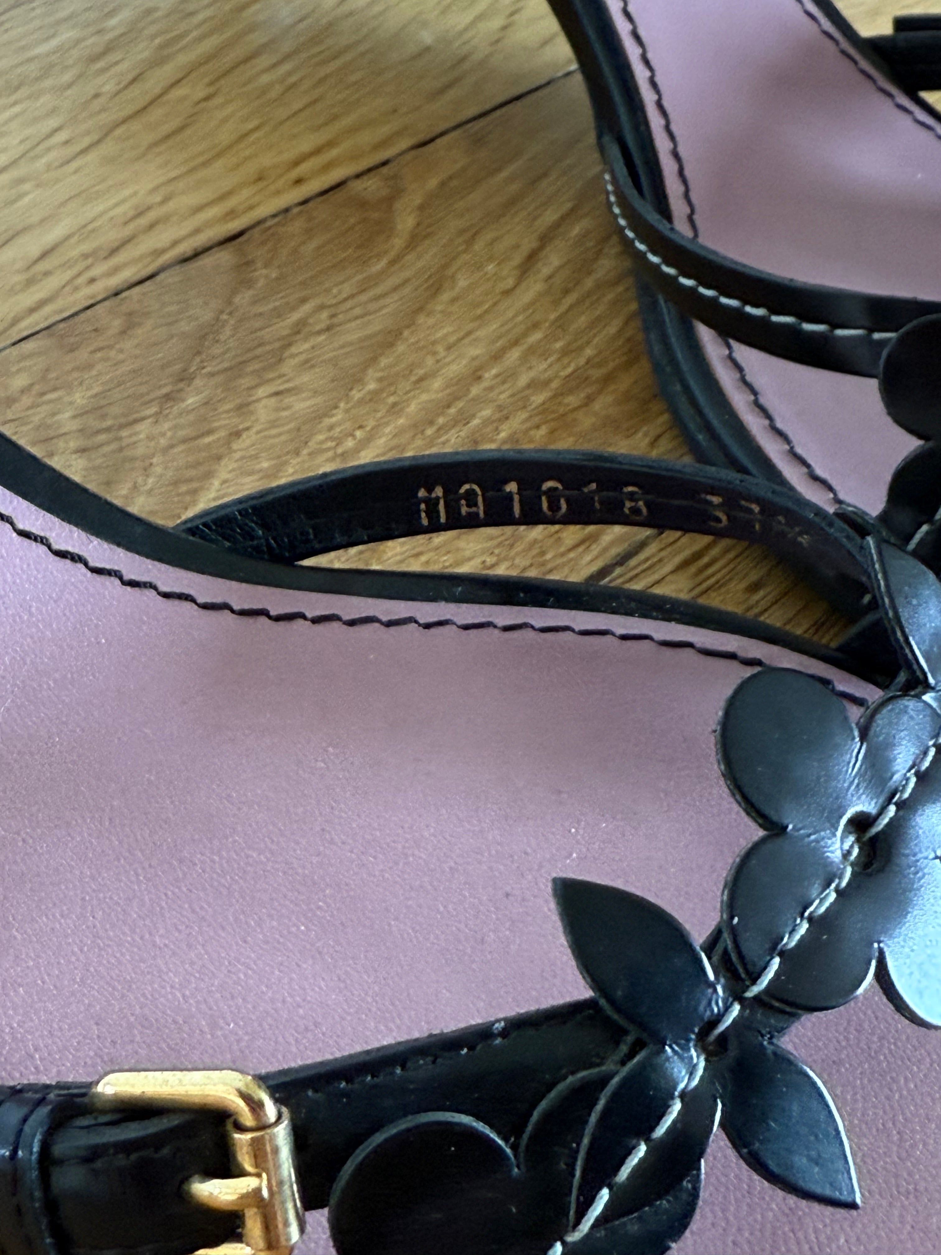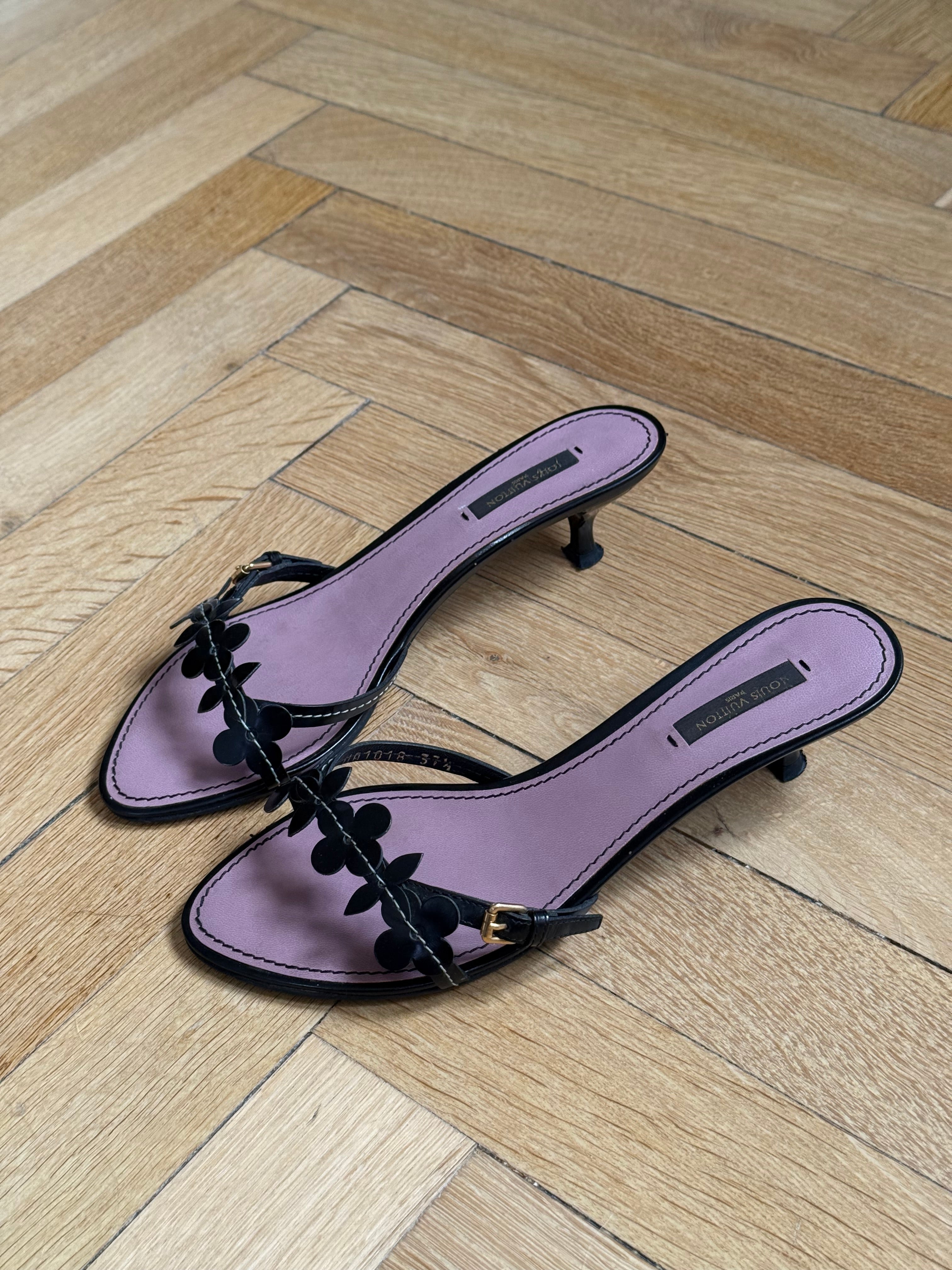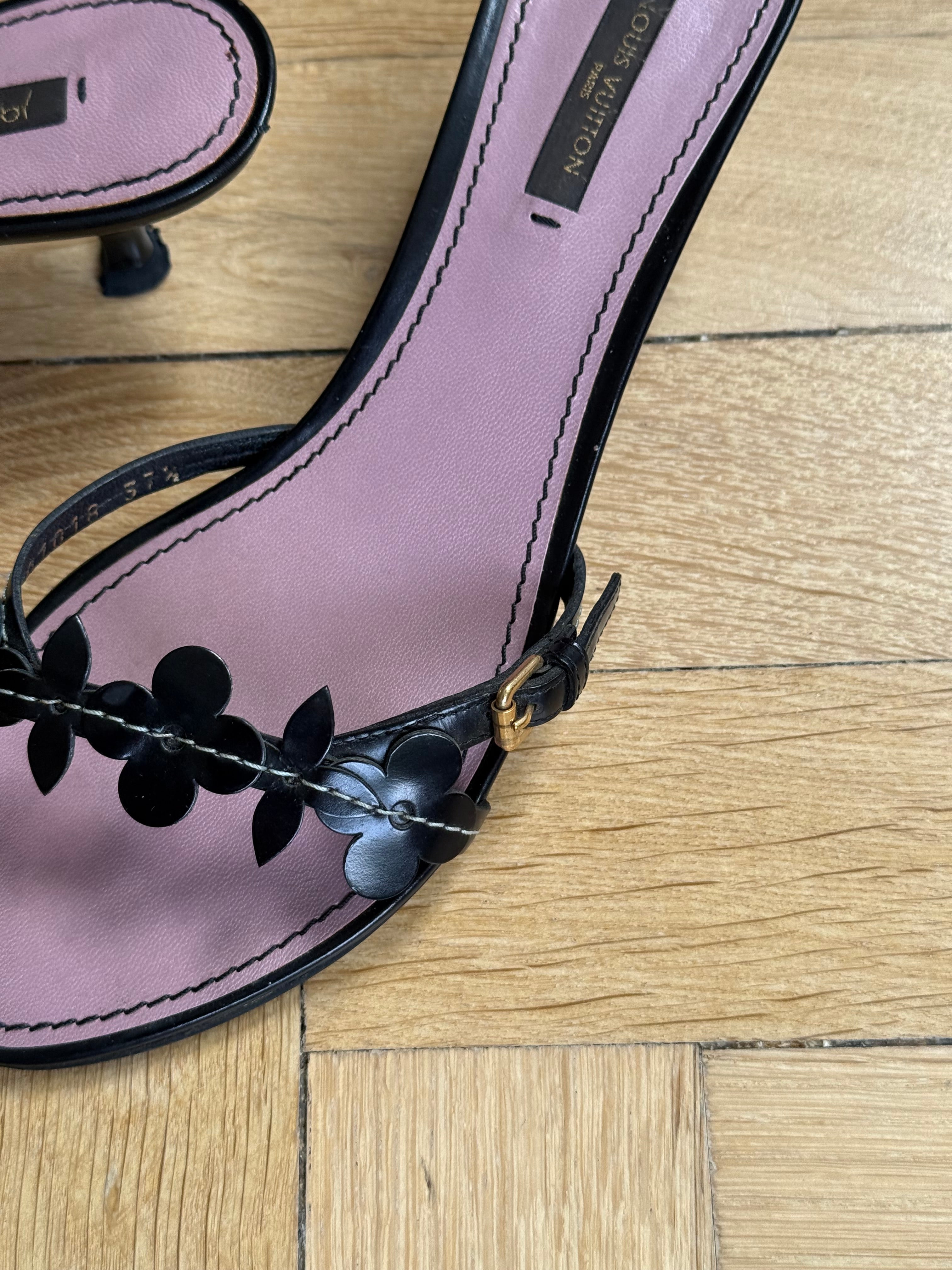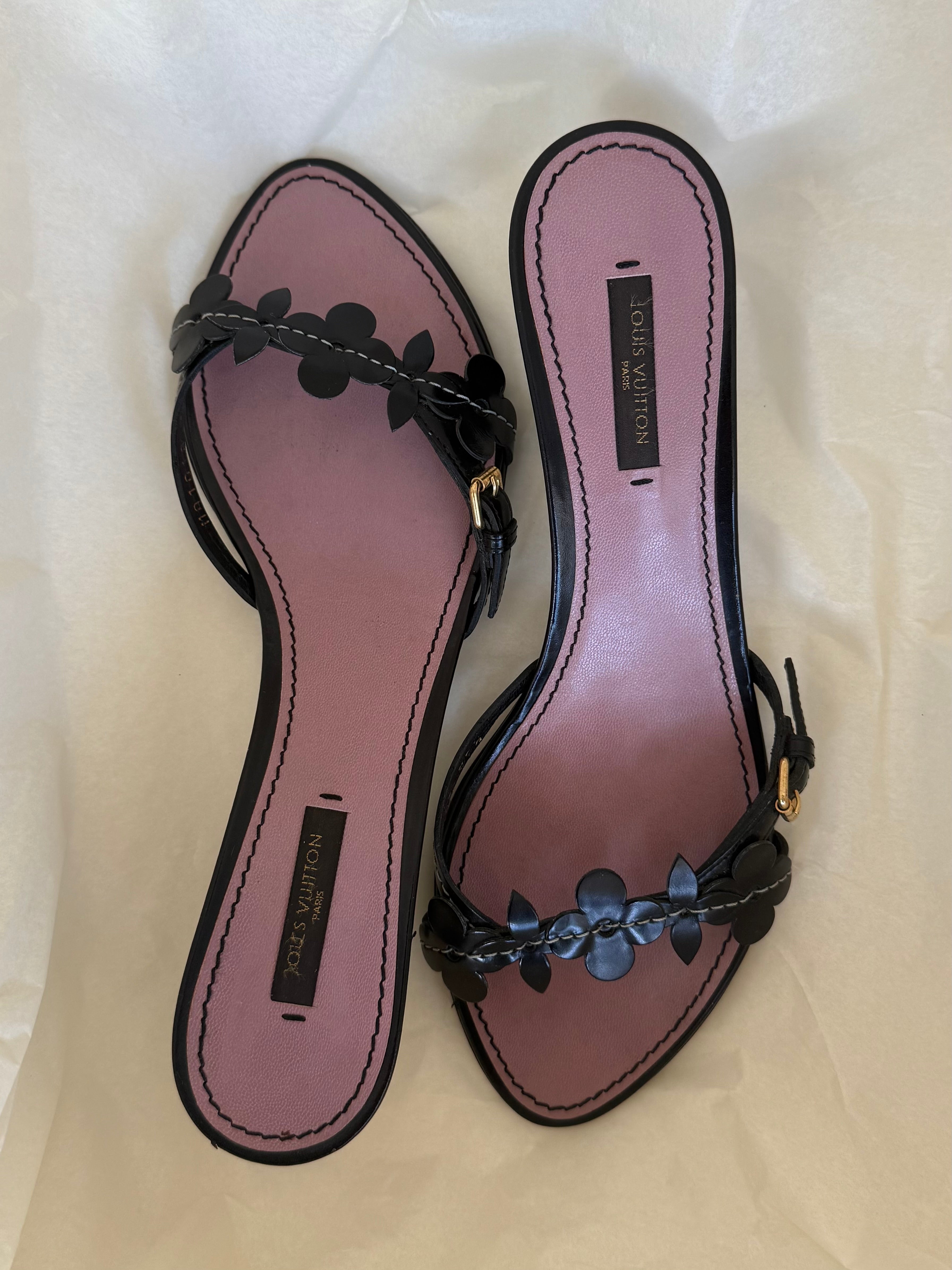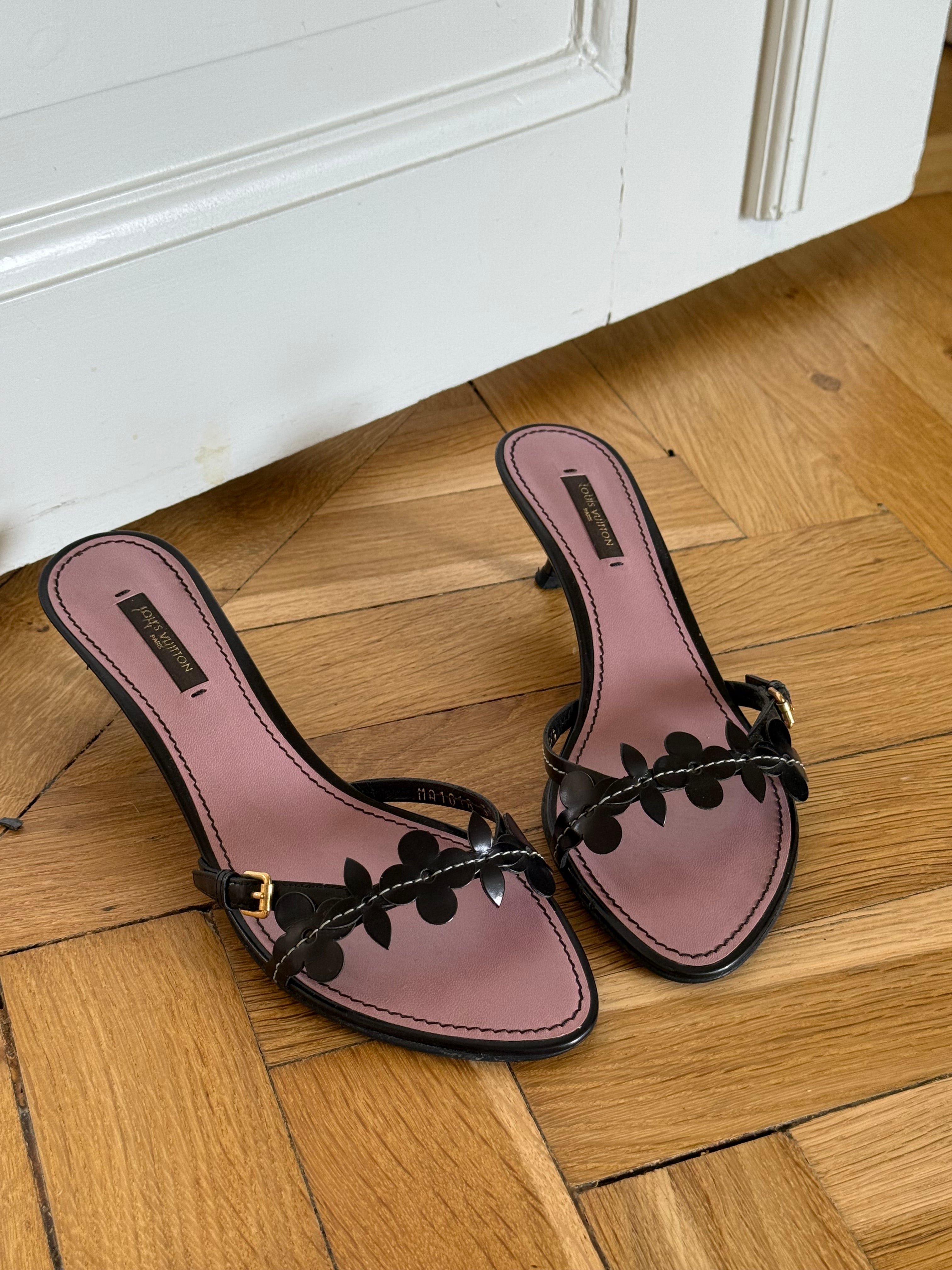 Beautiful black Louis Vuitton leather flower mules.