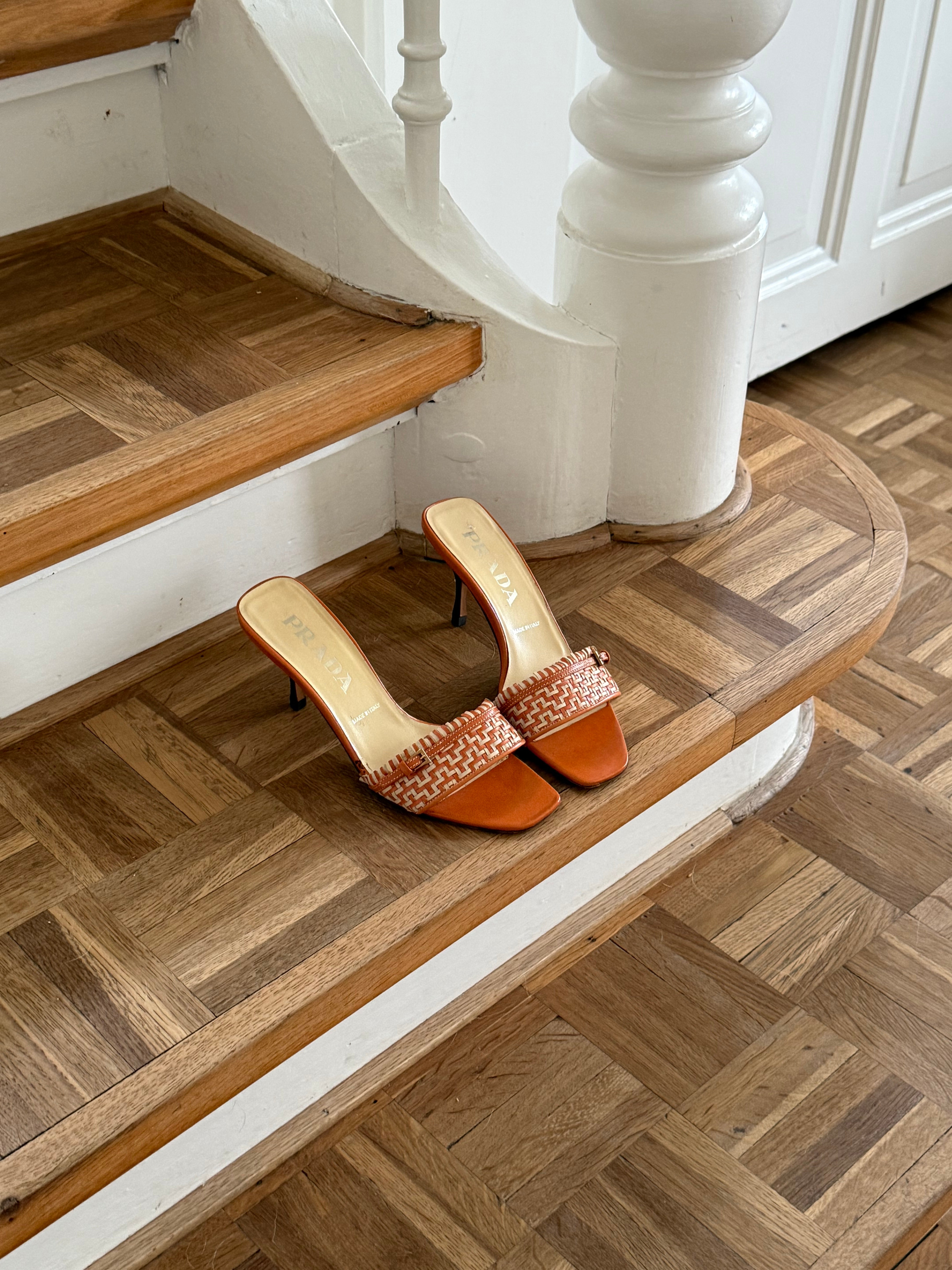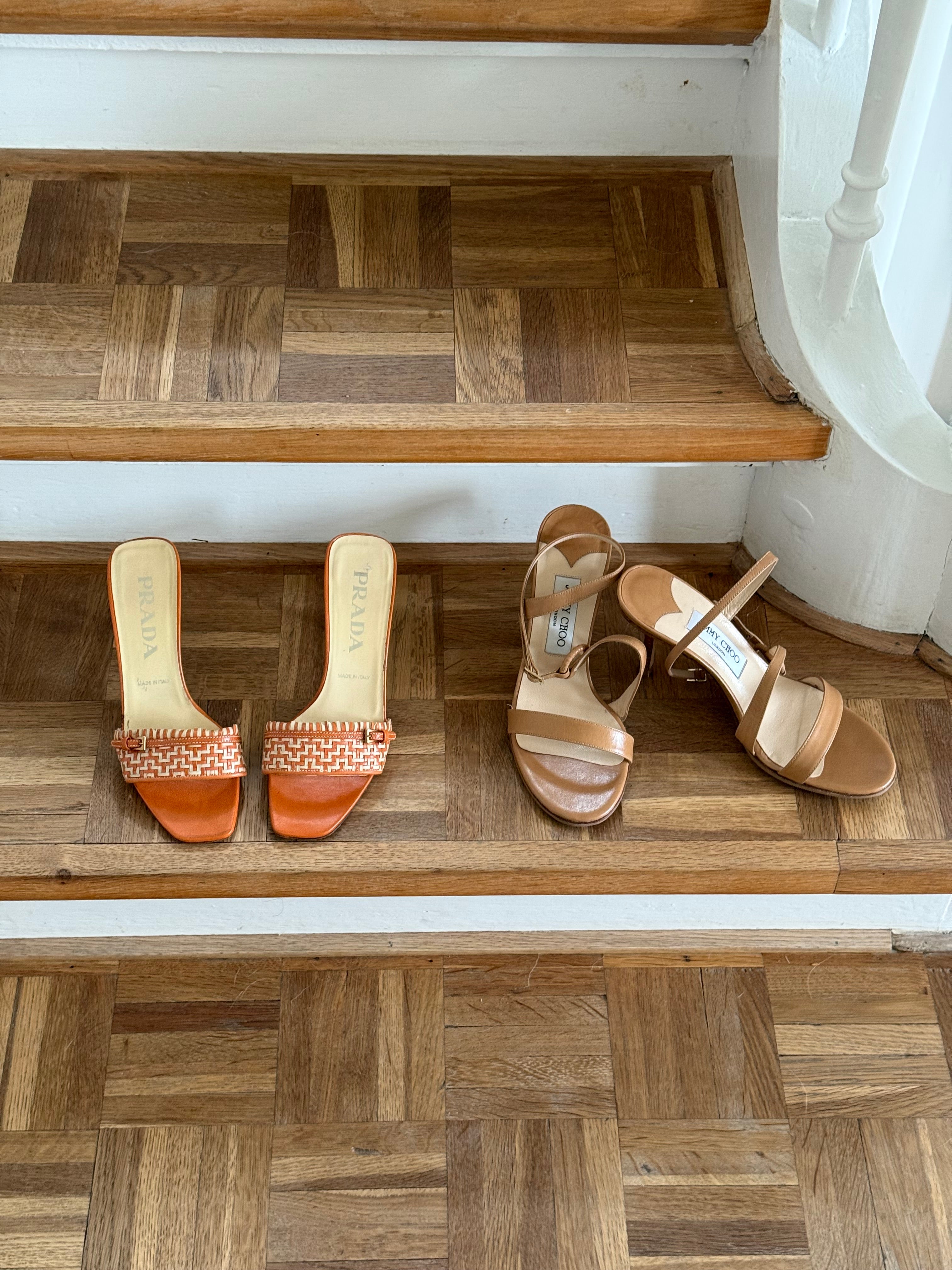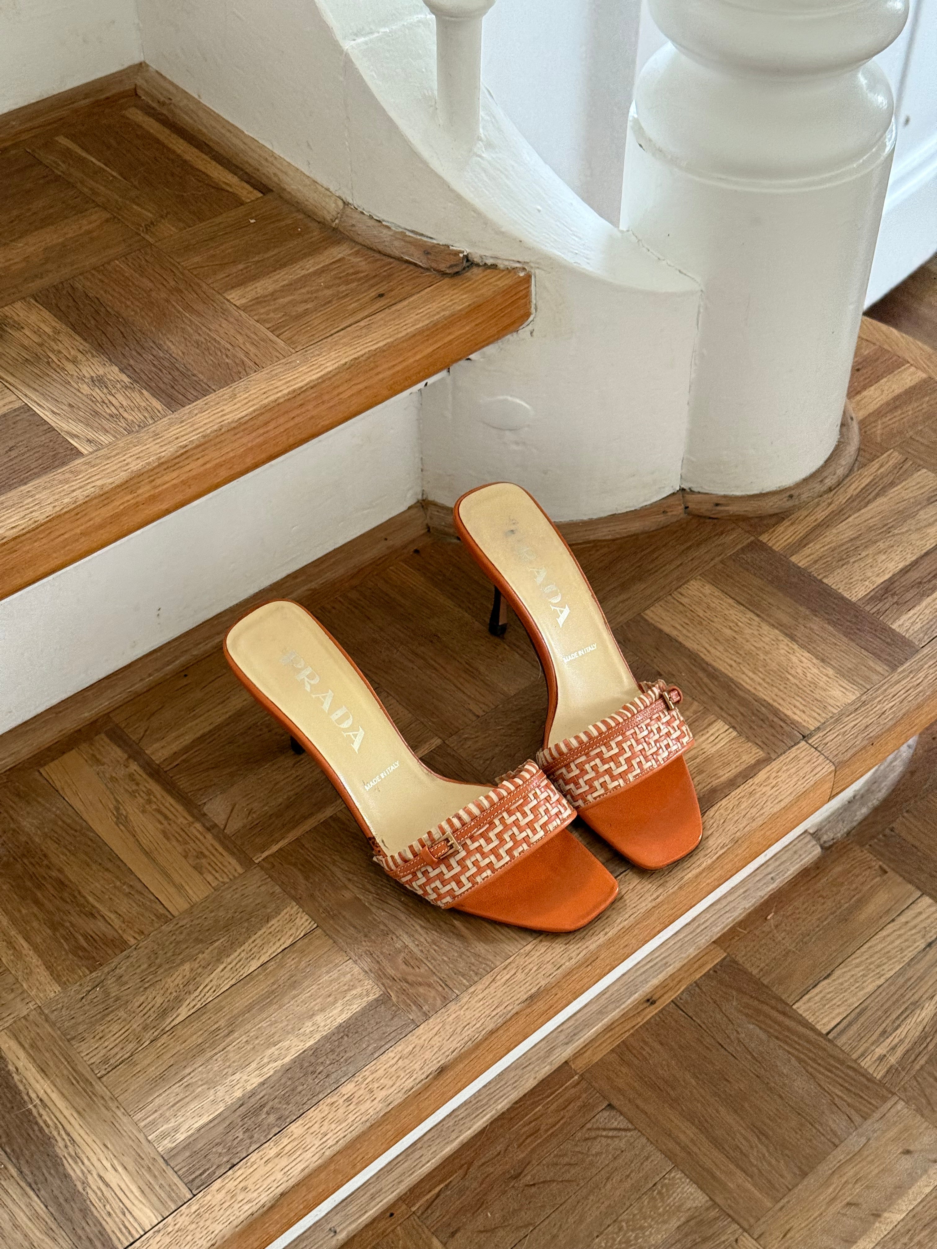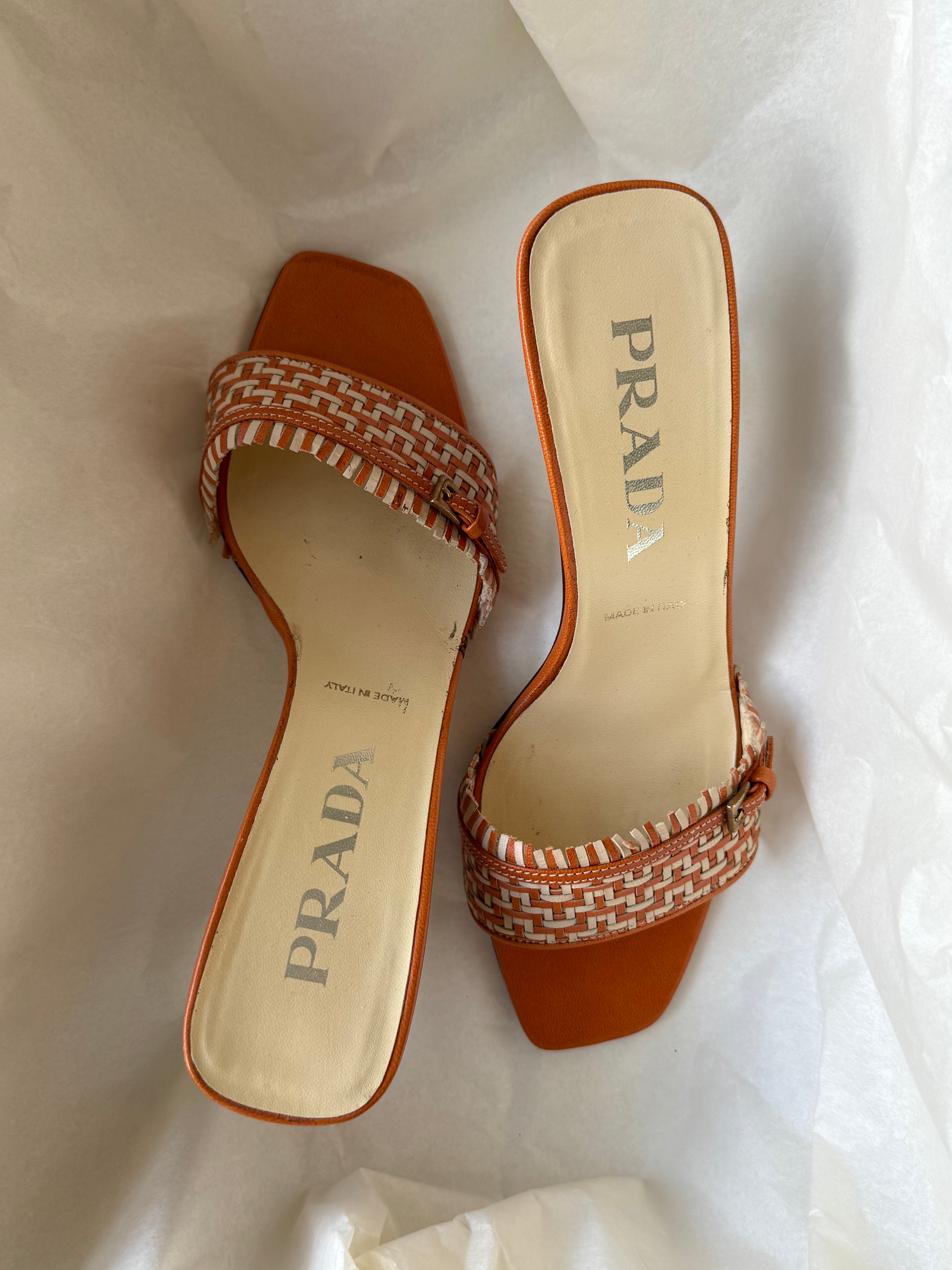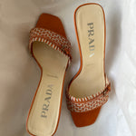 Vintage Prada kitten heels in a orange and cream color combination, featuring a buckle detail at the front.
