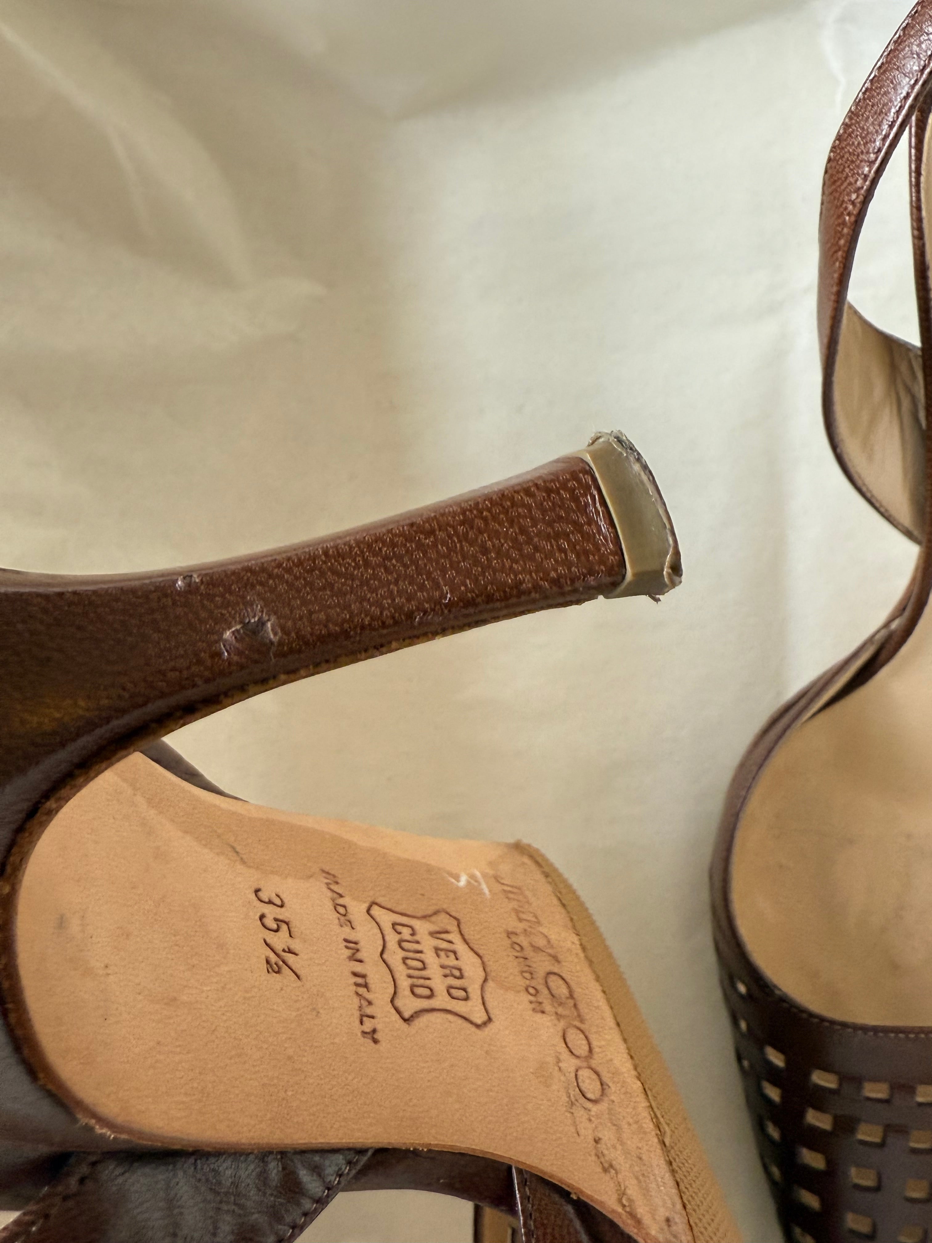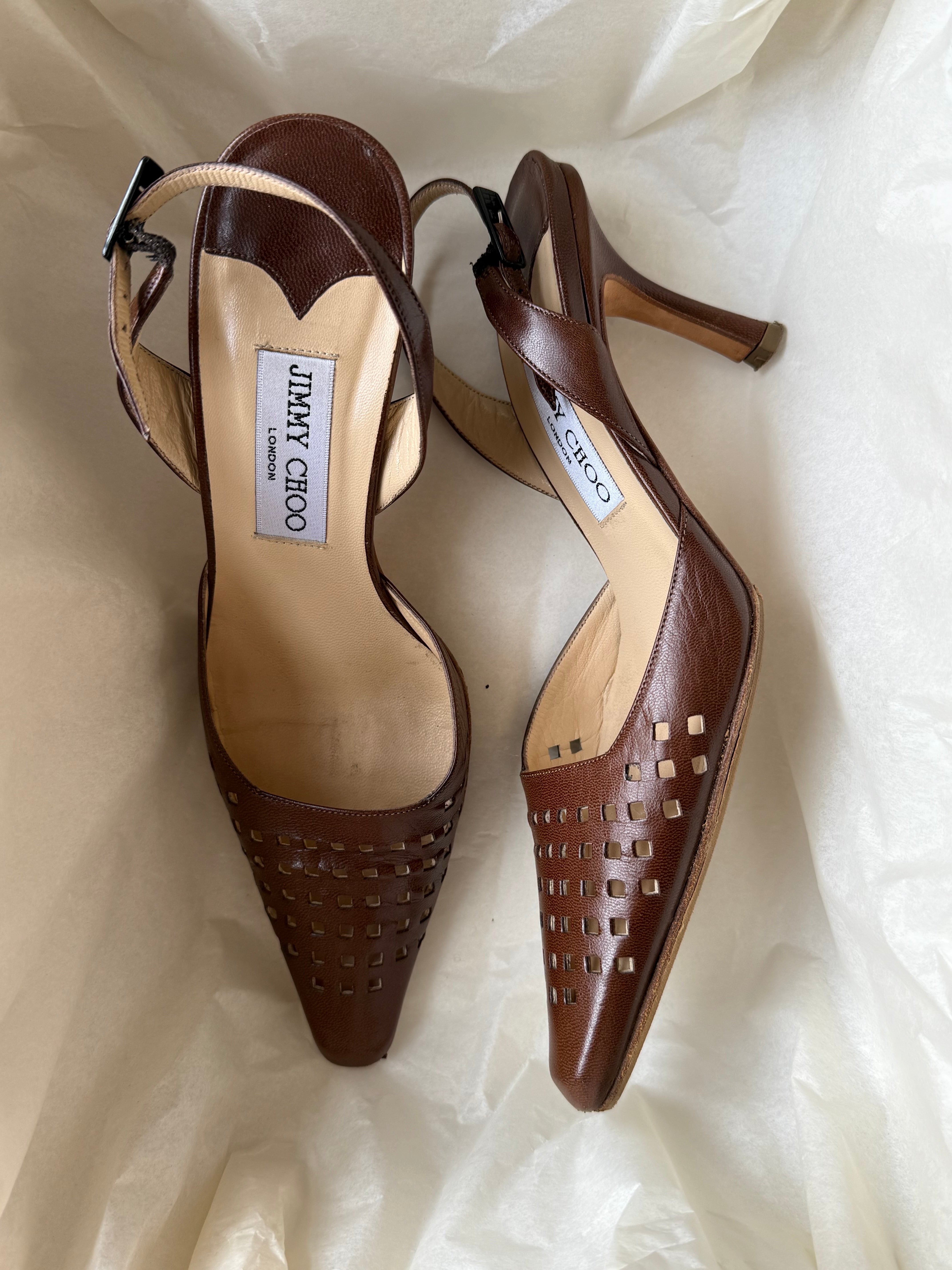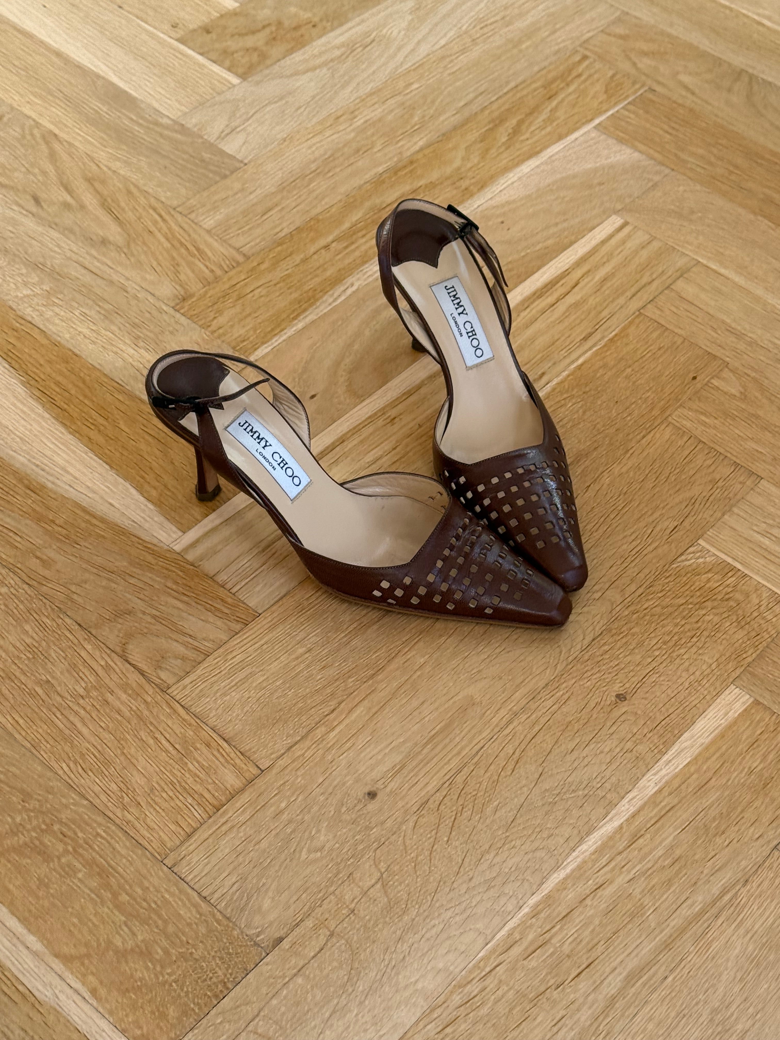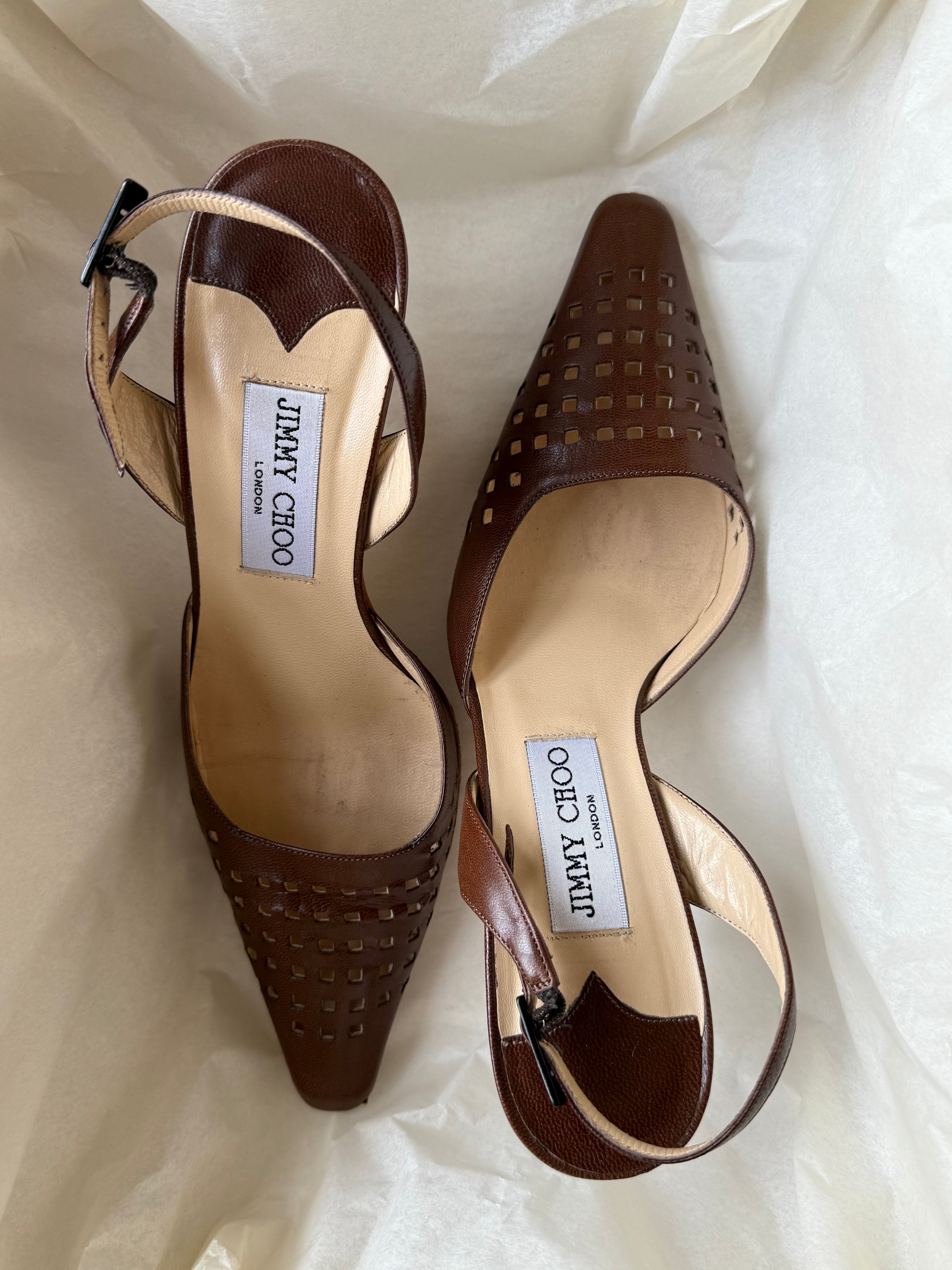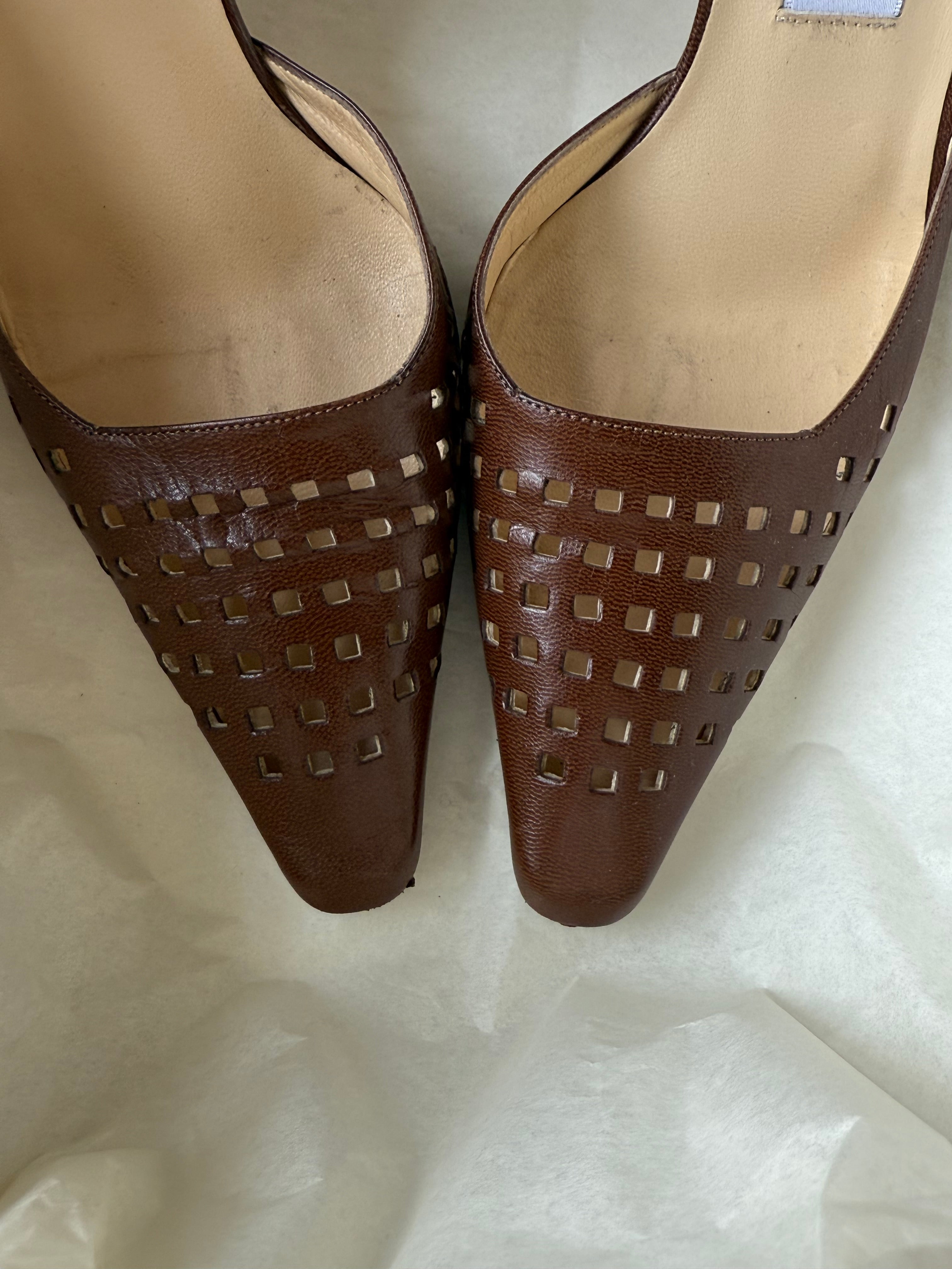 Vintage Jimmy Choo Leather Pointed-Toe Slingbacks in beautiful brown leather with cut-outs.