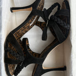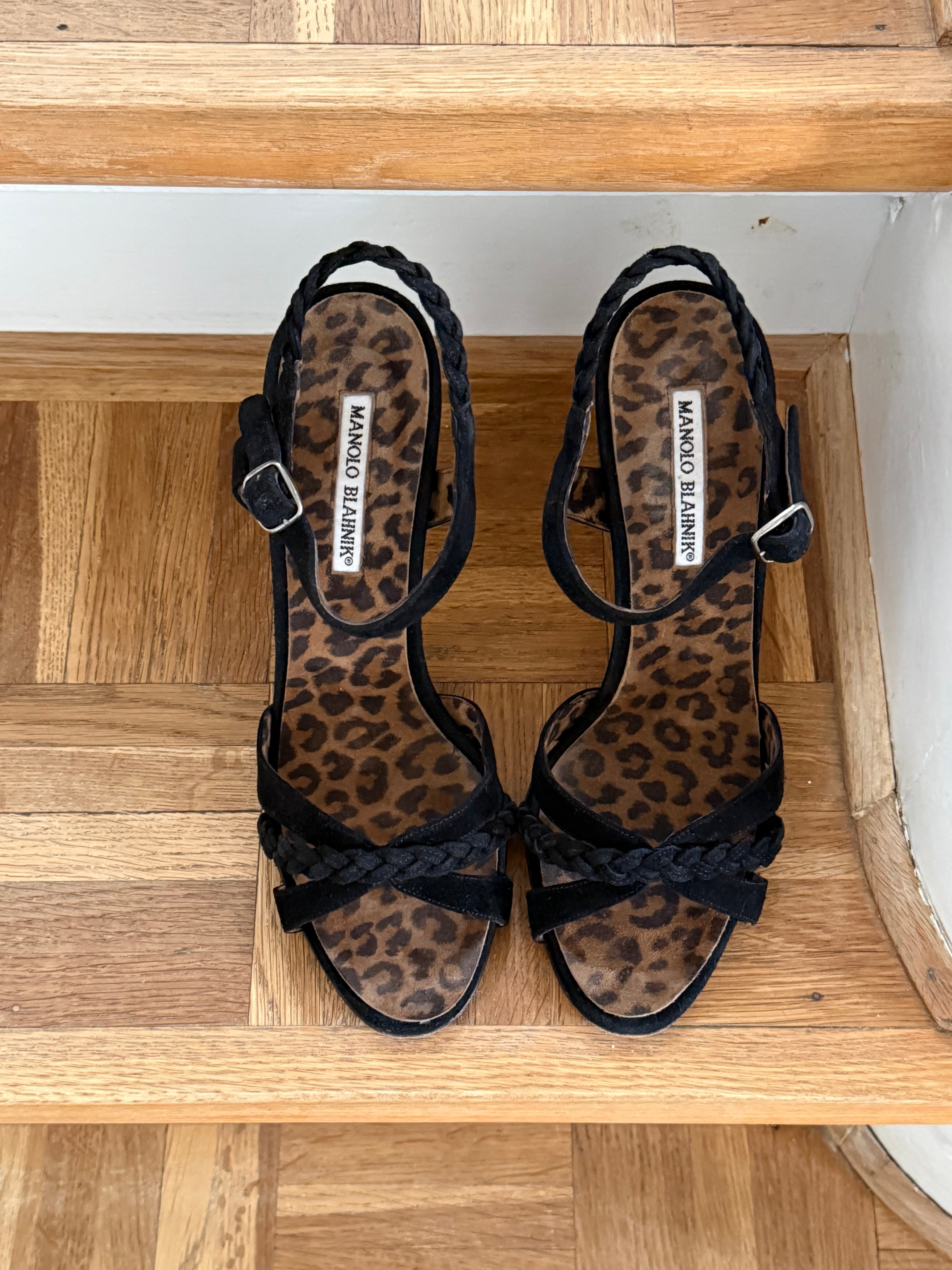 Vintage Manolo Blahnik suede sandals with braided detail and and leopard print insole.