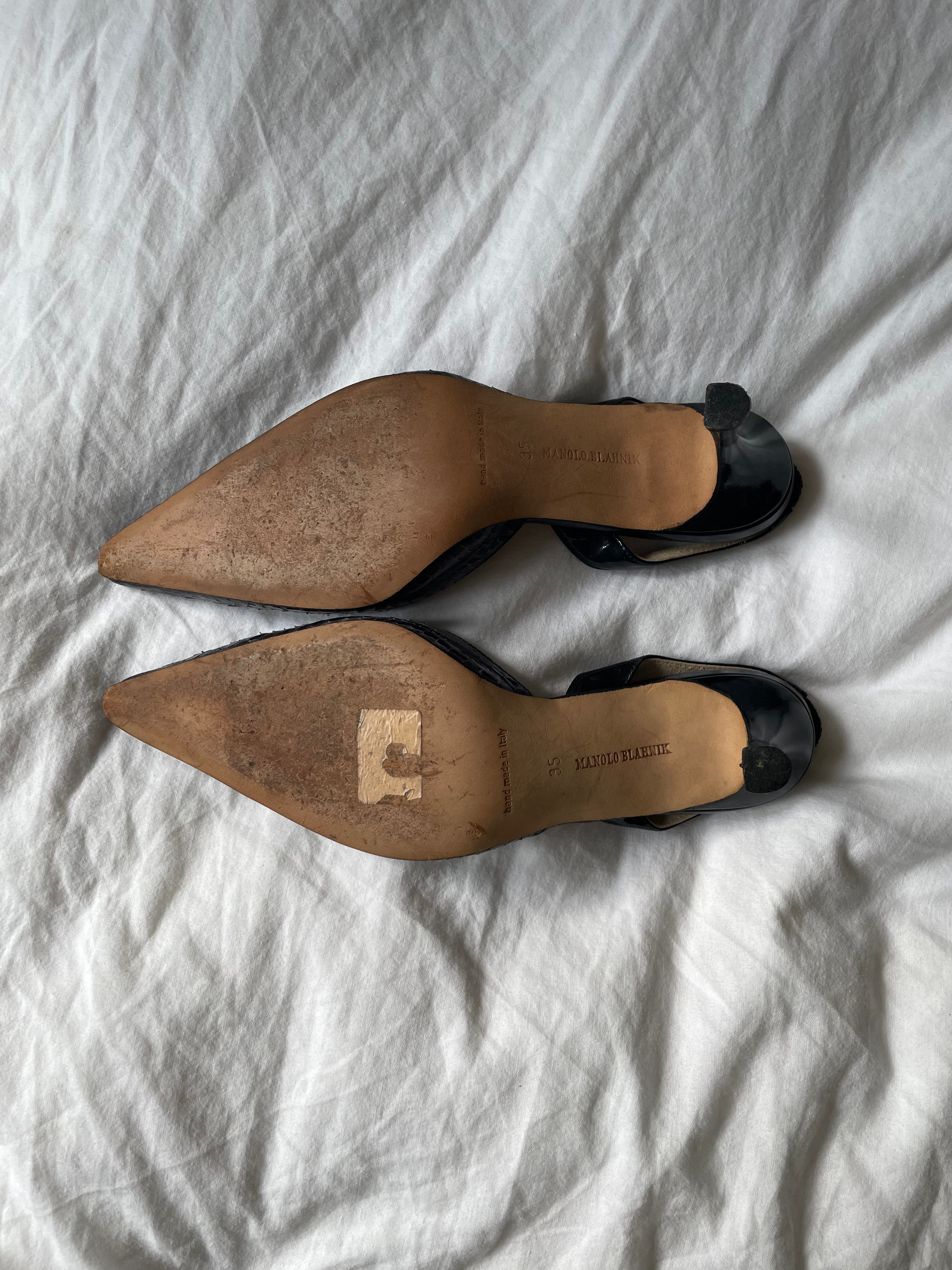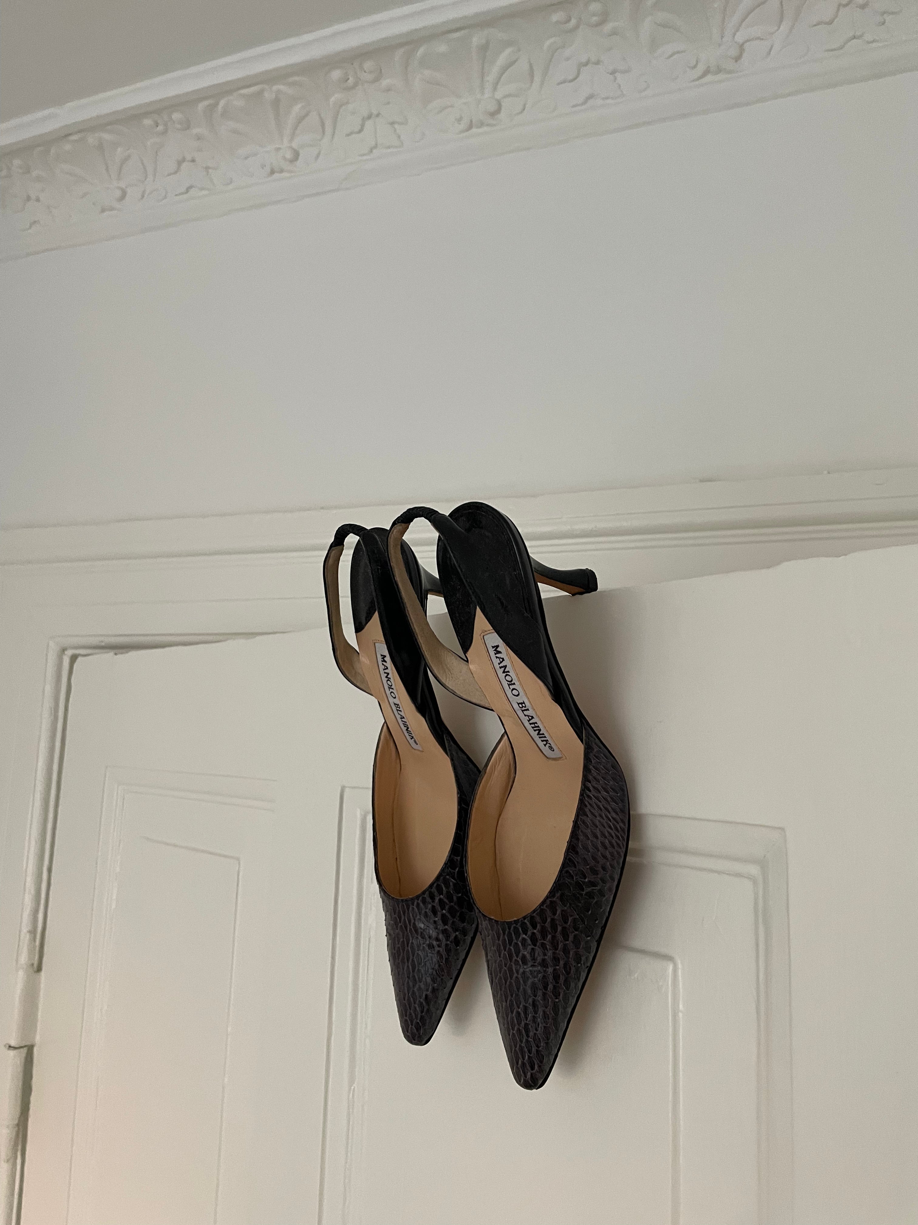 Vintage Manolo Blahnik navy snake slingbacks in the model Carolyne. The shoes are in genuine leather and made in Italy. They are in good vintage condition.