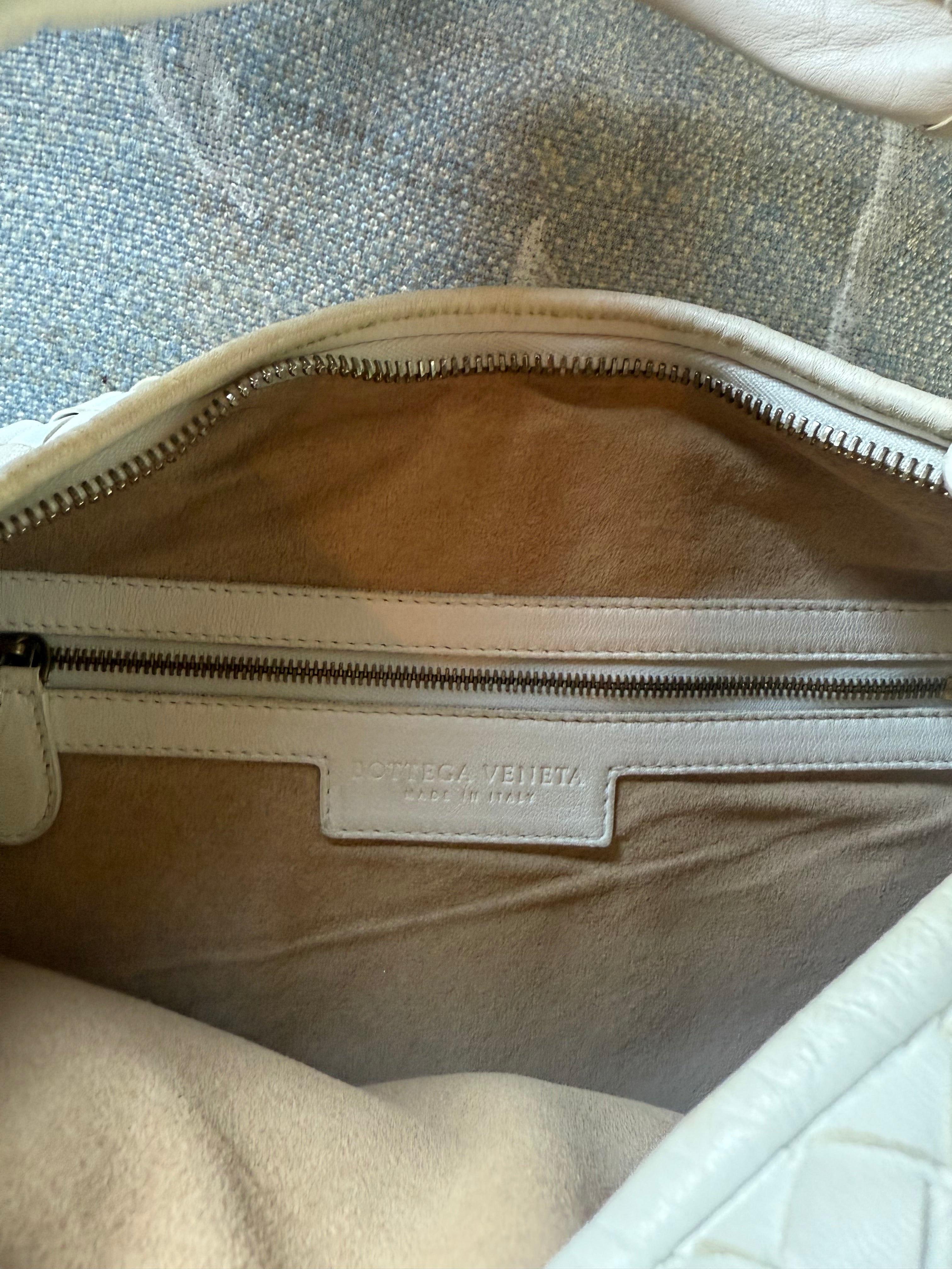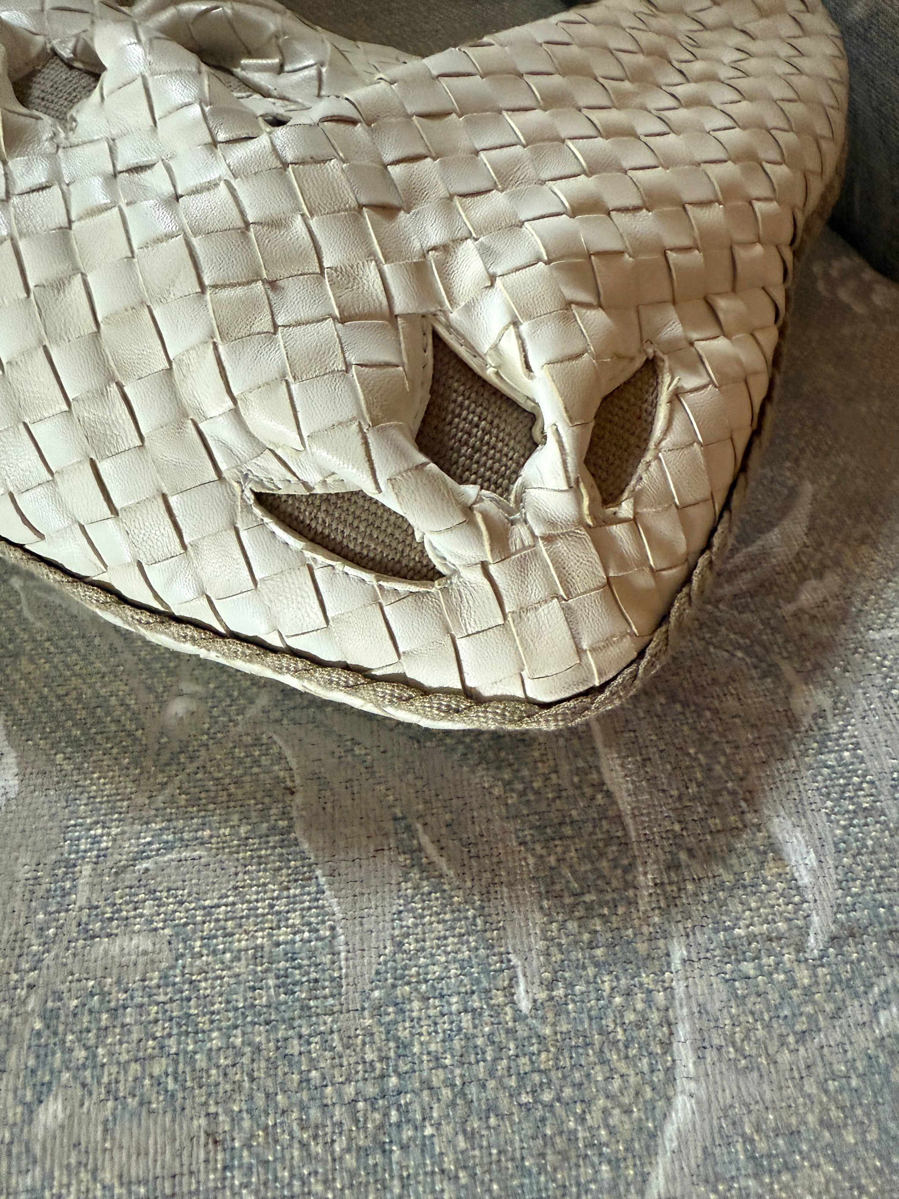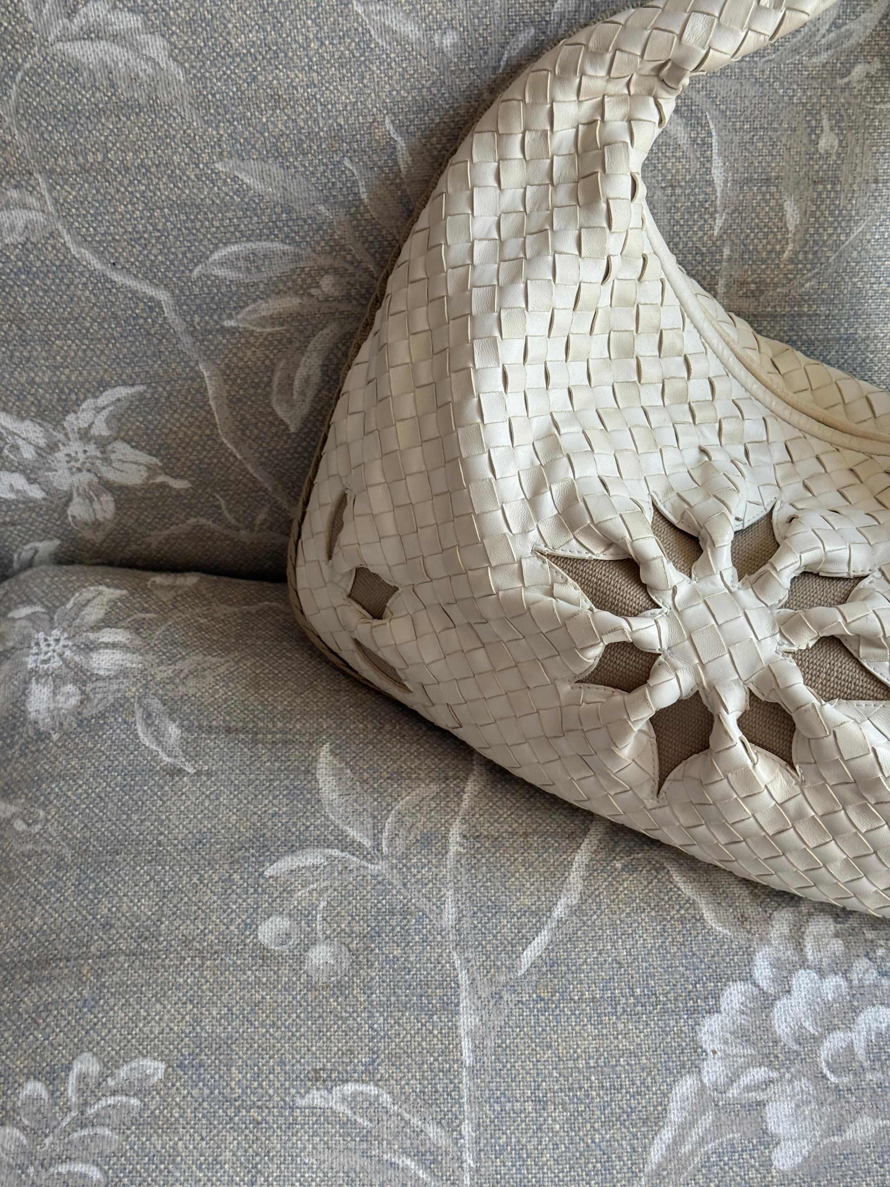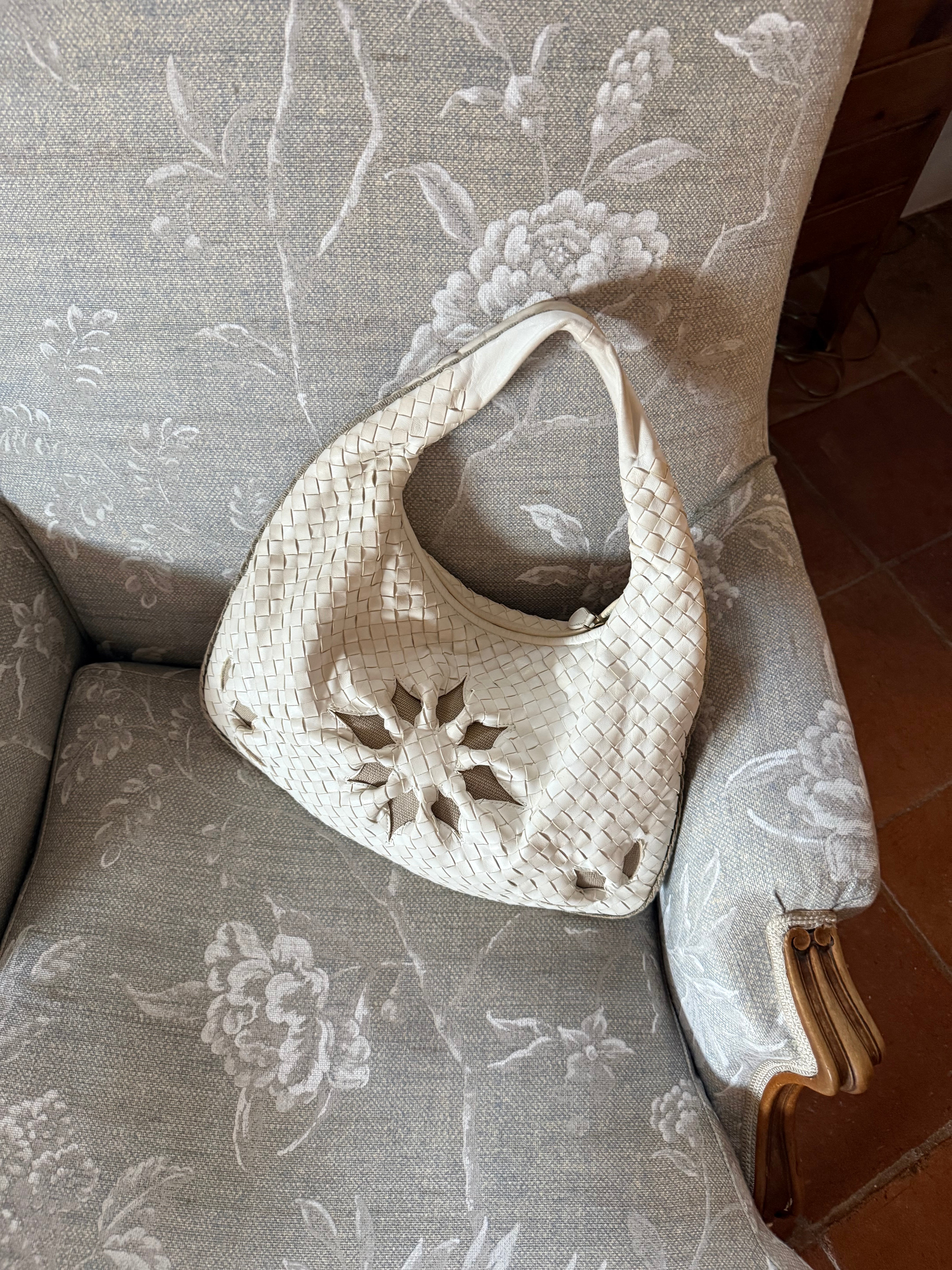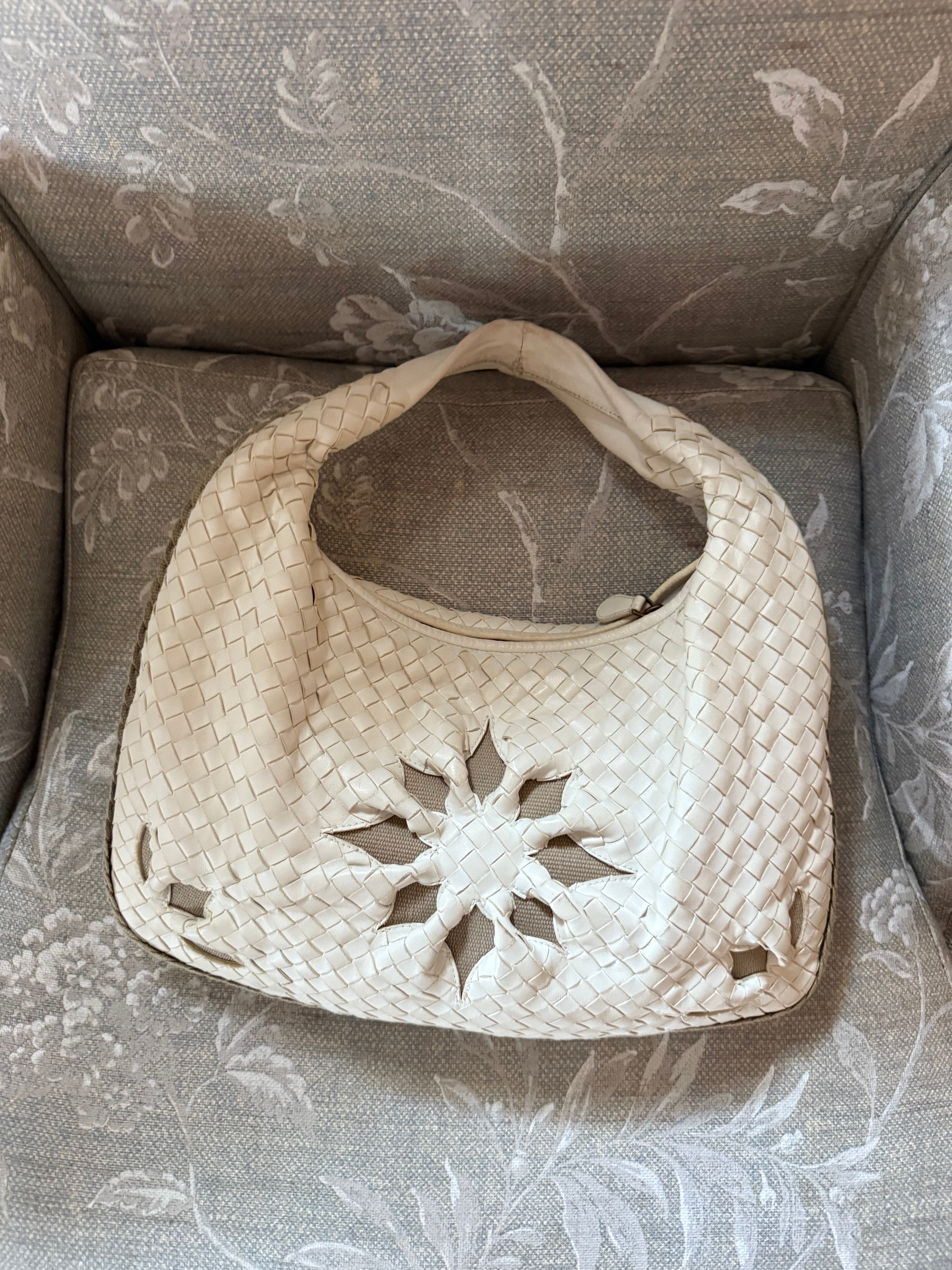 Bottega Veneta Nappa Hobo bag in White with beautiful flower cutout detail. The bag is crafted from nappa calfskin intrecciato leather.