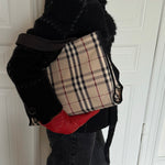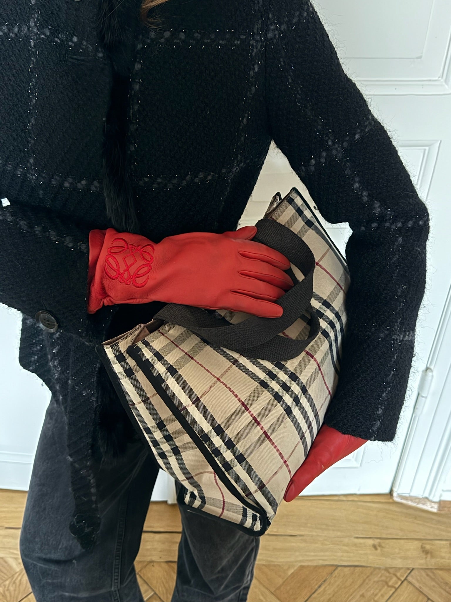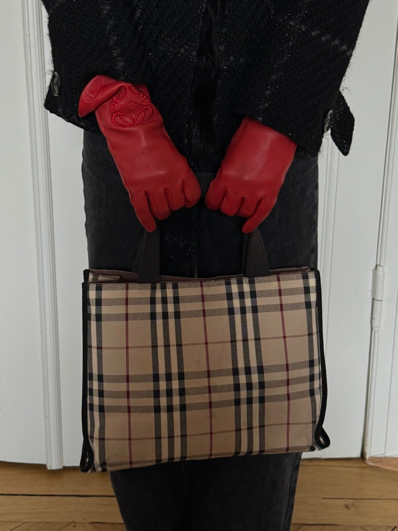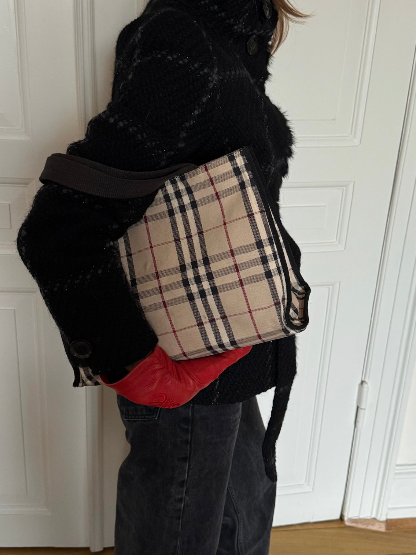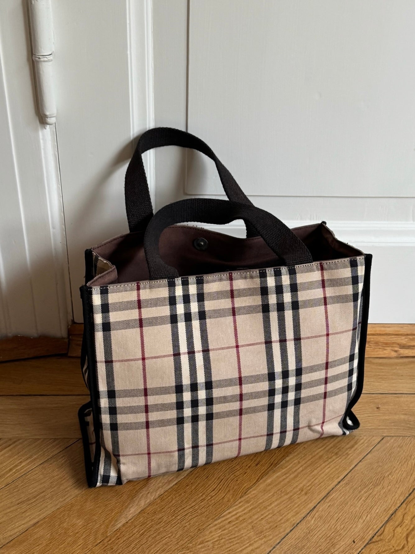Vintage Burberry check tote in beige coated canvas, complemented by black handles.