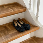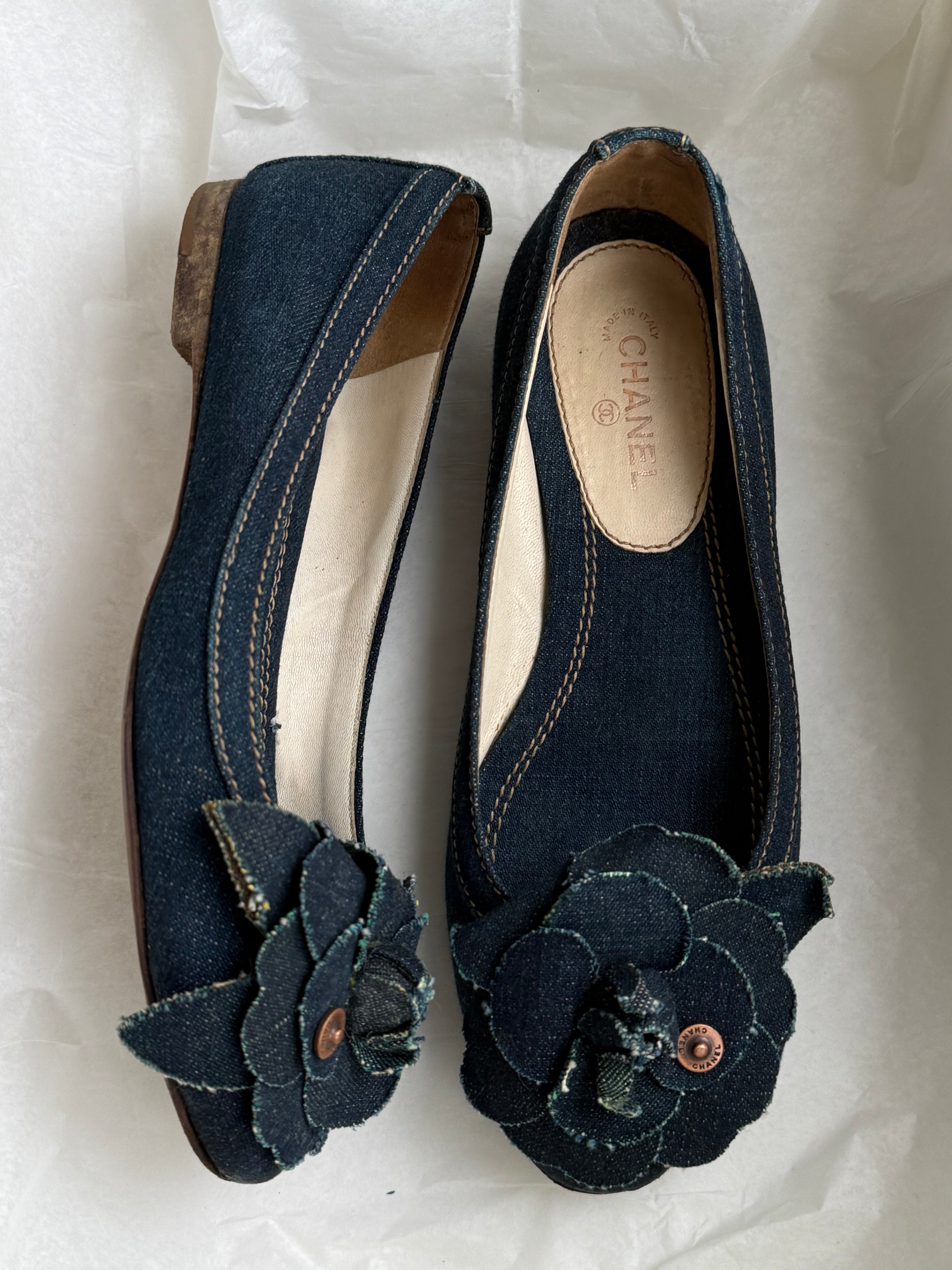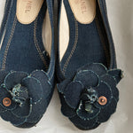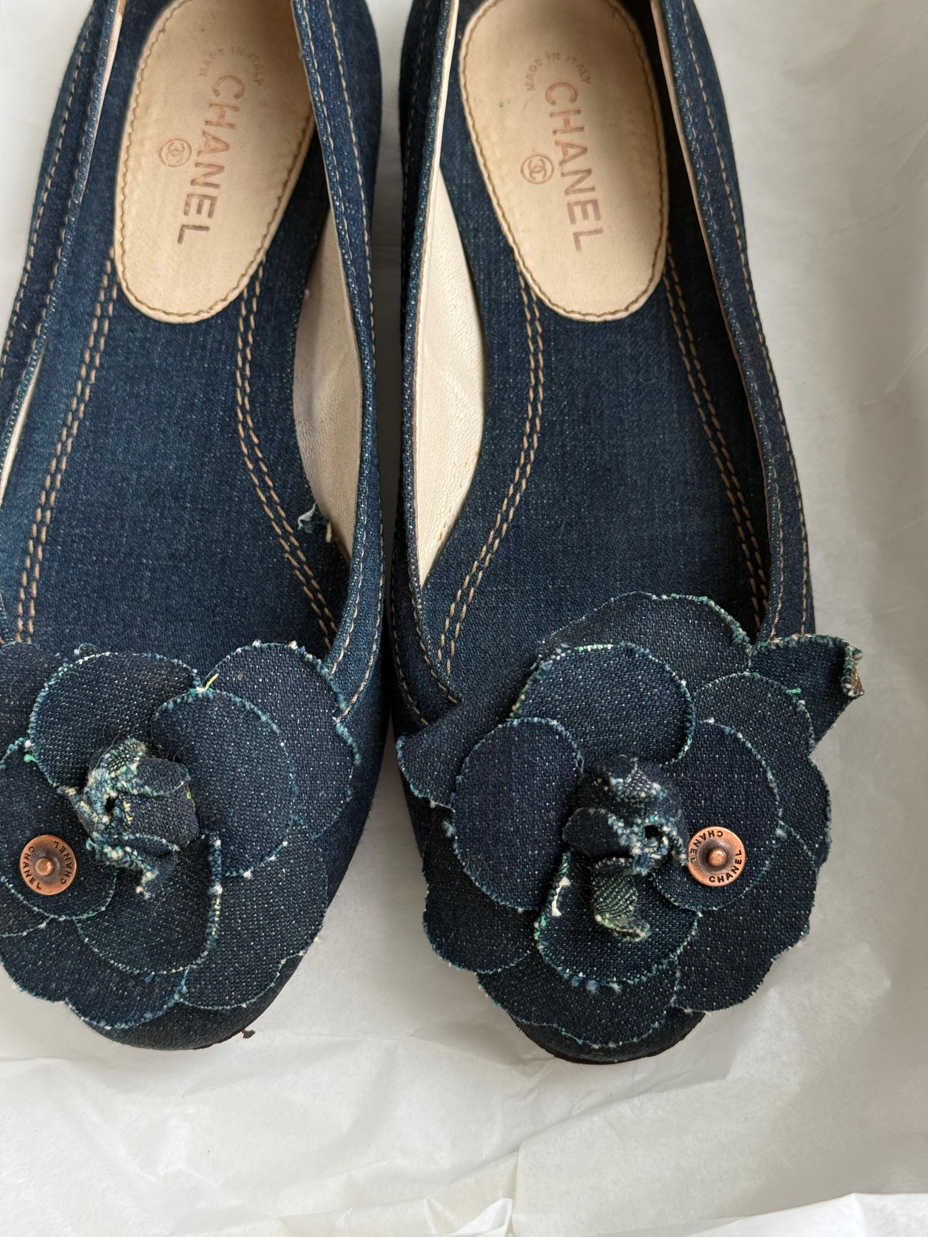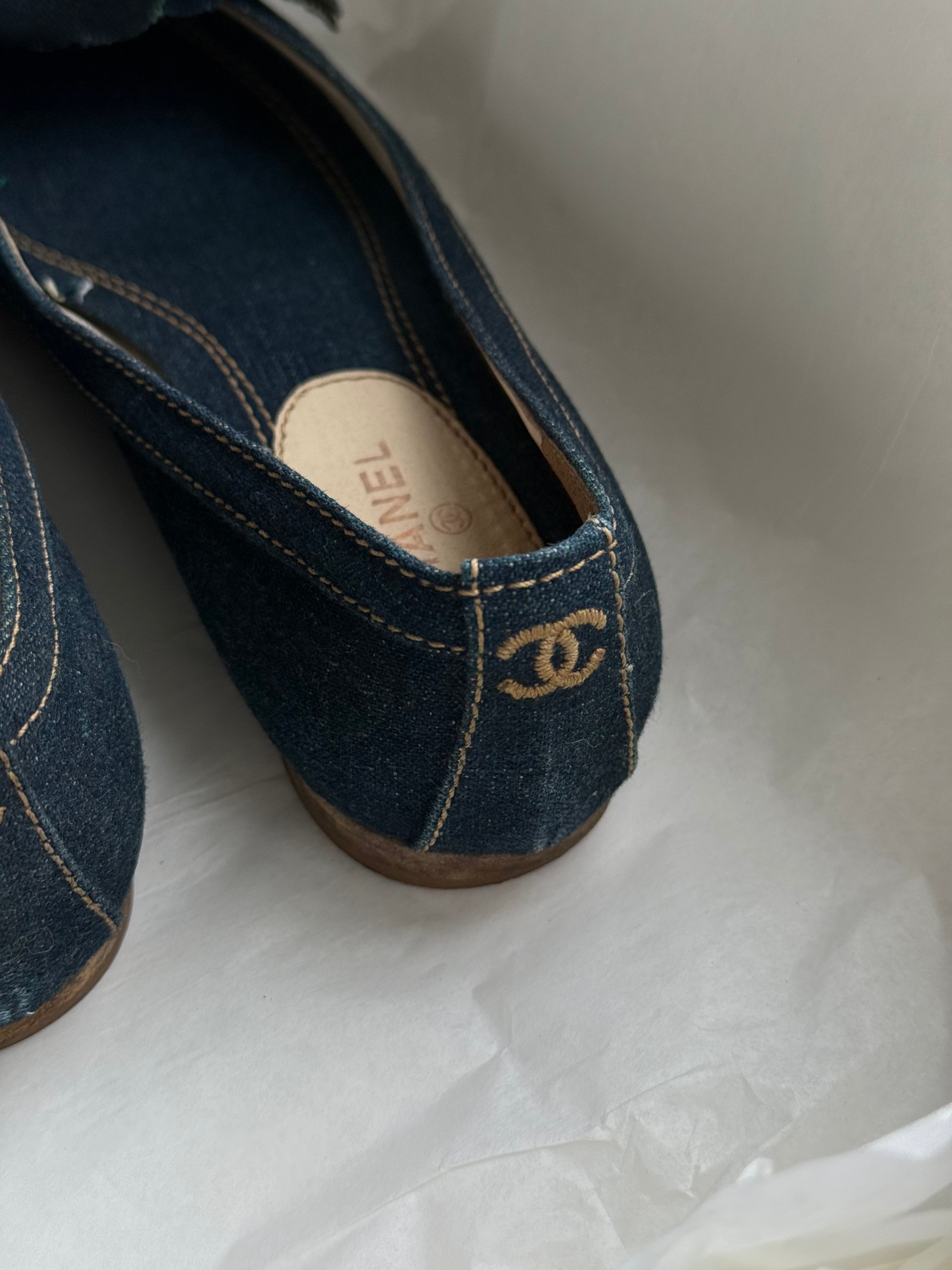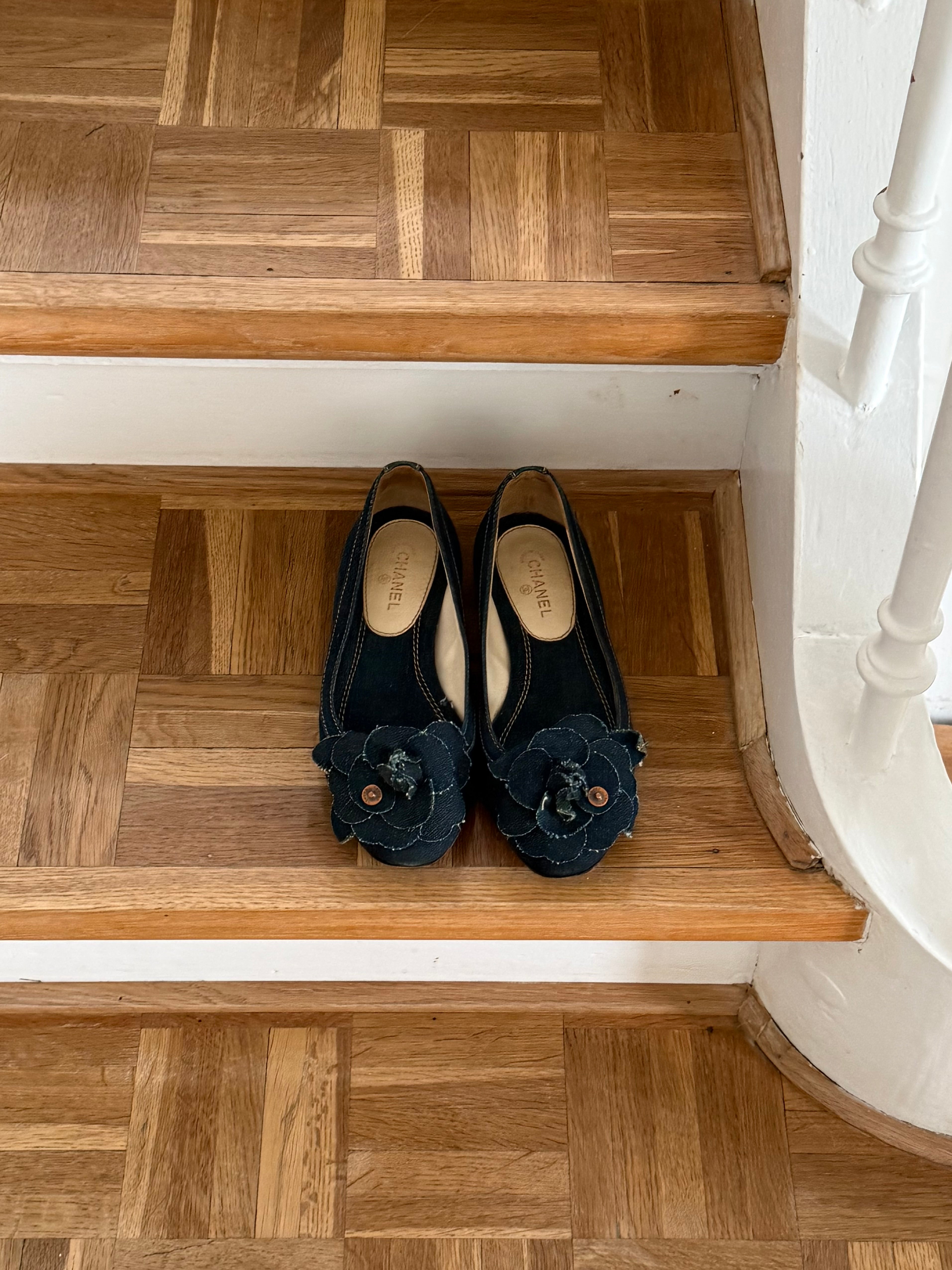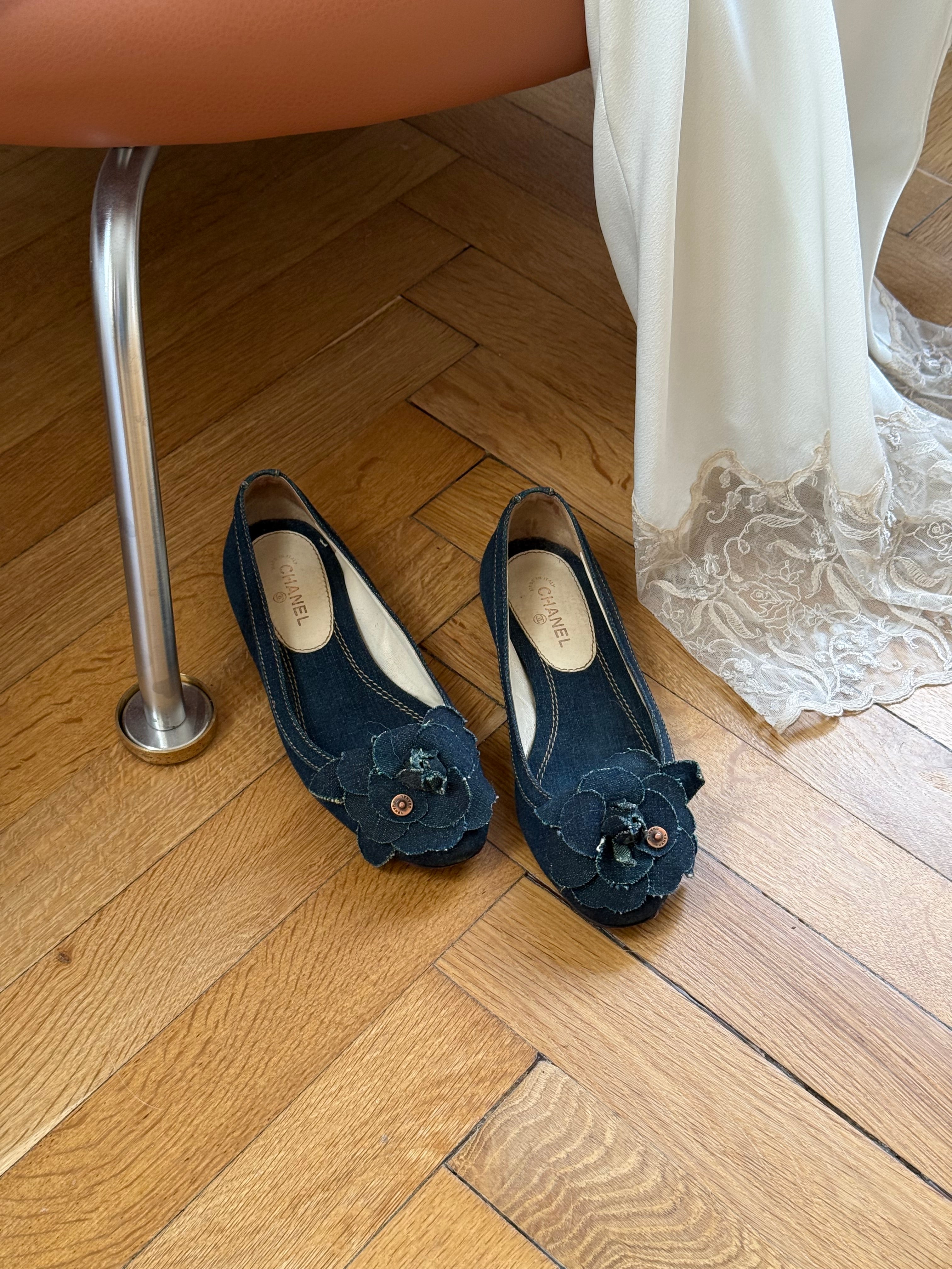 Vintage Chanel Camellia ballet flats in dark denim featuring the iconic camellia flower detail at the front.