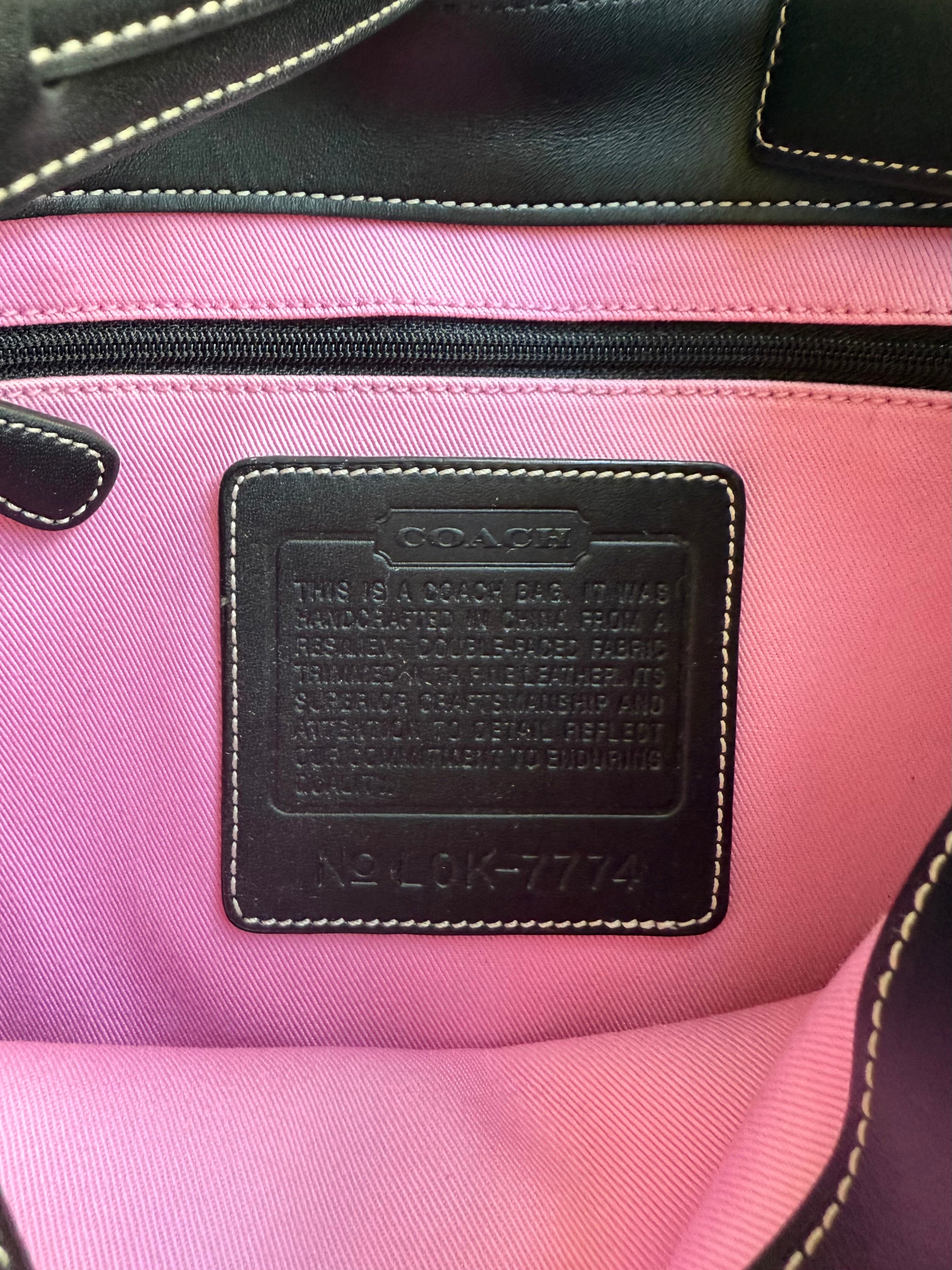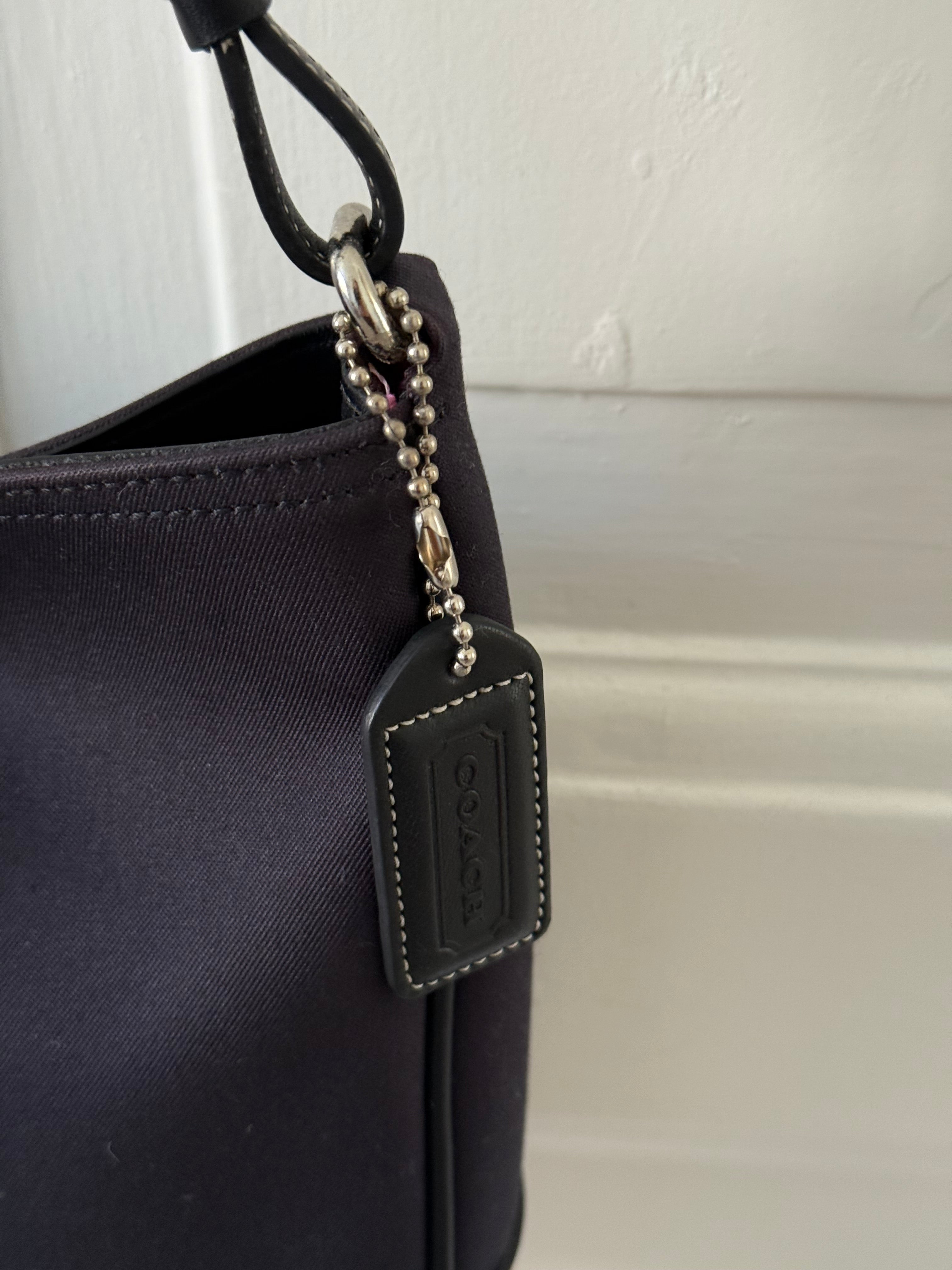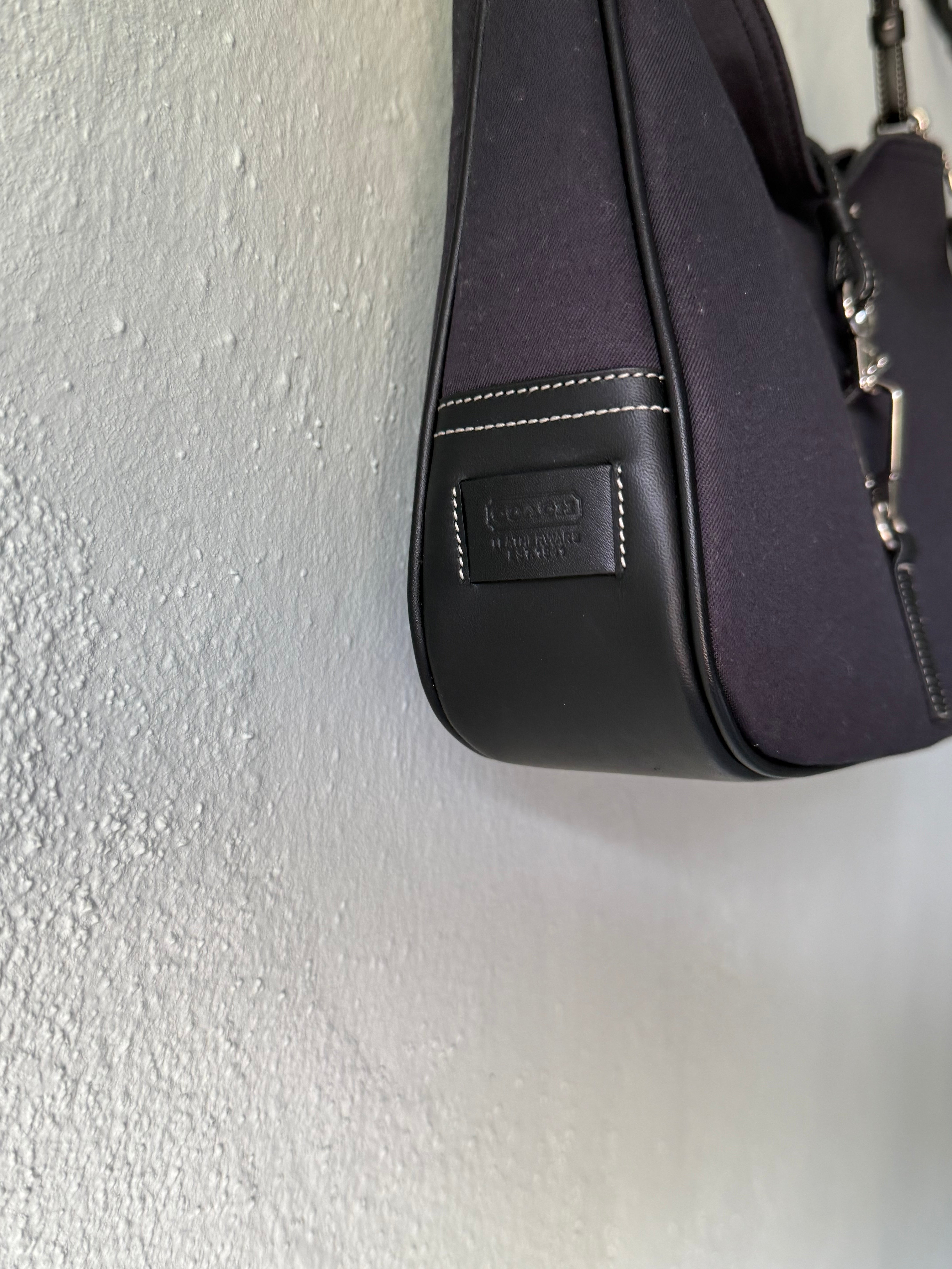 Cute vintage Coach bag in dark navy canvas and black leather with pink interior in very good condition.