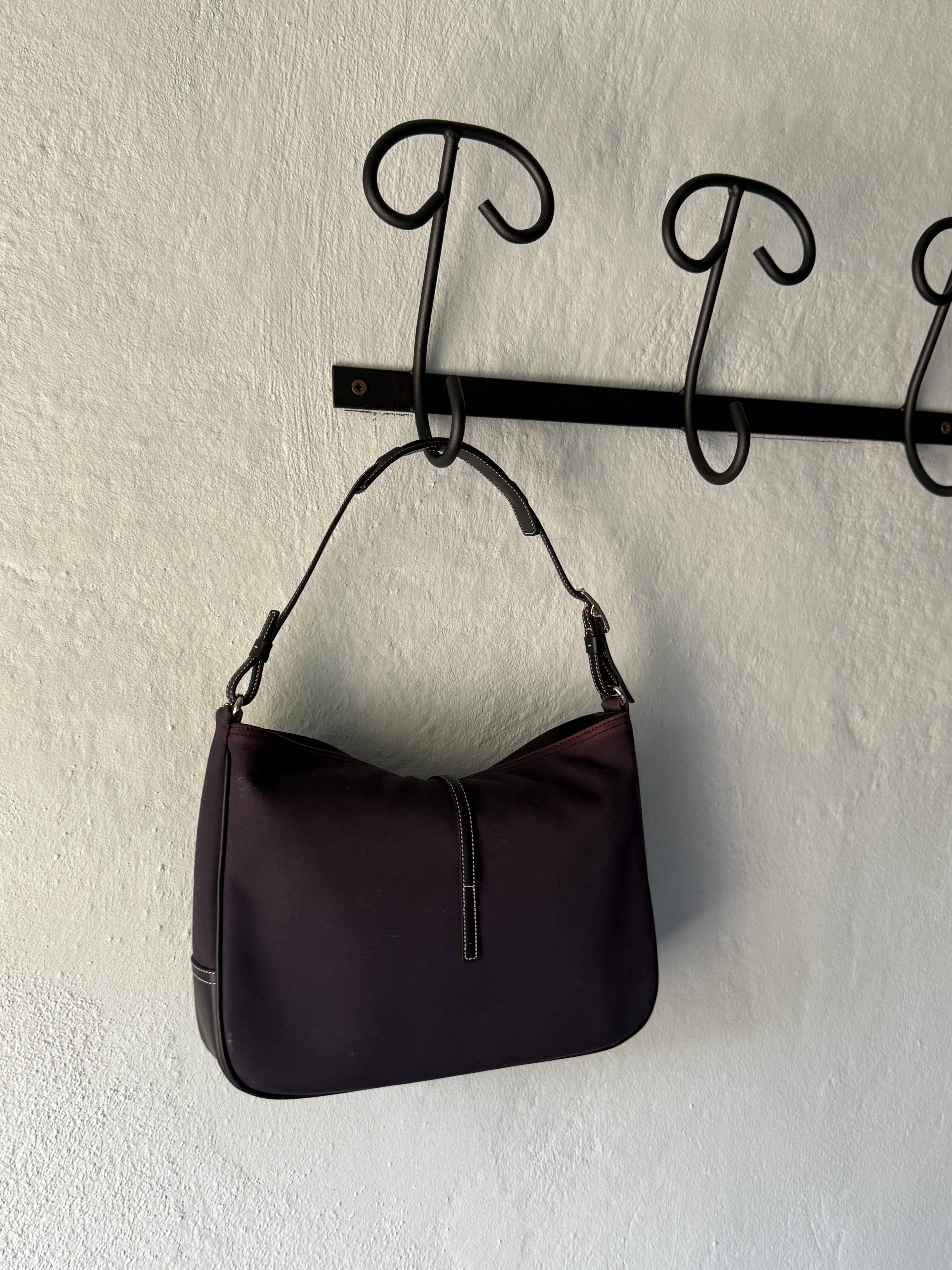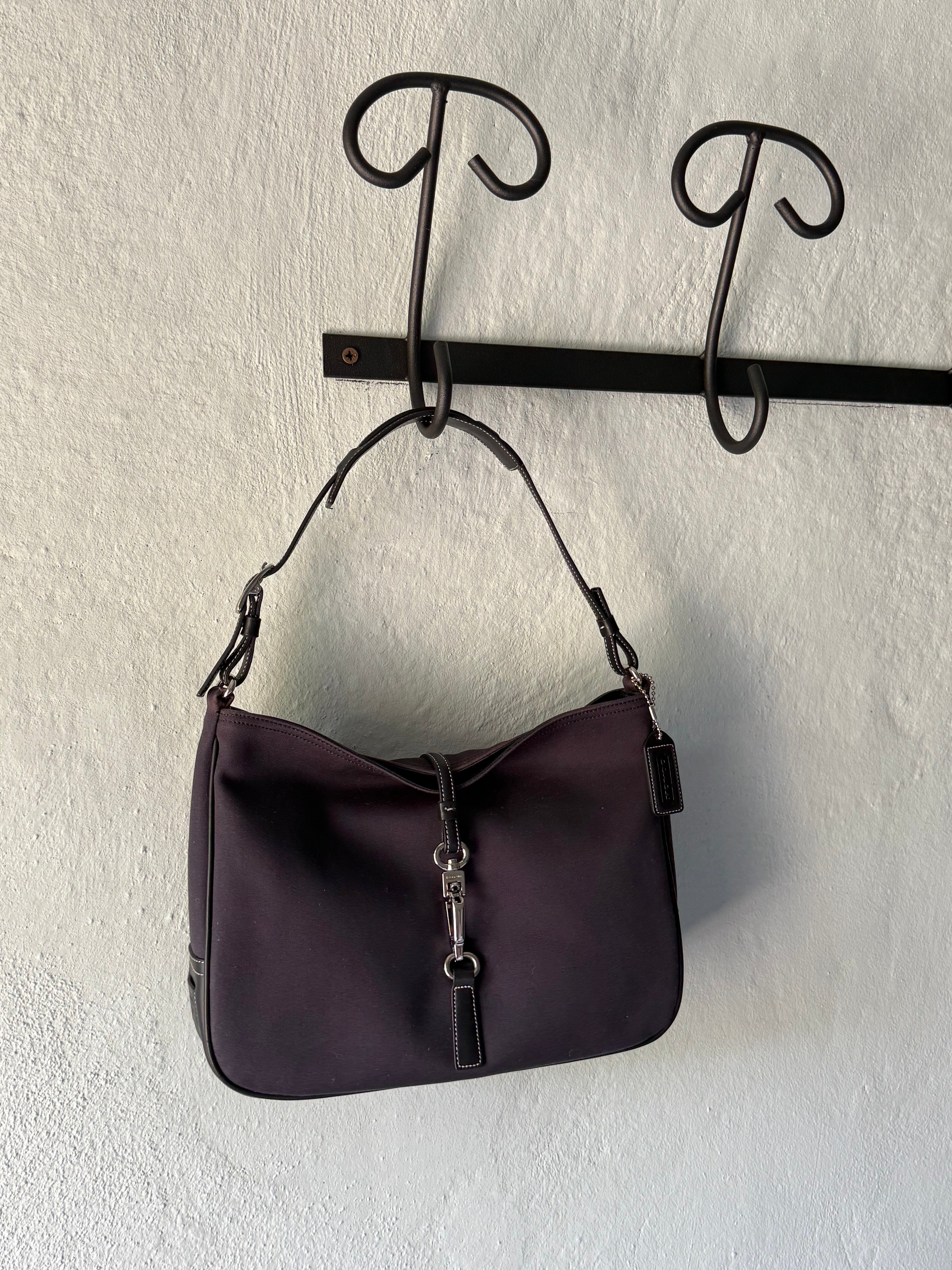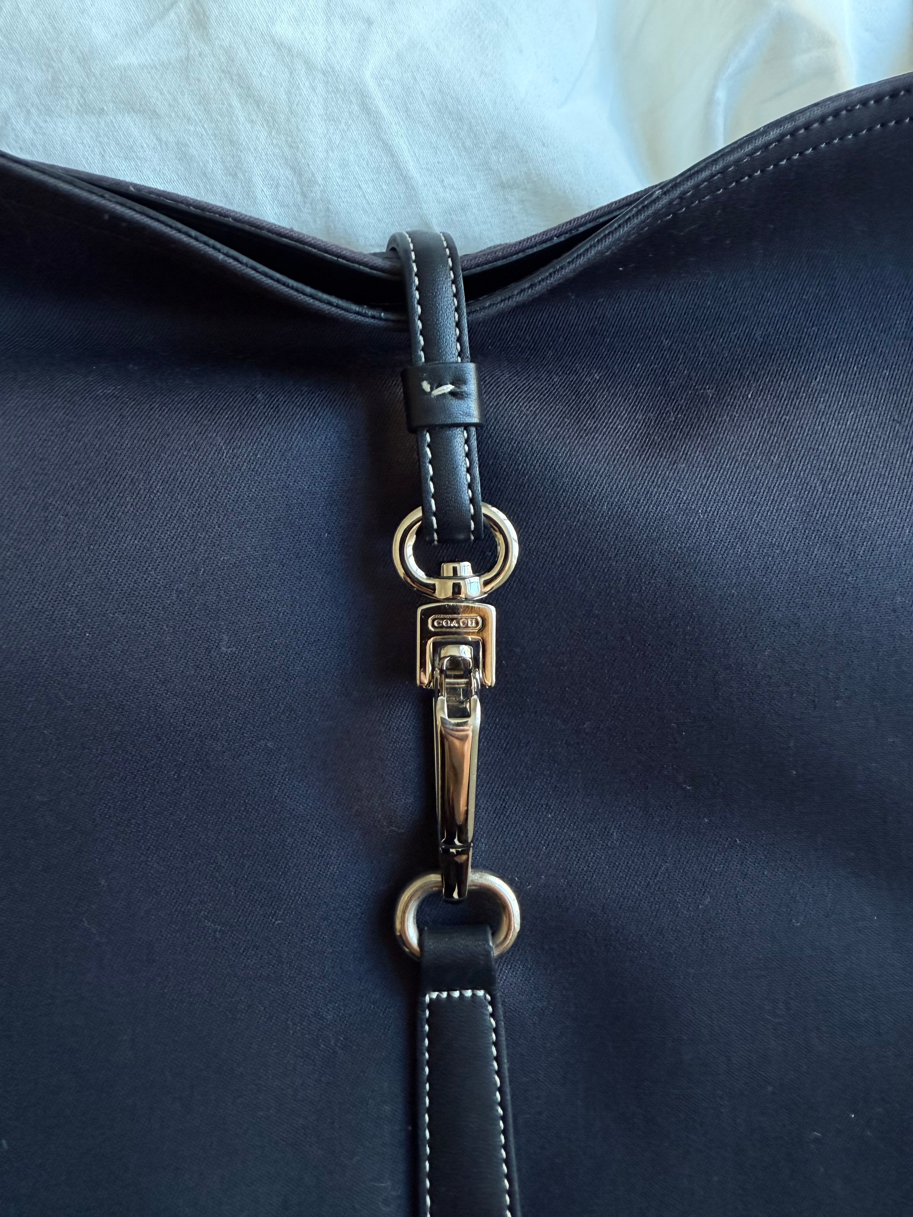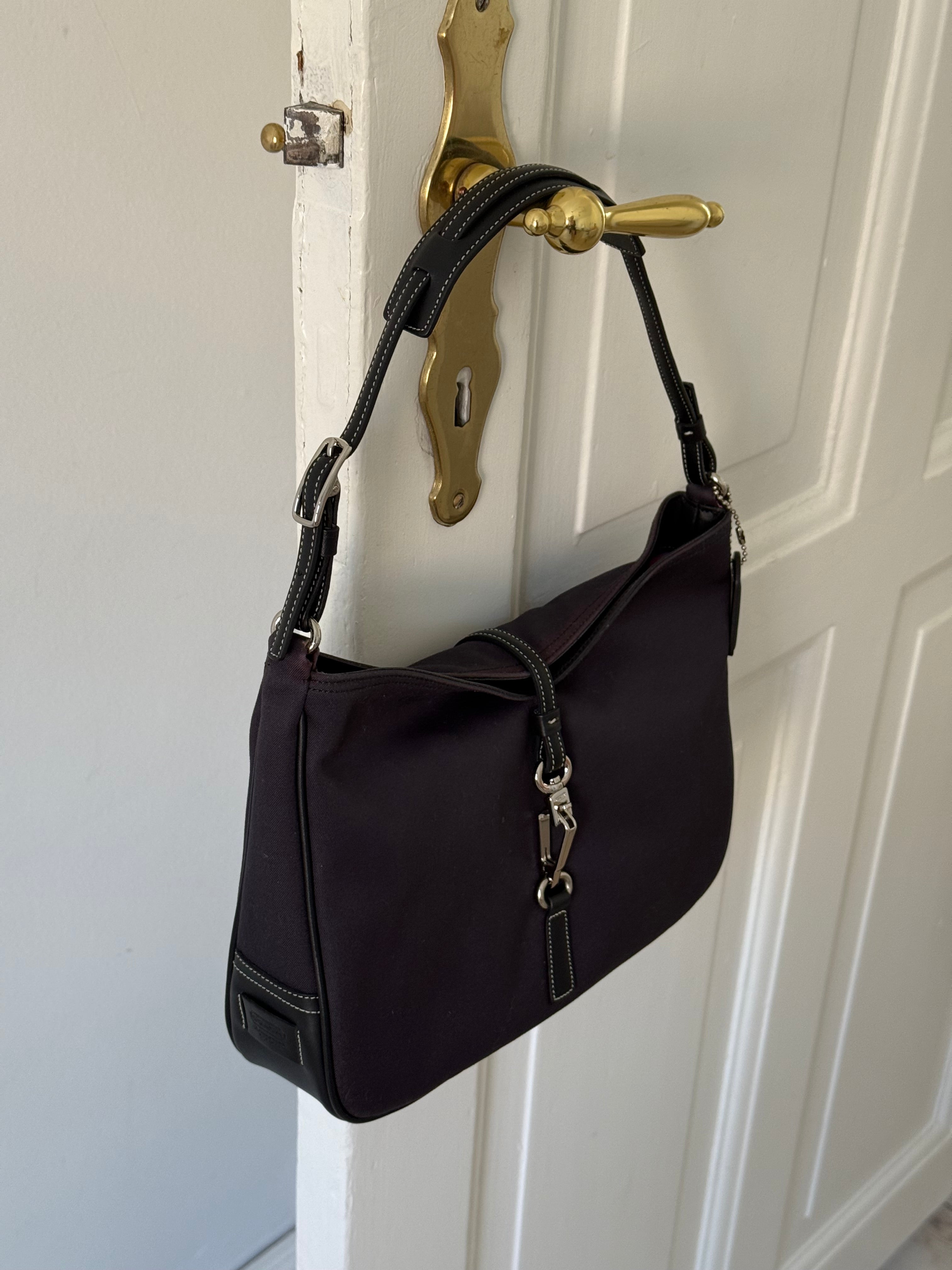 Cute vintage Coach bag in dark navy canvas and black leather with pink interior in very good condition.