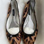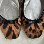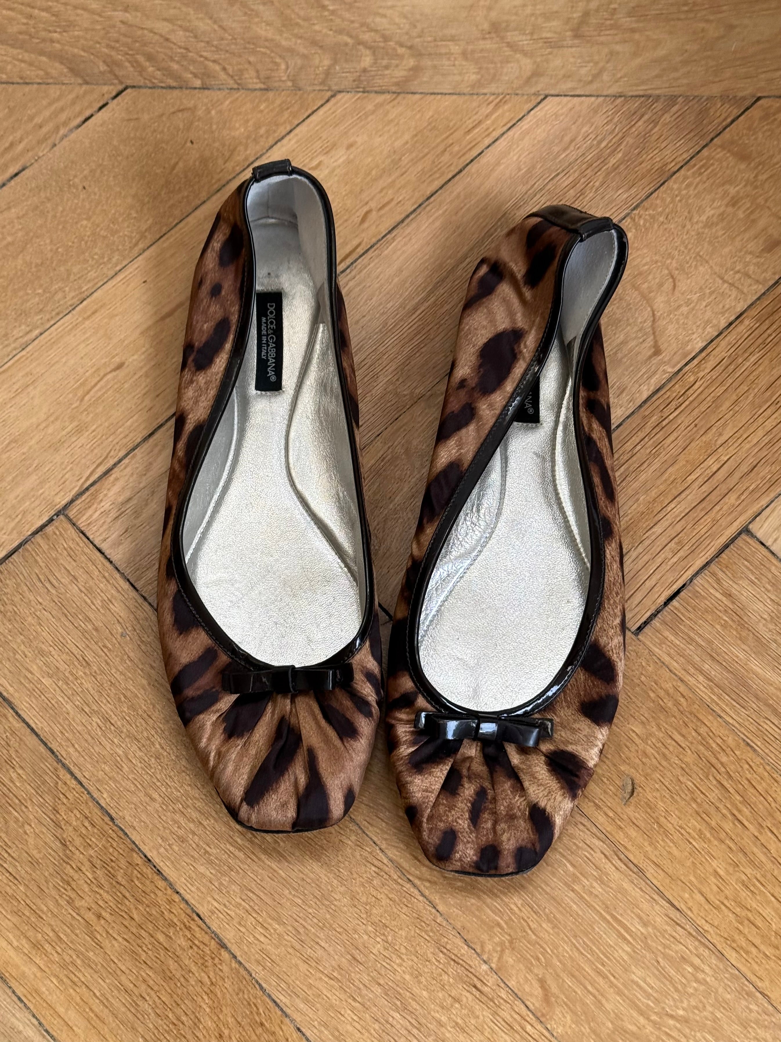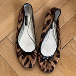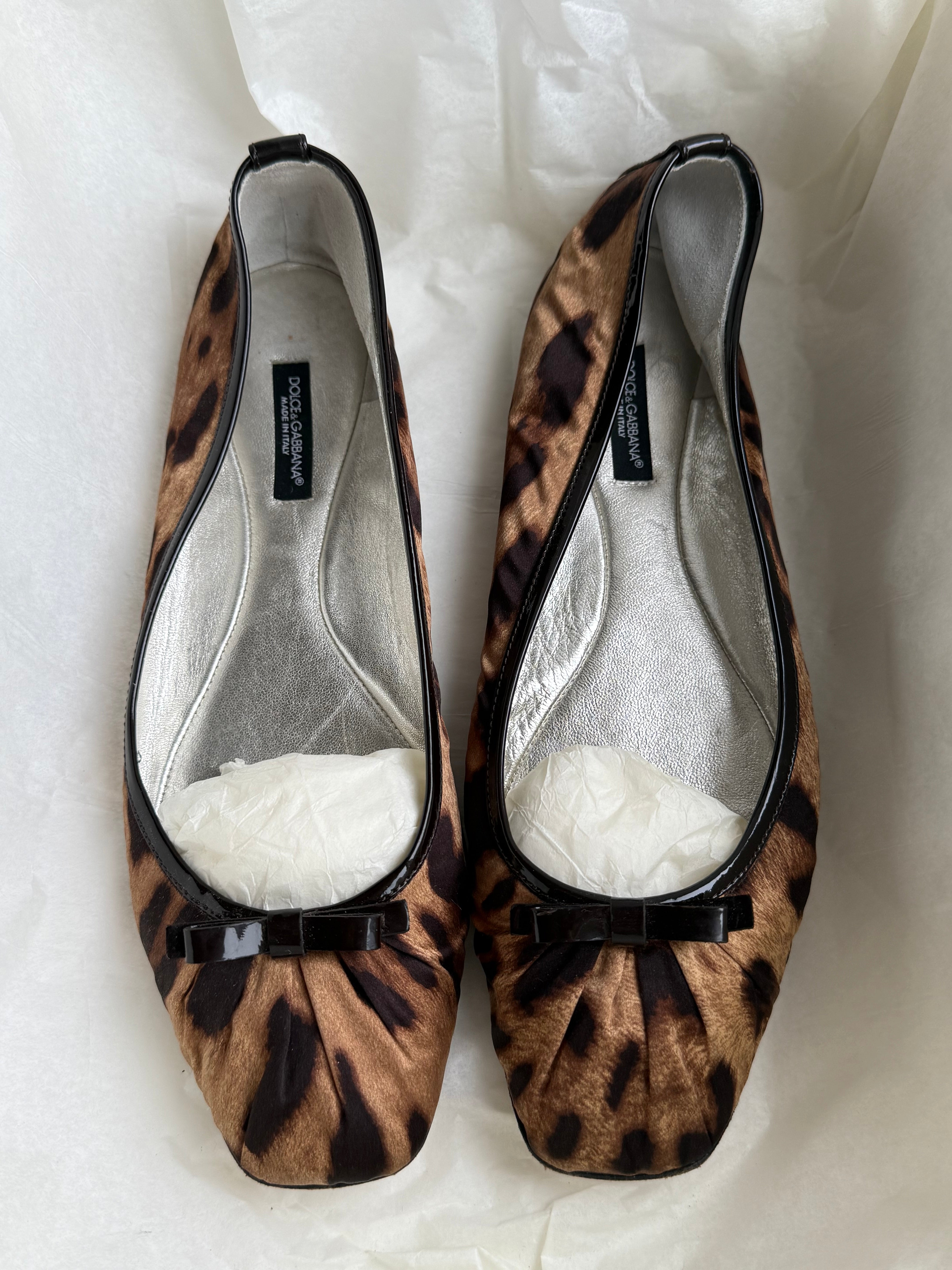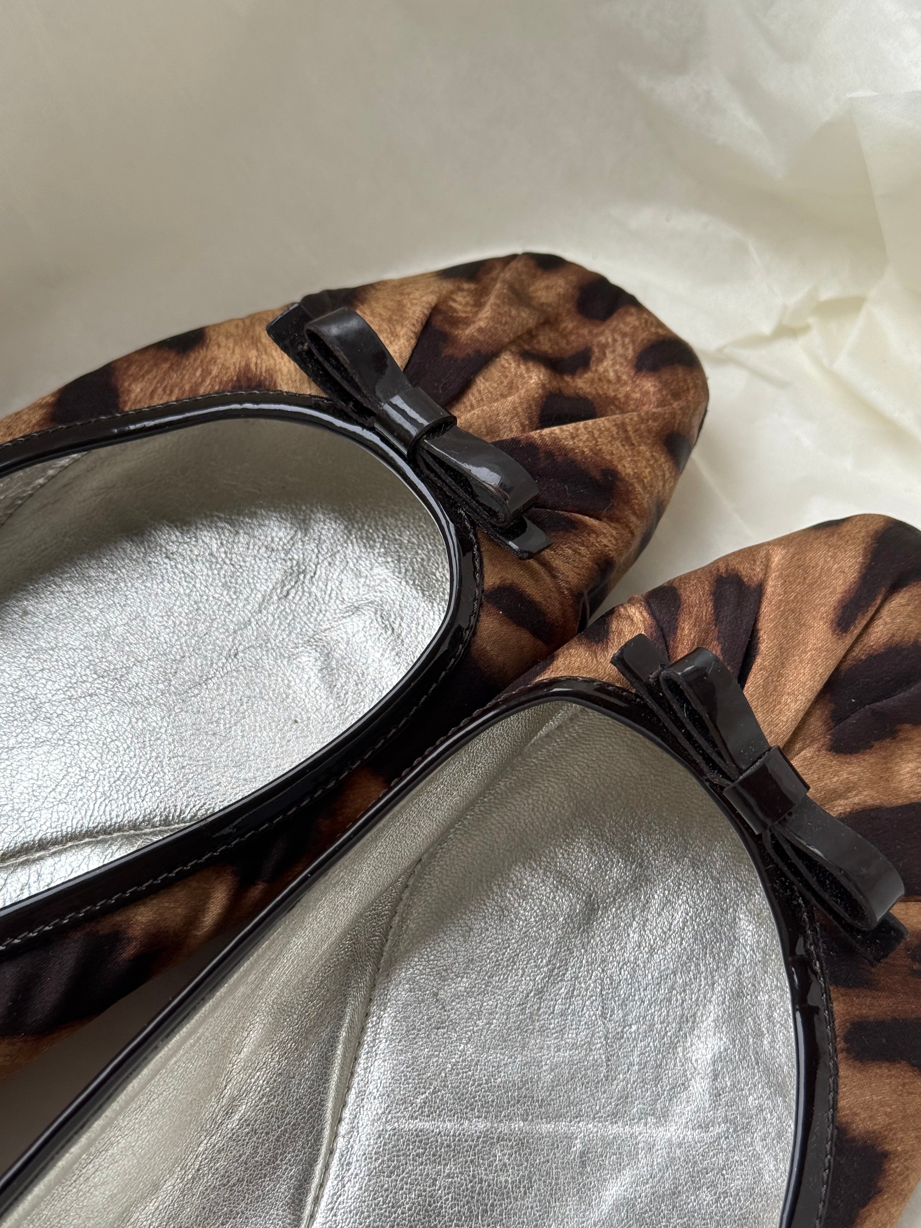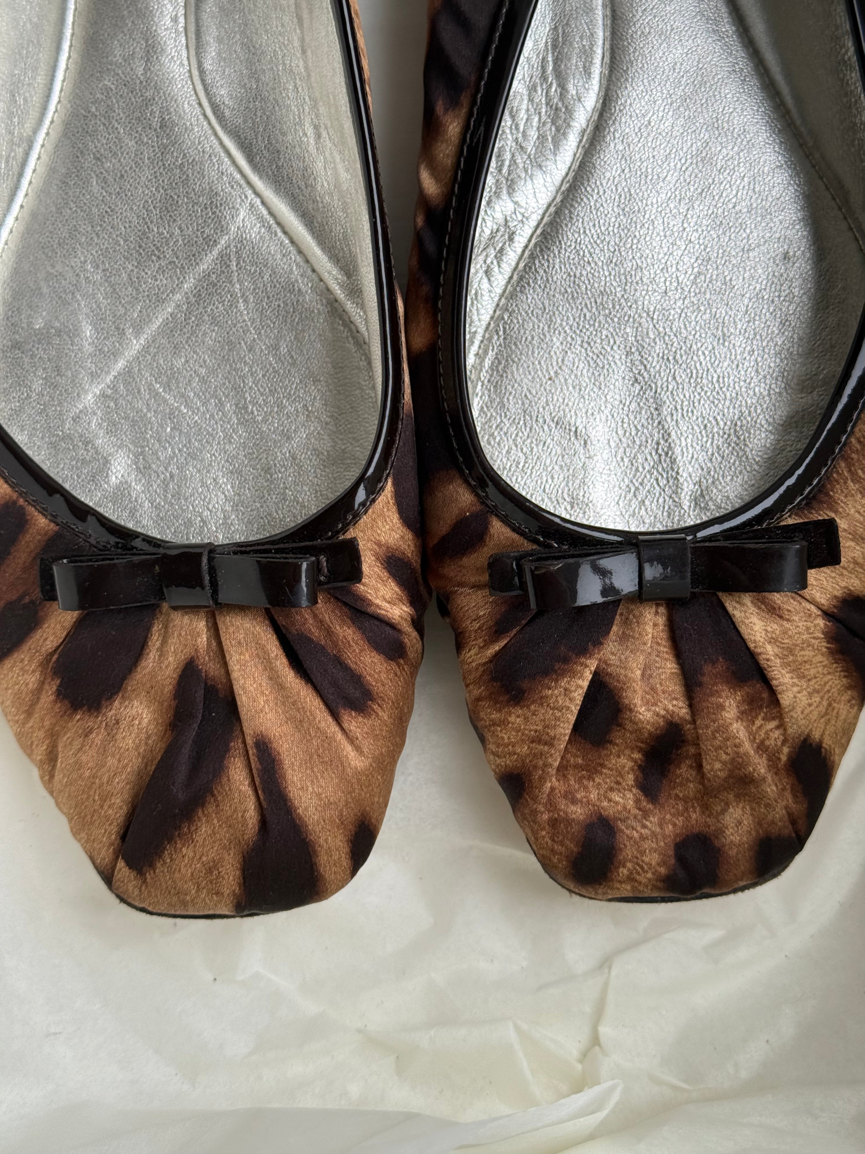 Vintage Dolce & Gabbana leopard print ballet flats with square toe, black patent bow and silver leather lining.