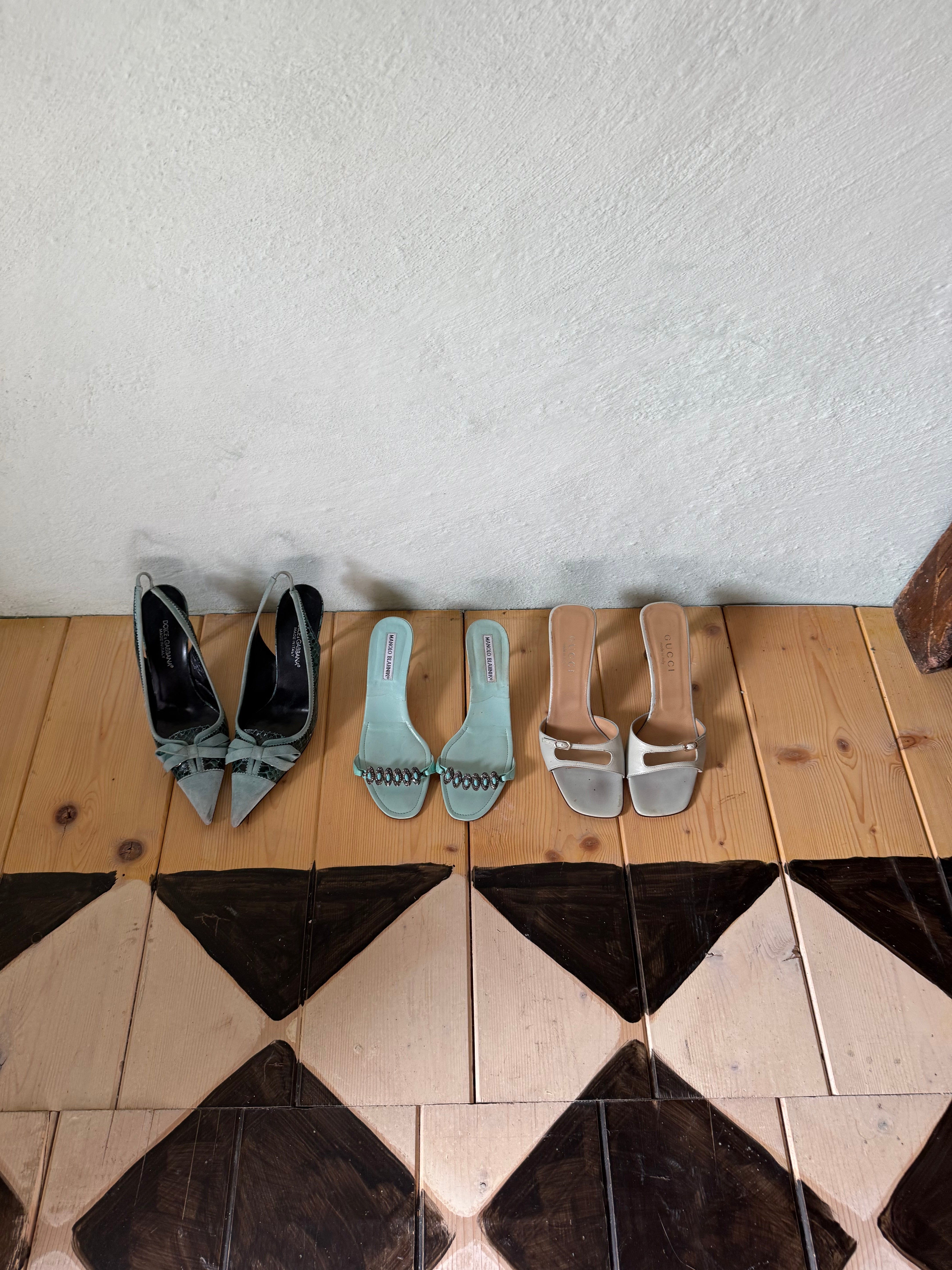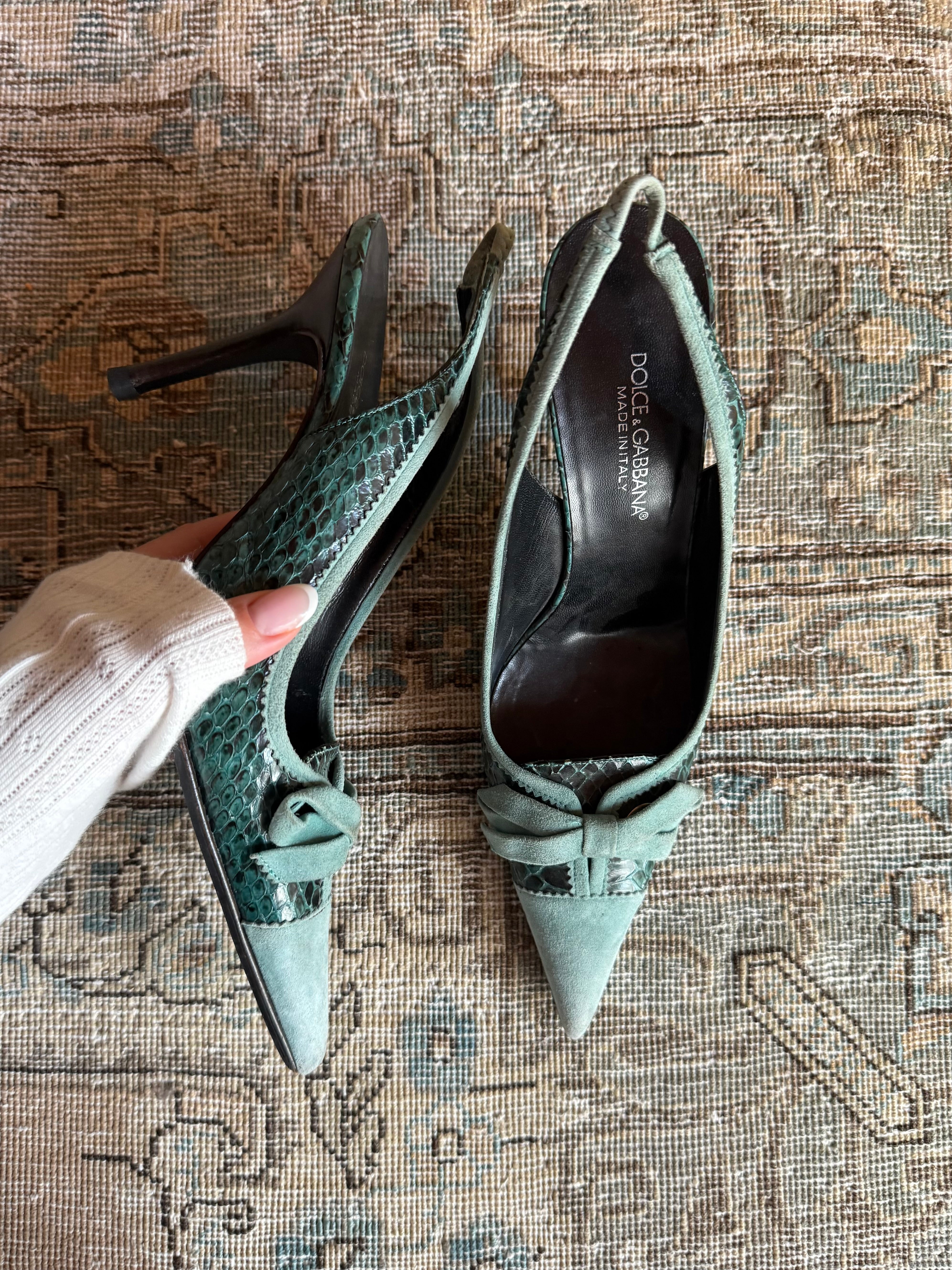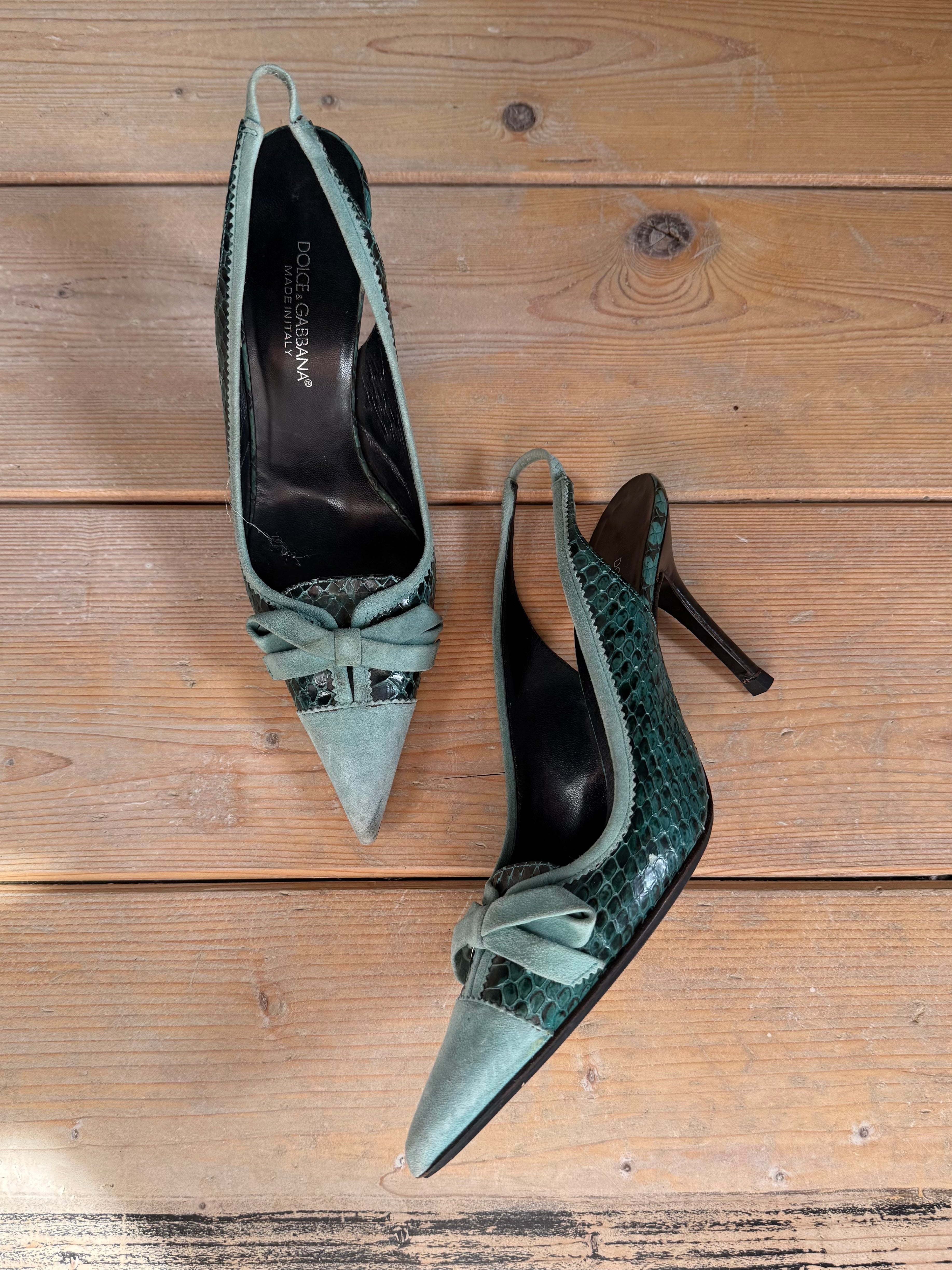 Vintage Dolce & Gabbana slingback heels in green snake-embossed leather with suede pointed toe and bow detail.