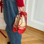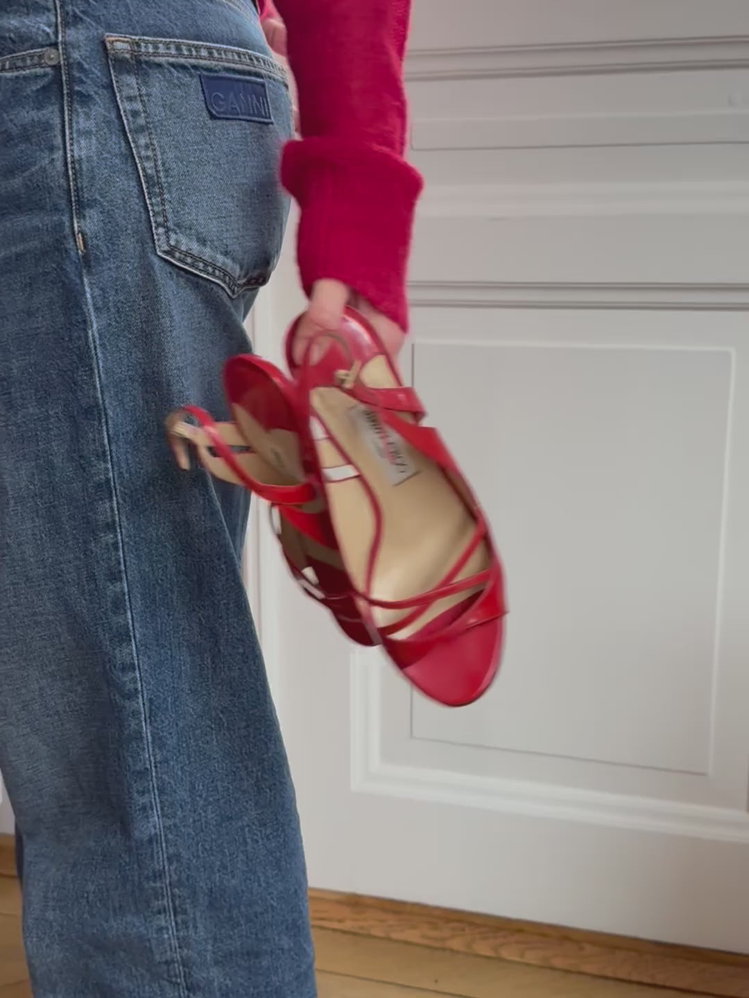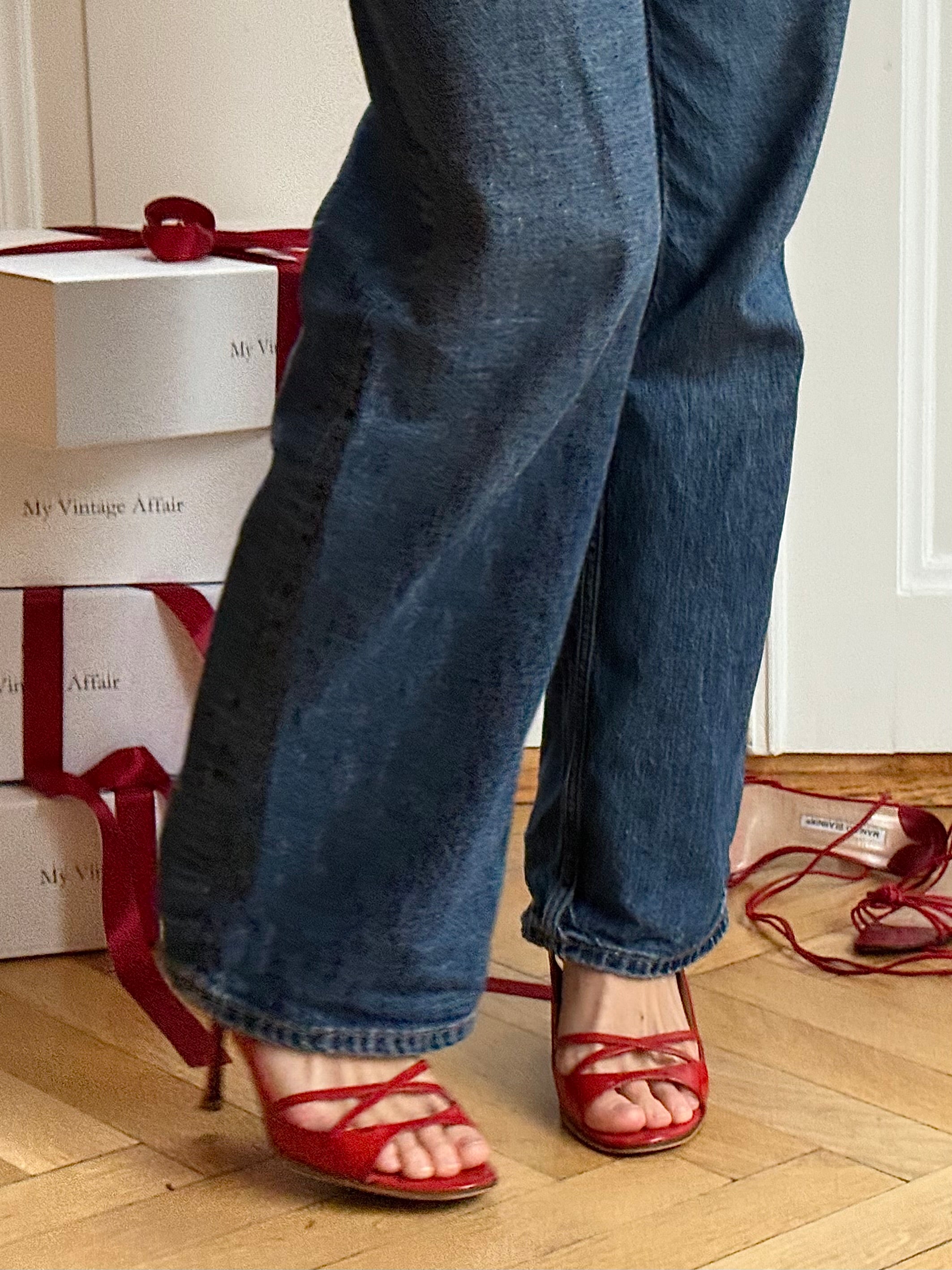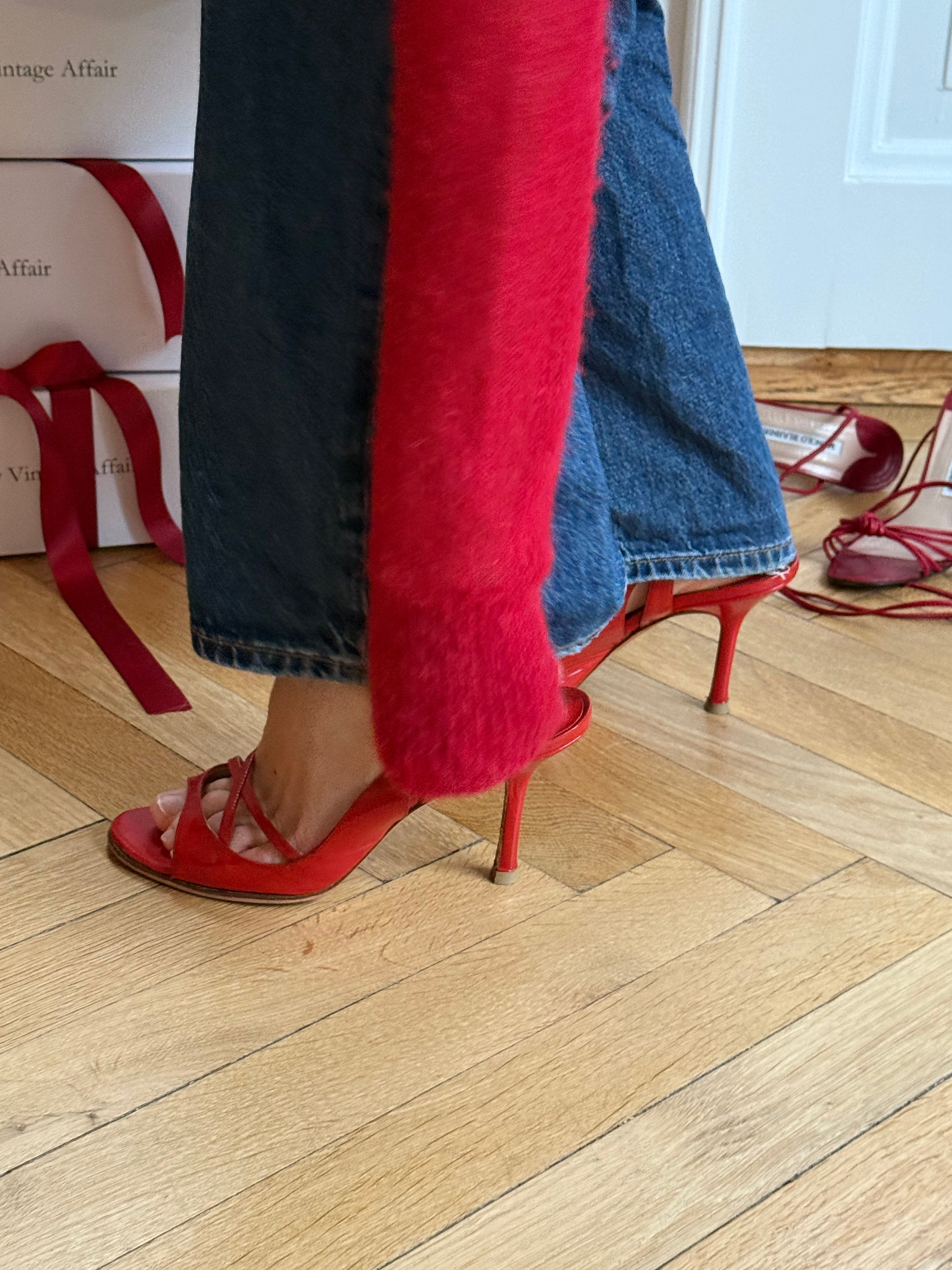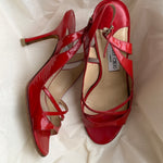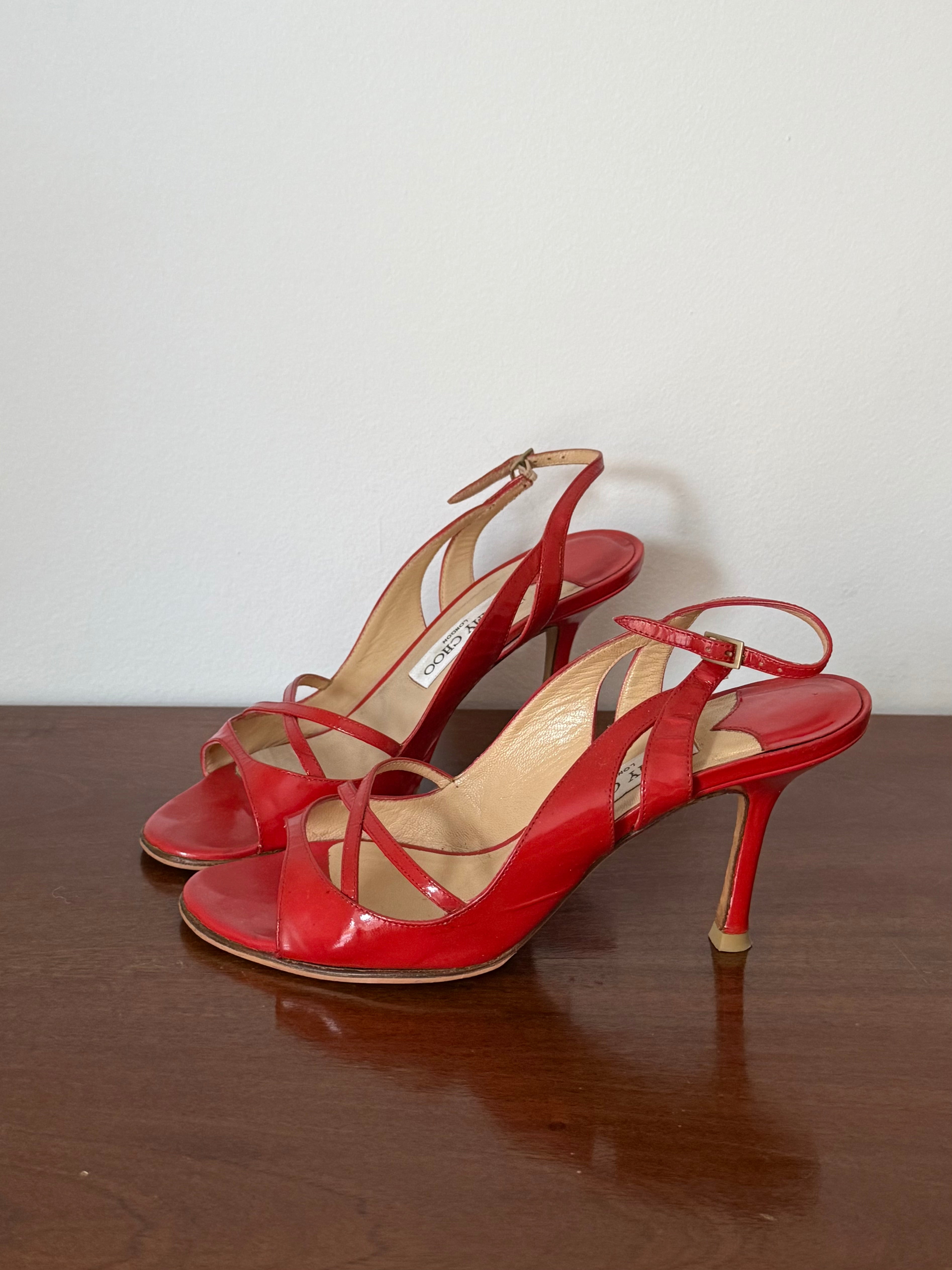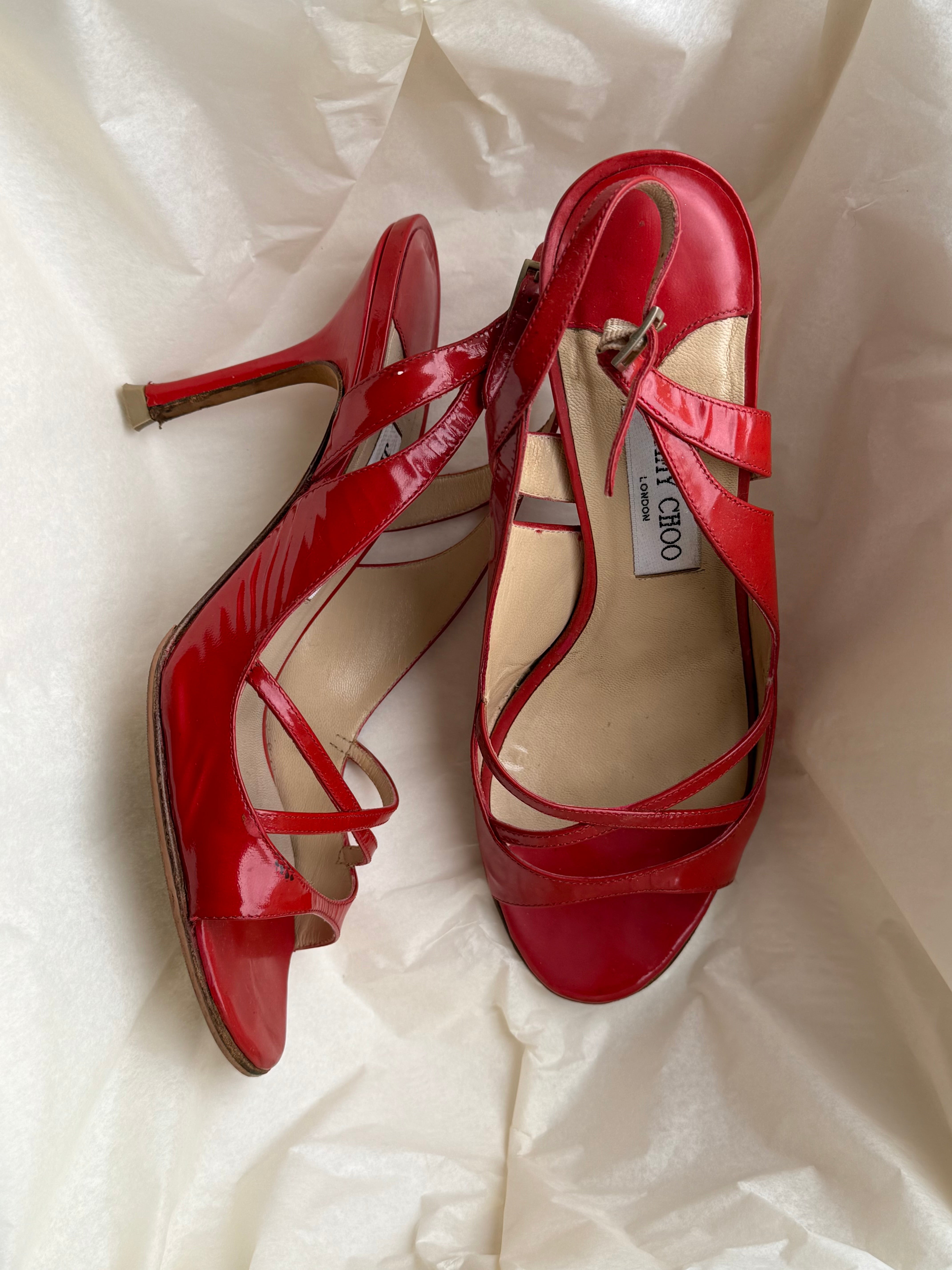 Vintage red patent leather Jimmy Choo sandals with slim crossover straps, adjustable ankle strap and a classic stiletto heel. Comes with original box and dustbag.