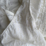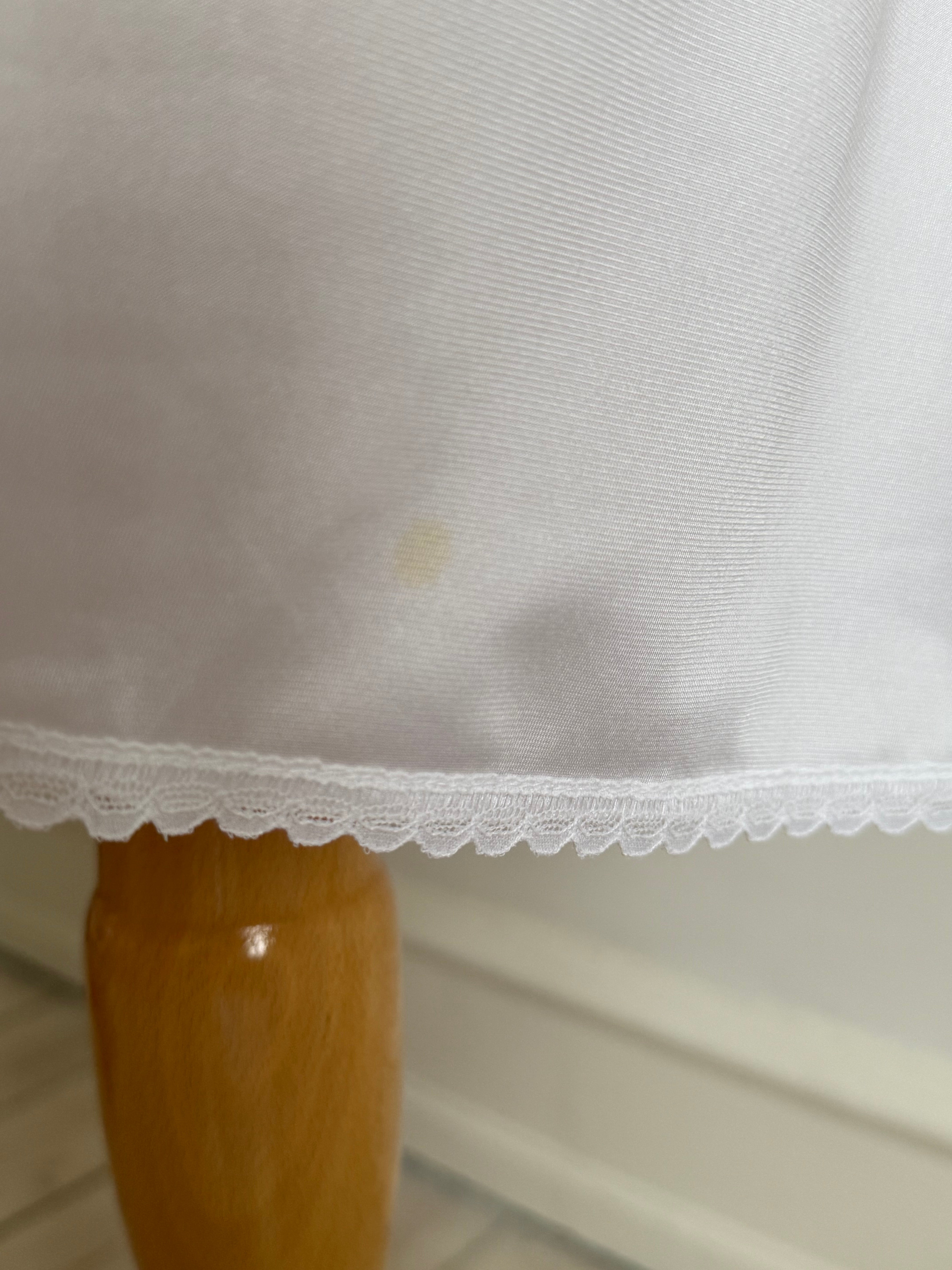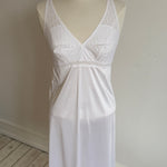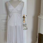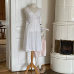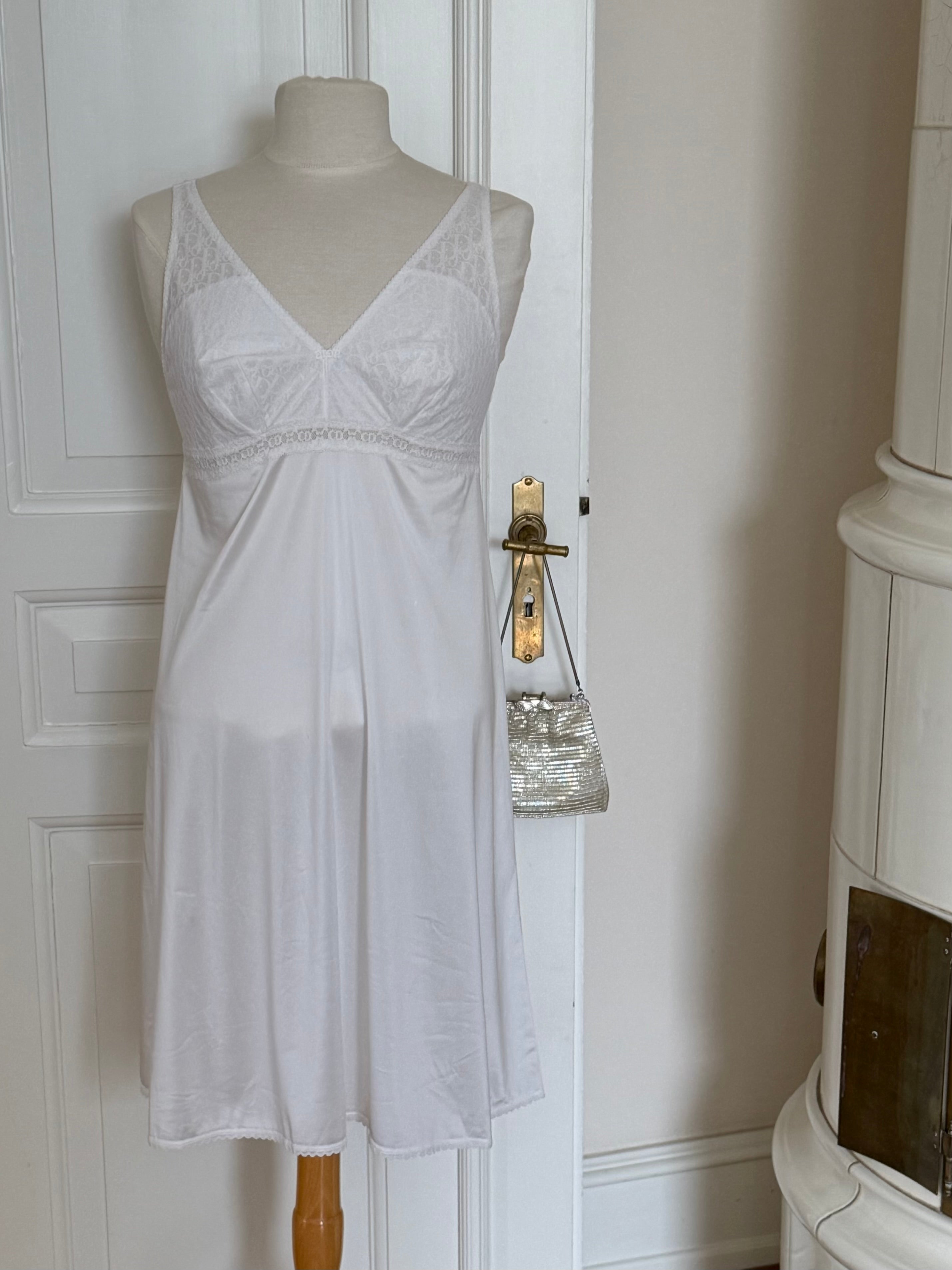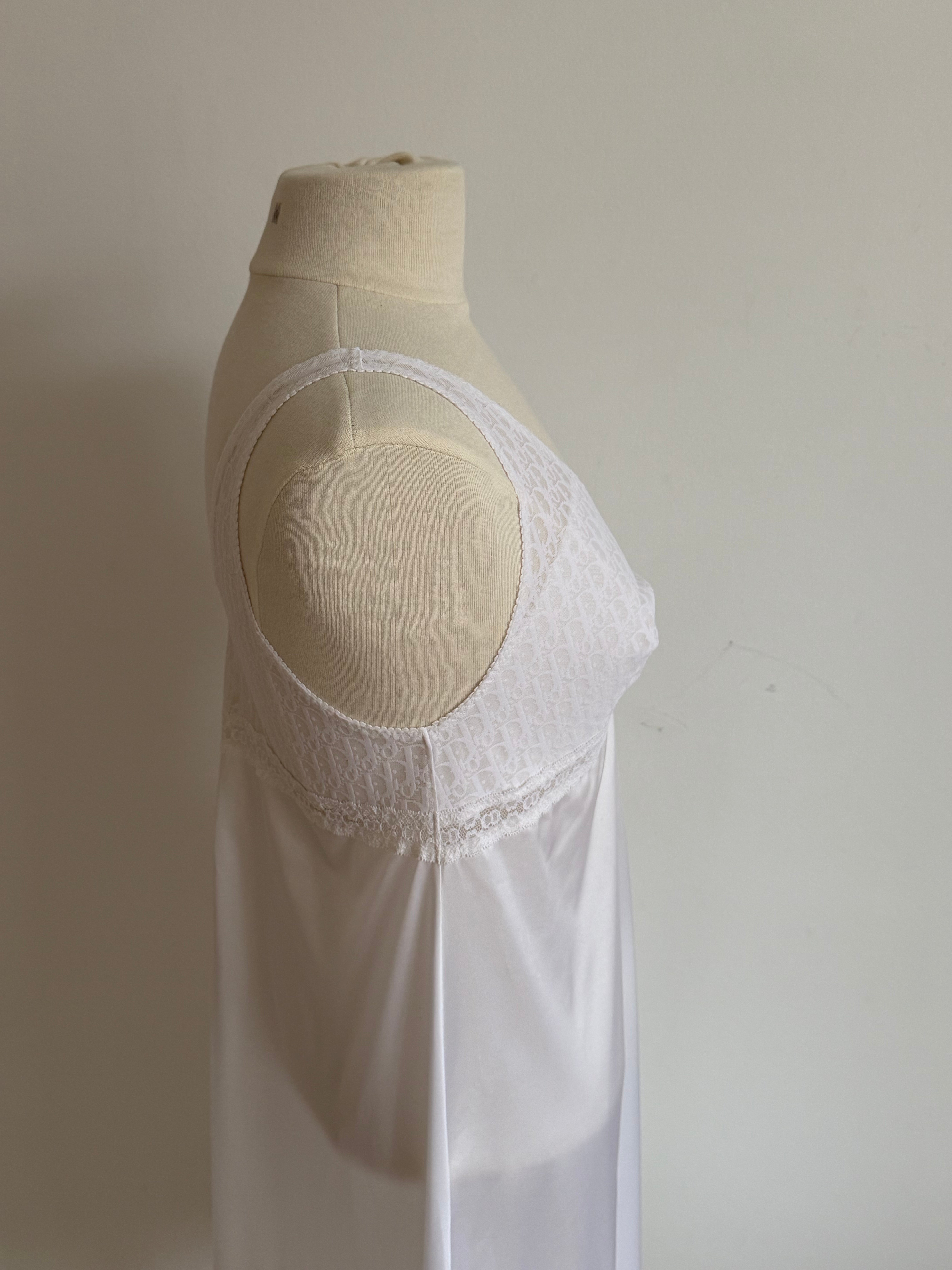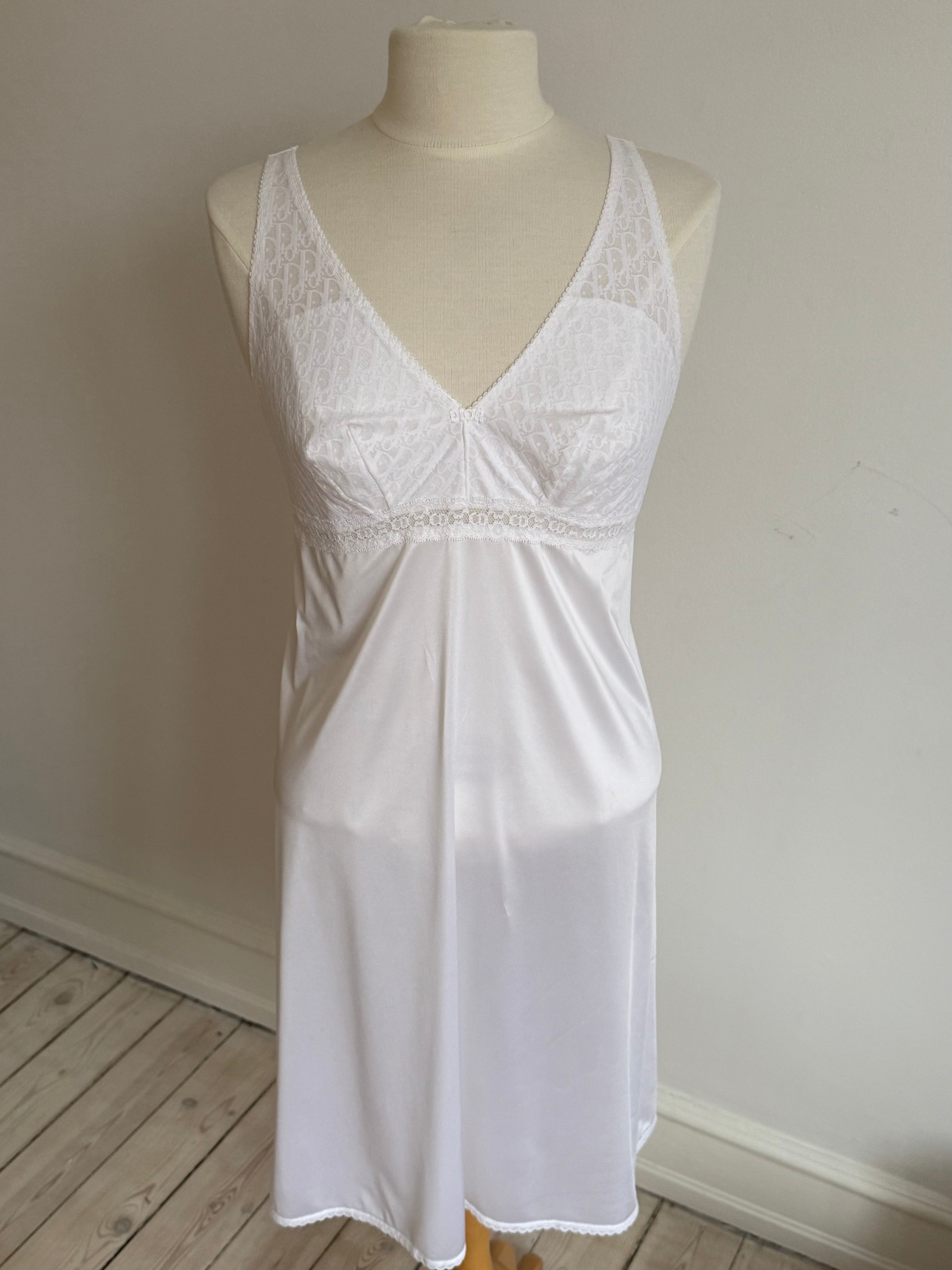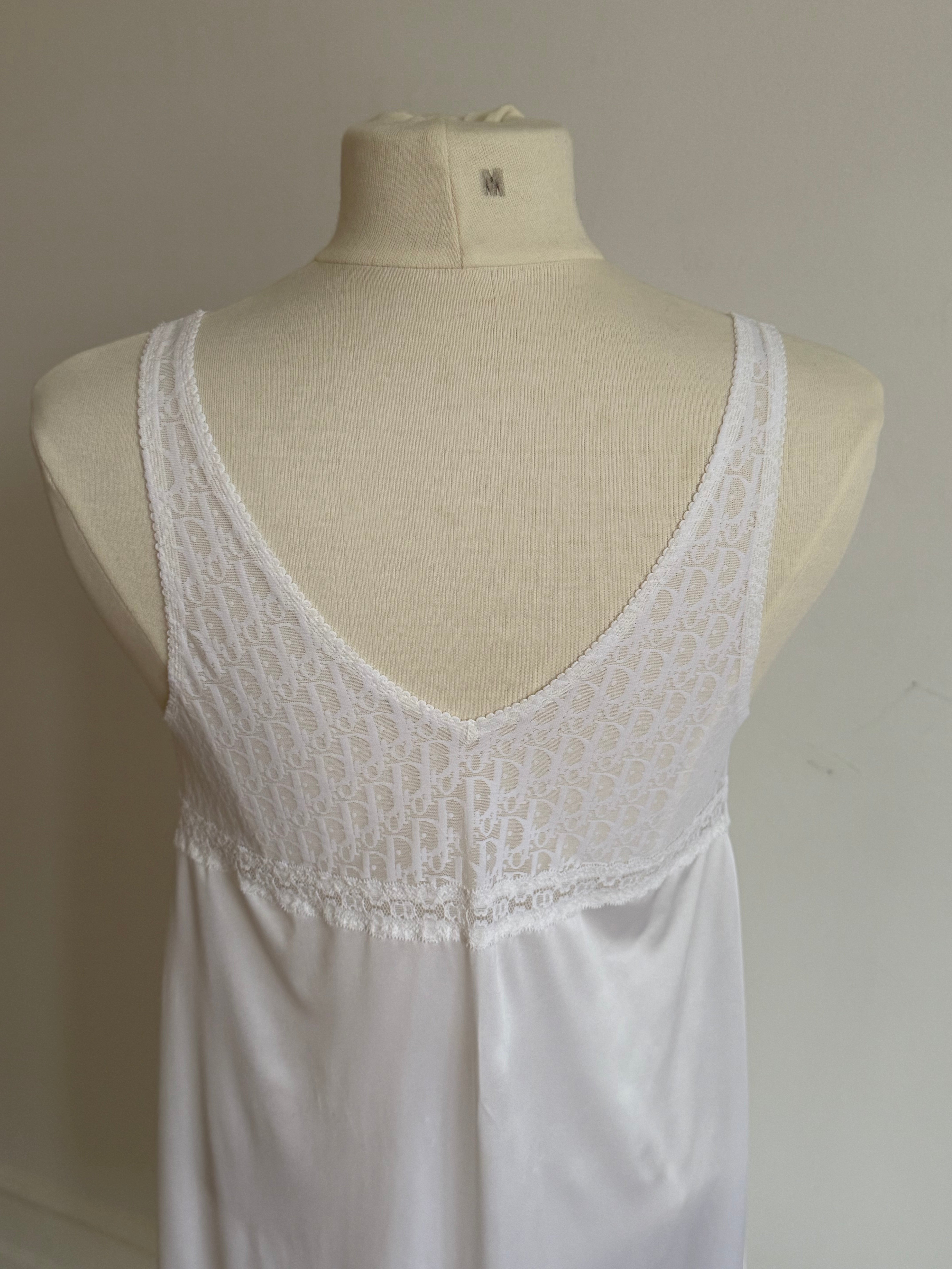 Vintage Christian Dior lingerie dress in white with Dior Trotter monogram lace, a soft V-neck and delicate lace detailing throughout.