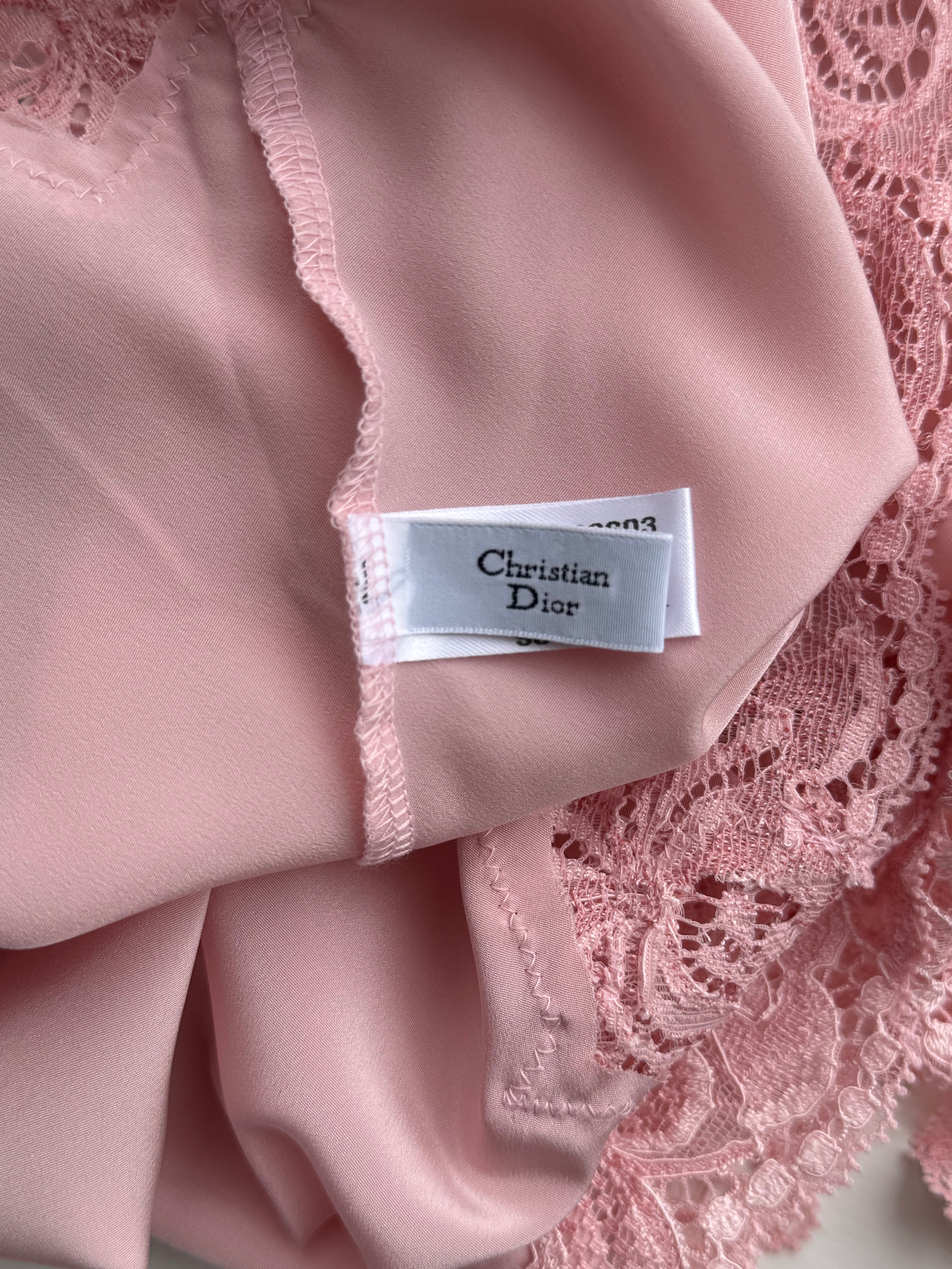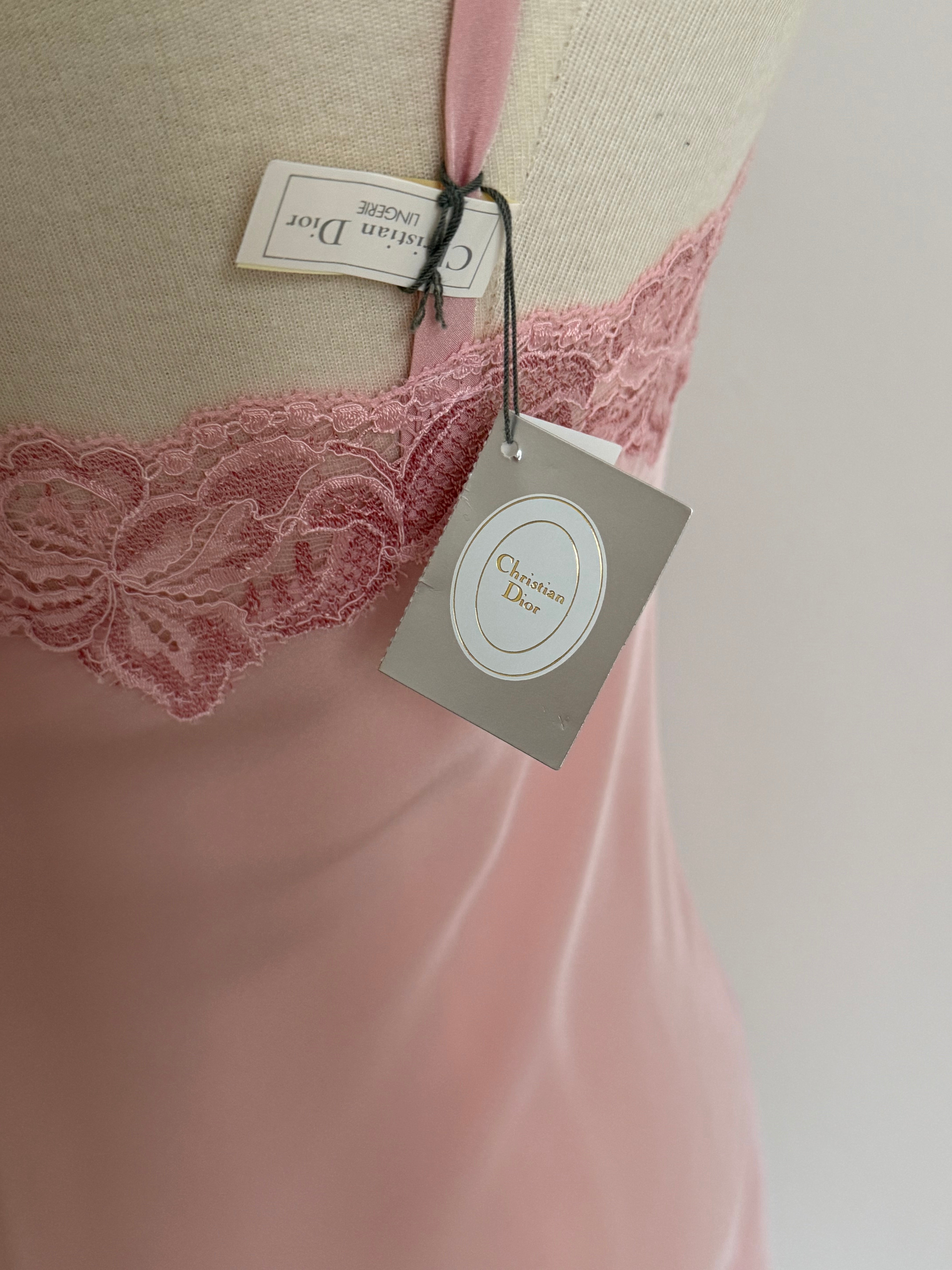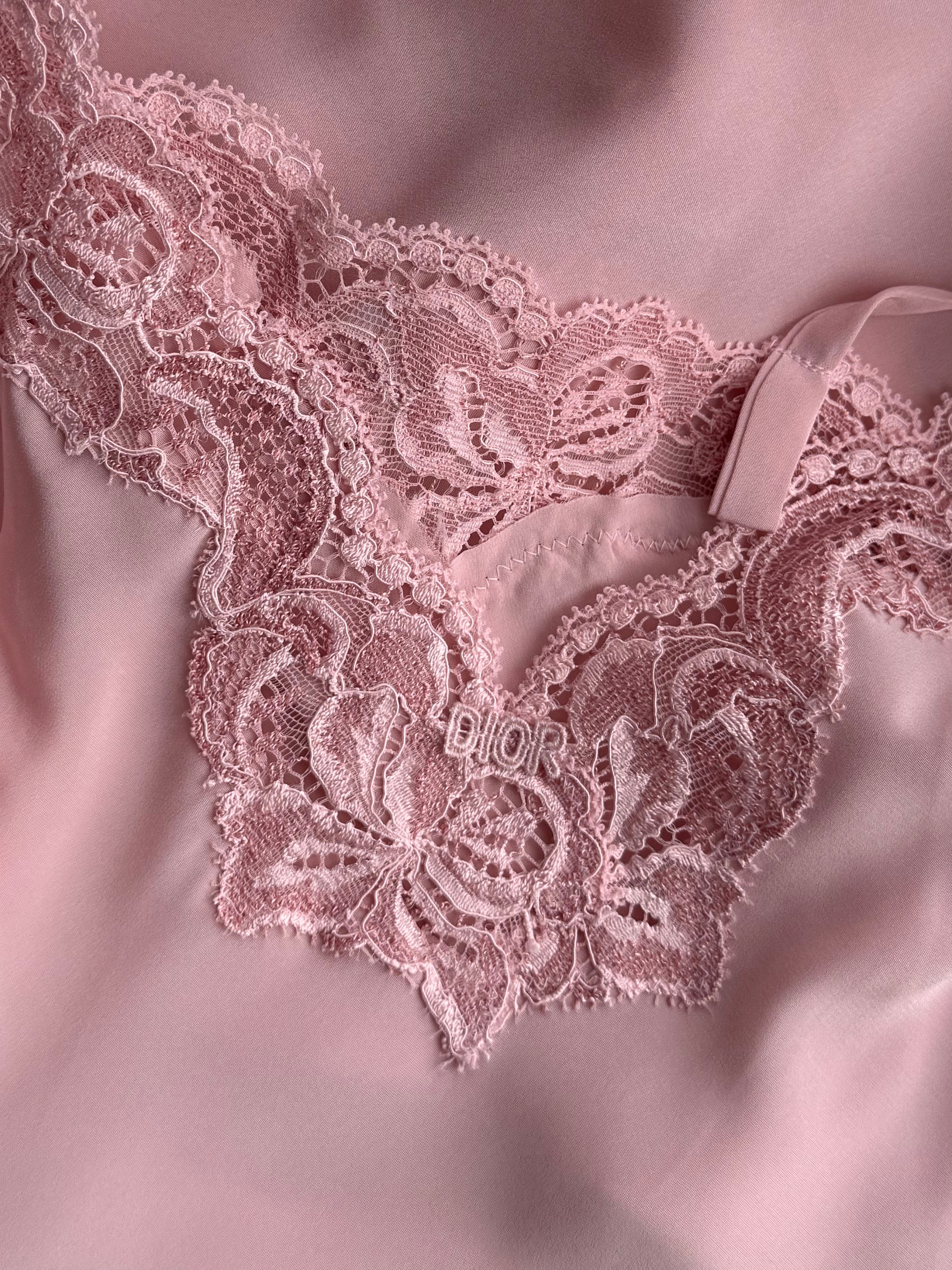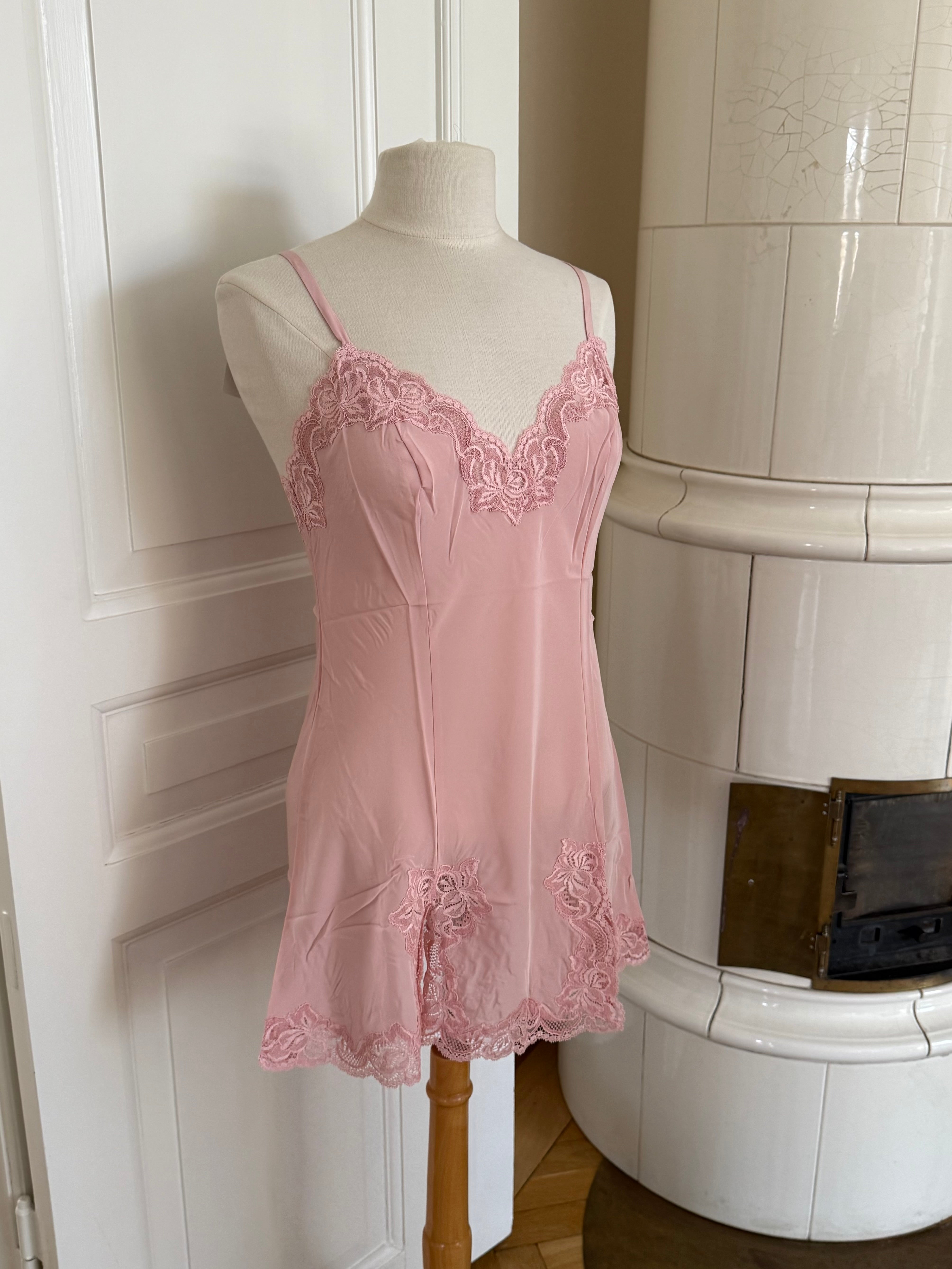 Vintage Christian Dior lingerie dress in light pink with beautiful lace. Features two front slits.