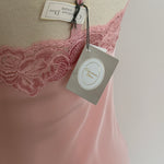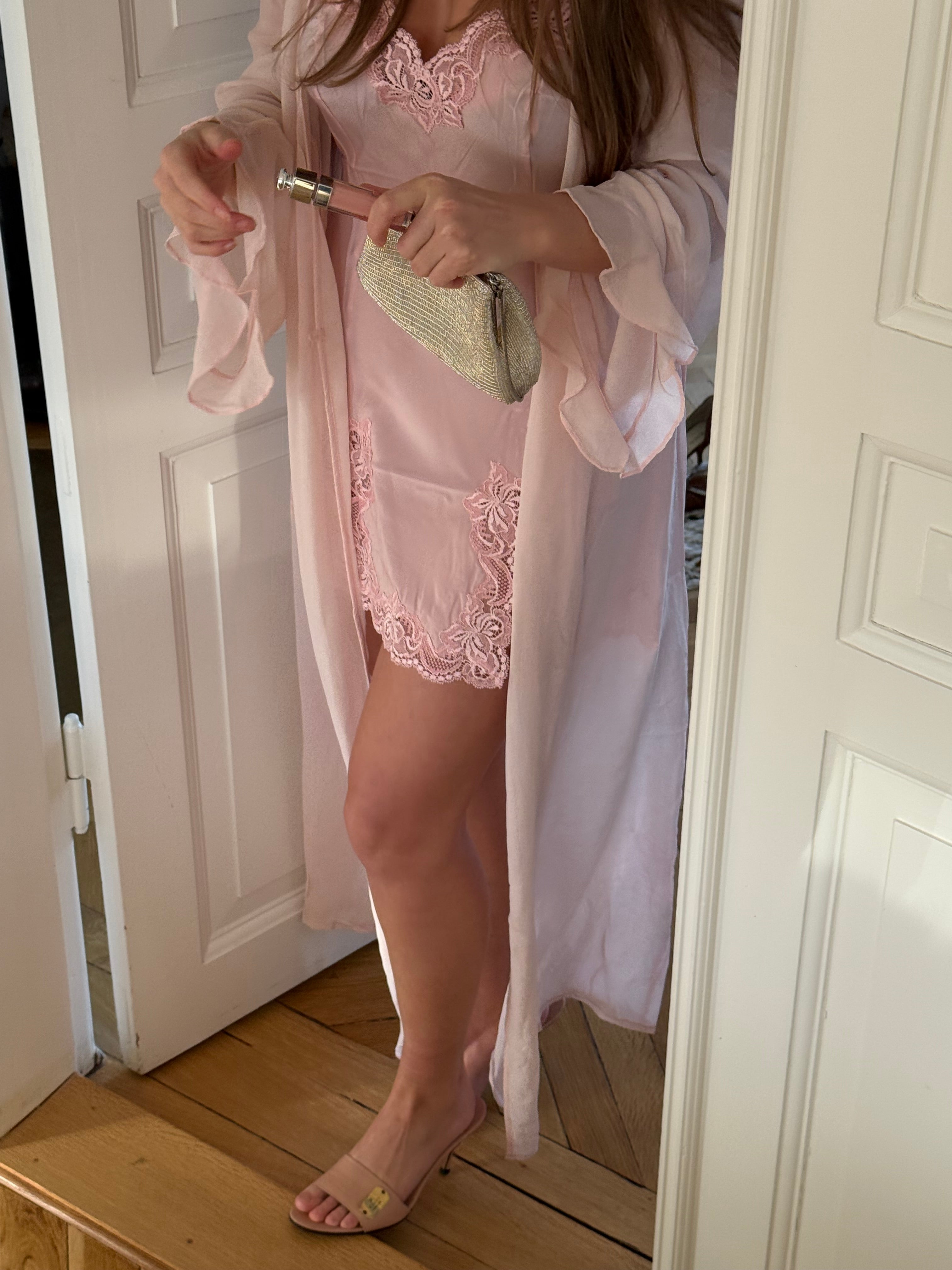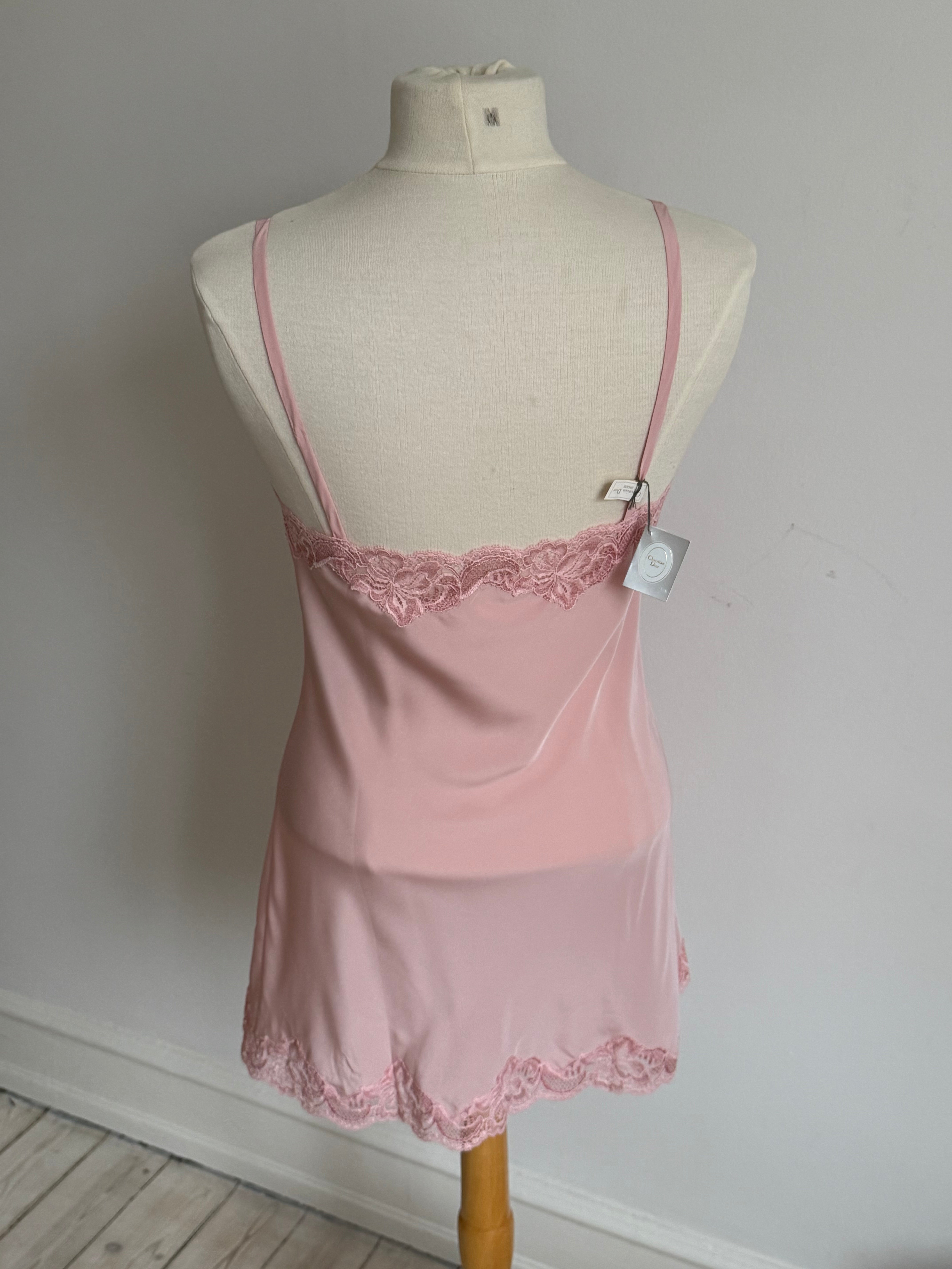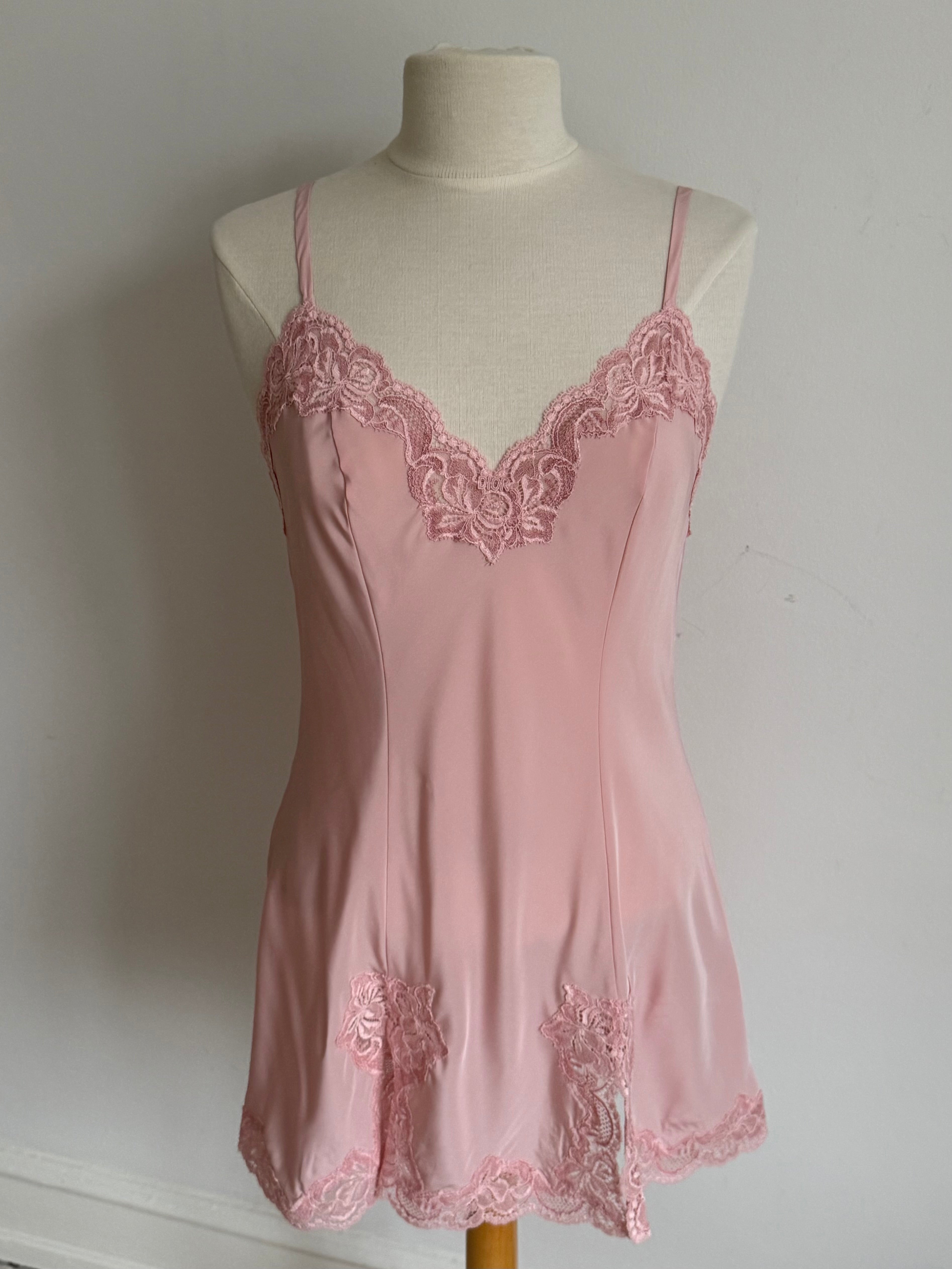 Vintage Christian Dior lingerie dress in light pink with beautiful lace. Features two front slits.