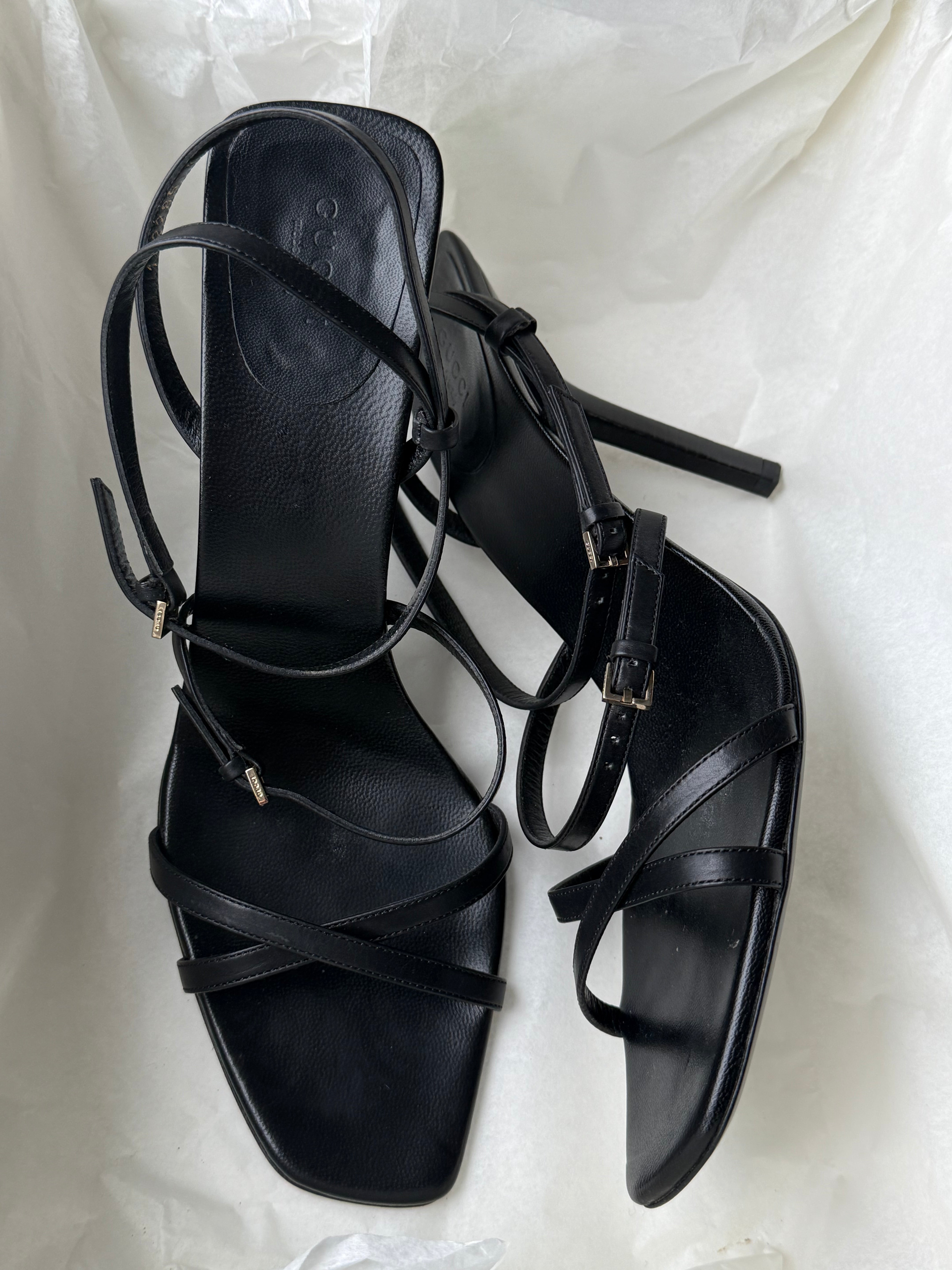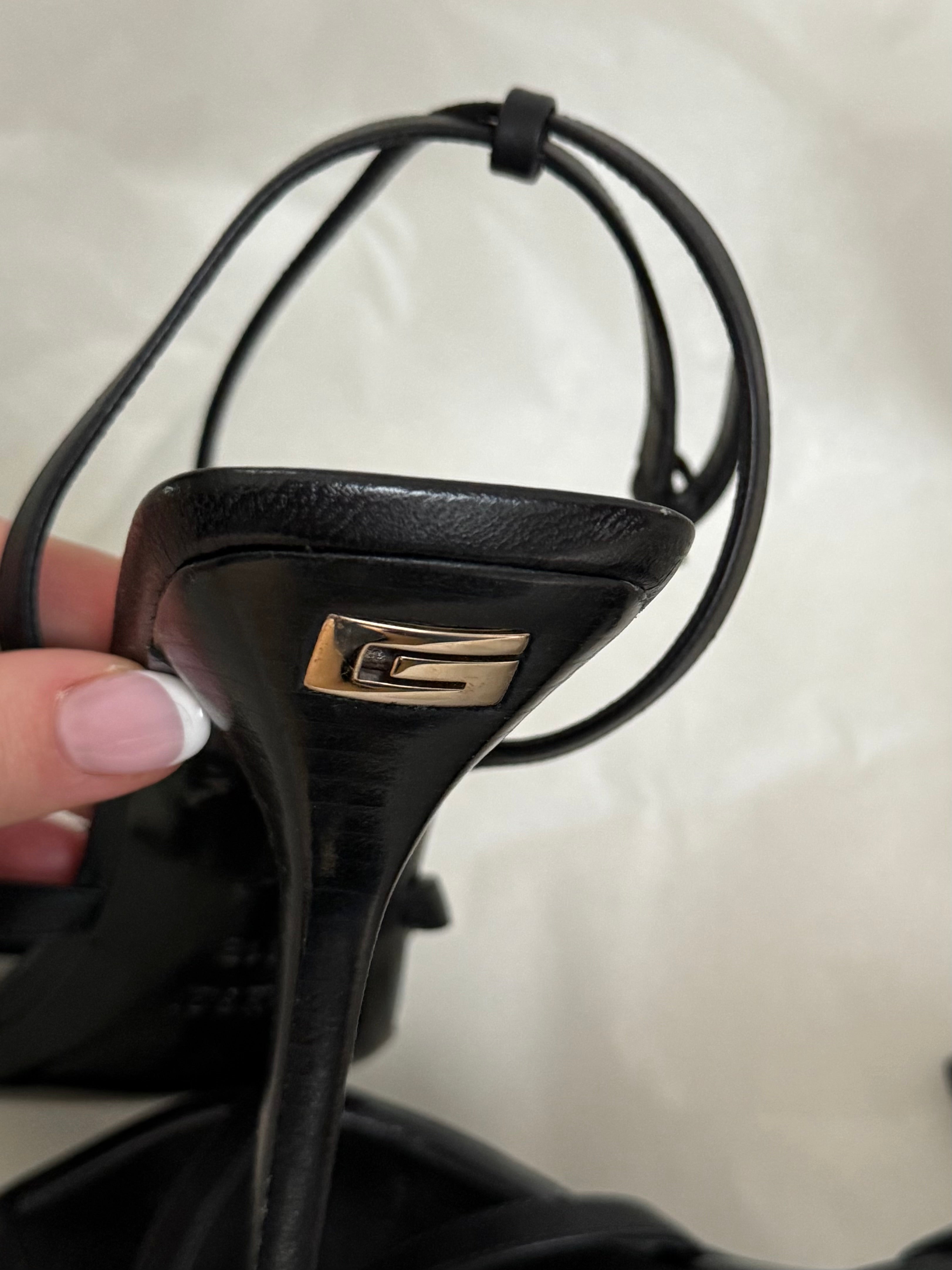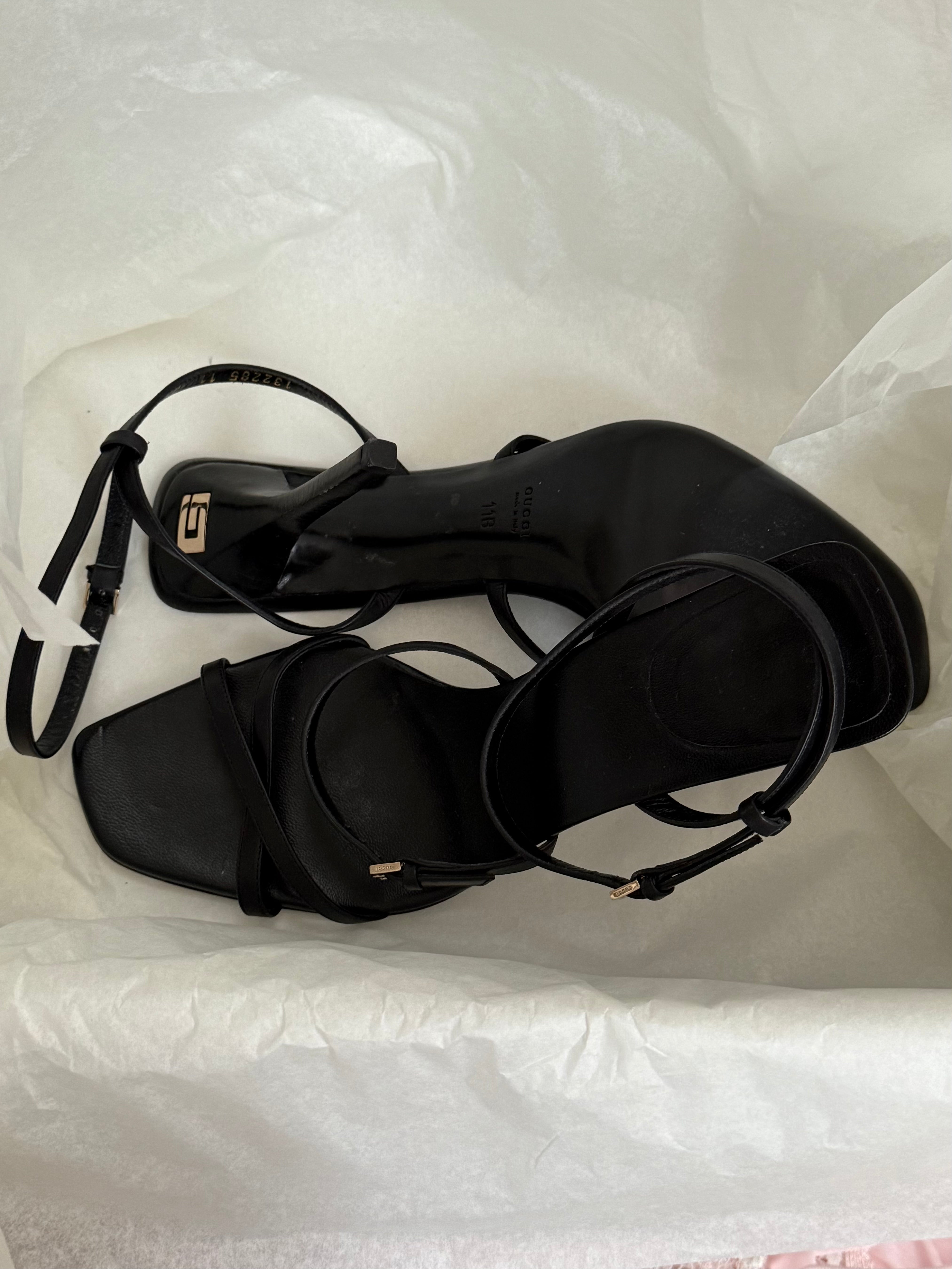 Vintage Gucci strappy sandals in black leather with square toe and ankle strap.