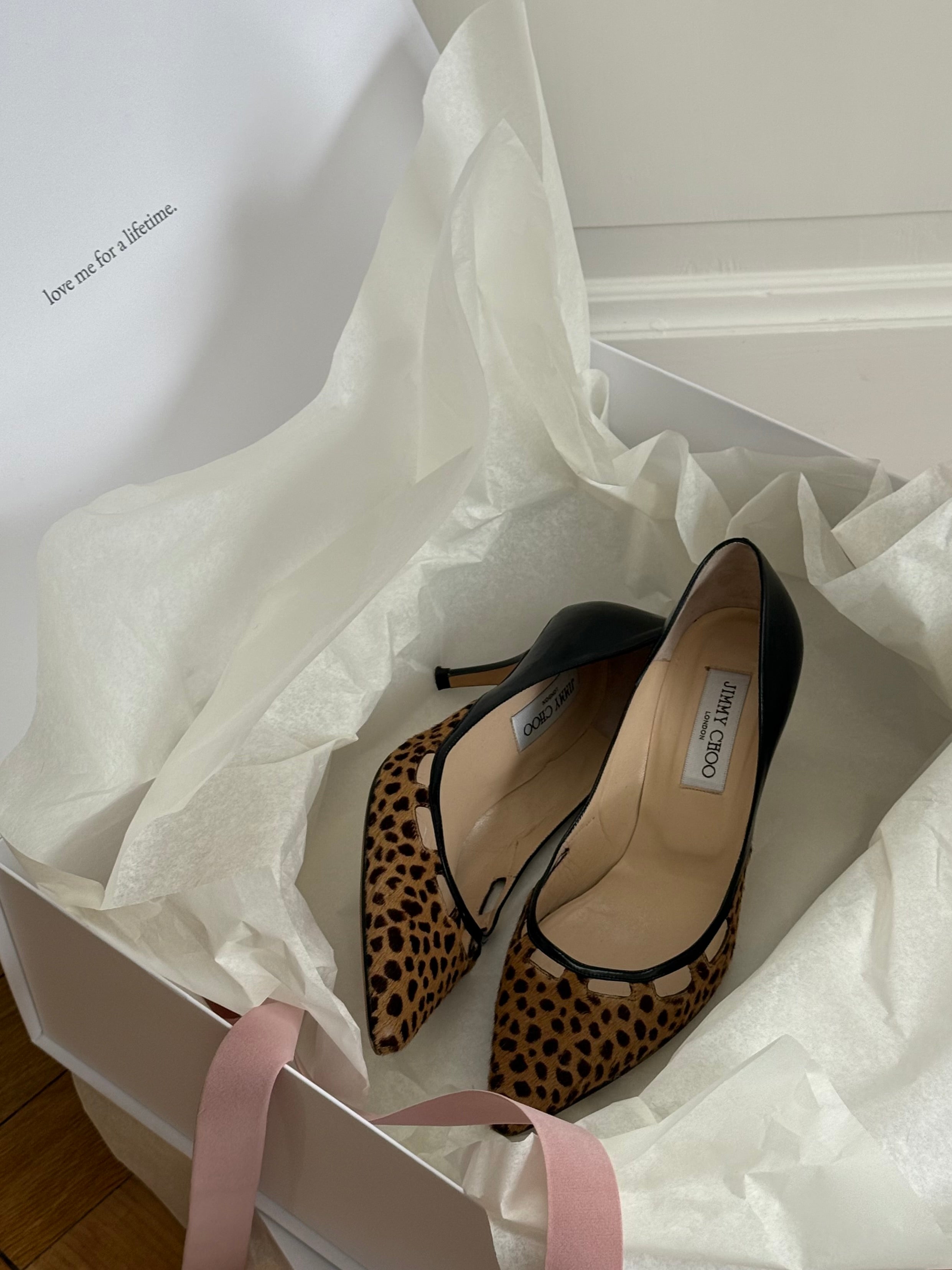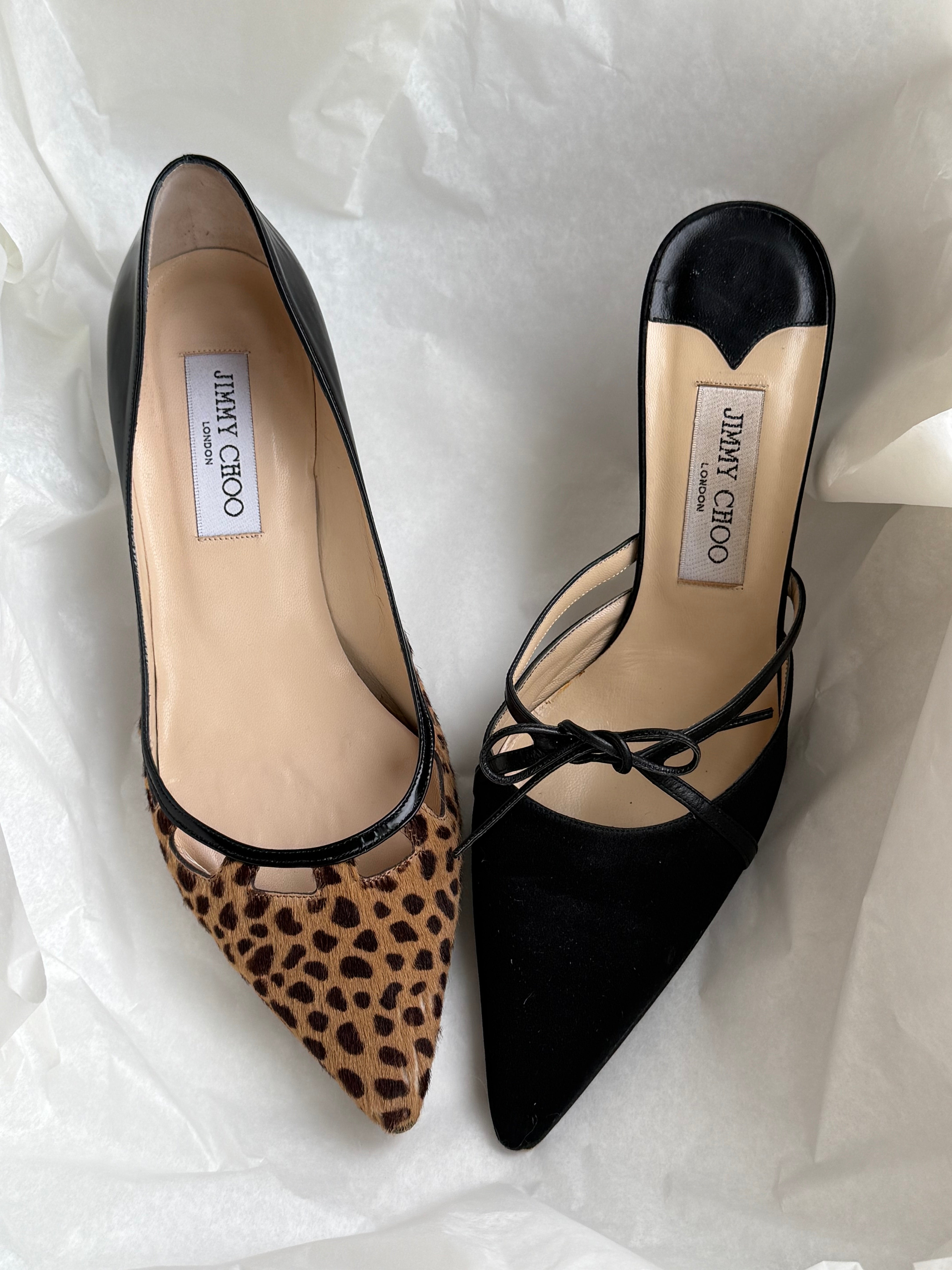 Vintage Jimmy Choo cheetah print pony hair pumps with a pointed toe.