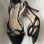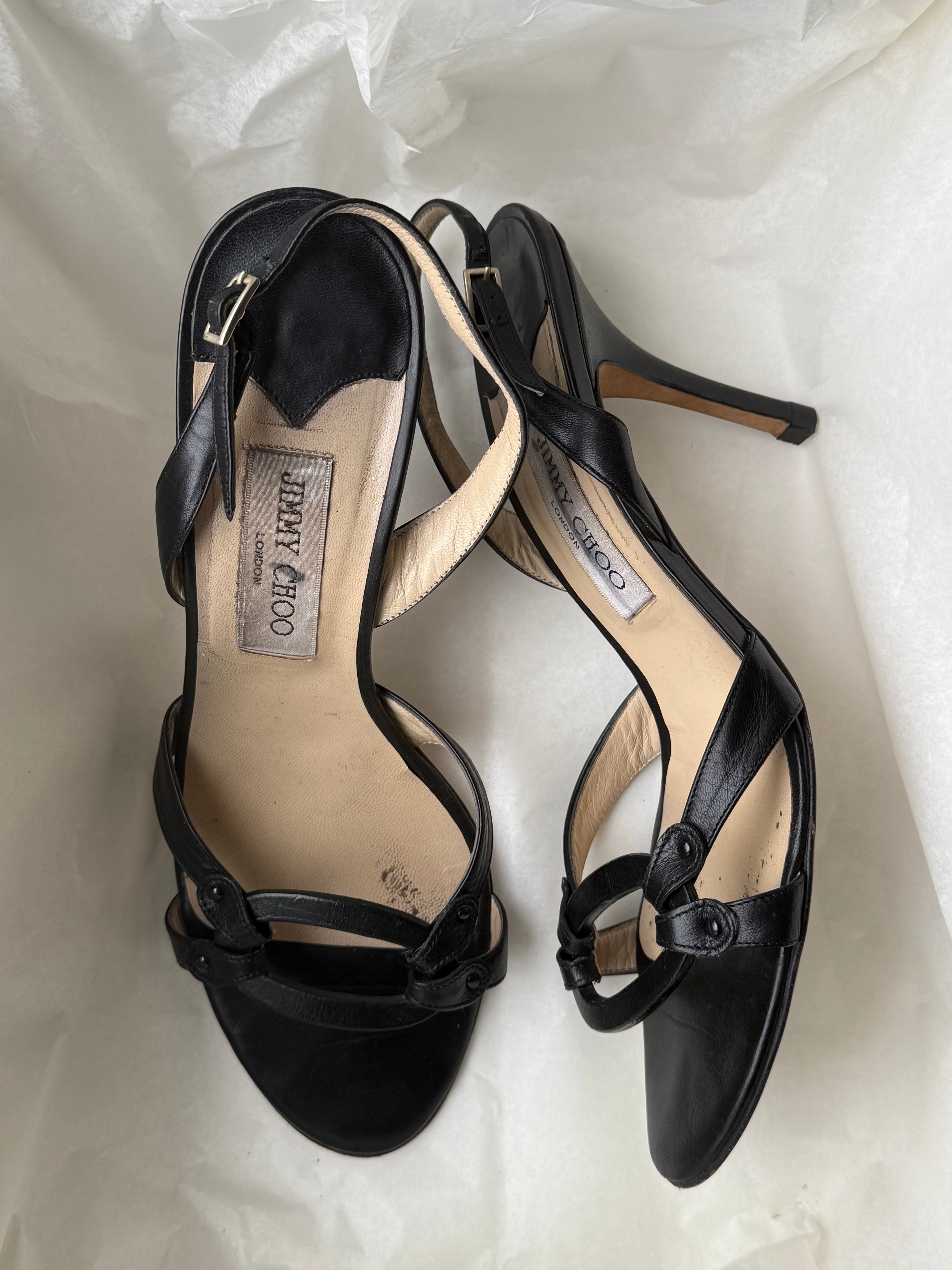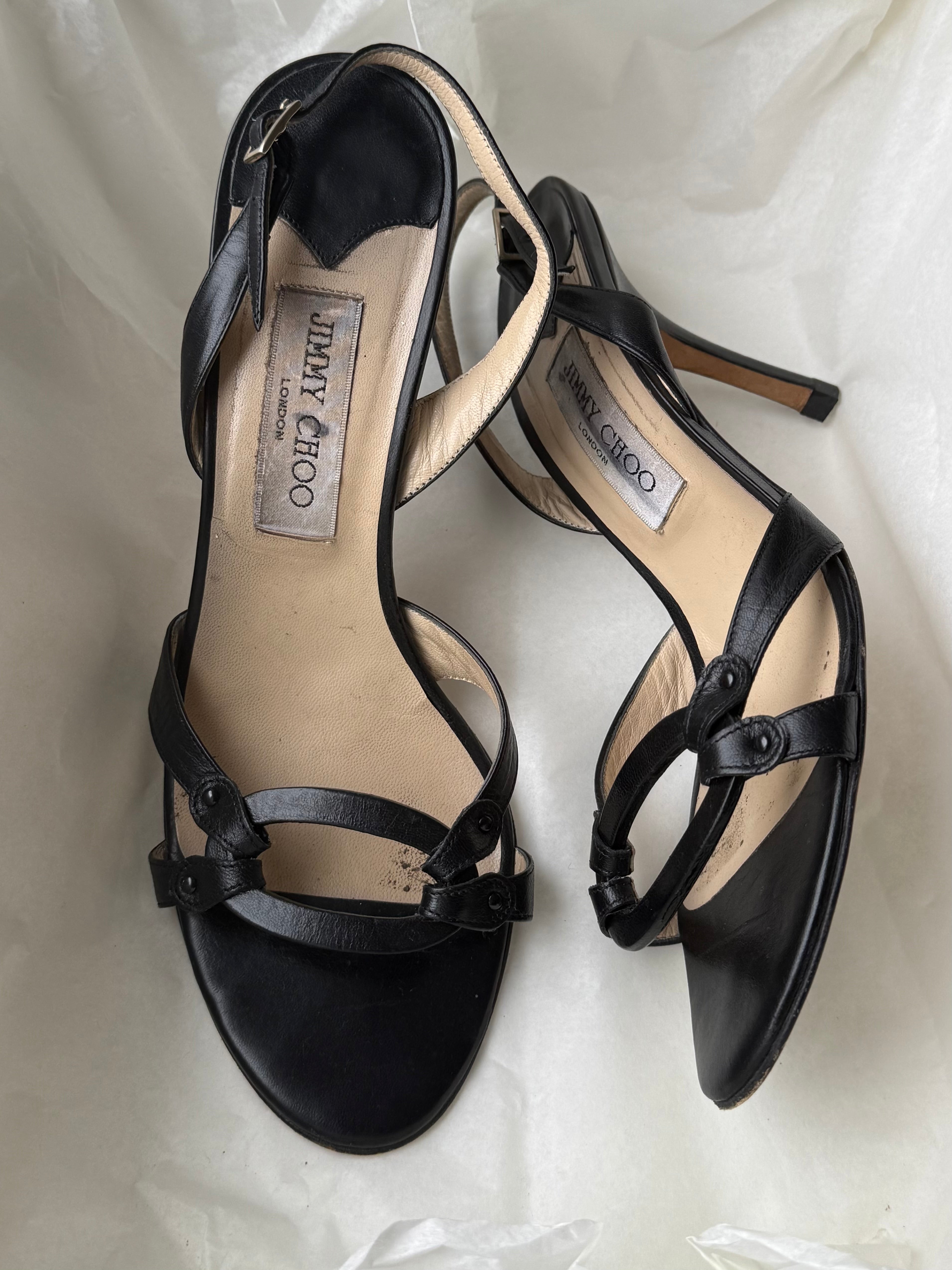 Vintage Jimmy Choo black leather ankle strap sandals with open toe.