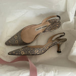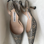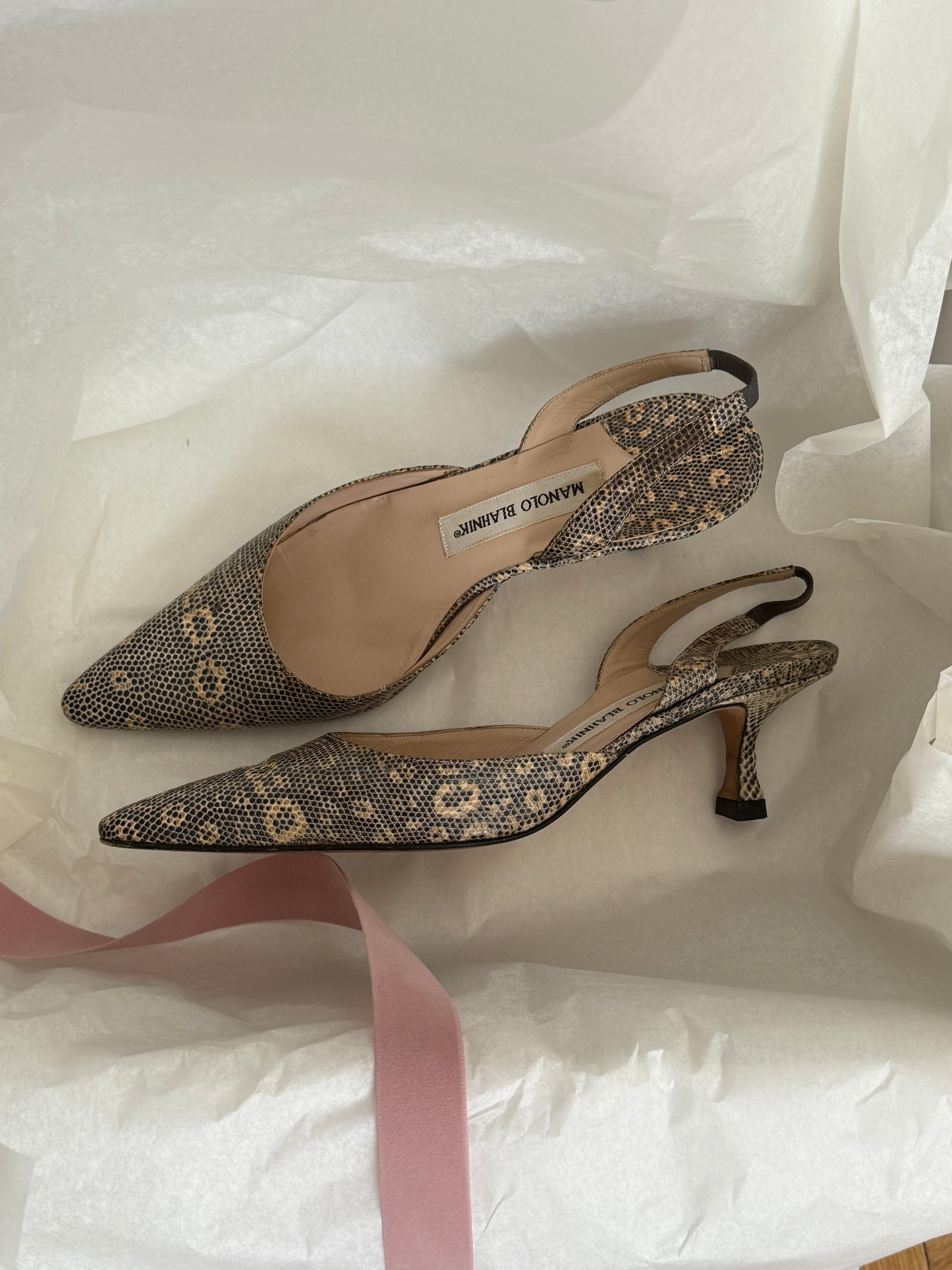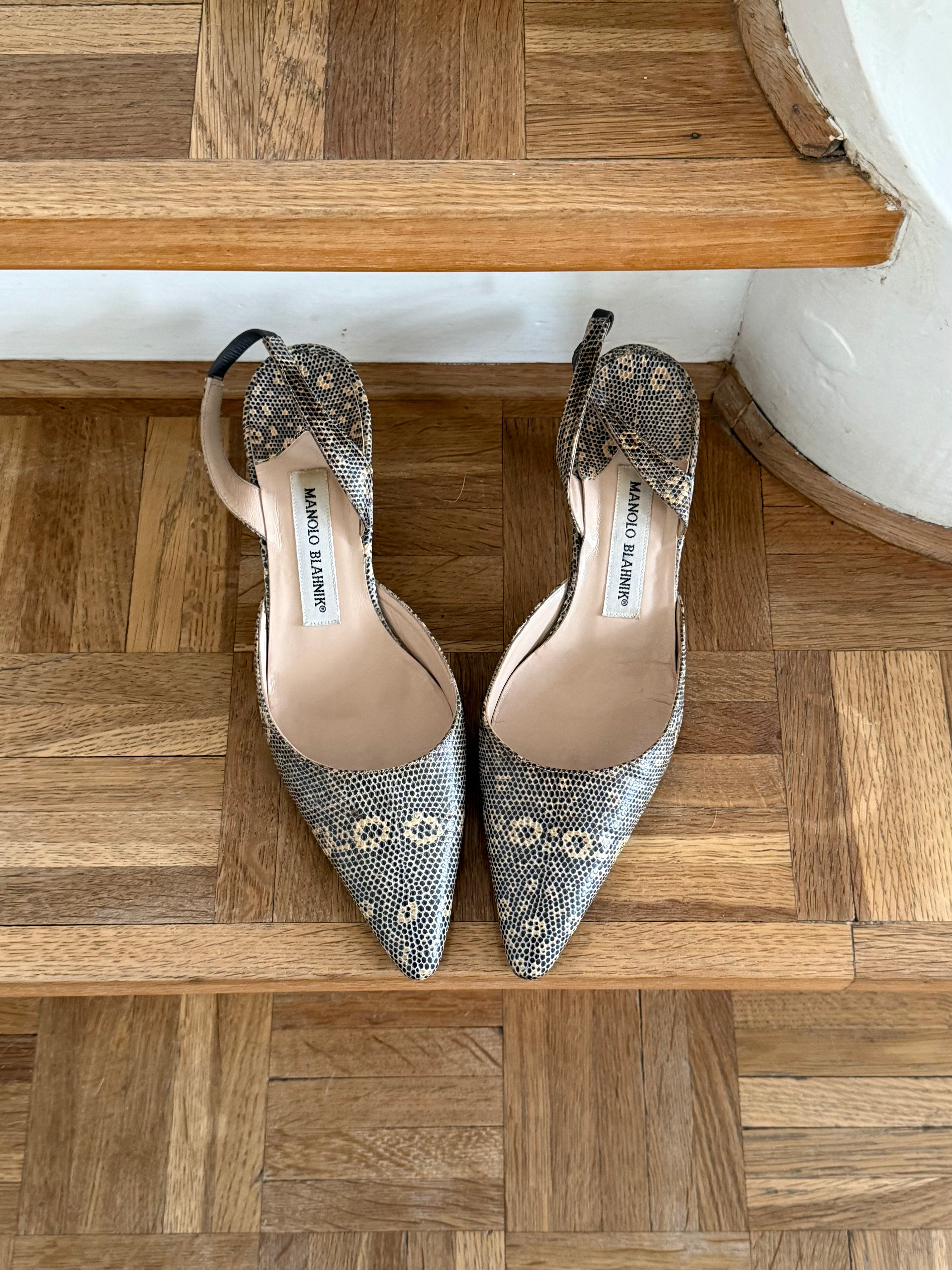 Vintage Manolo Blahnik Carolyne slingbacks in lizard embossed leather with pointed toe.