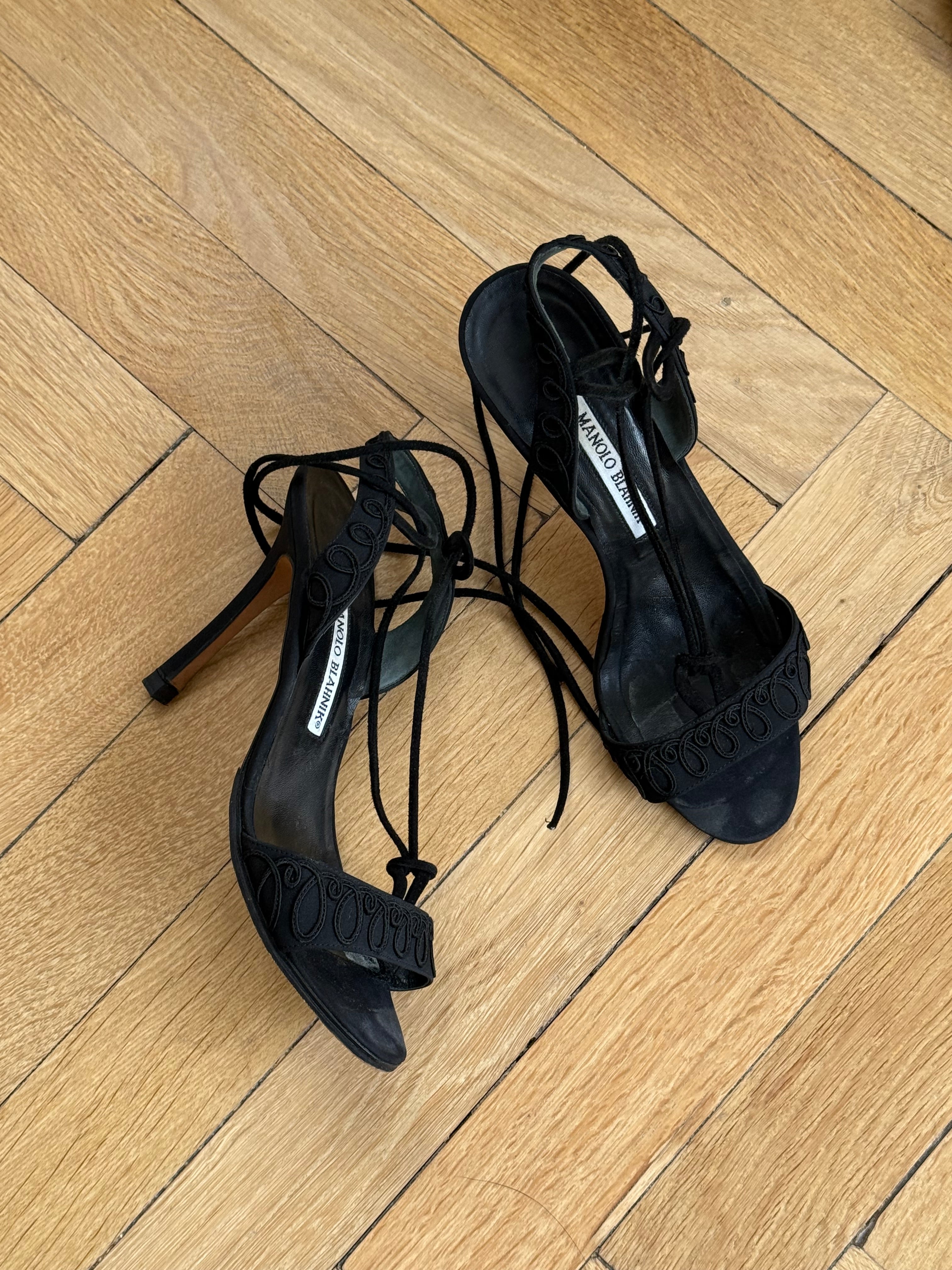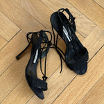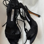 Vintage Manolo Blahnik lace-up sandals in black fabric and leather with beautiful embroidered detailing.