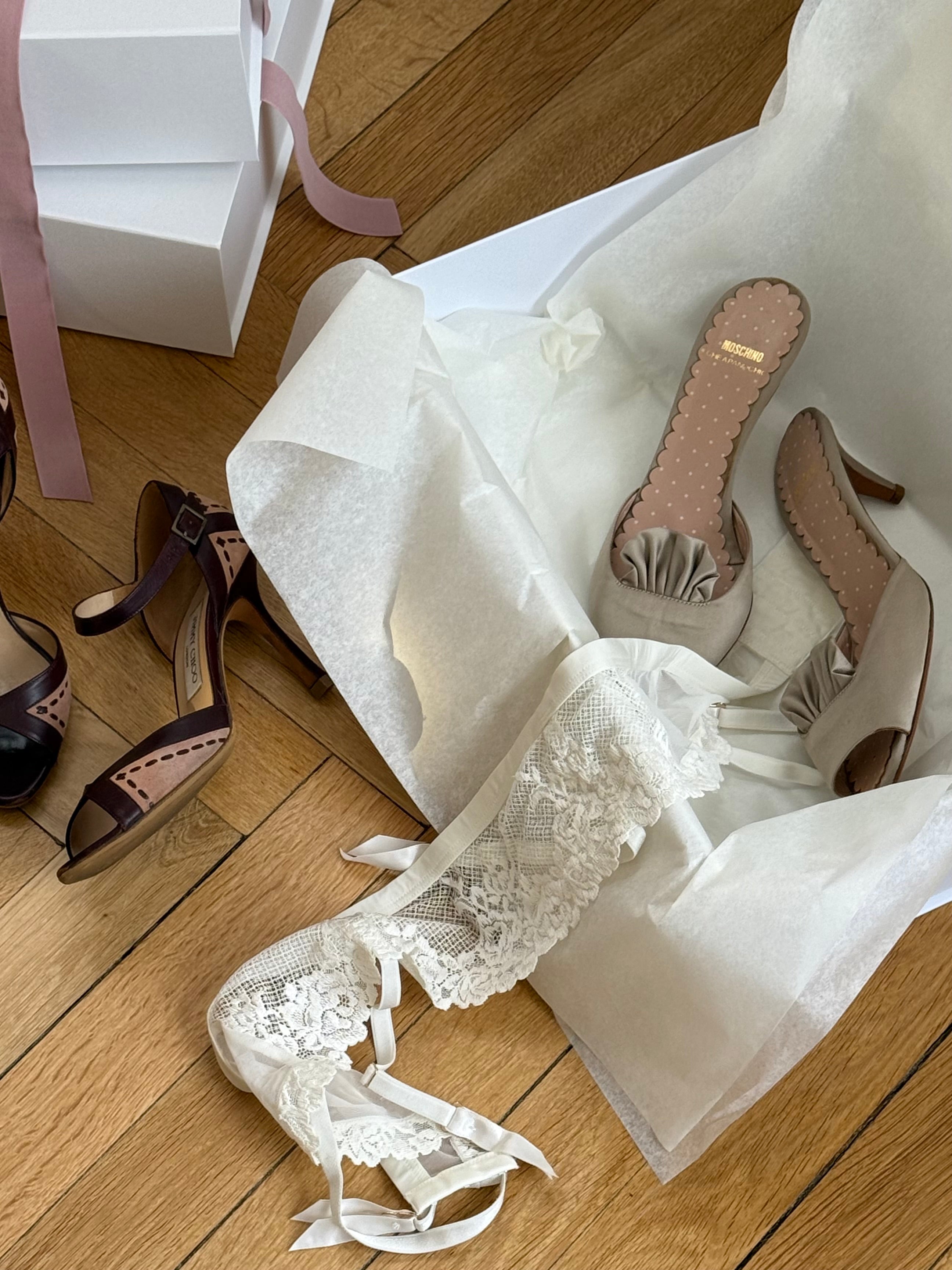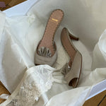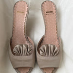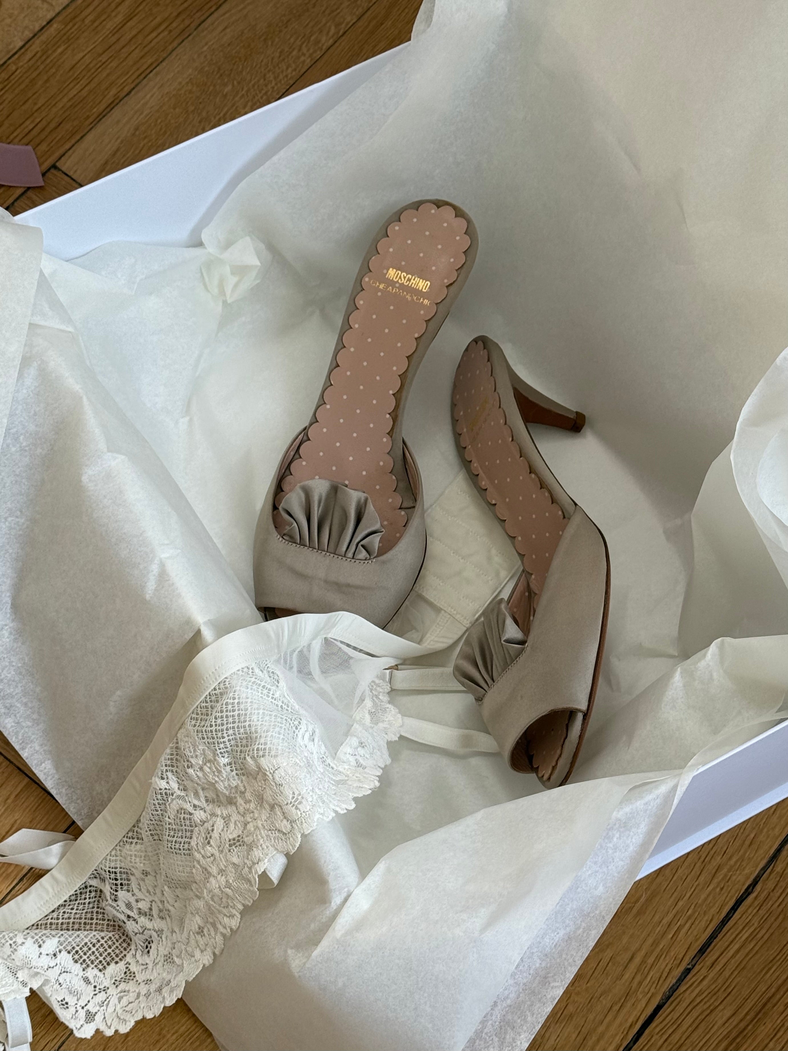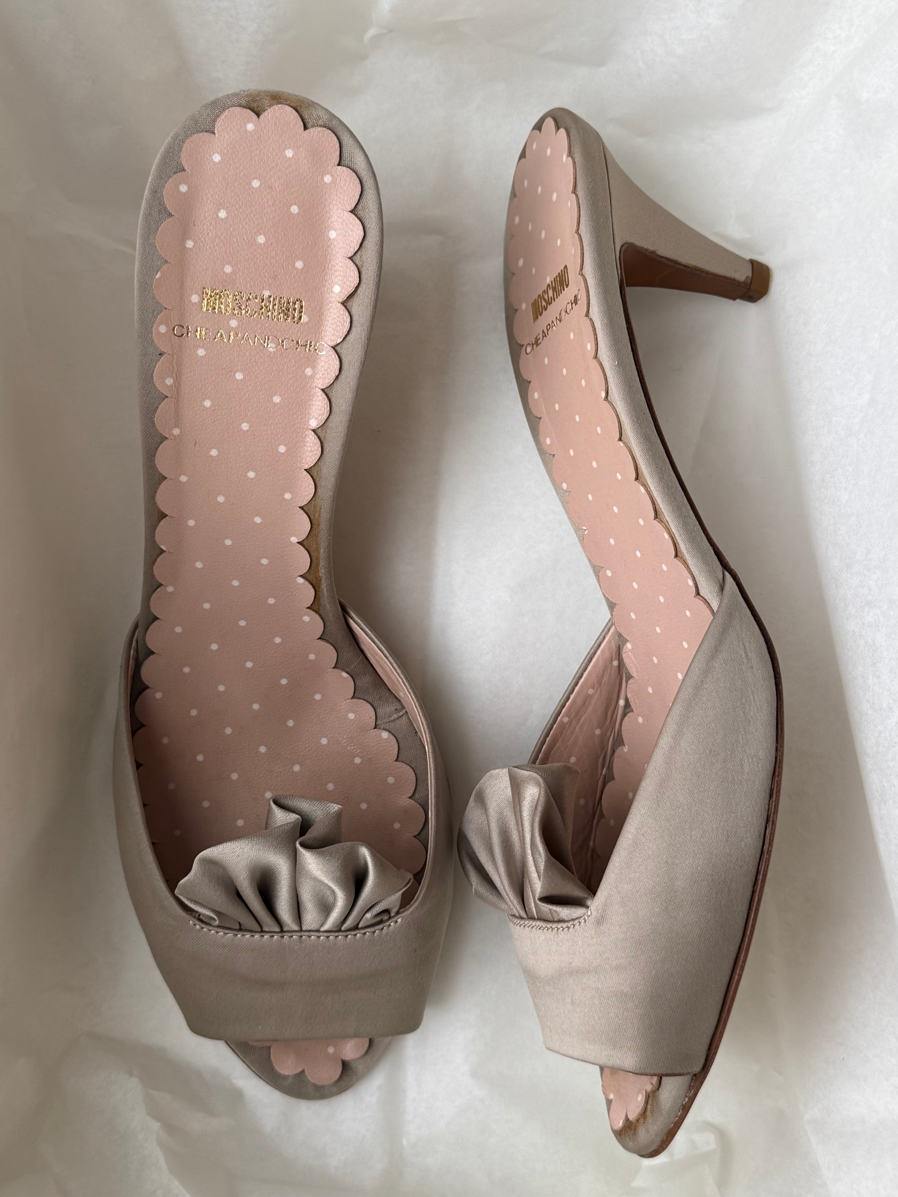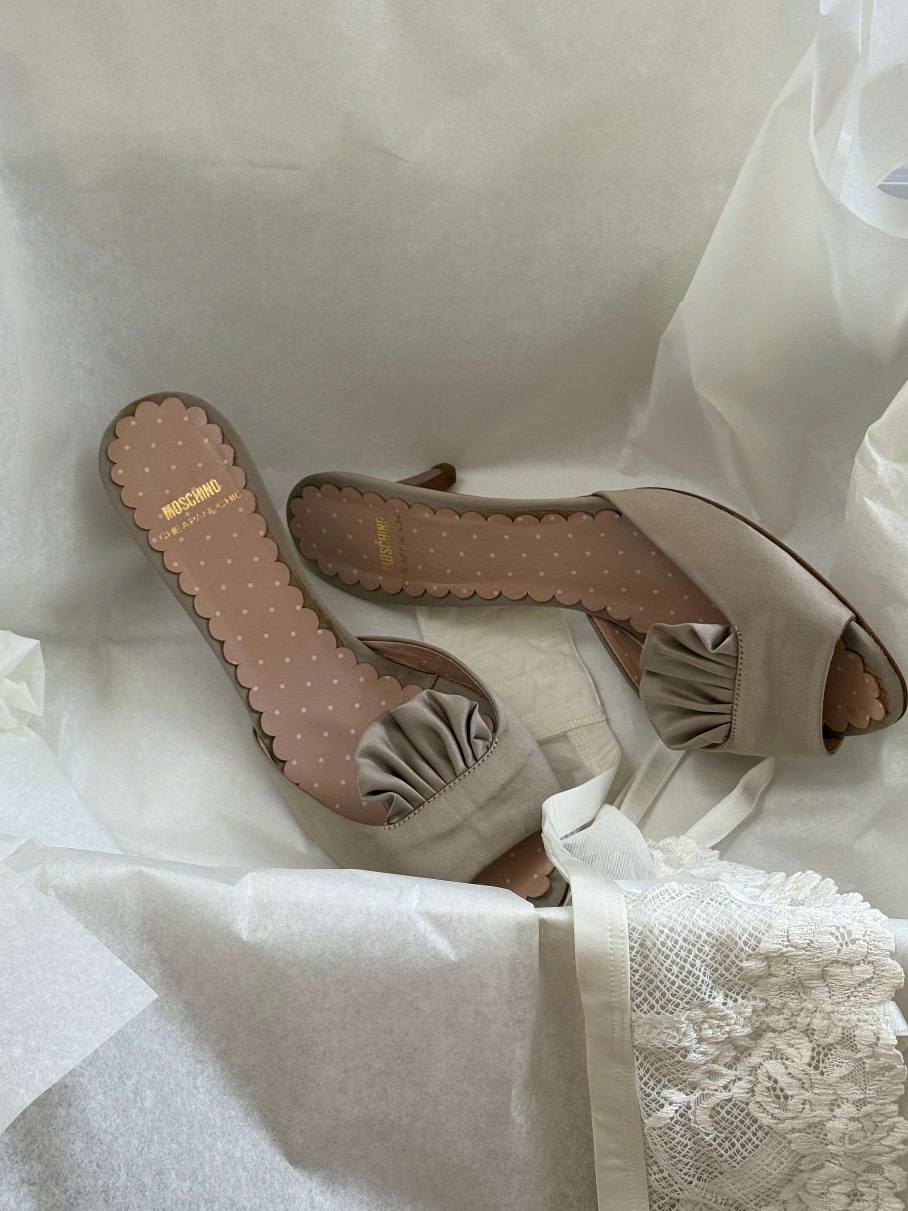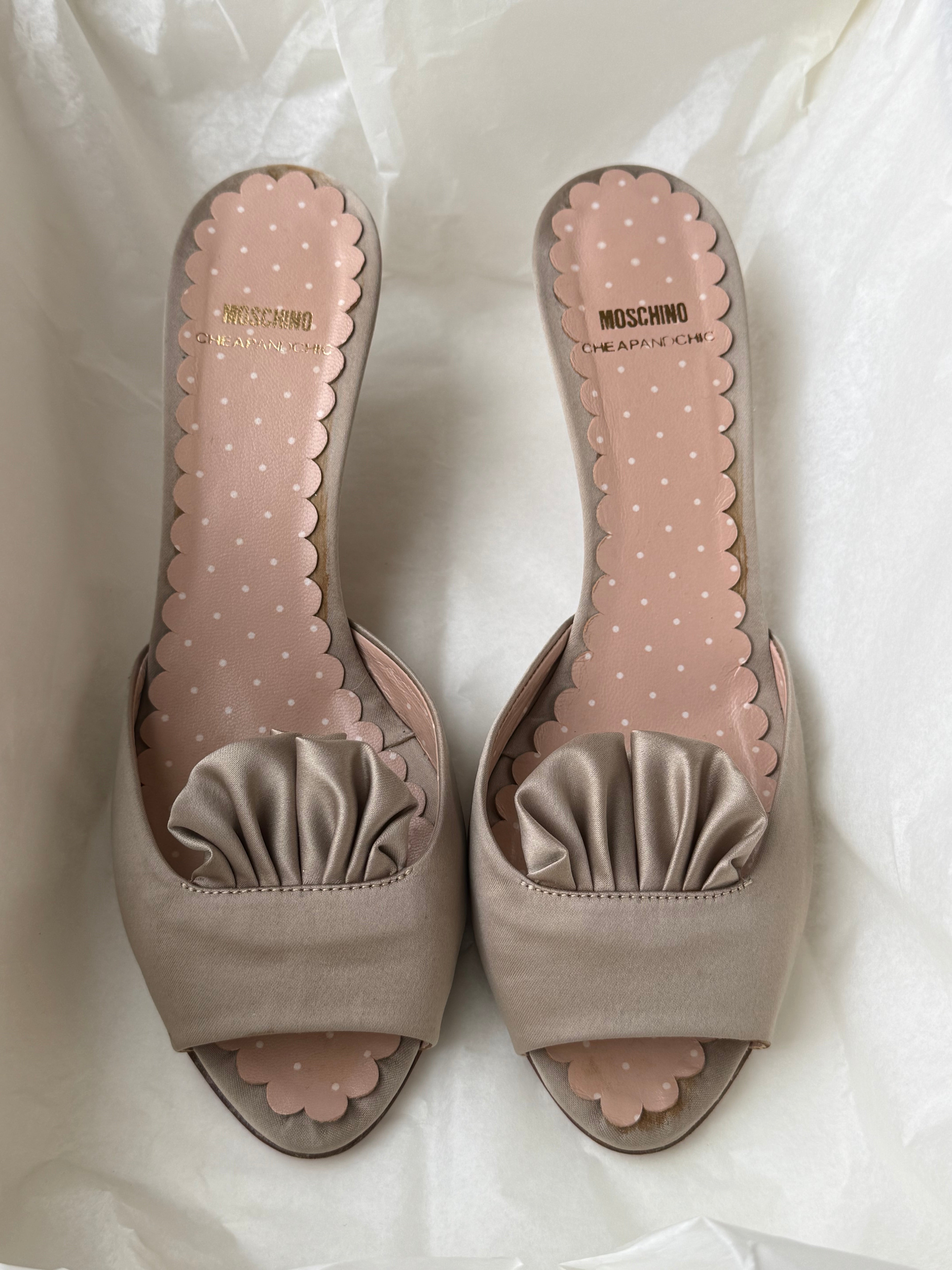 Vintage Moschino satin sandals with polka-dot insole and ruched front detail
