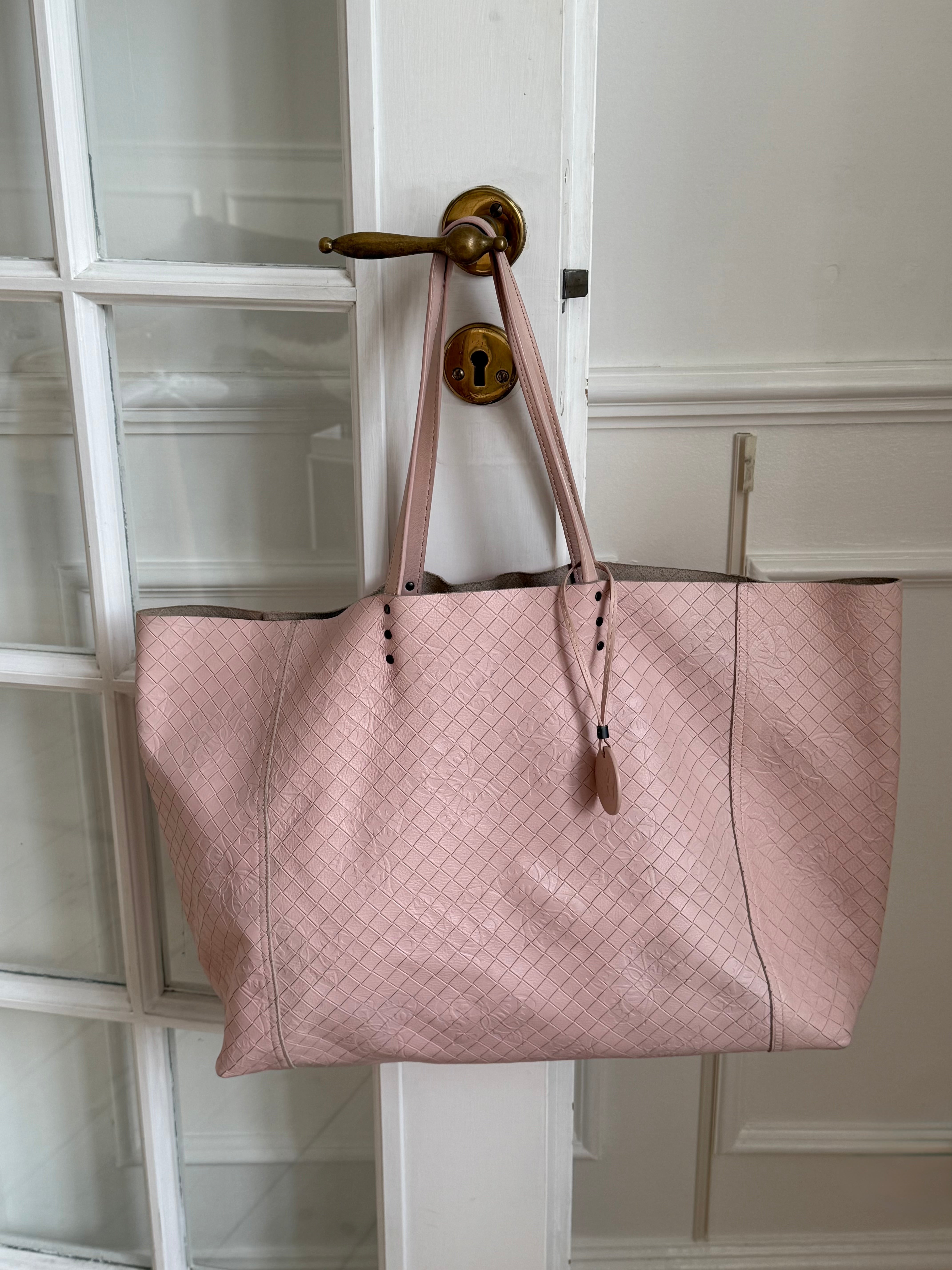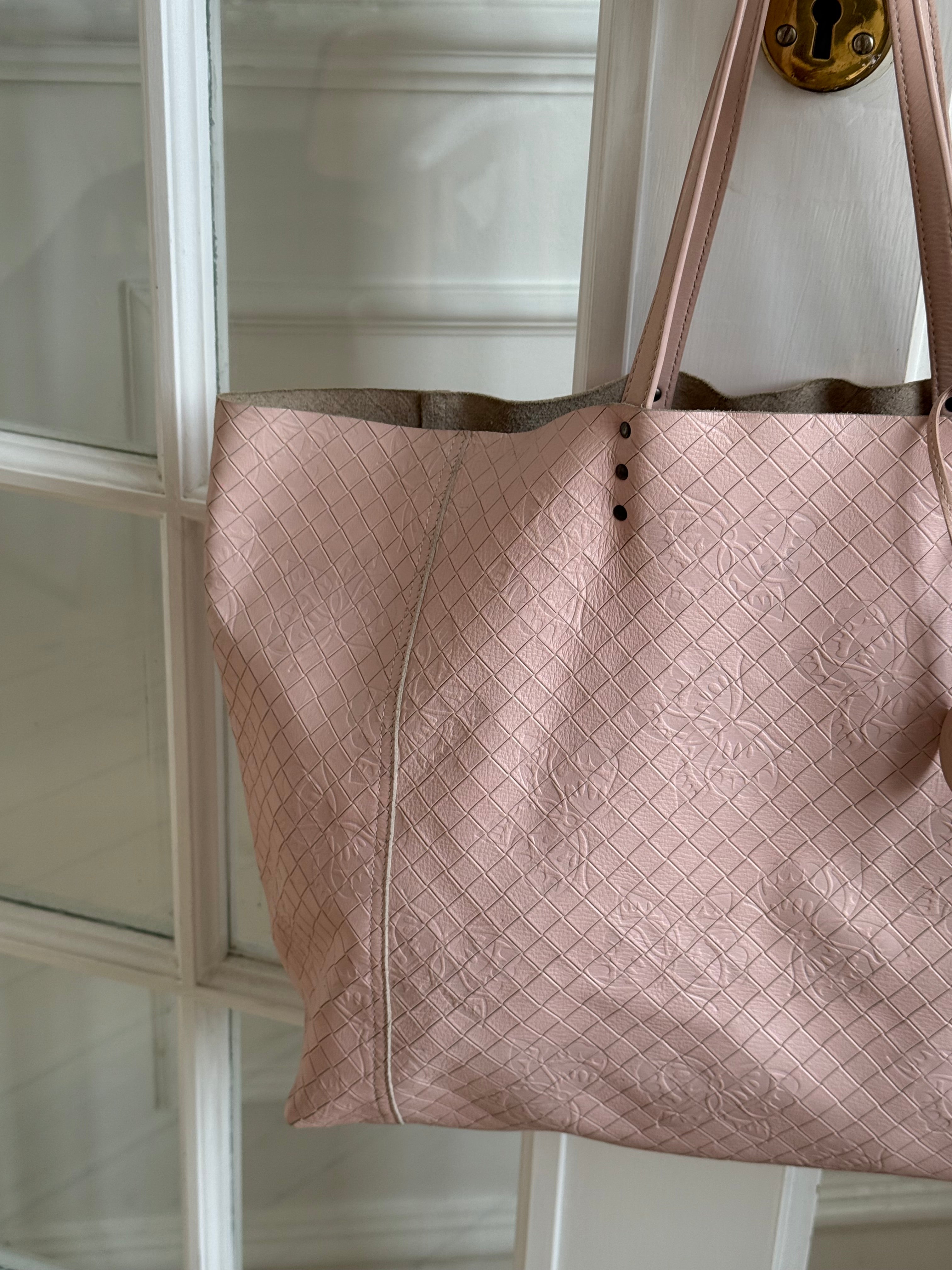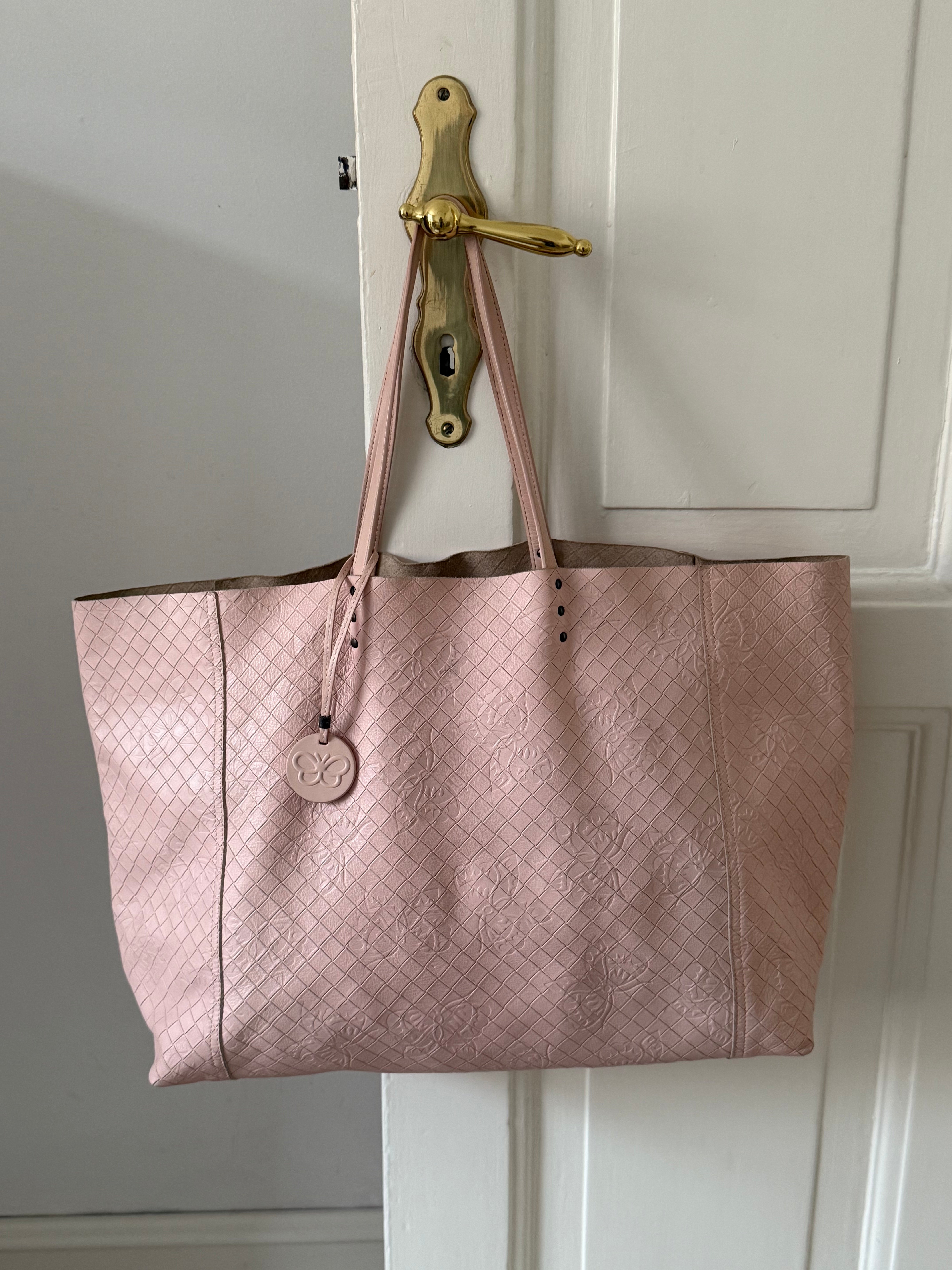 Beautiful vintage Bottega Veneta butterfly tote bag in soft leather with a butterfly charm in a stunning light pink color.