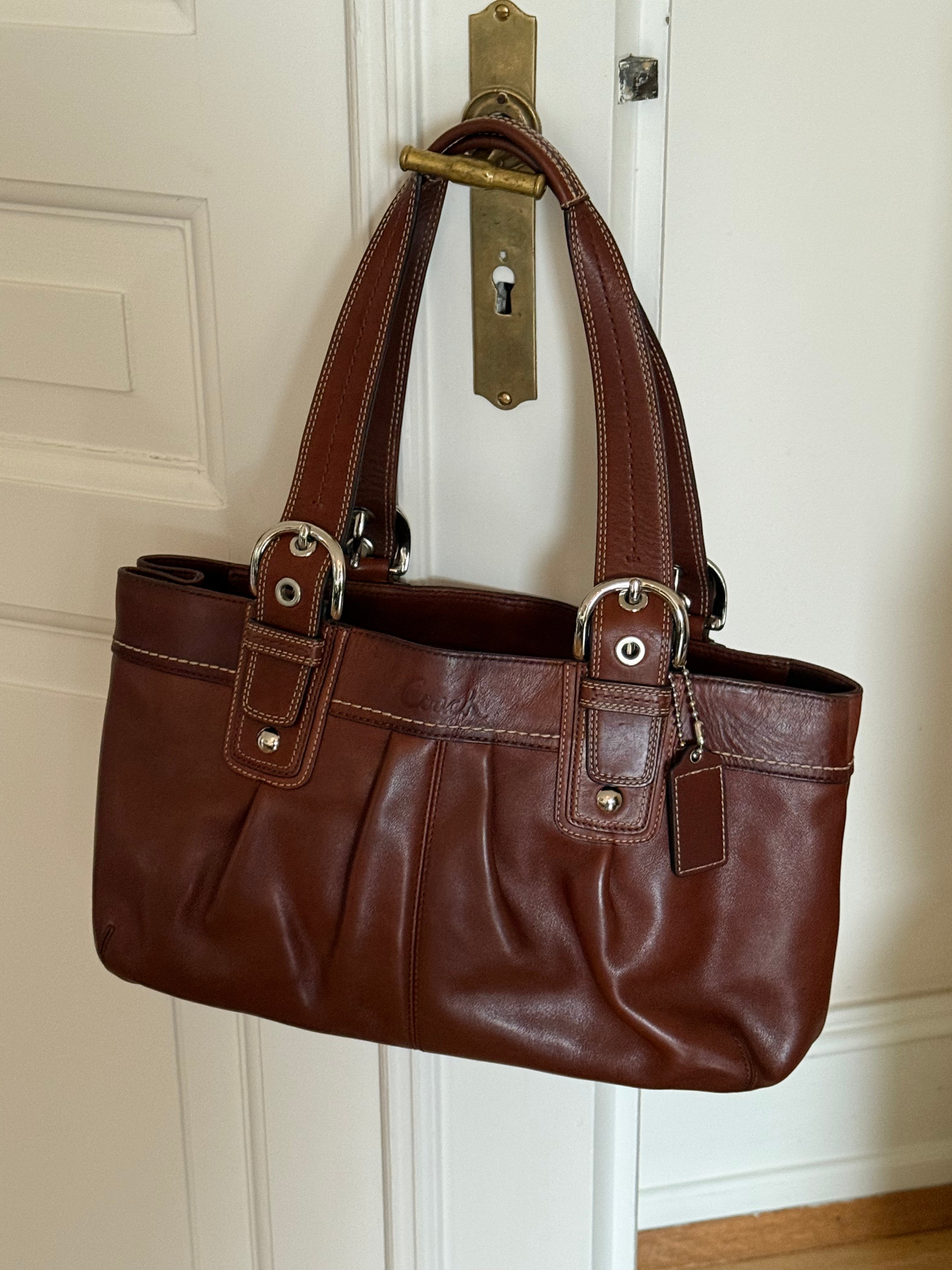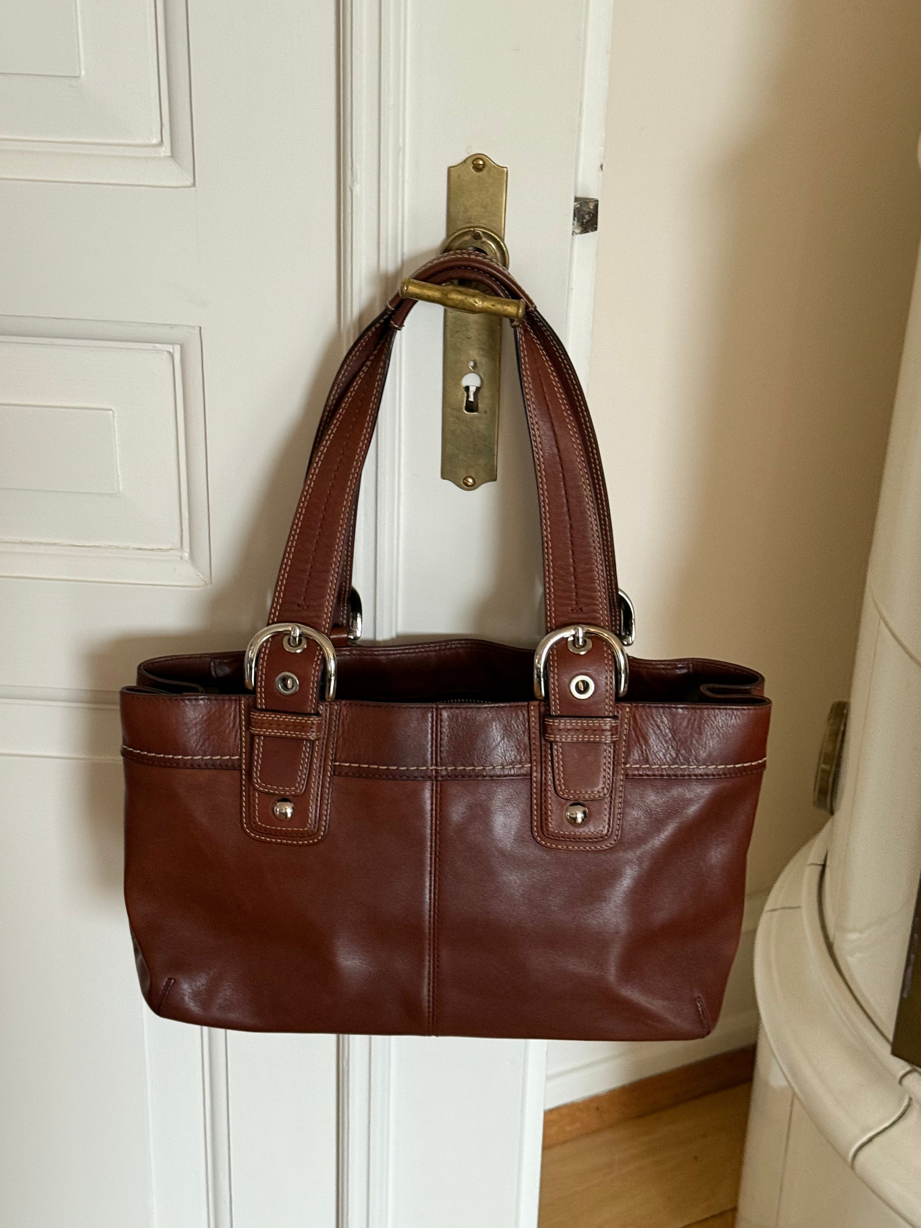 Vintage Coach tote bag in brown leather with silver-tone hardware and a spacious interior.