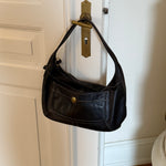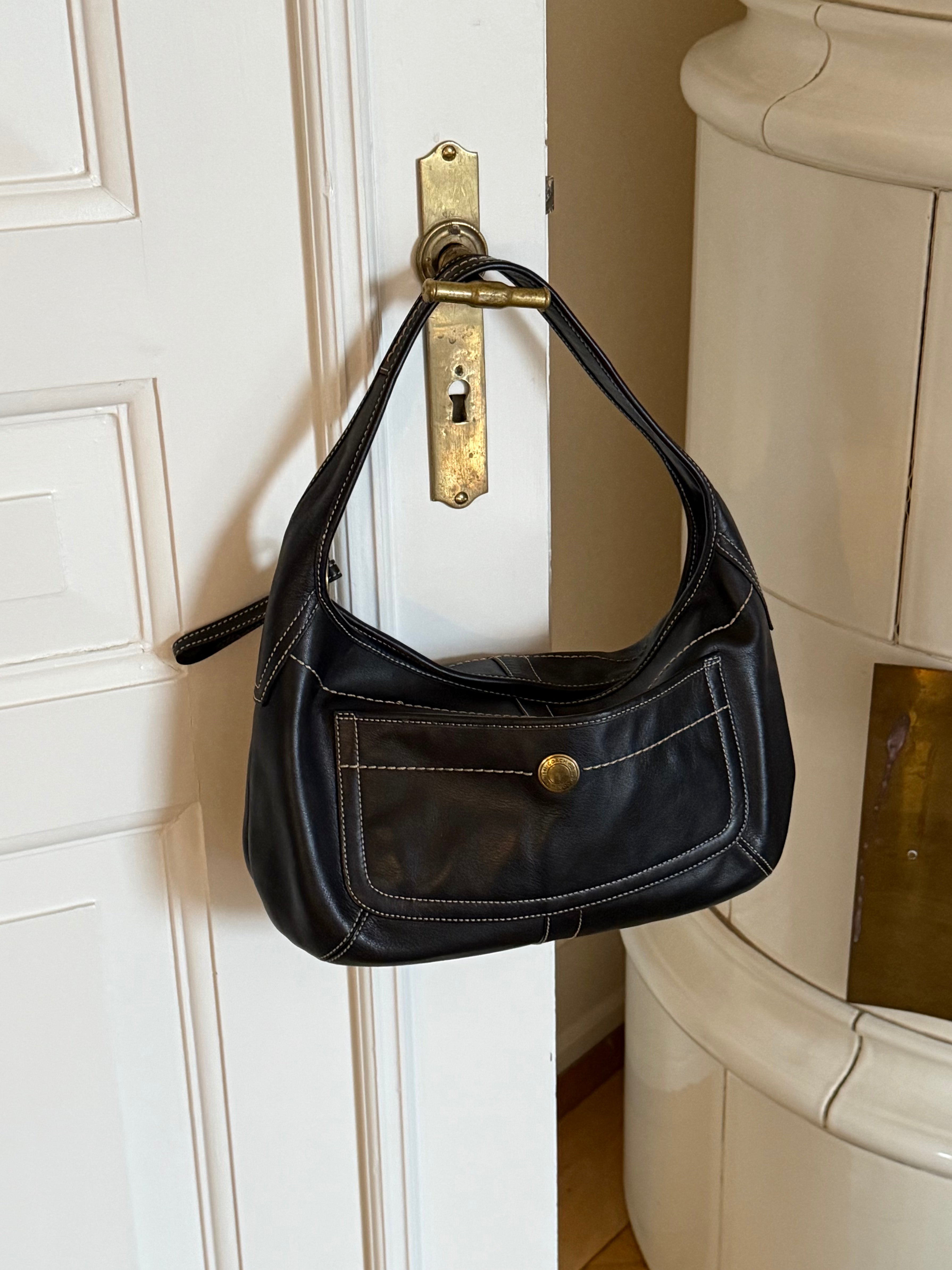 Vintage Coach shoulder bag in black leather with white stitching and gold-colored hardware.