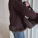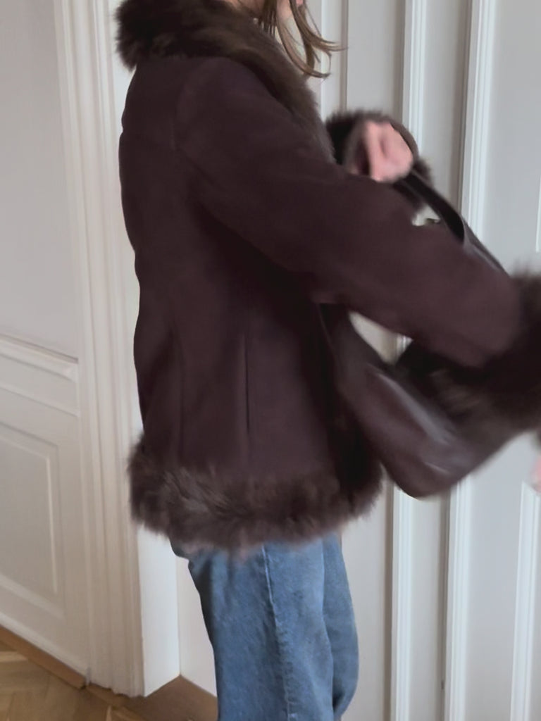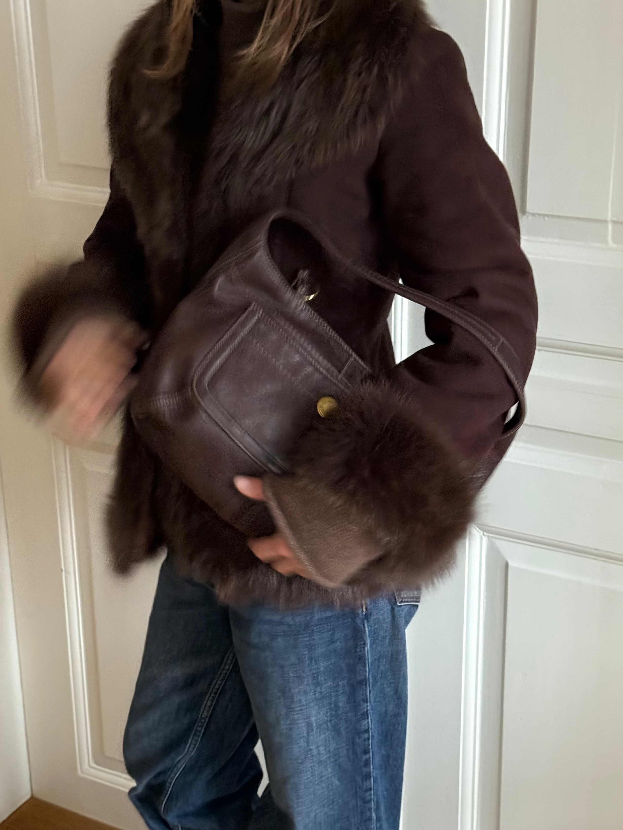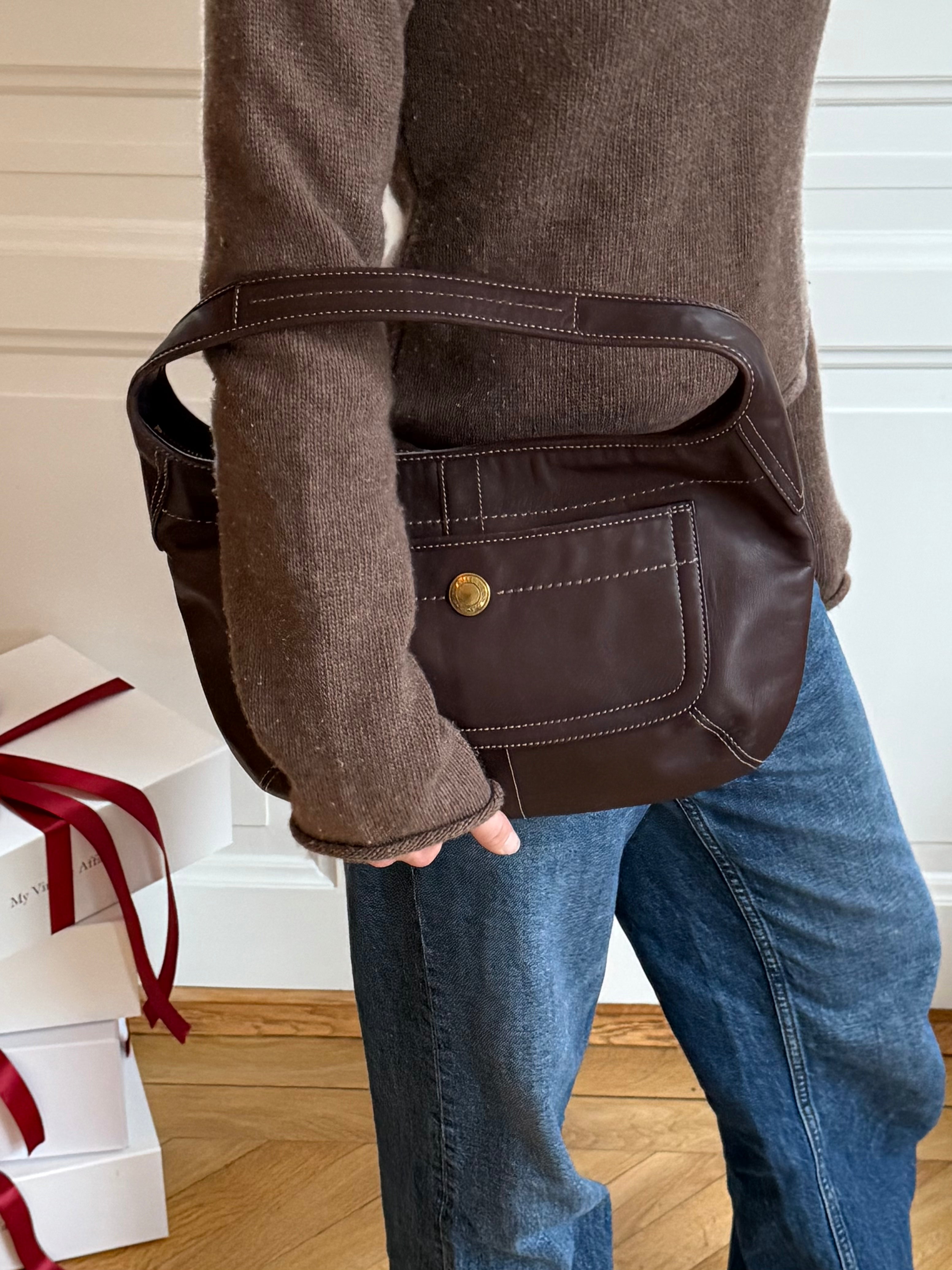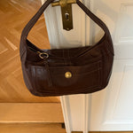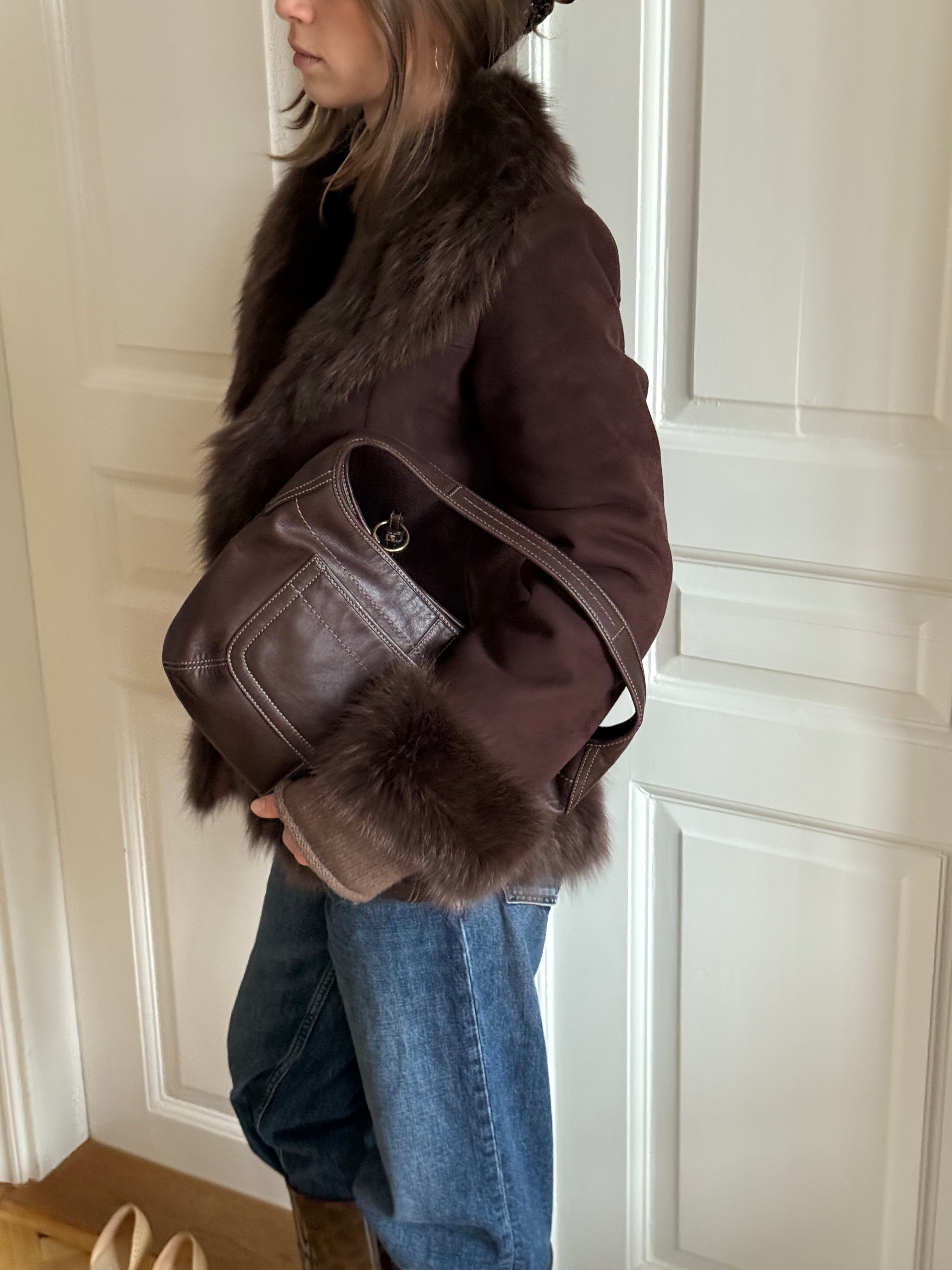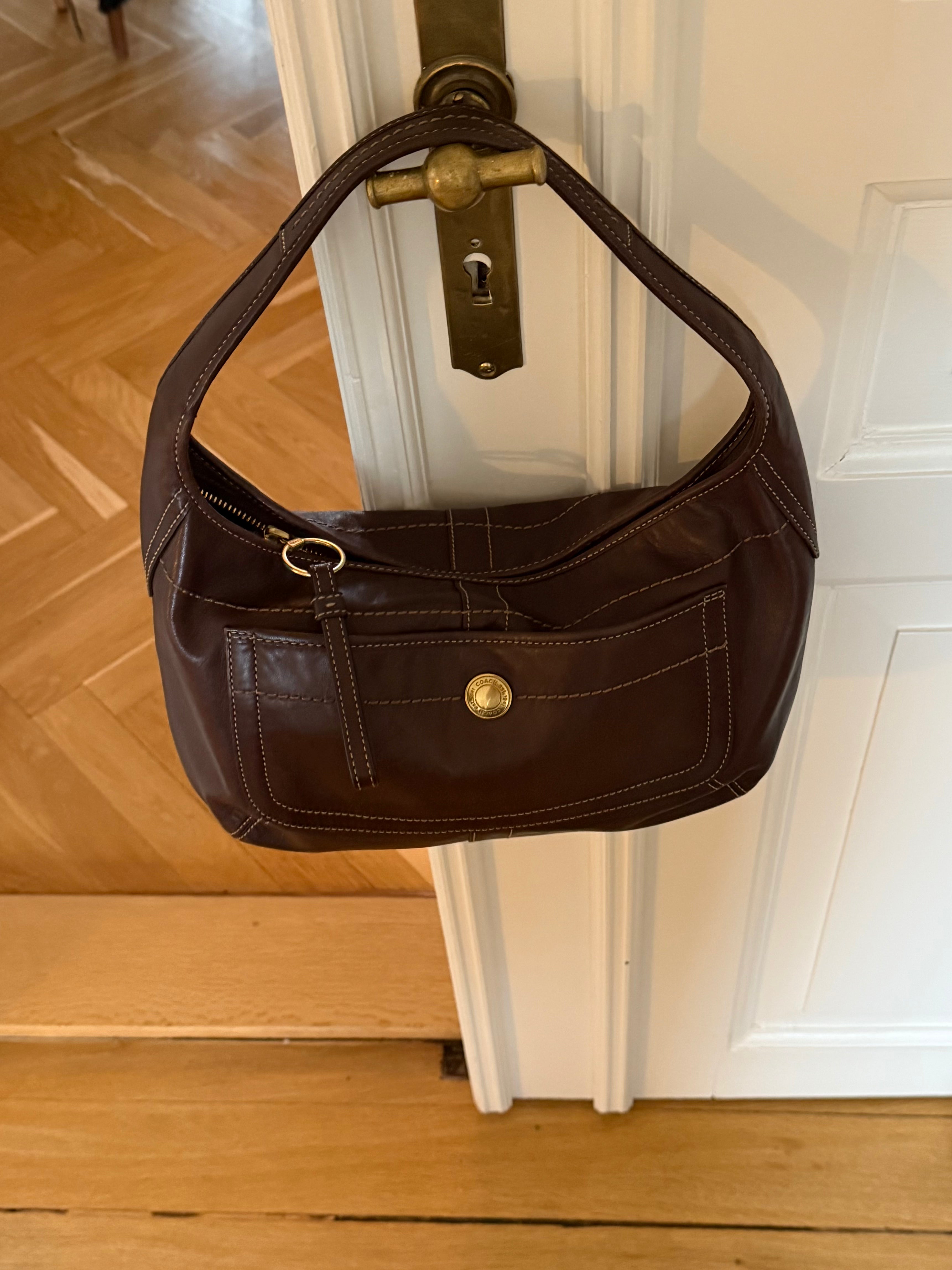 Vintage Coach shoulder bag in a beautiful dark brown color with gold-colored hardware. It has a front pocket and a zippered pocket inside.