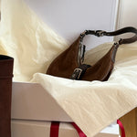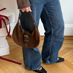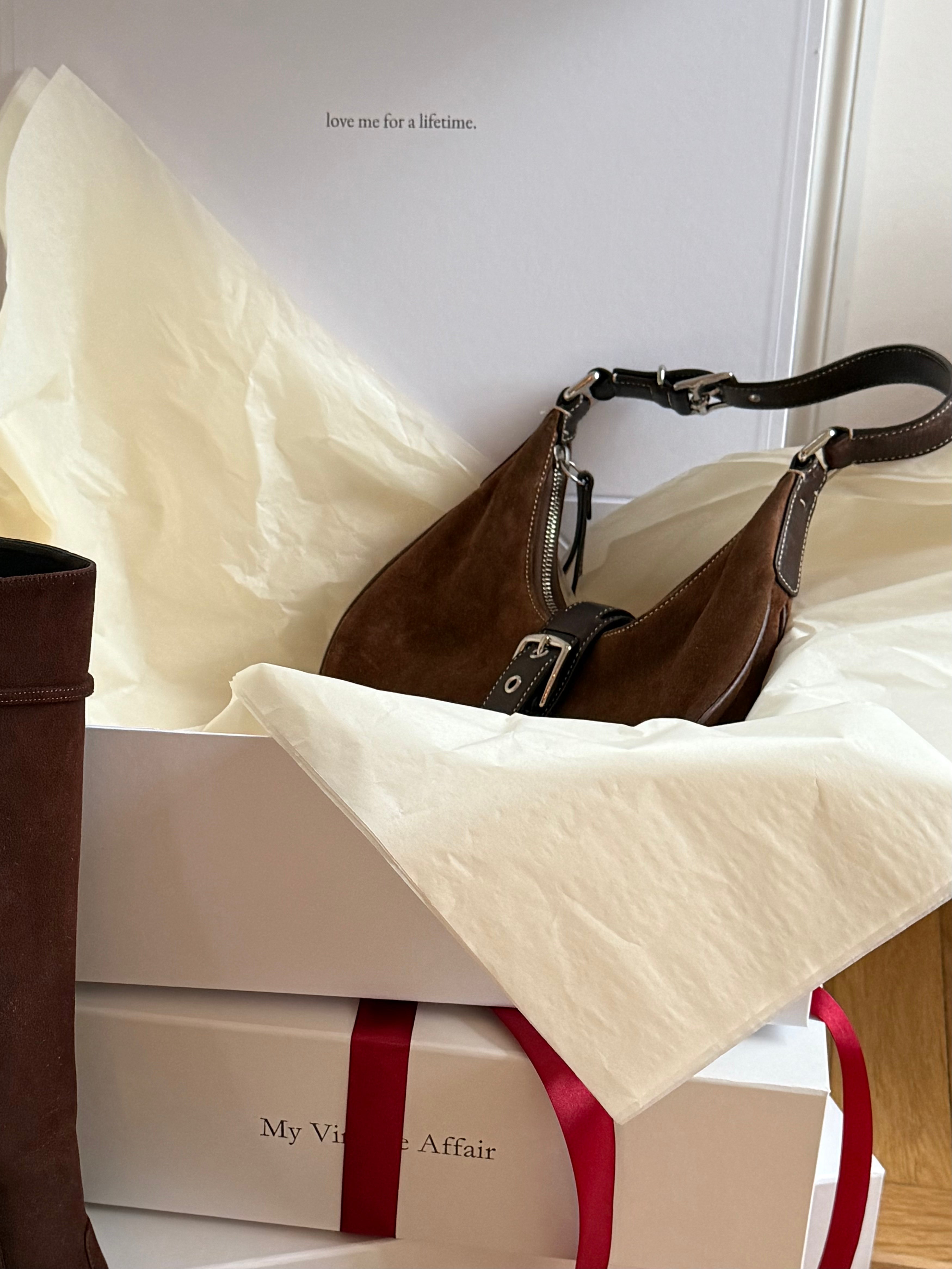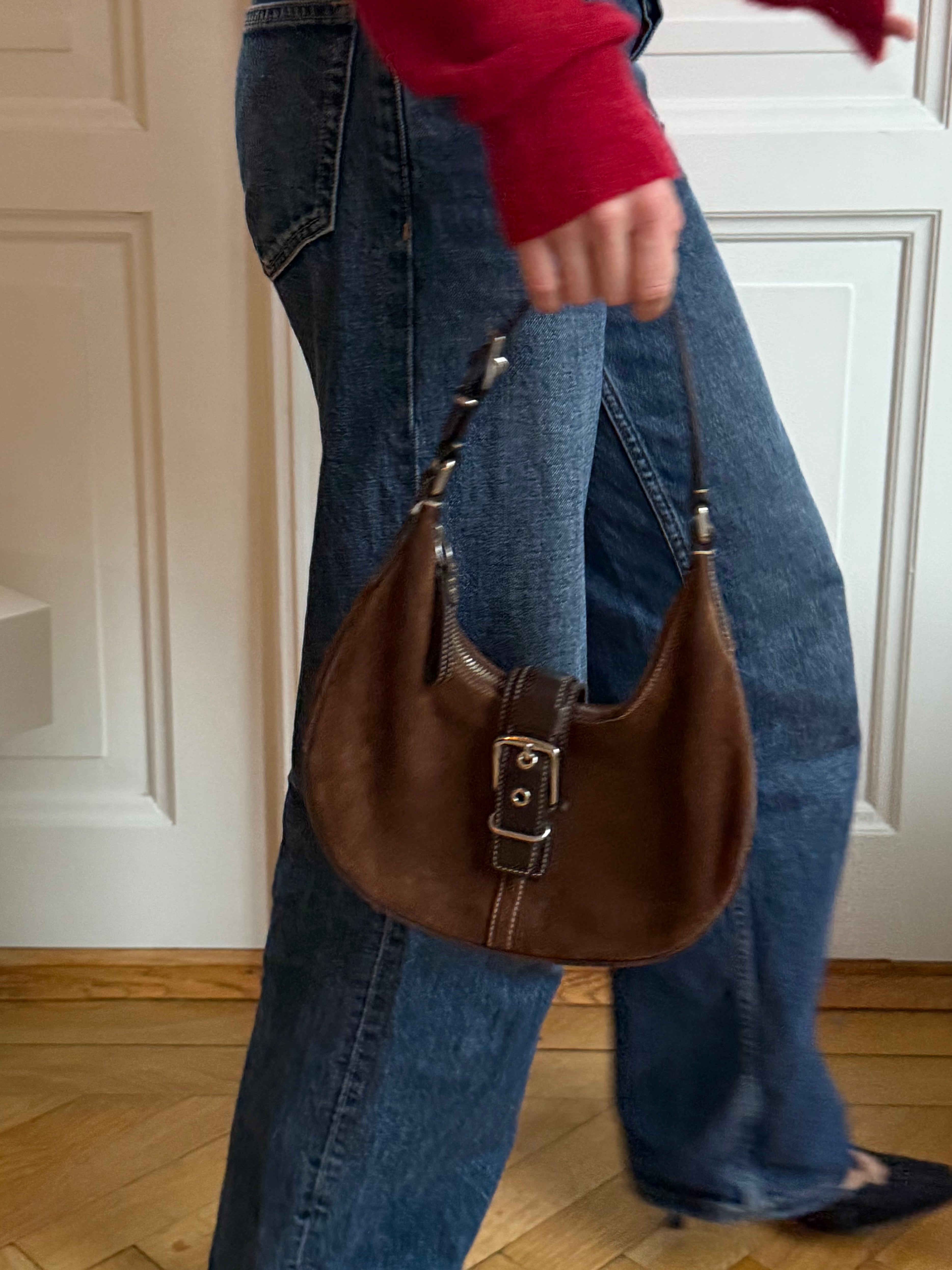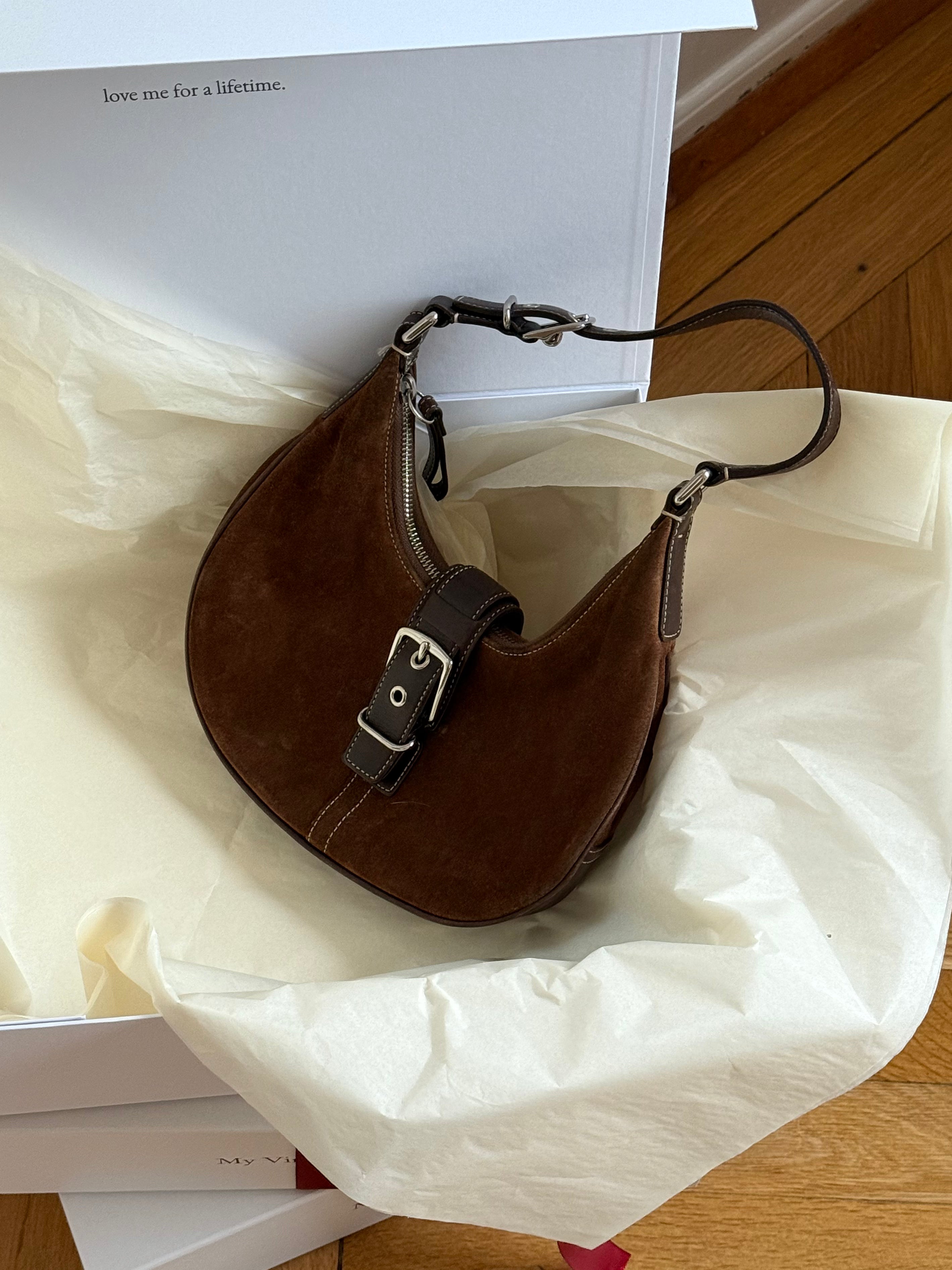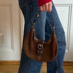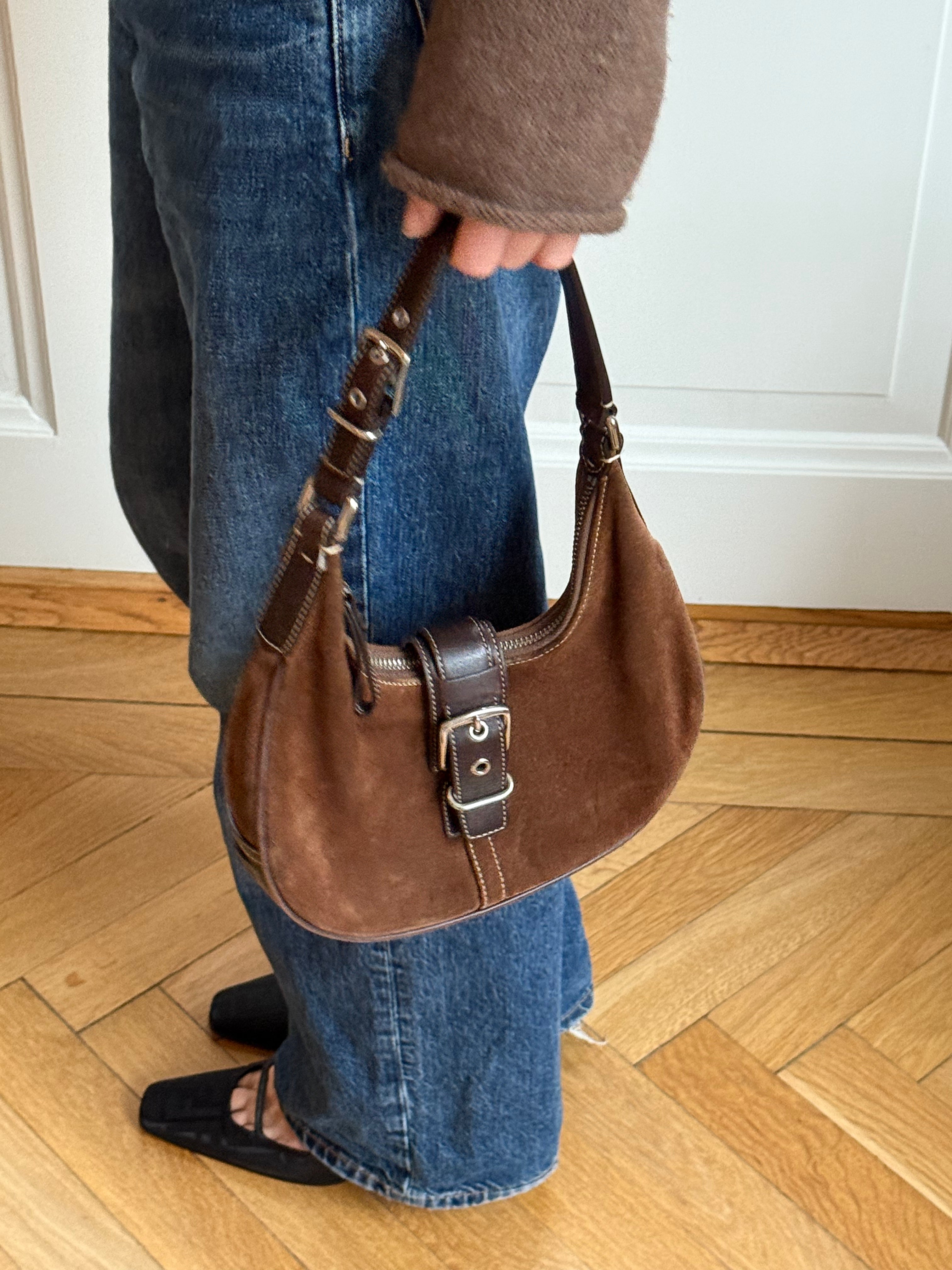 Beautiful vintage Coach soho shoulder bag in brown suede and dark brown leather. Features white stitching and silver hardware.
