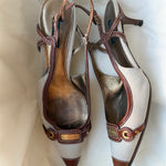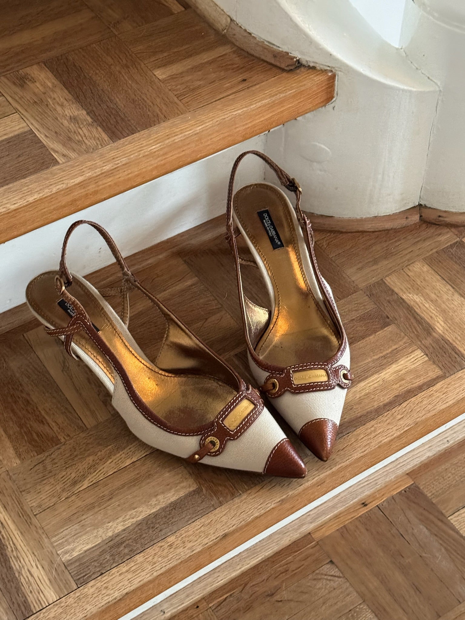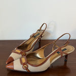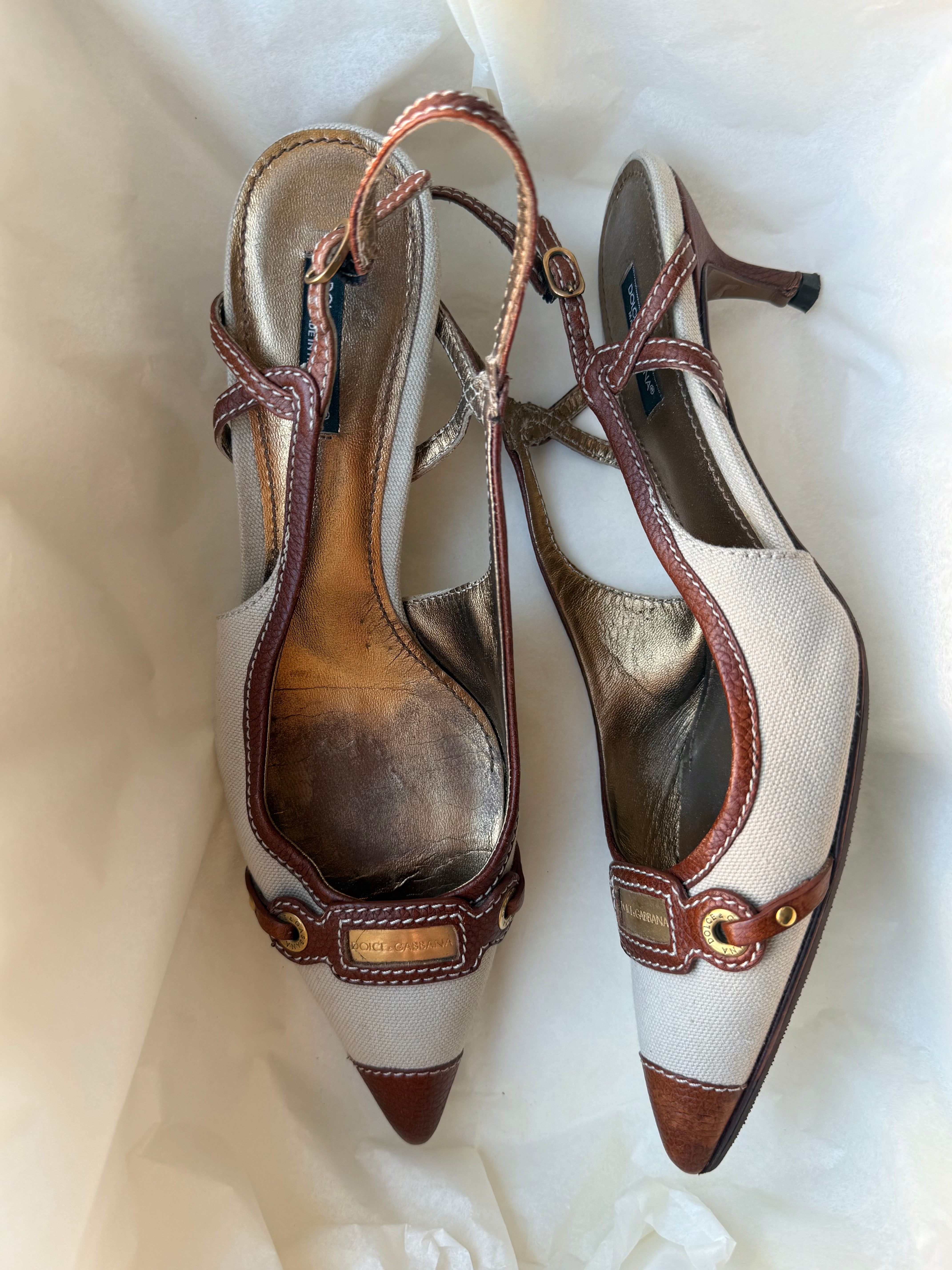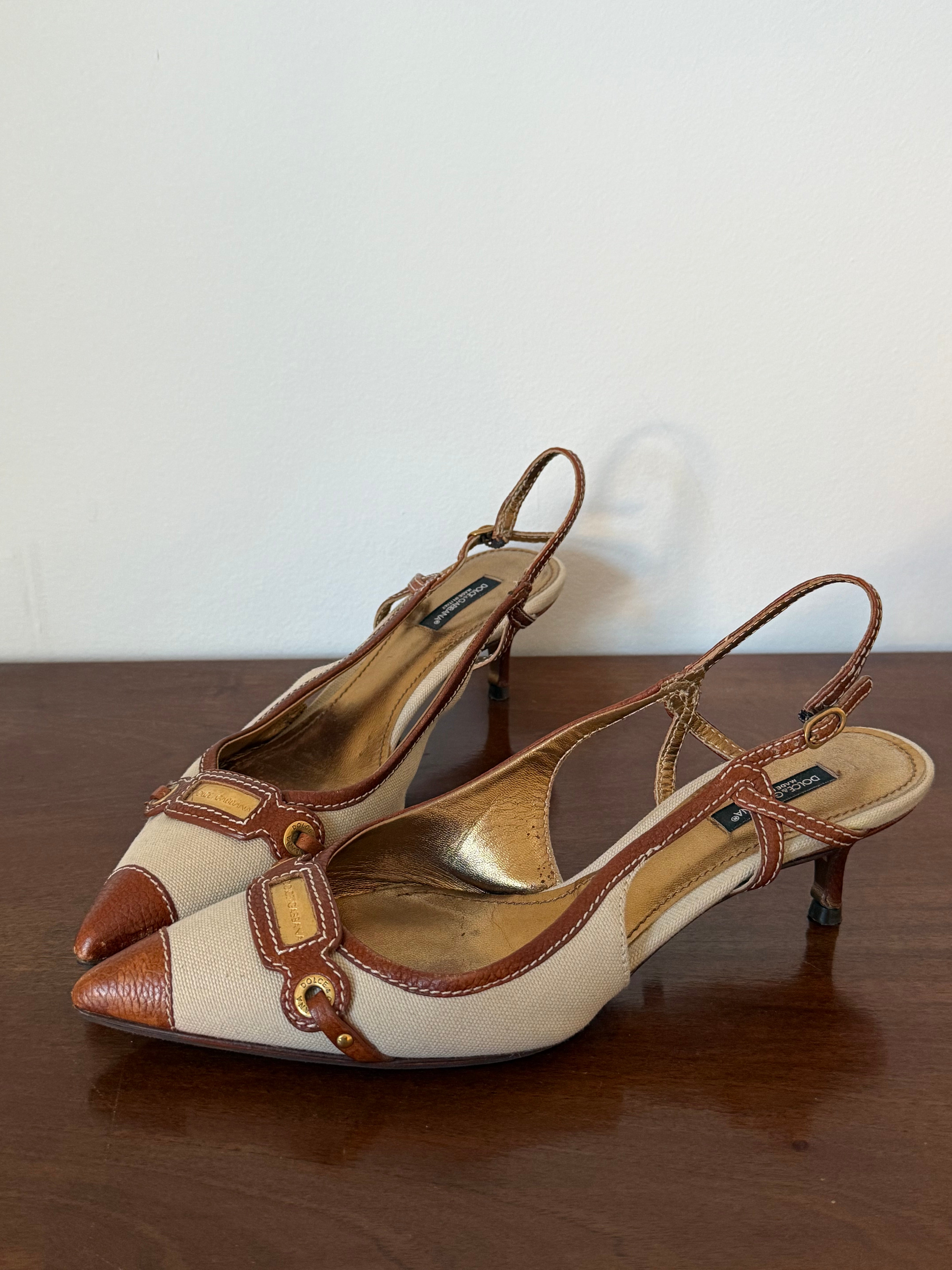 Vintage Dolce & Gabbana slingback pumps in beige canvas with brown leather trim, gold-tone hardware and a pointed toe.