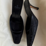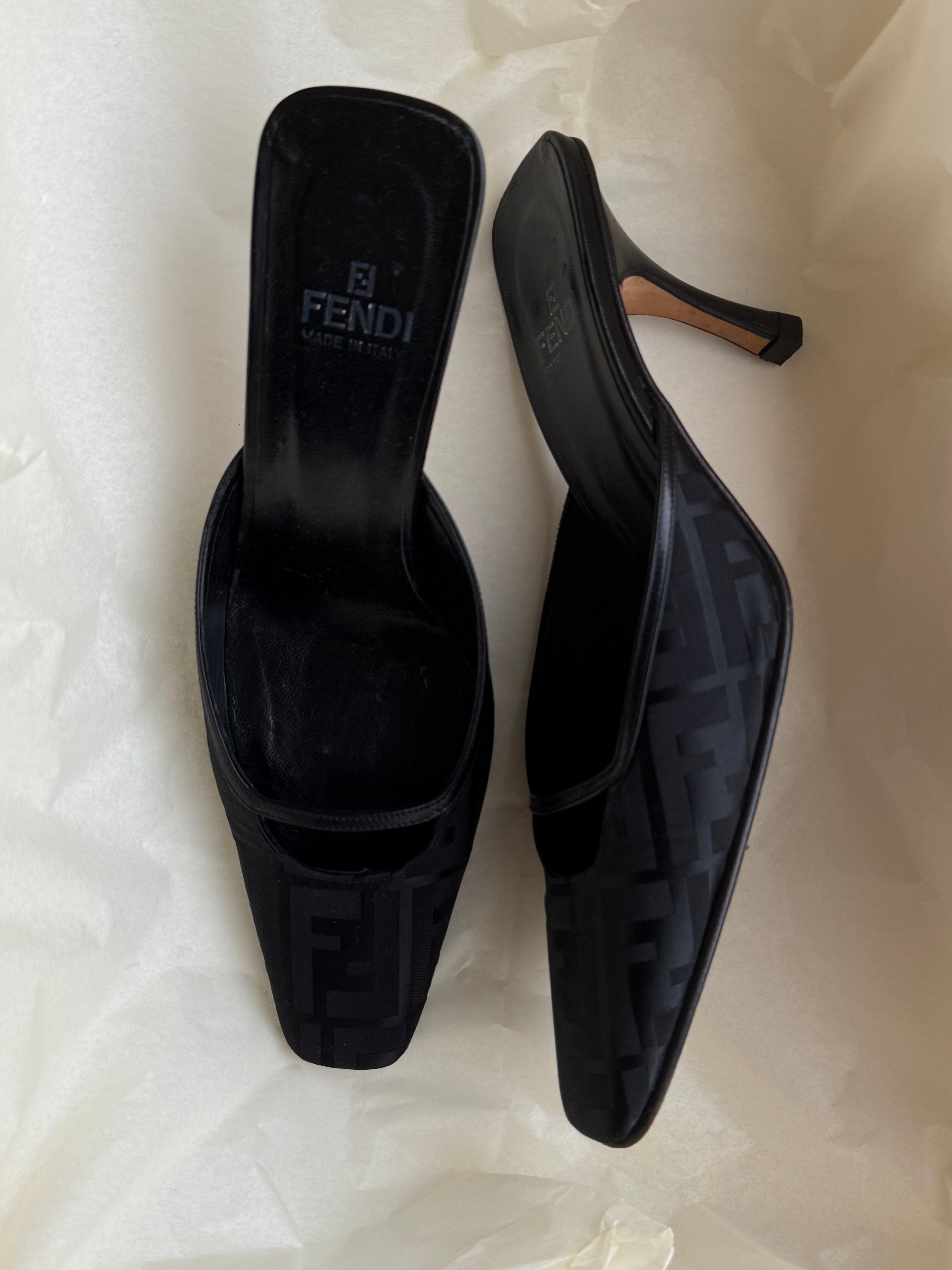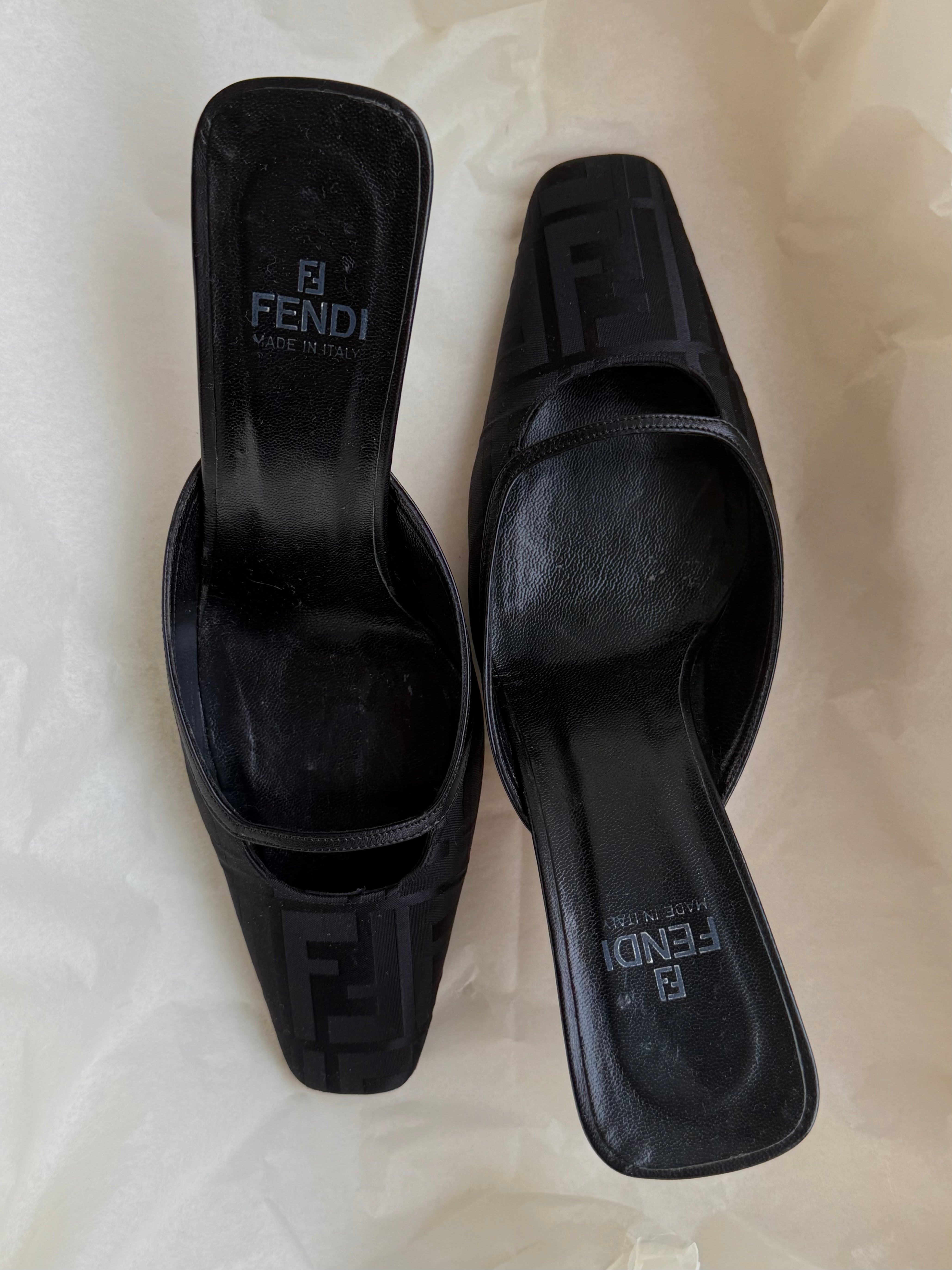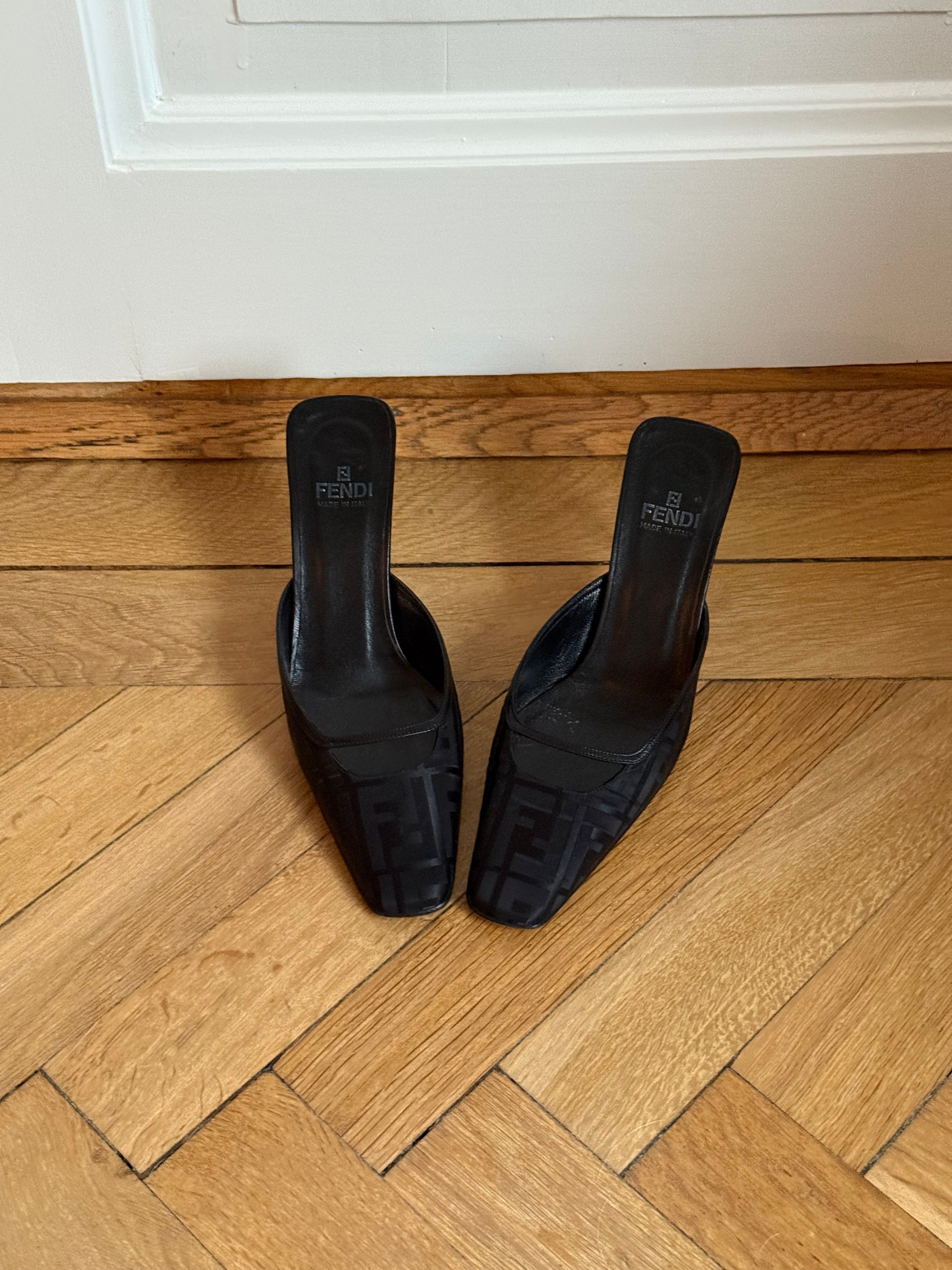 Vintage classic Fendi mules featuring the classic black Zucca monogram, a square toe and a slim heel.