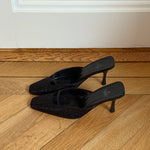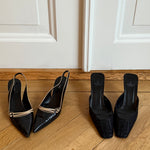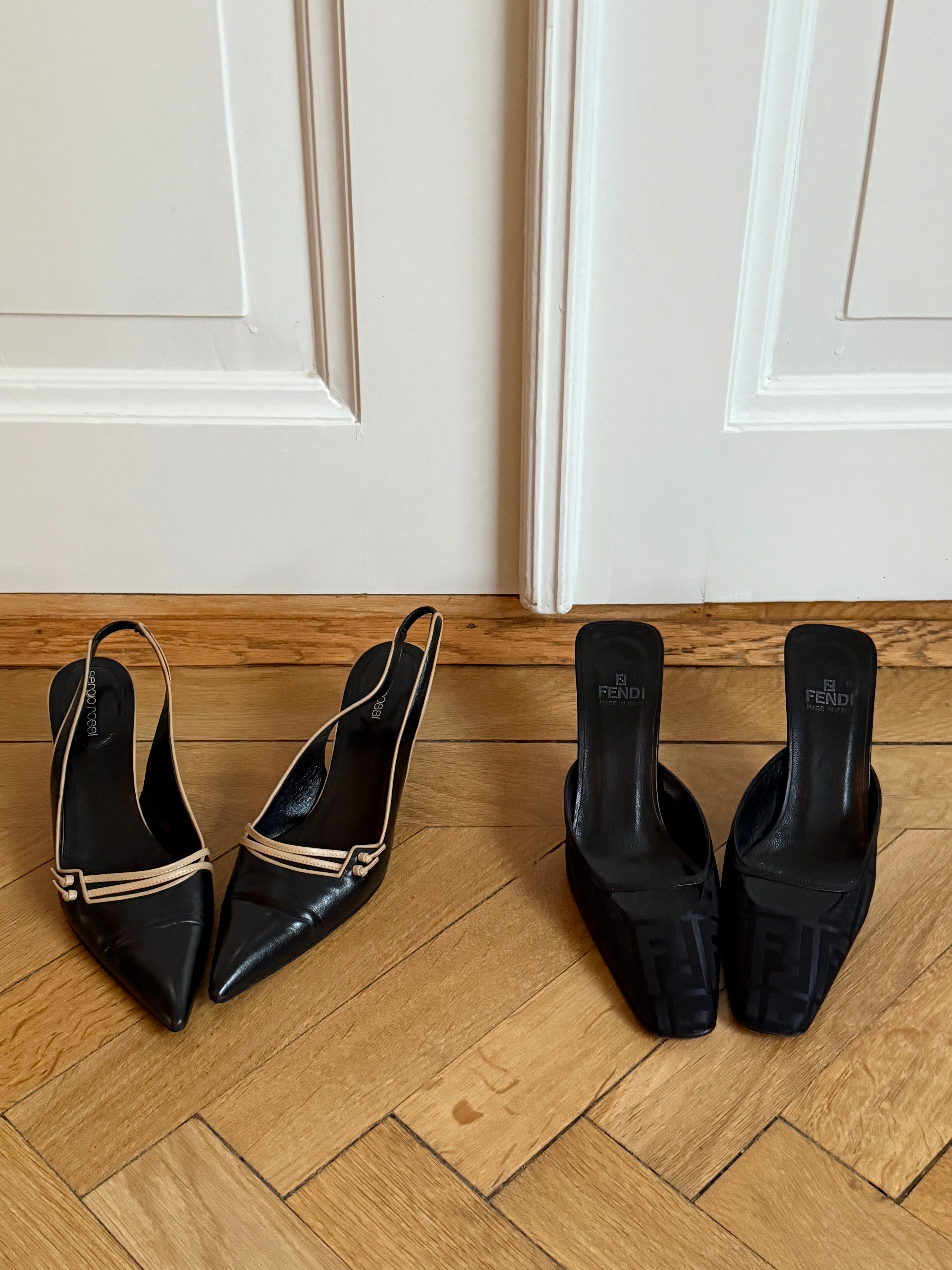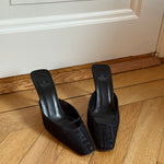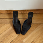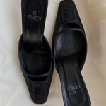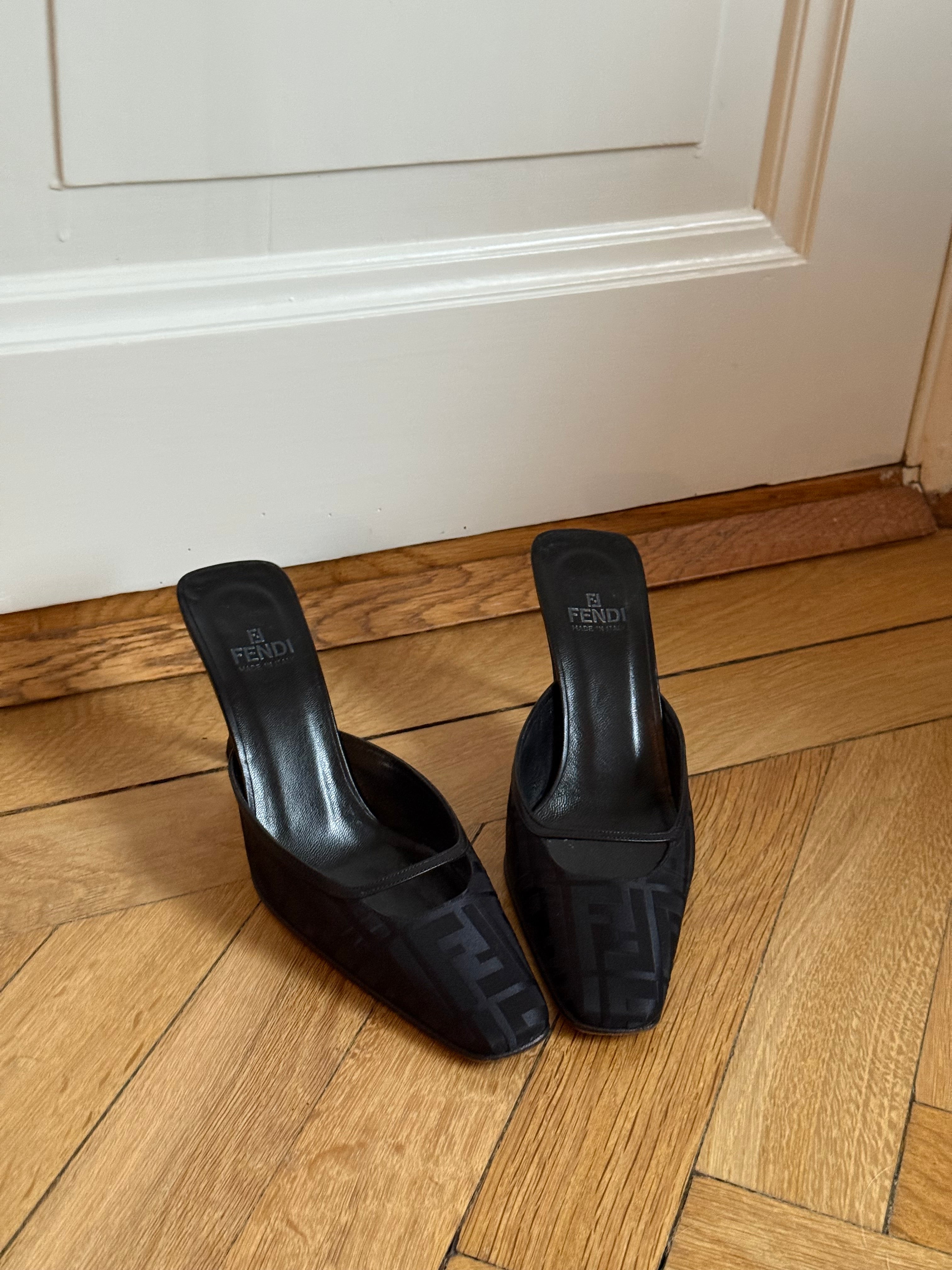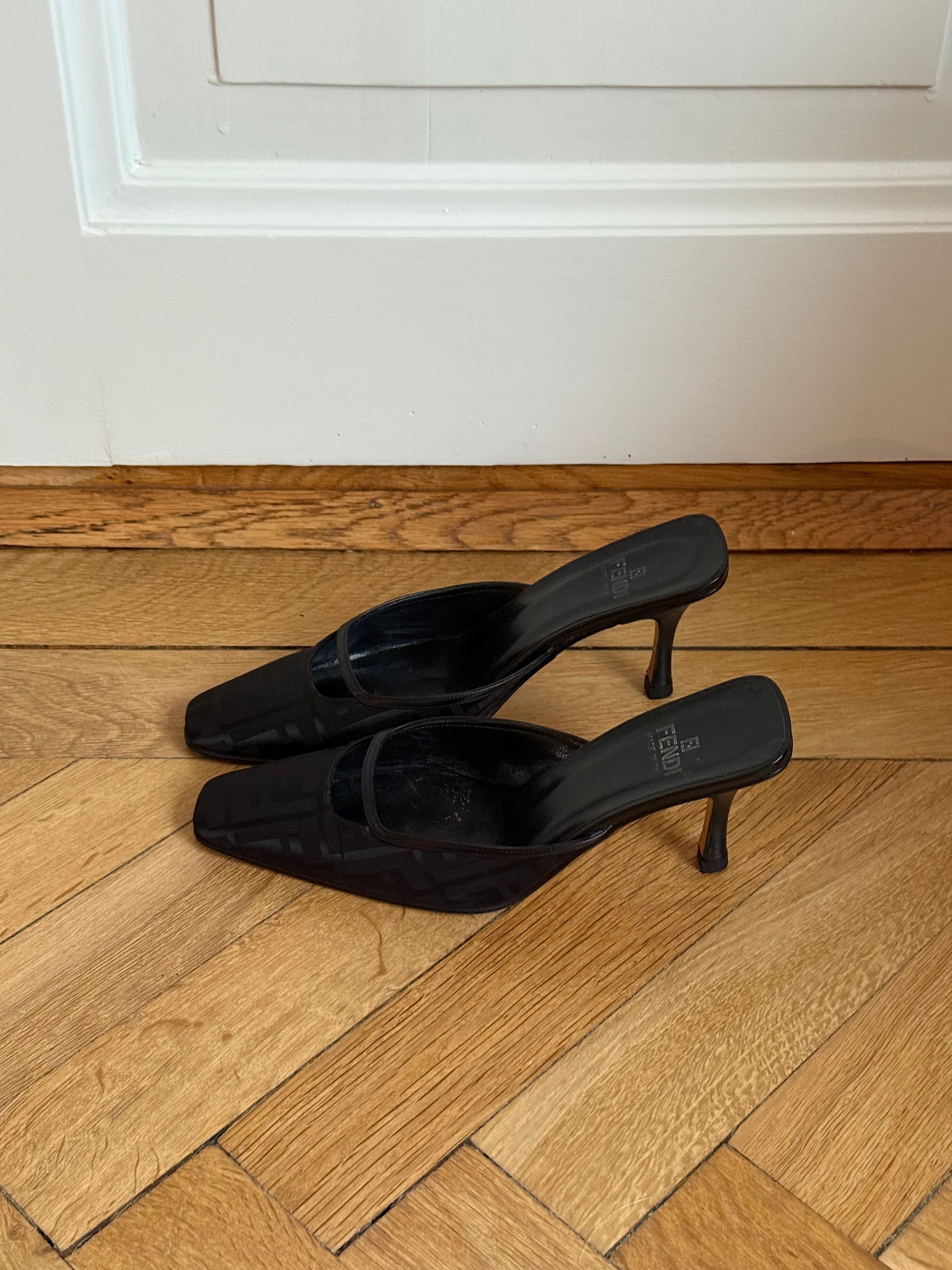 Vintage classic Fendi mules featuring the classic black Zucca monogram, a square toe and a slim heel.