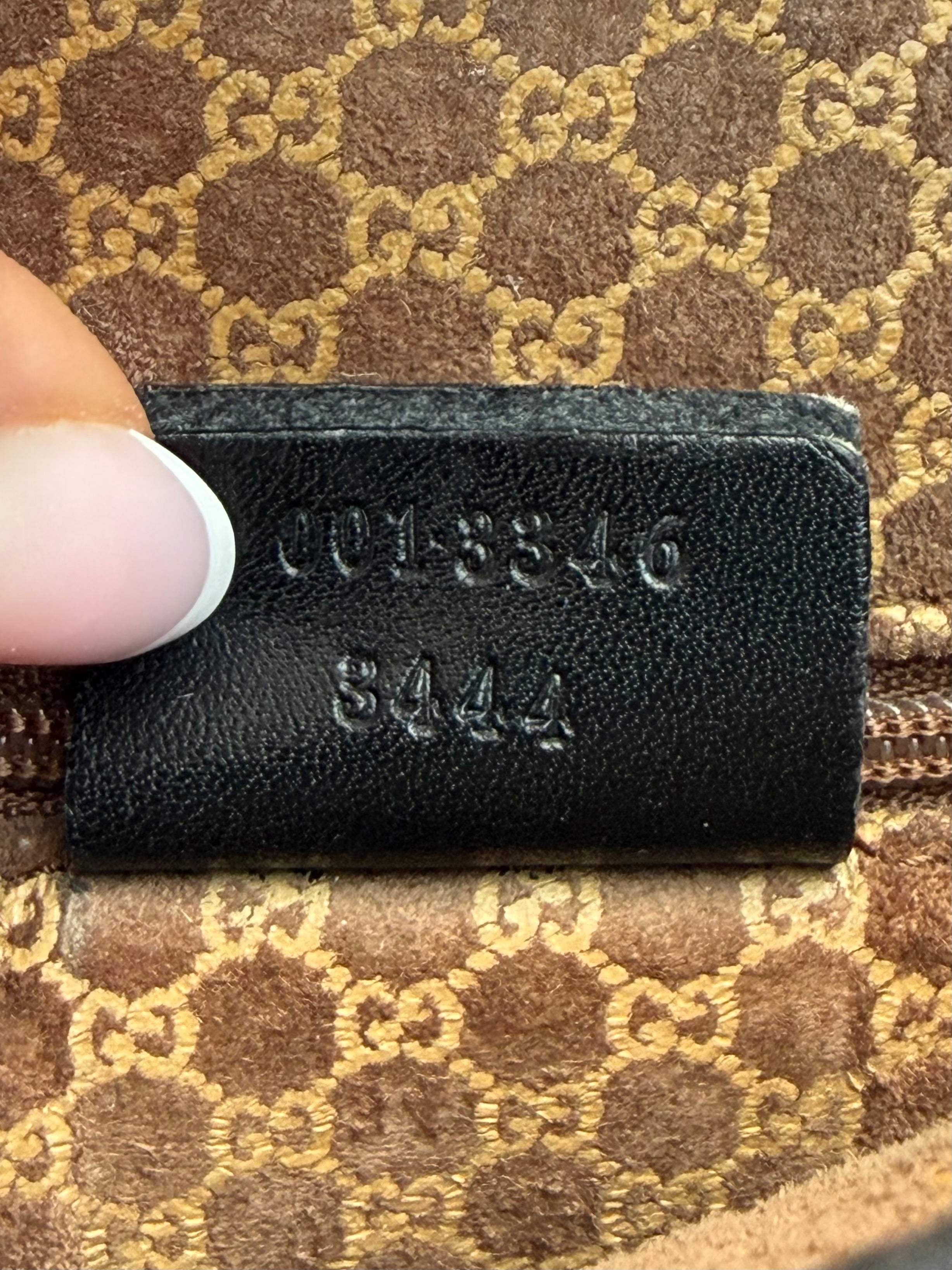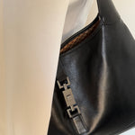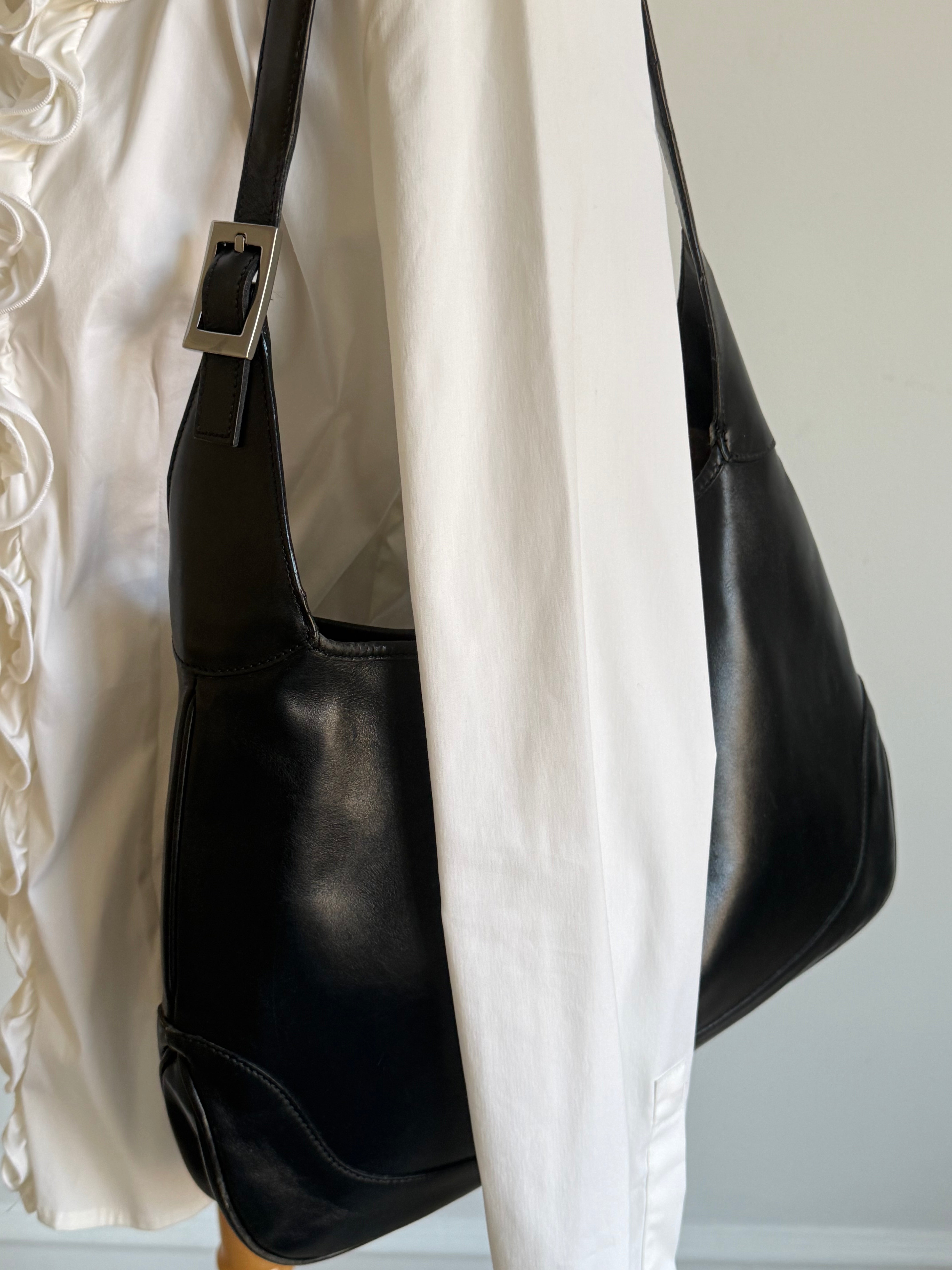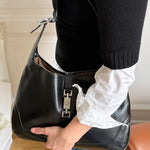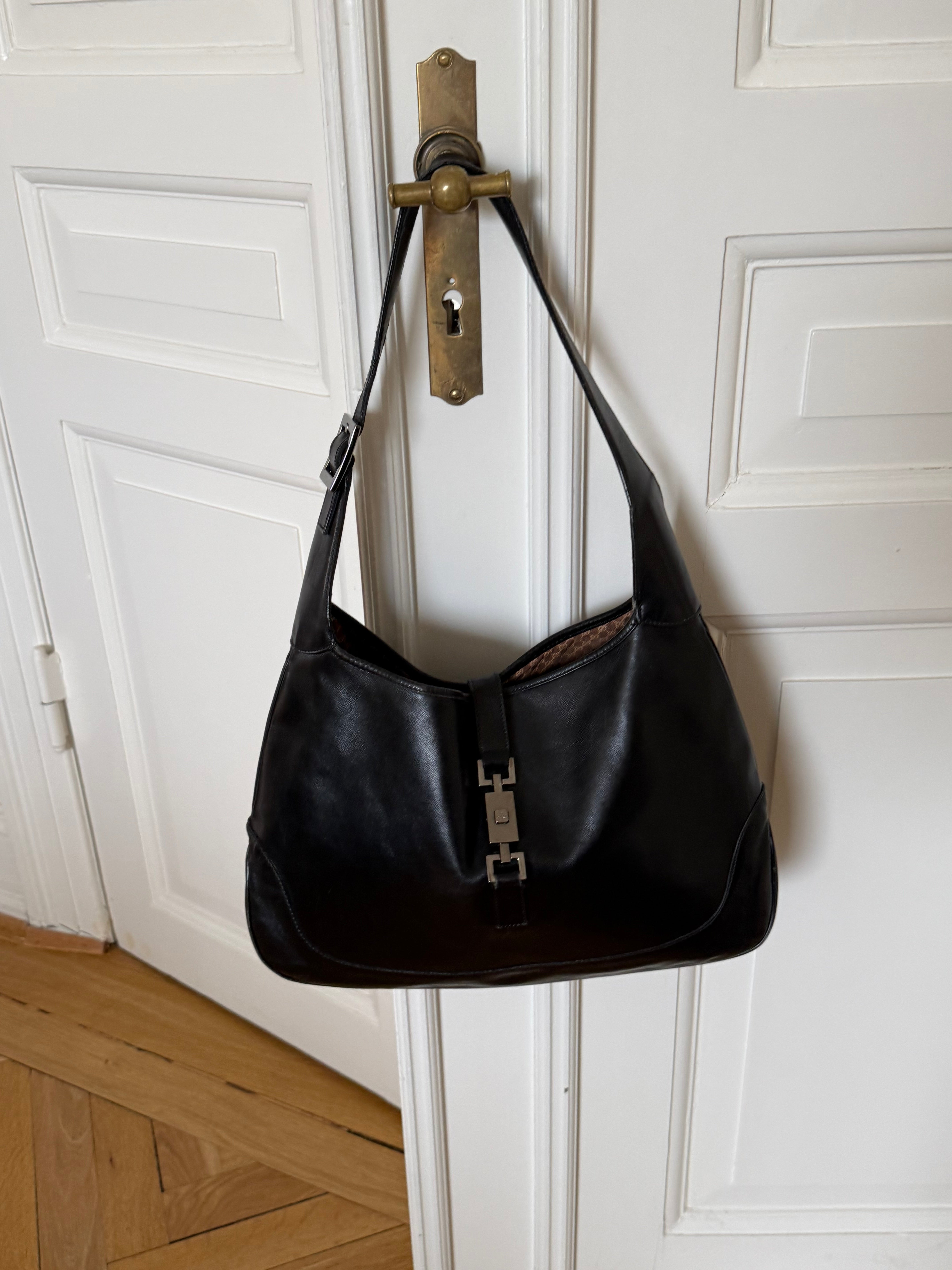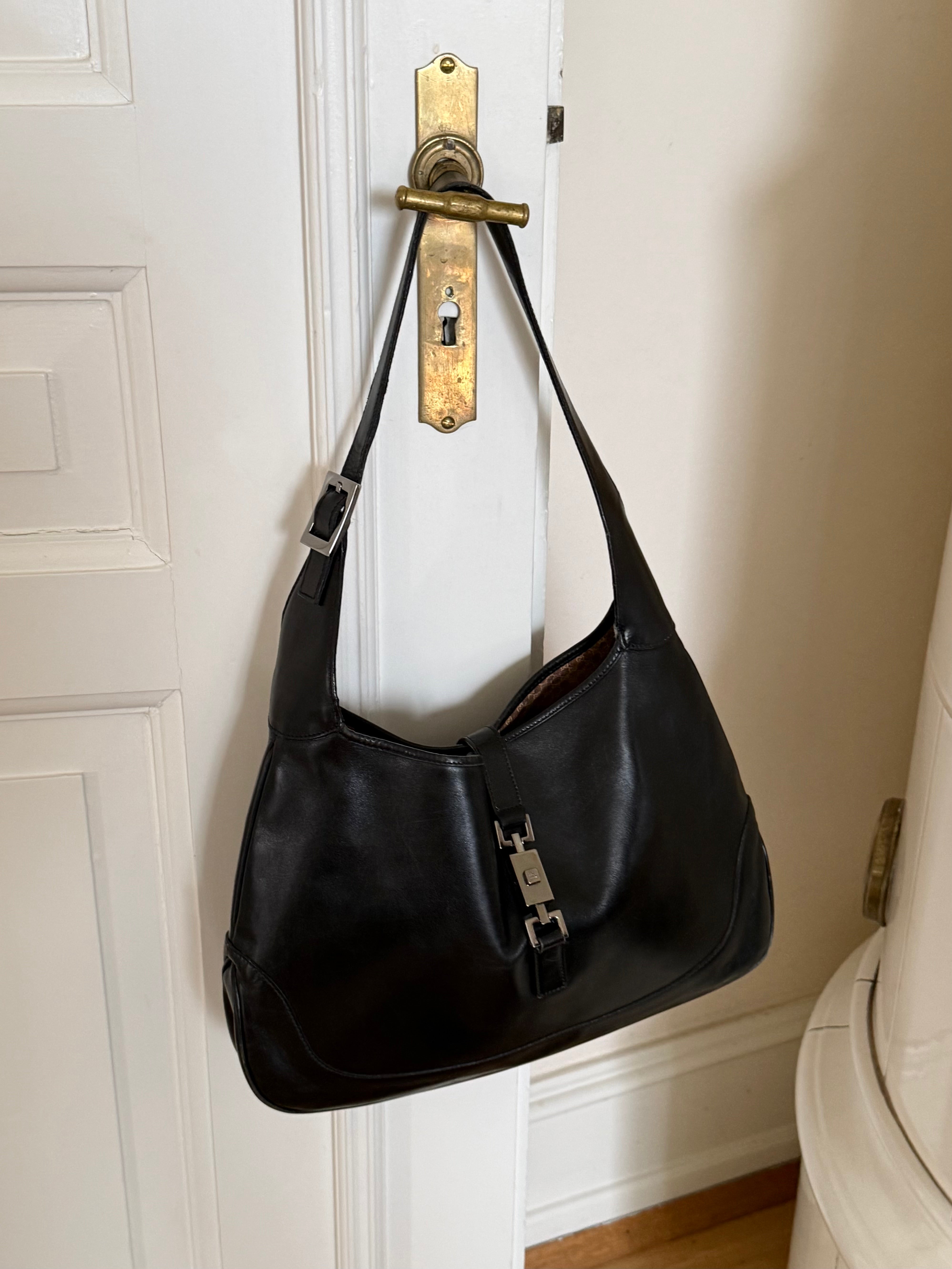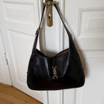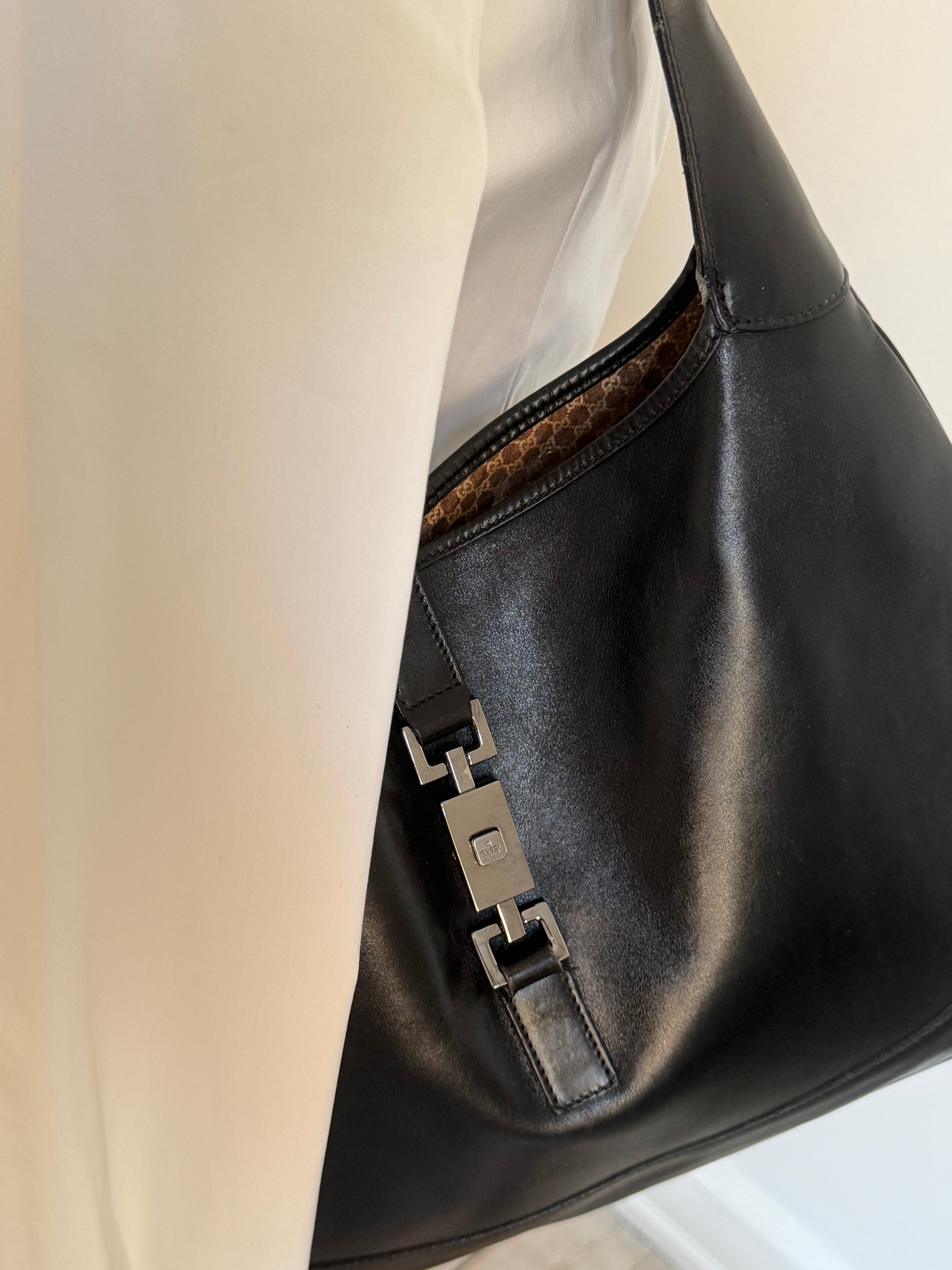 Iconic vintage Gucci Jackie shoulder bag in black leather with silver-tone piston closure.