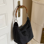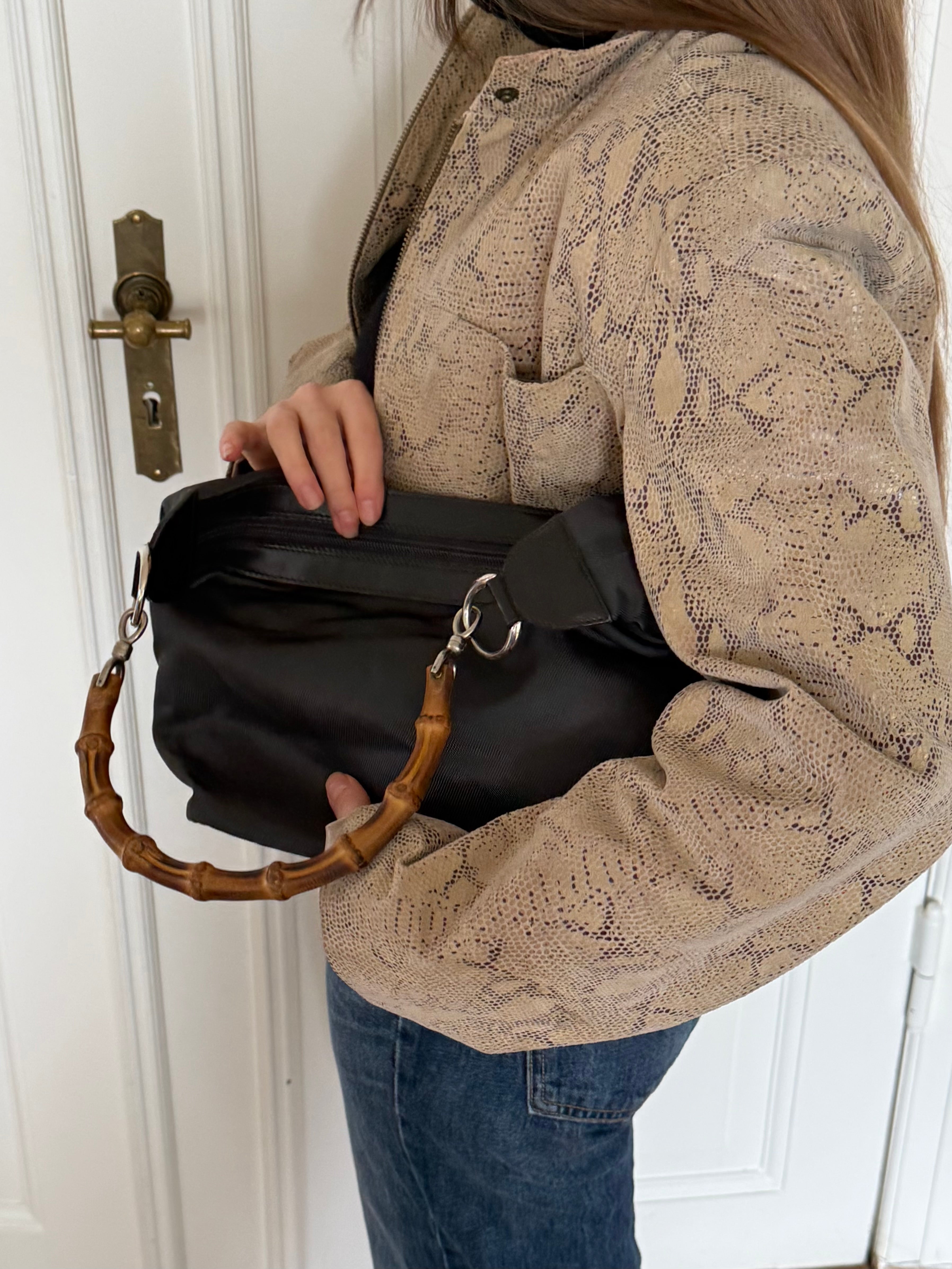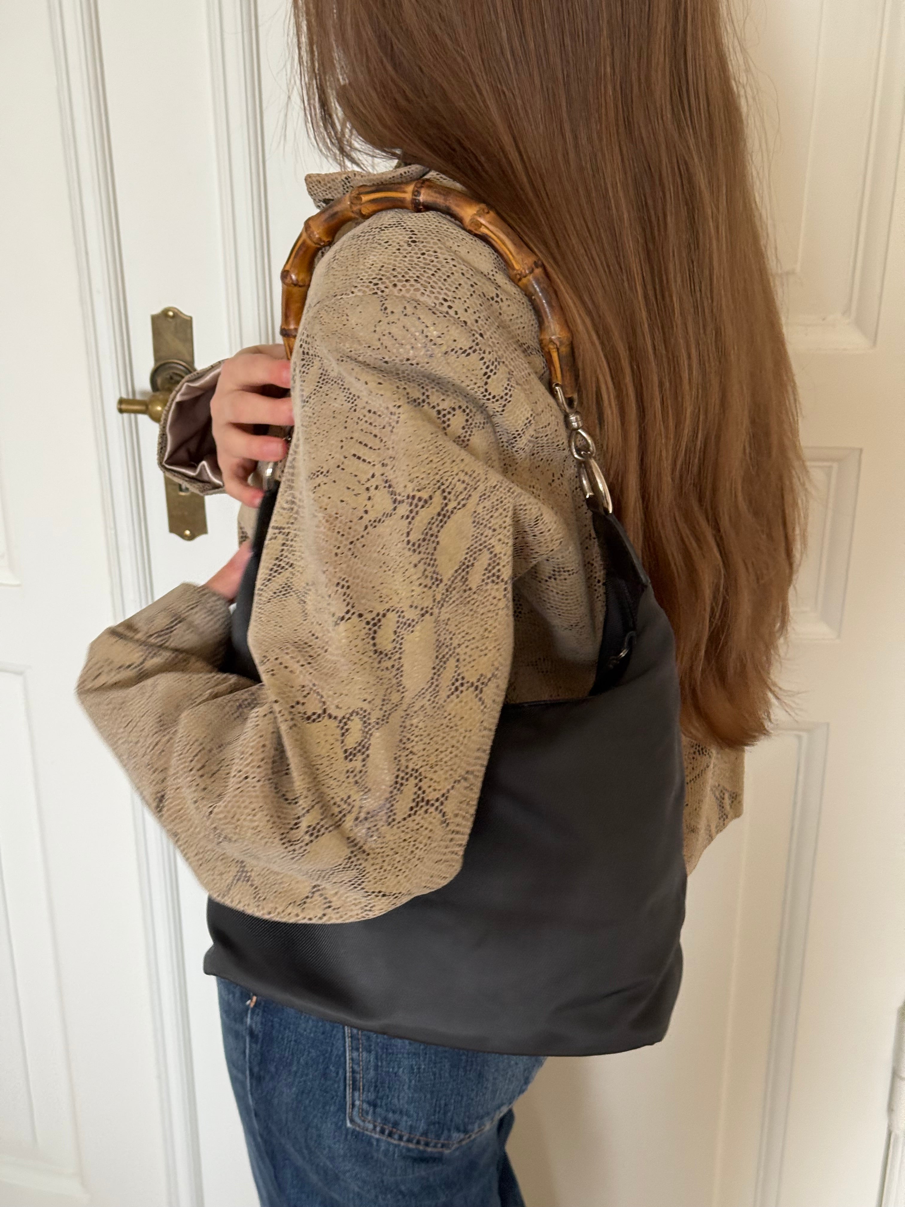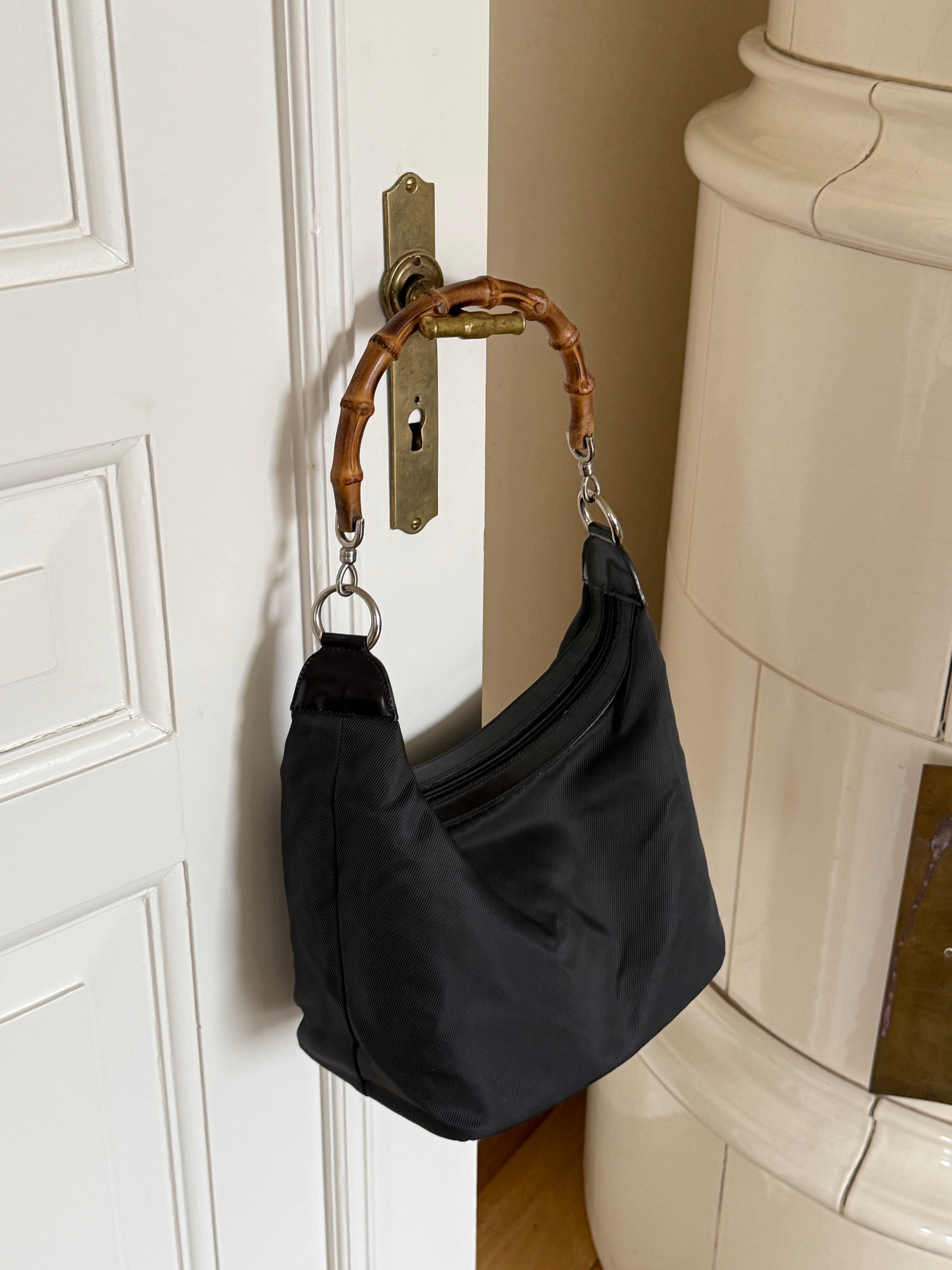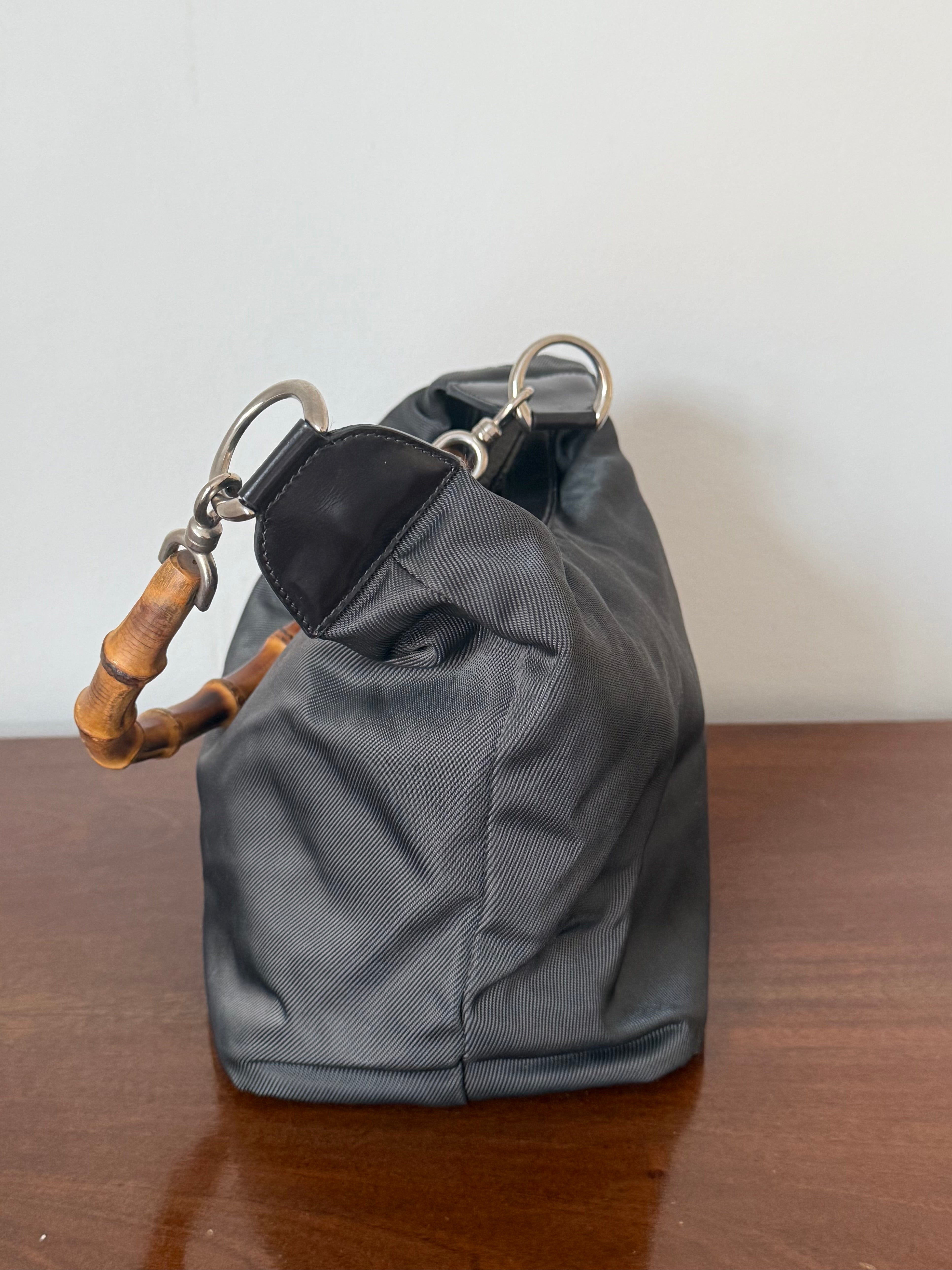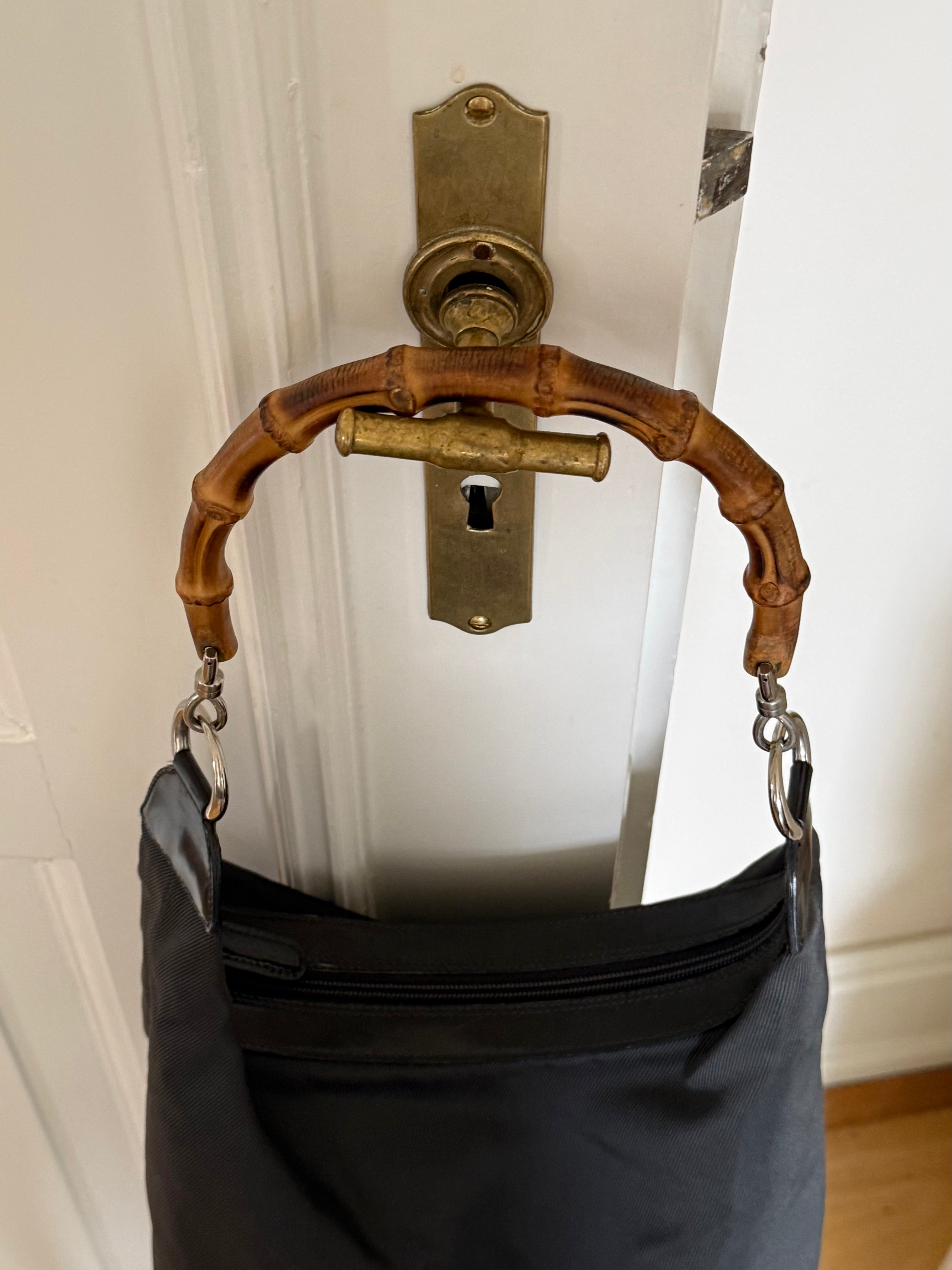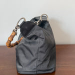 Vintage Gucci bamboo shoulder bag in nylon with silver-tone hardware and the iconic bamboo handle.