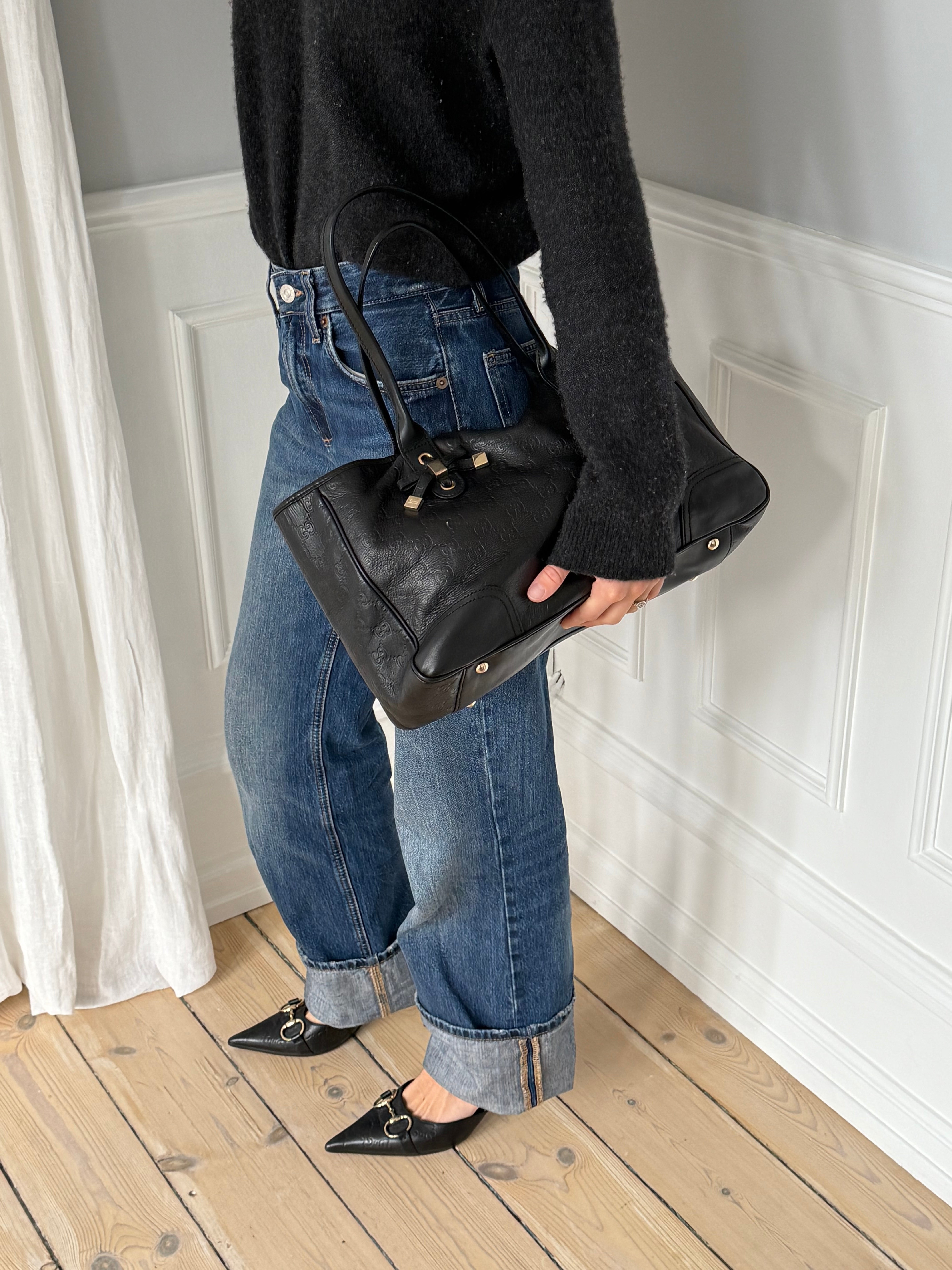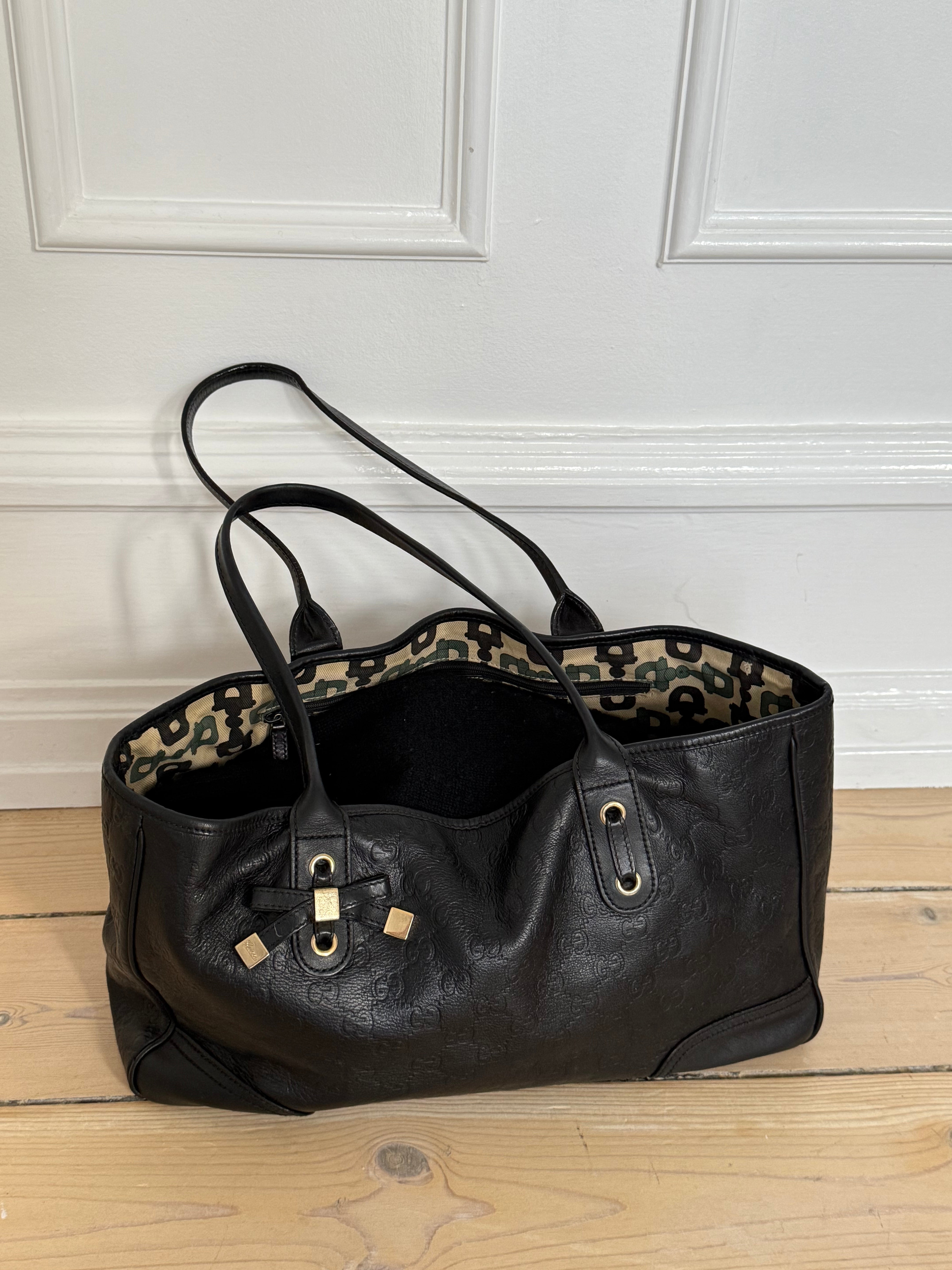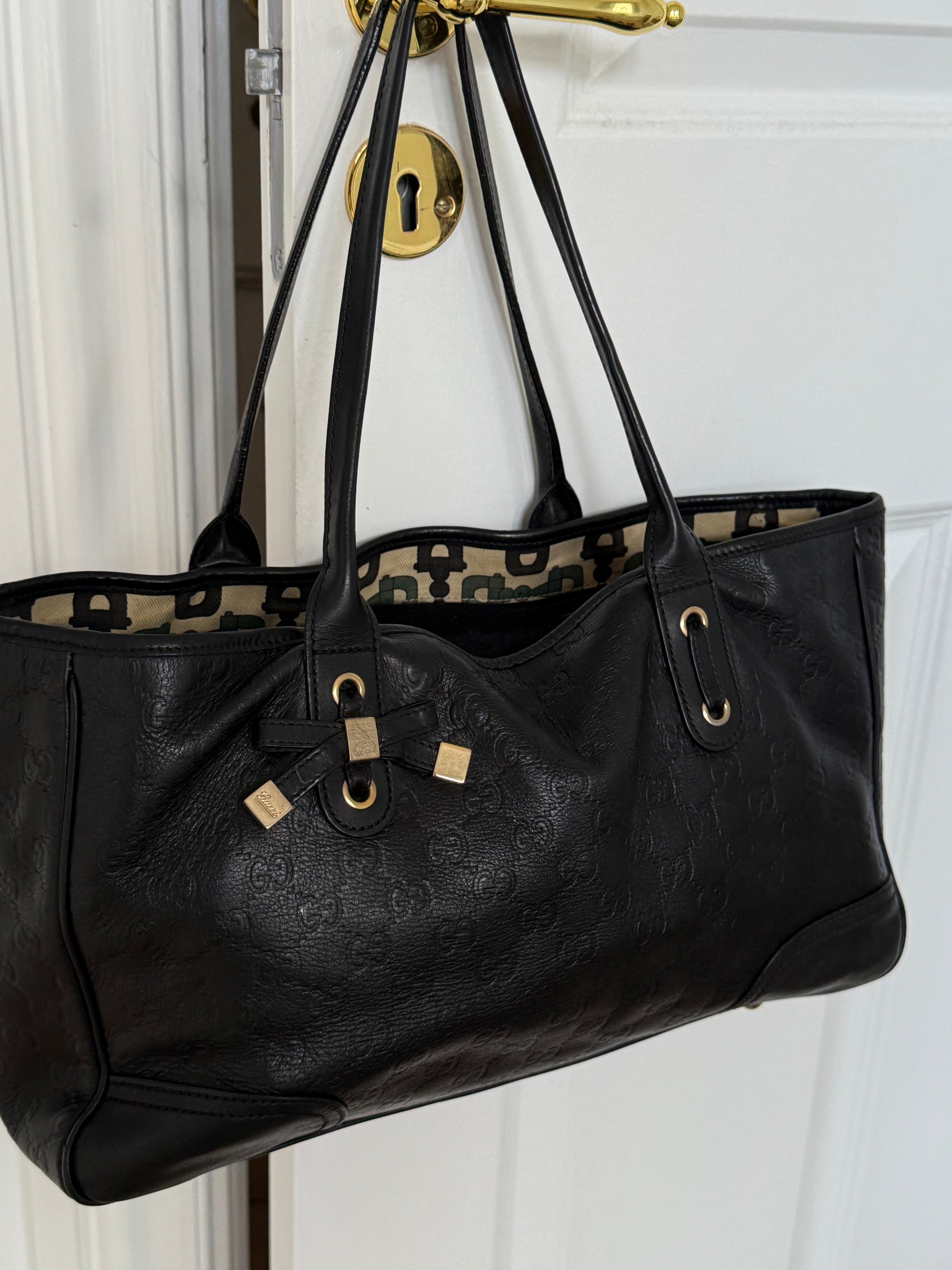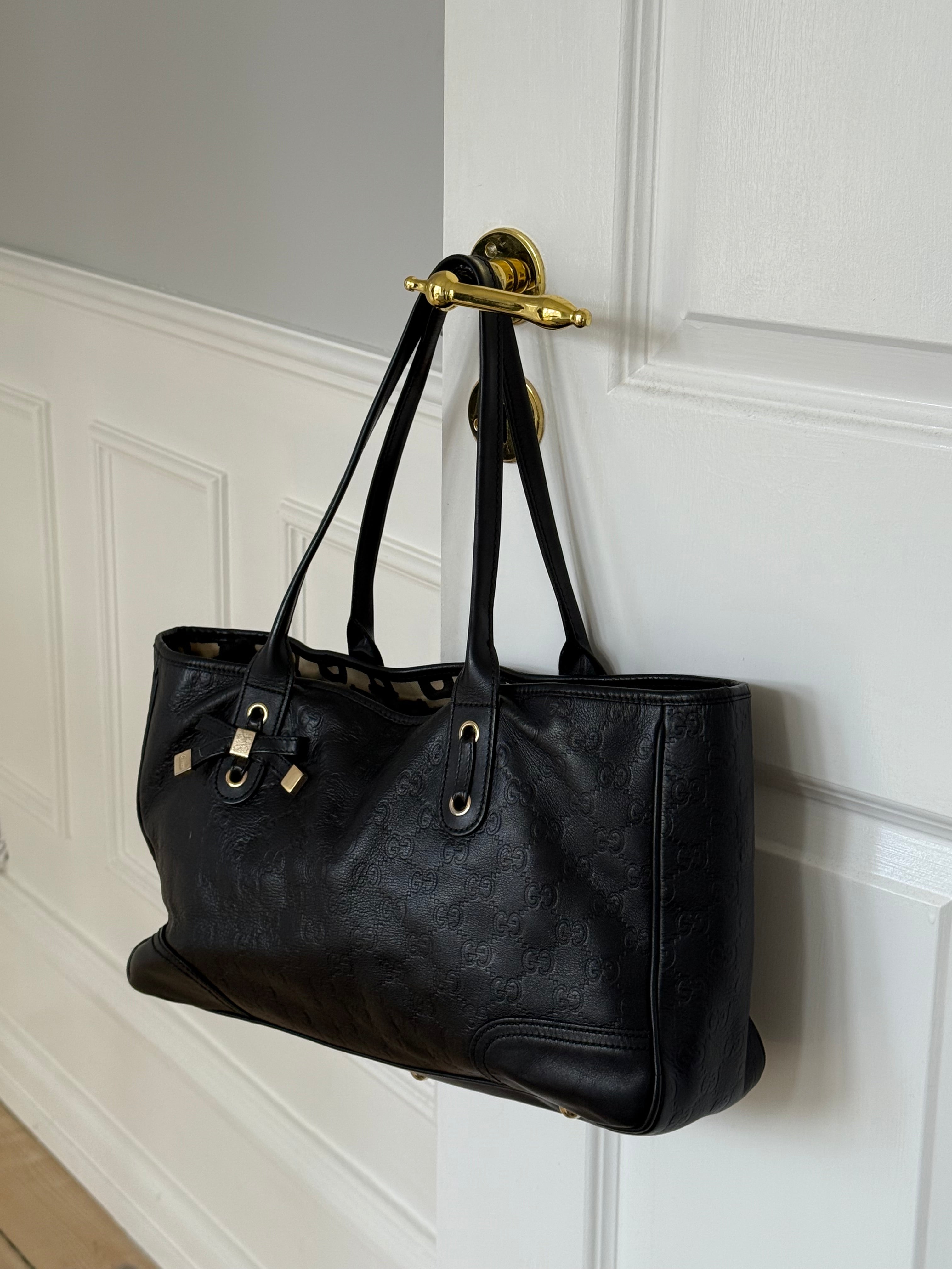 Vintage Gucci Princy tote bag in black Guccissima-embossed leather with gold-tone hardware. Features shoulder straps, signature bow detail and a spacious interior lined with Gucci’s horsebit-print fabric.