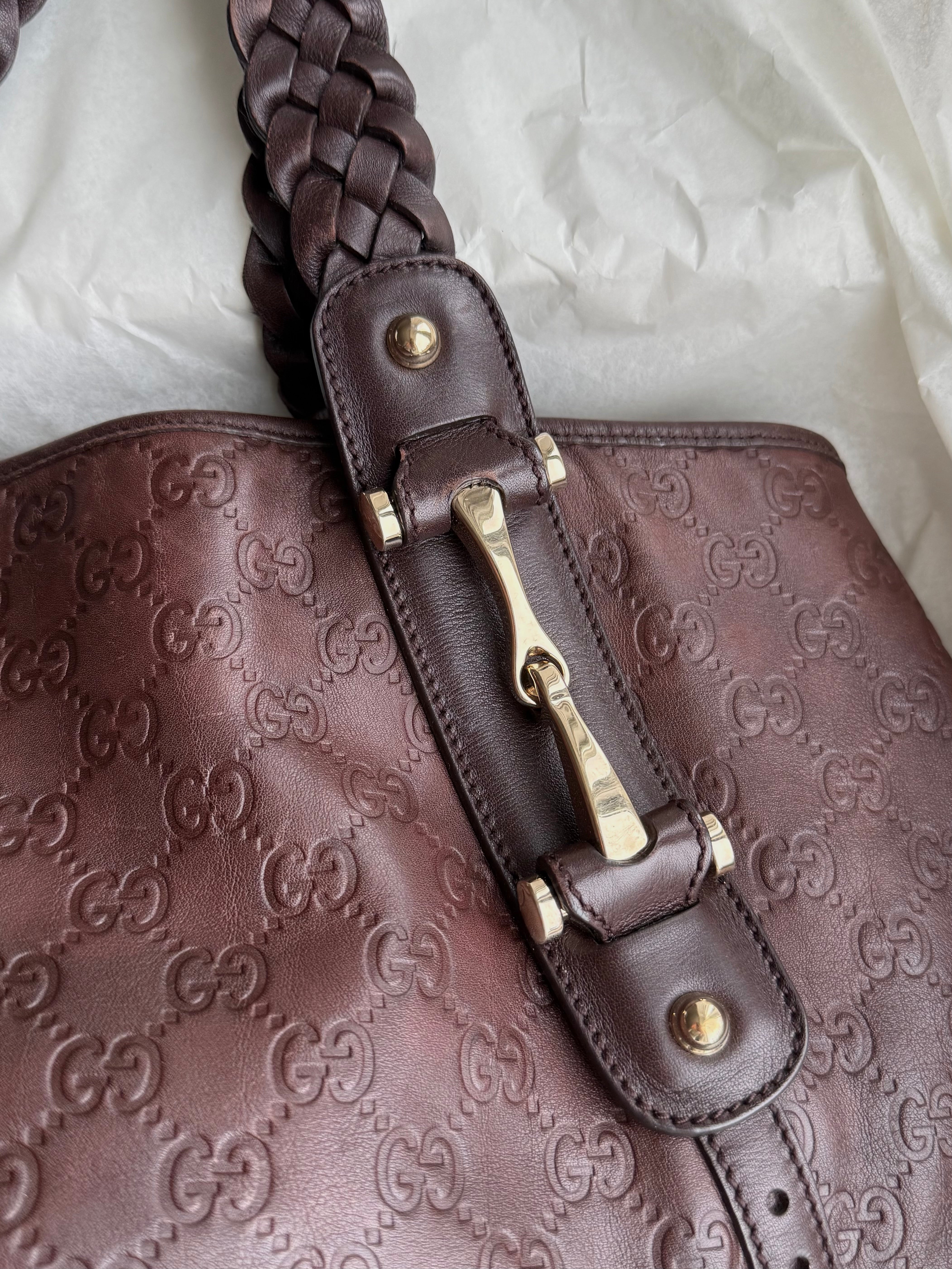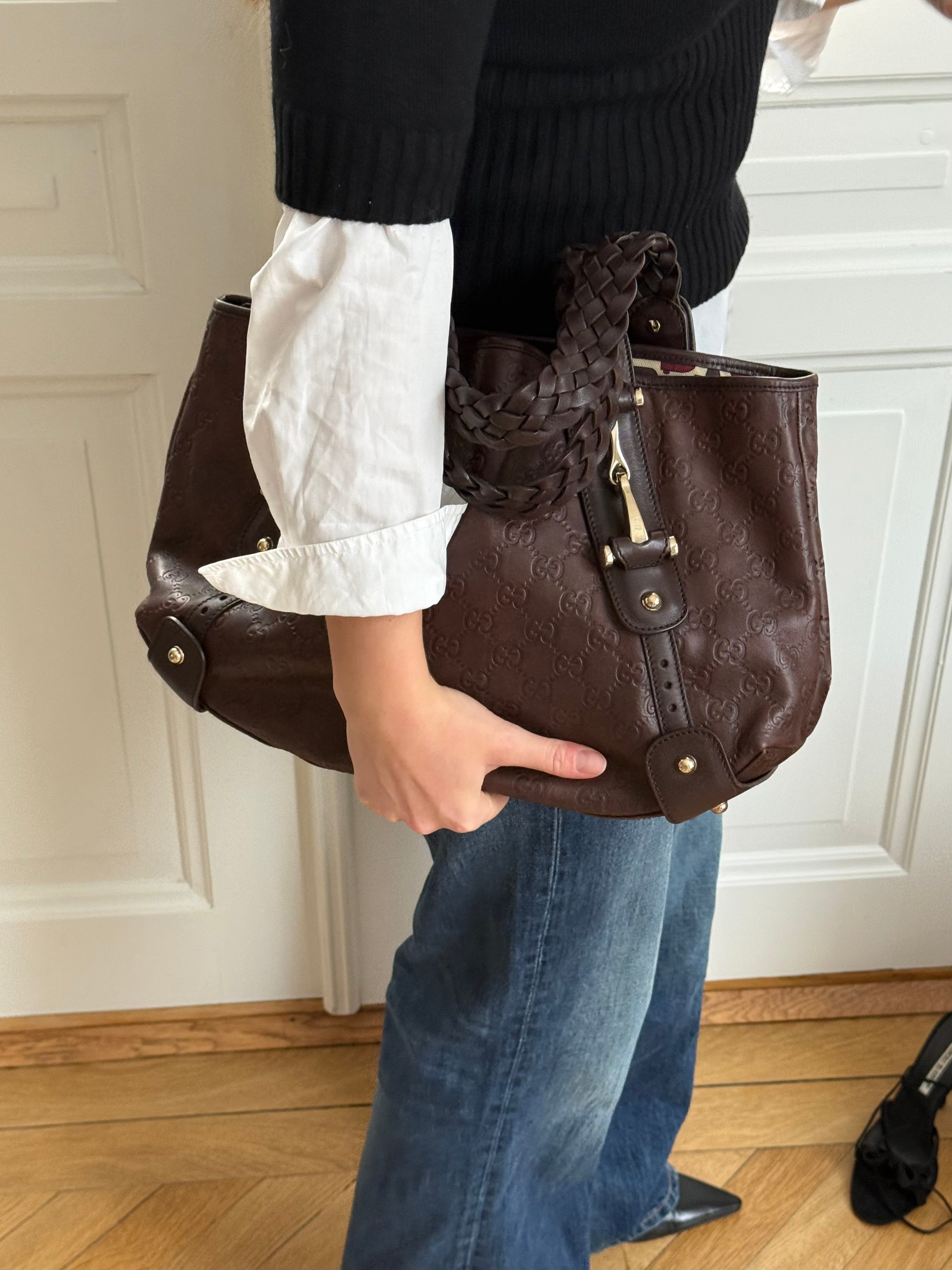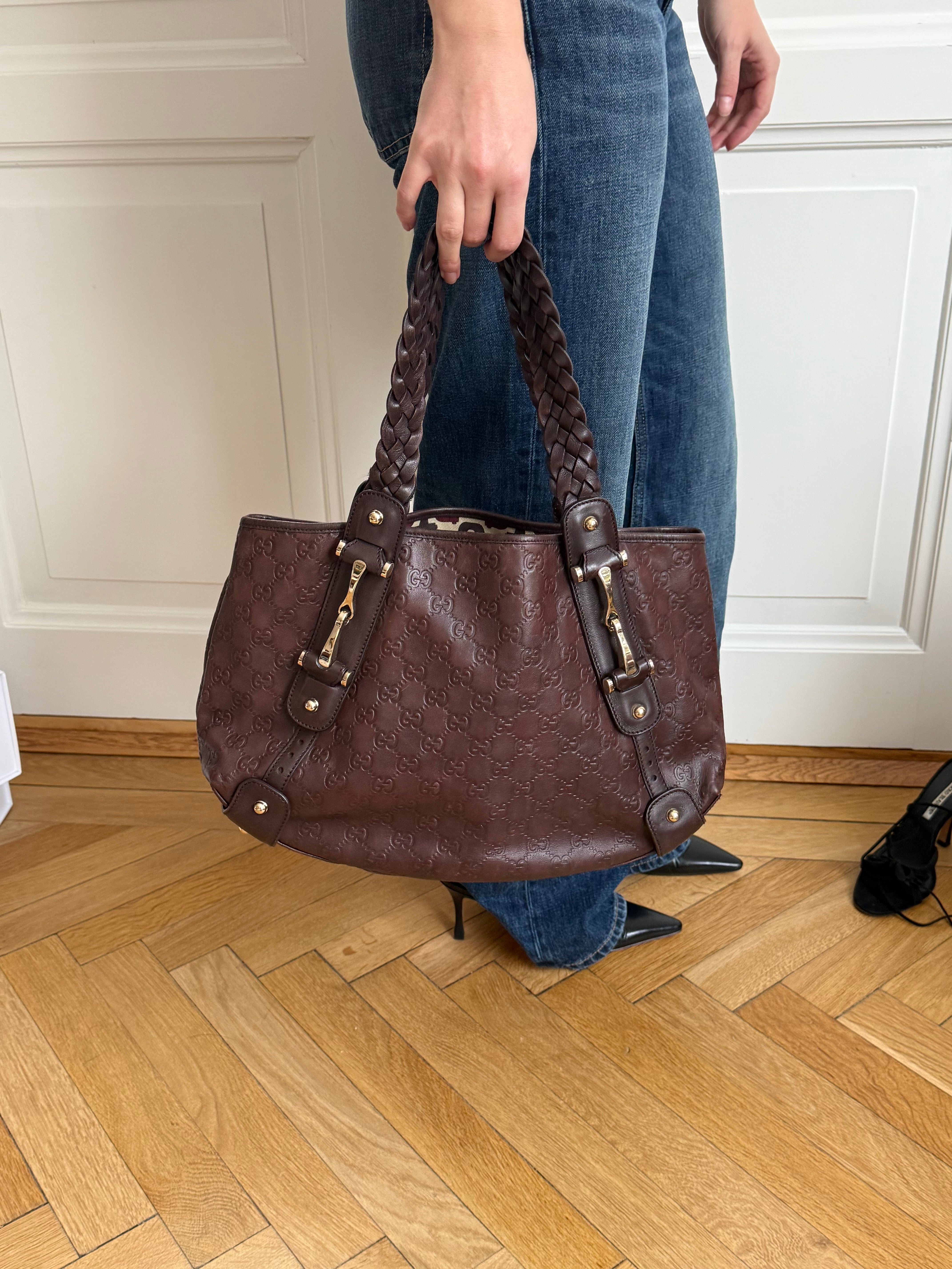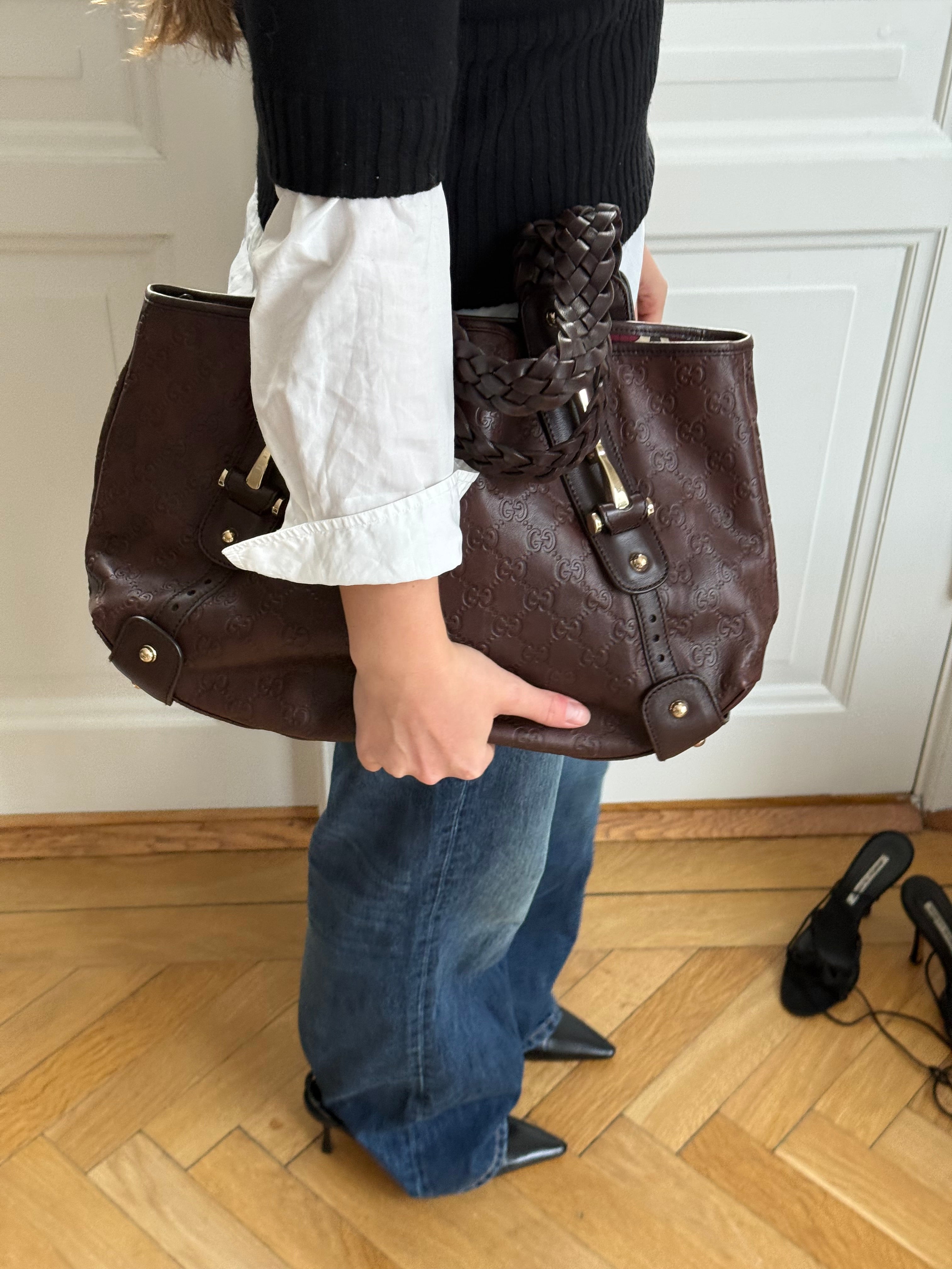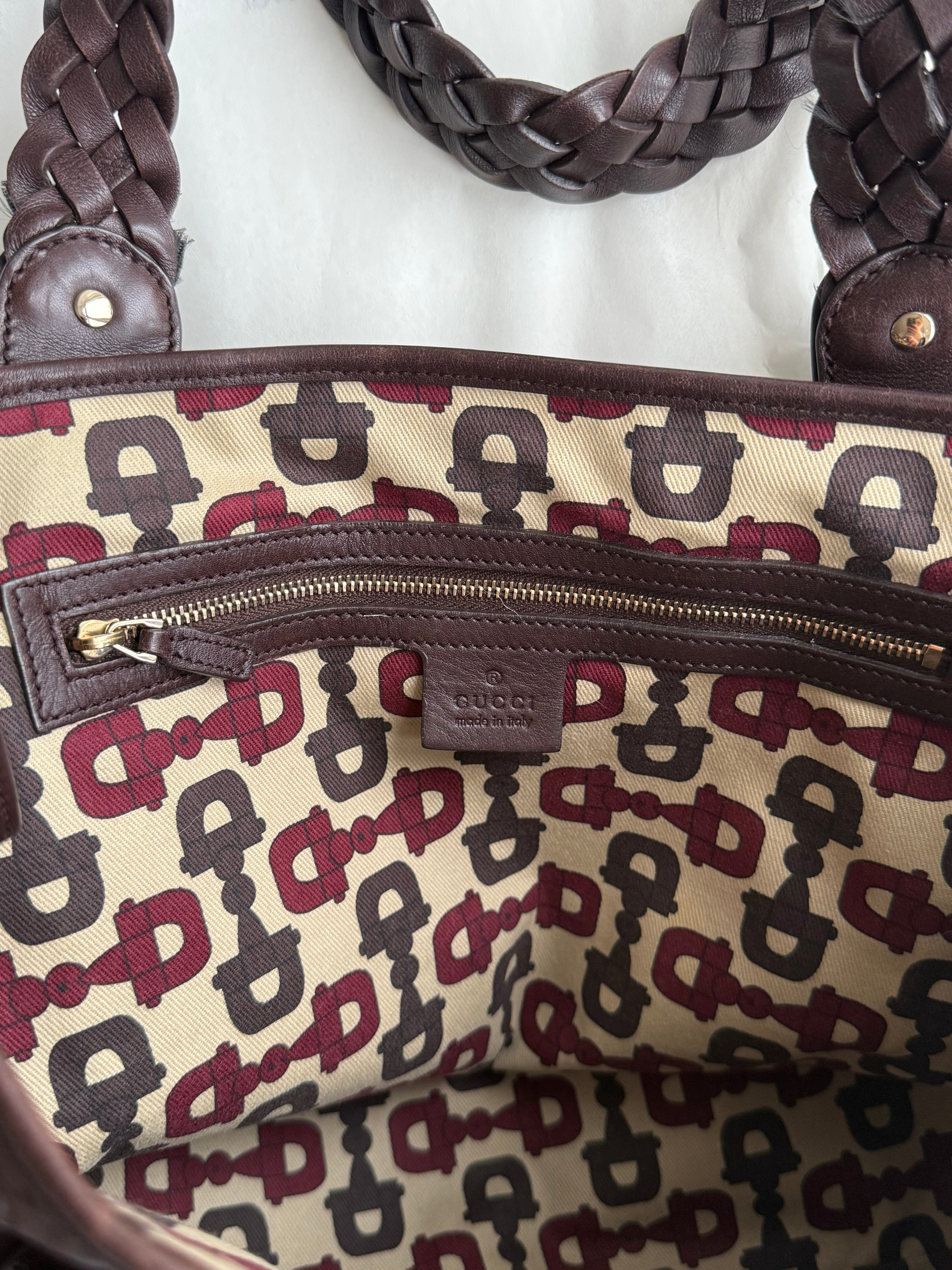 Rare vintage Gucci Guccissima Horsebit Pelham Shoulder Bag with braided leather handles and goldtone horsebit hardware. The spacious interior, lined with horsebit printed canvas, provides room for all your essentials. The bag fits a laptop and comes with its original dustbag.