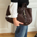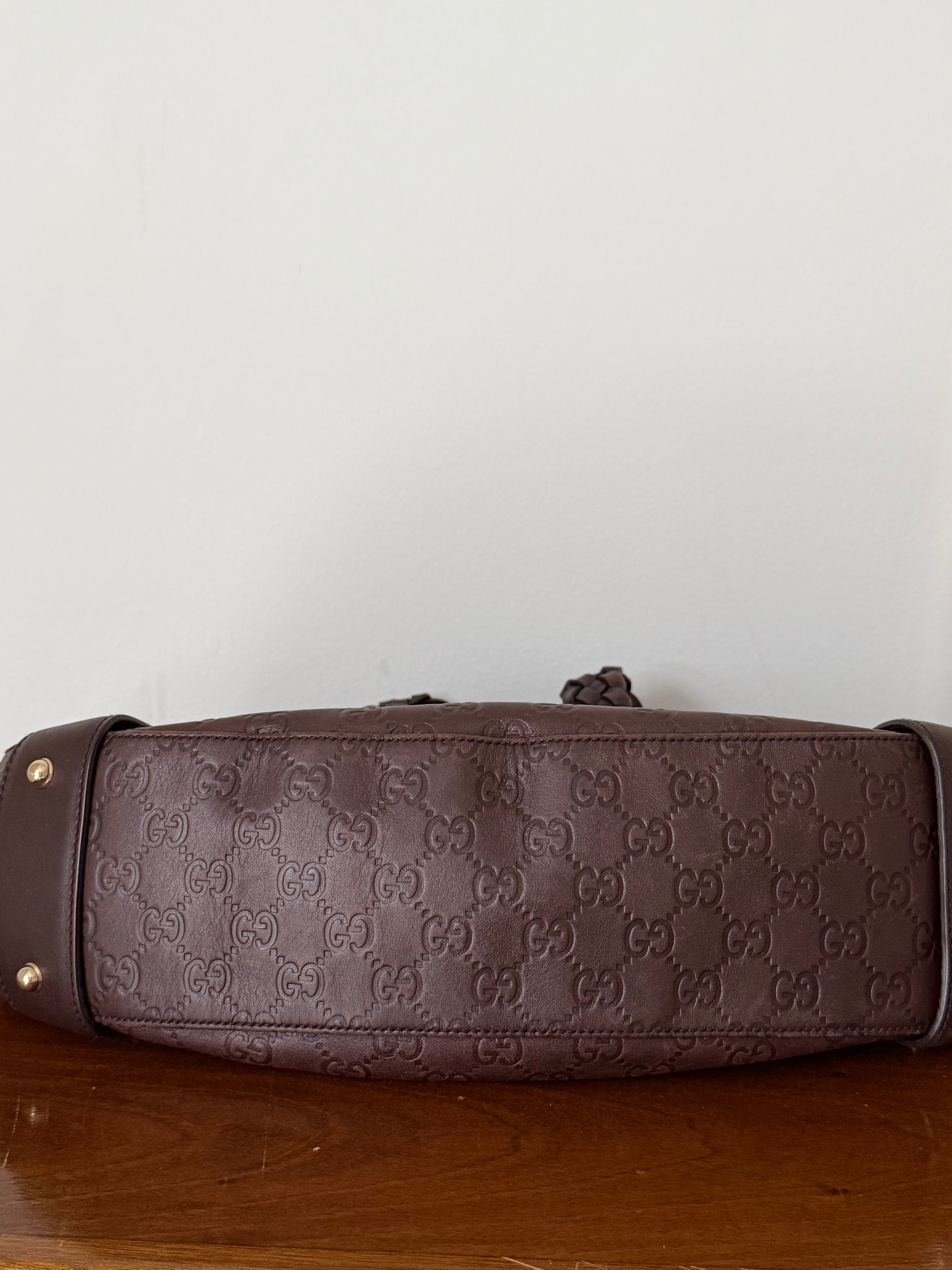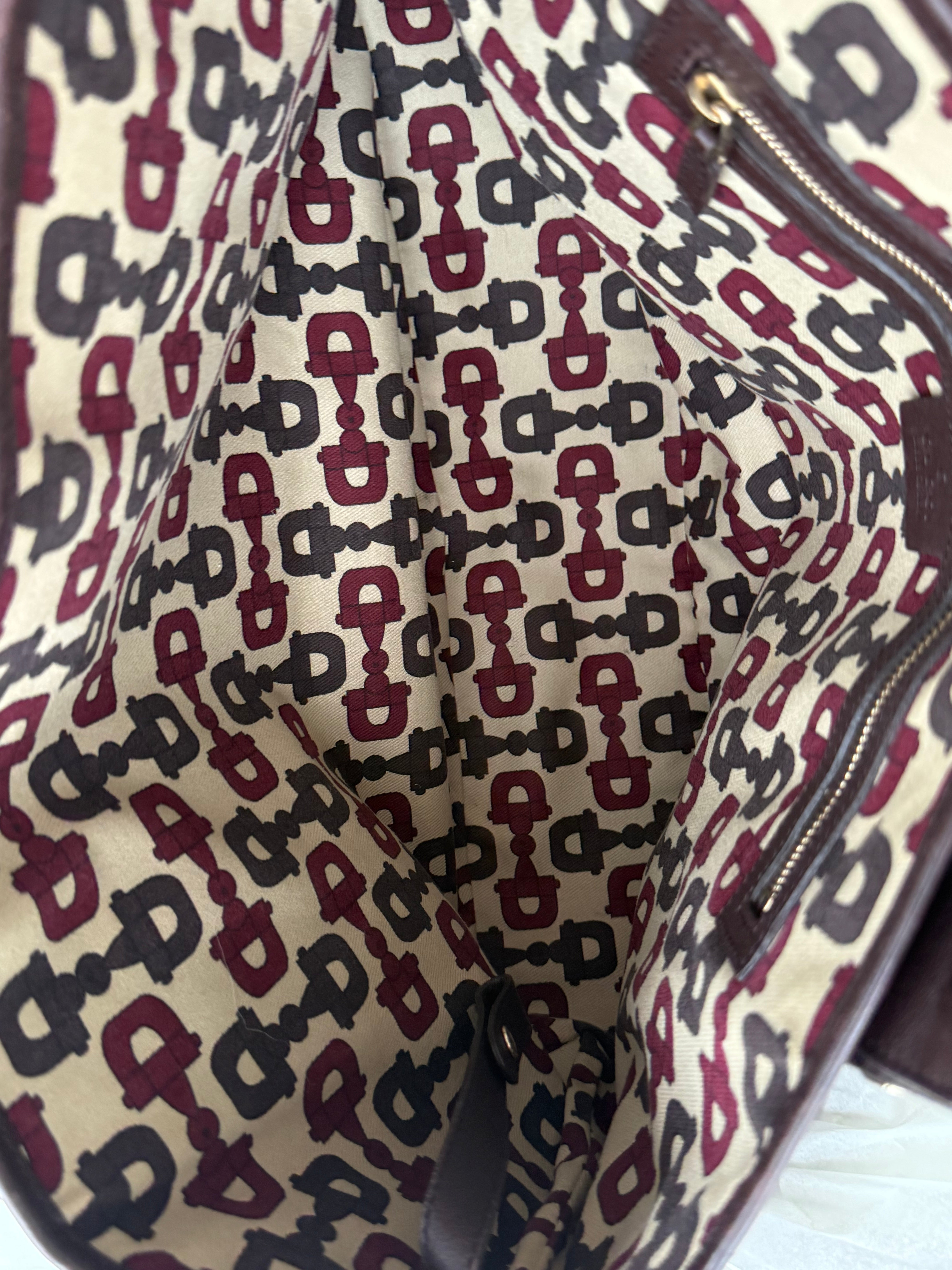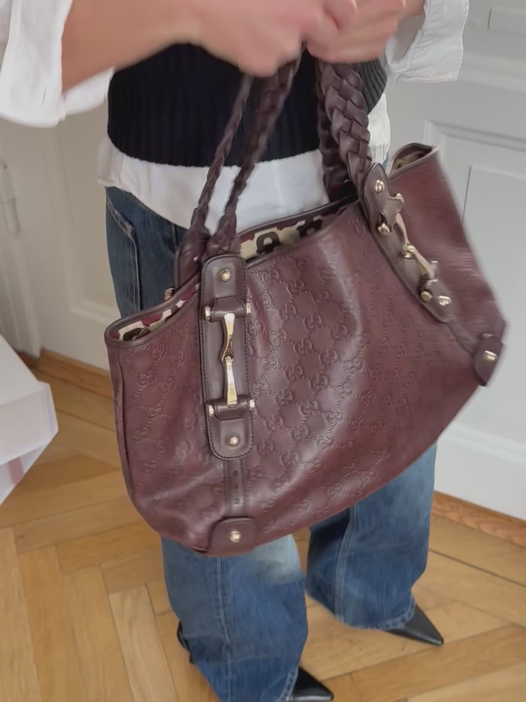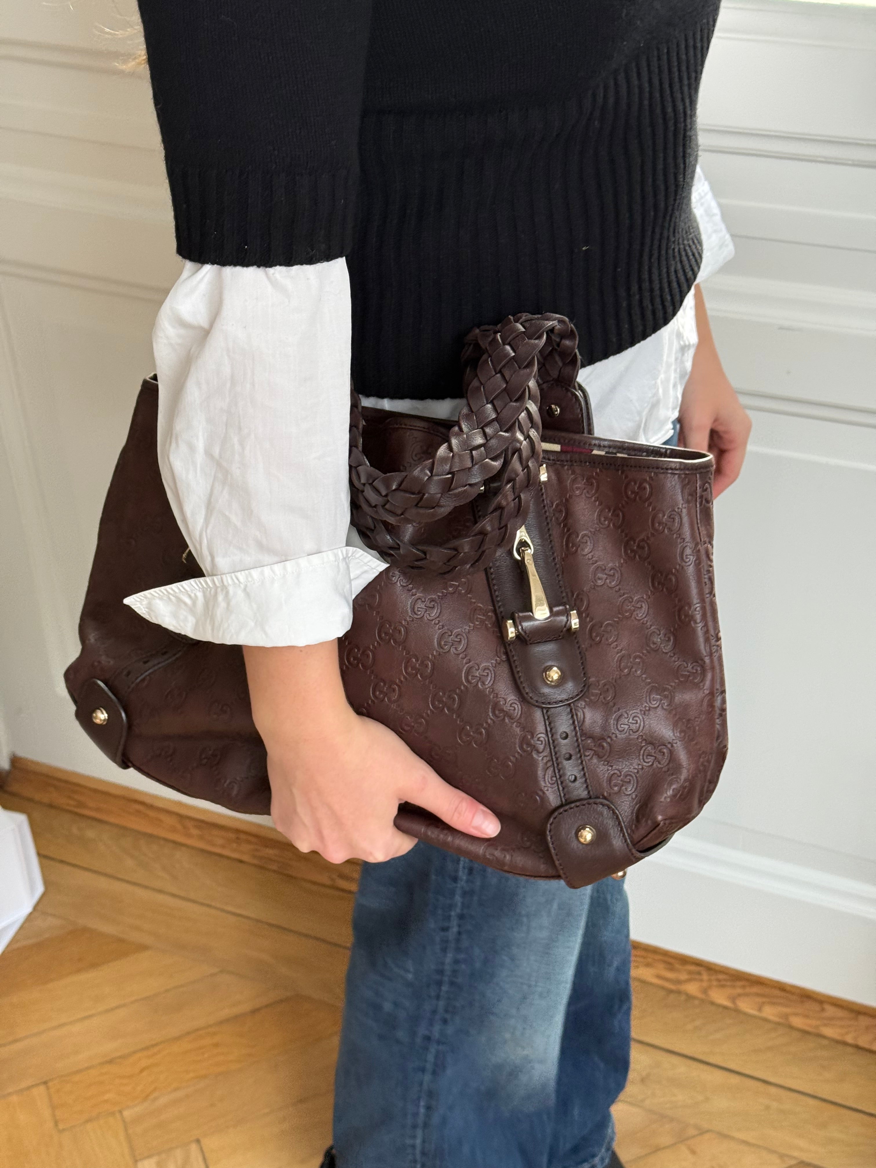 Rare vintage Gucci Guccissima Horsebit Pelham Shoulder Bag with braided leather handles and goldtone horsebit hardware. The spacious interior, lined with horsebit printed canvas, provides room for all your essentials. The bag fits a laptop and comes with its original dustbag.