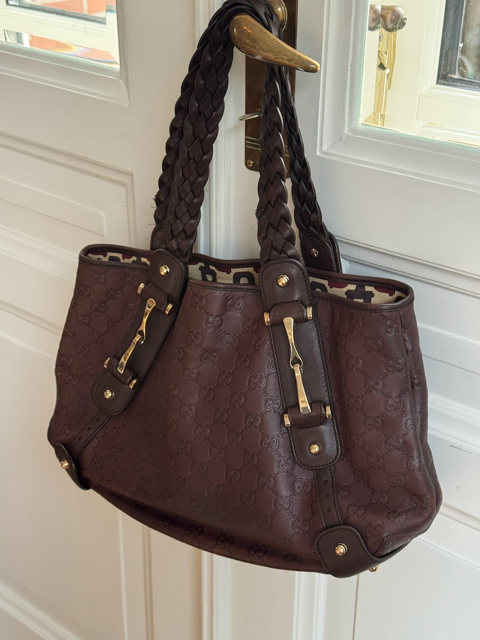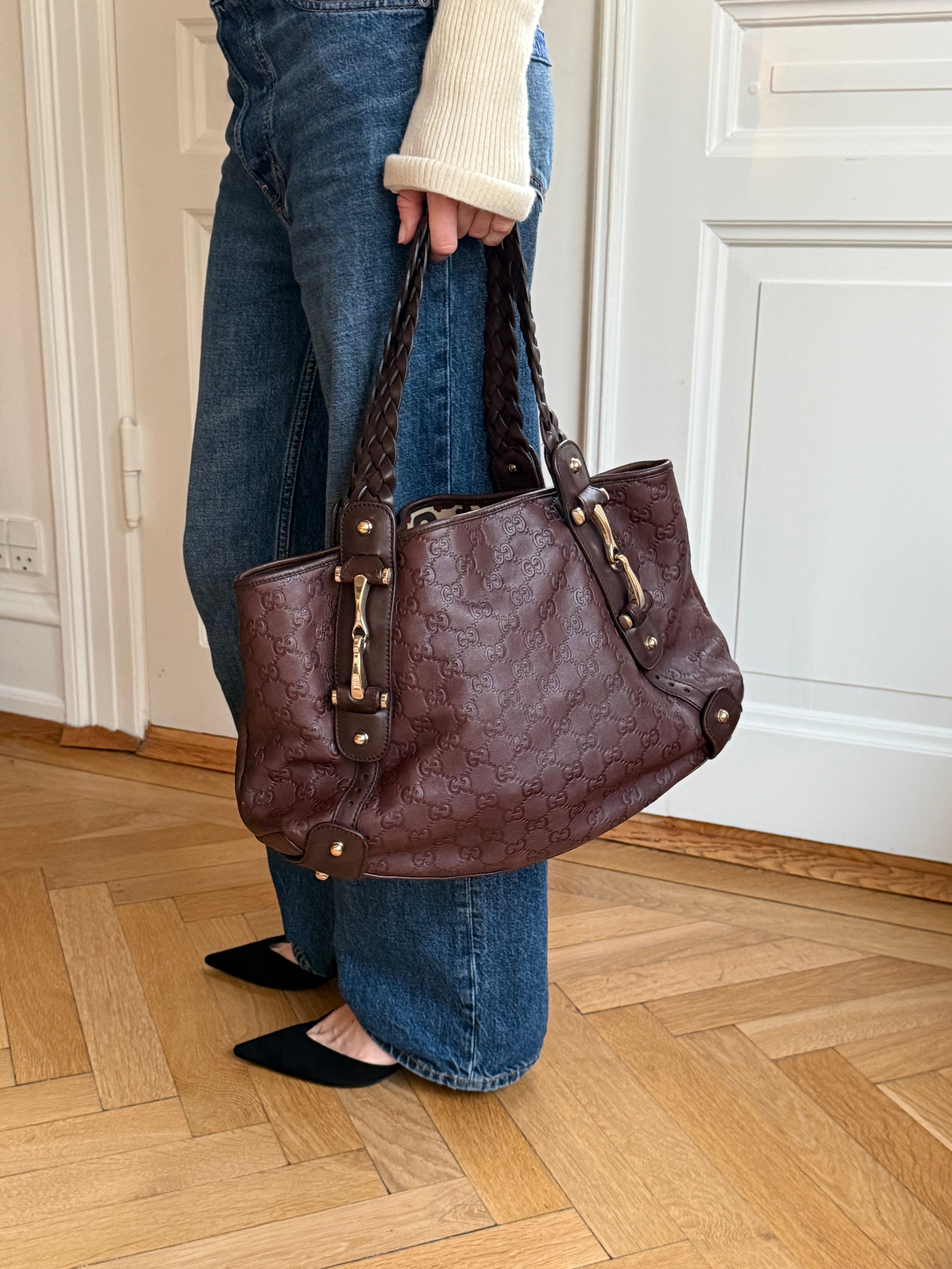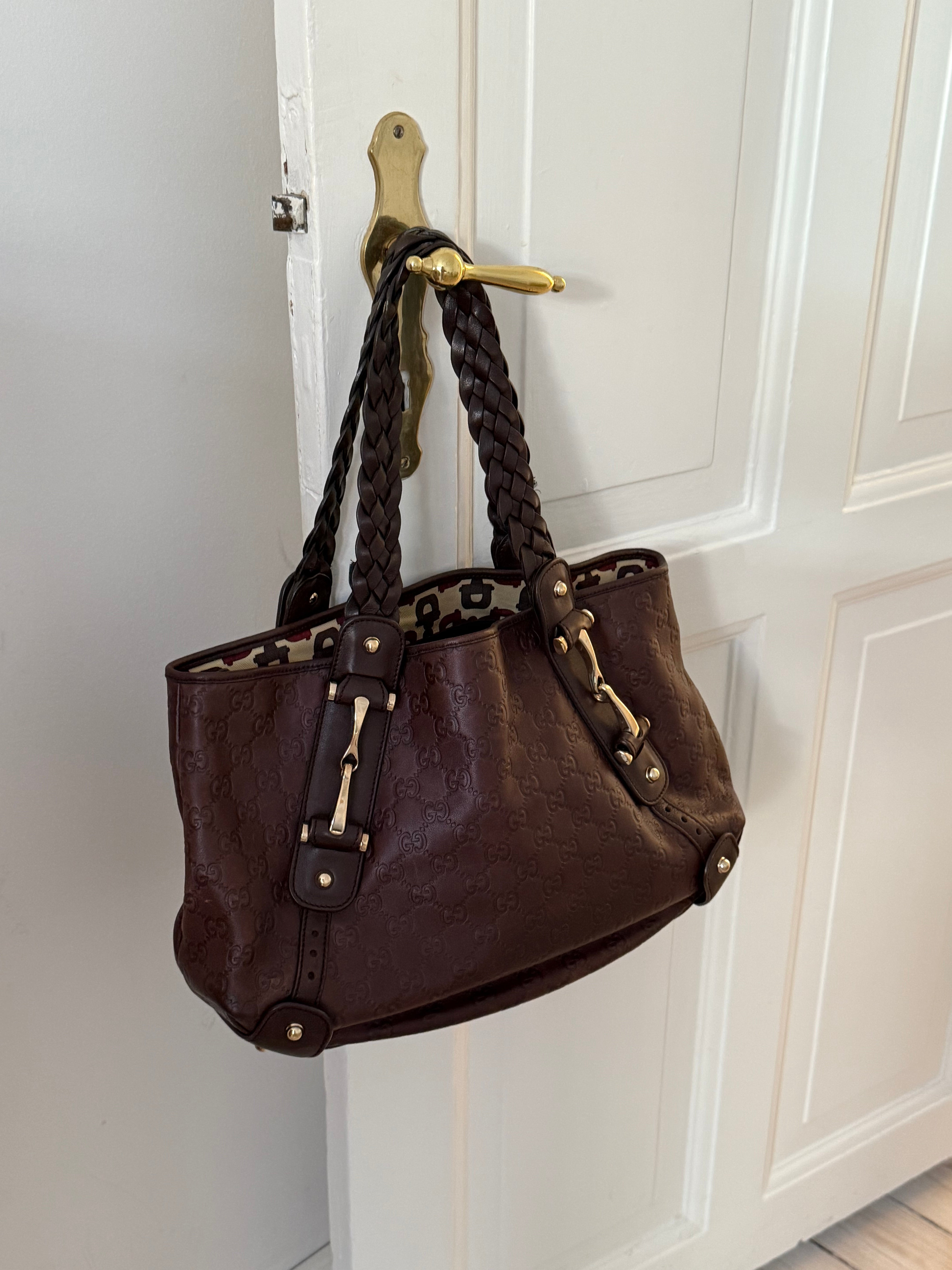 Rare vintage Gucci Guccissima Horsebit Pelham Shoulder Bag with braided leather handles and goldtone horsebit hardware. The spacious interior, lined with horsebit printed canvas, provides room for all your essentials. The bag fits a laptop and comes with original certificate of authenticity.
