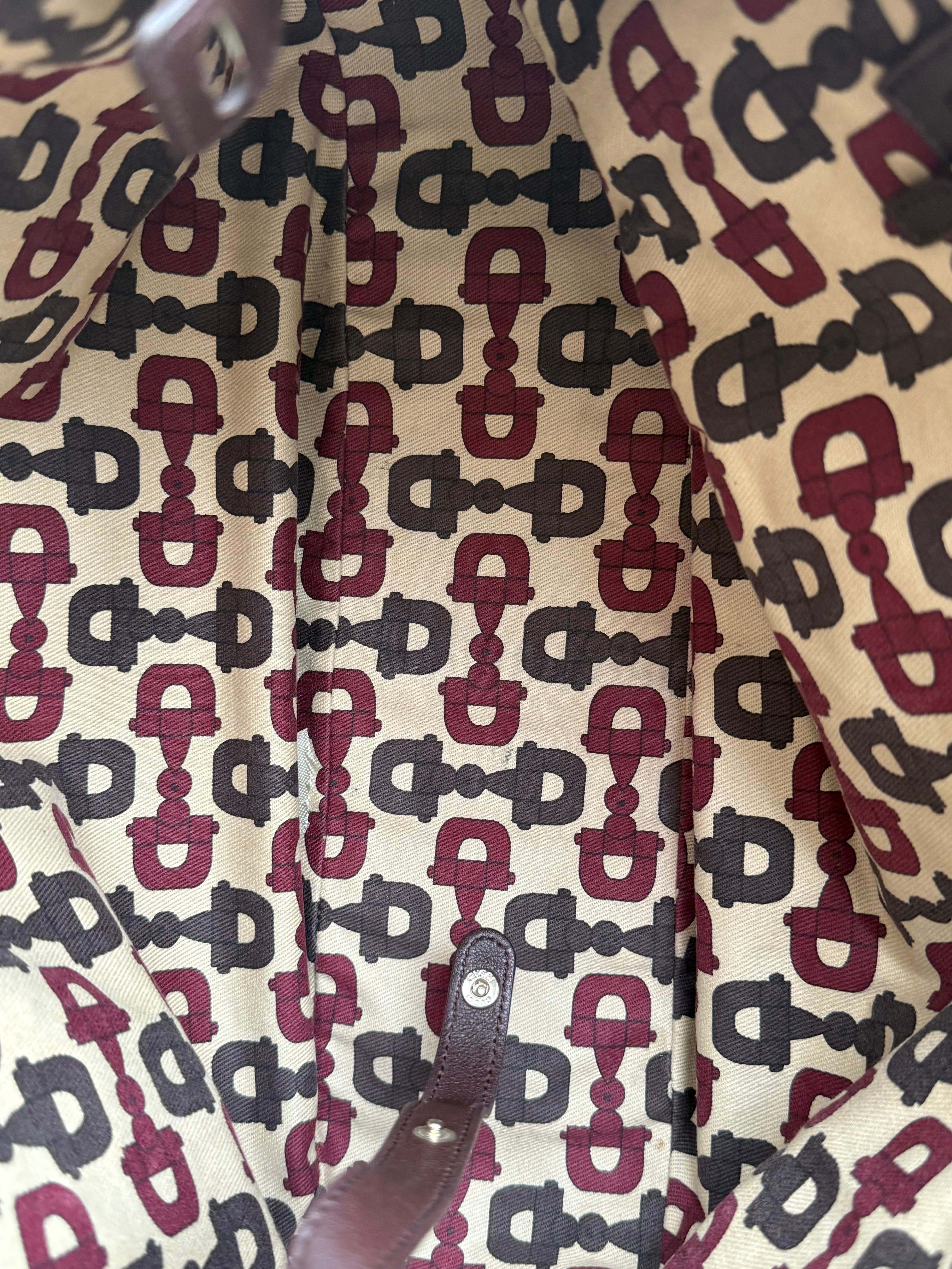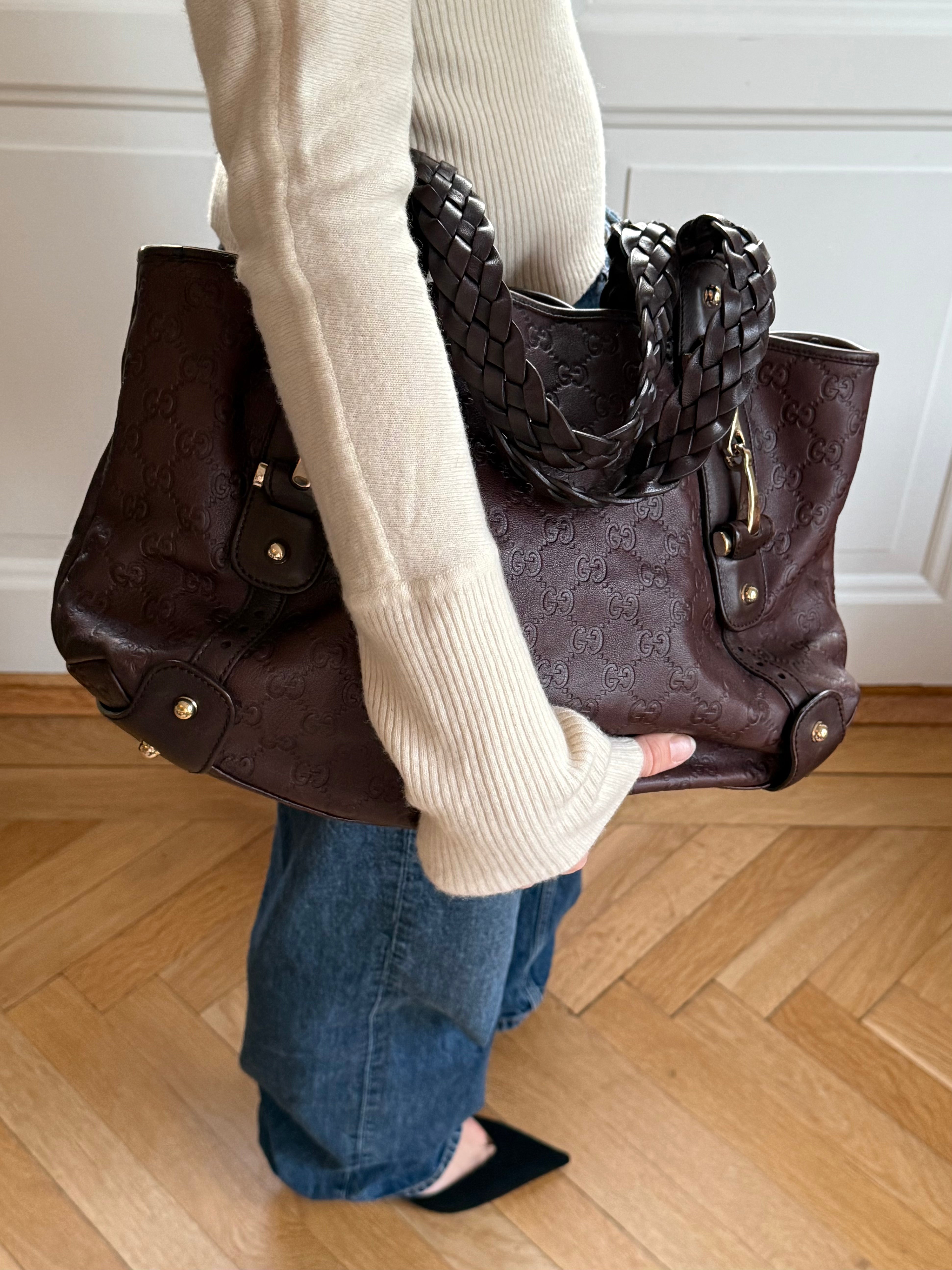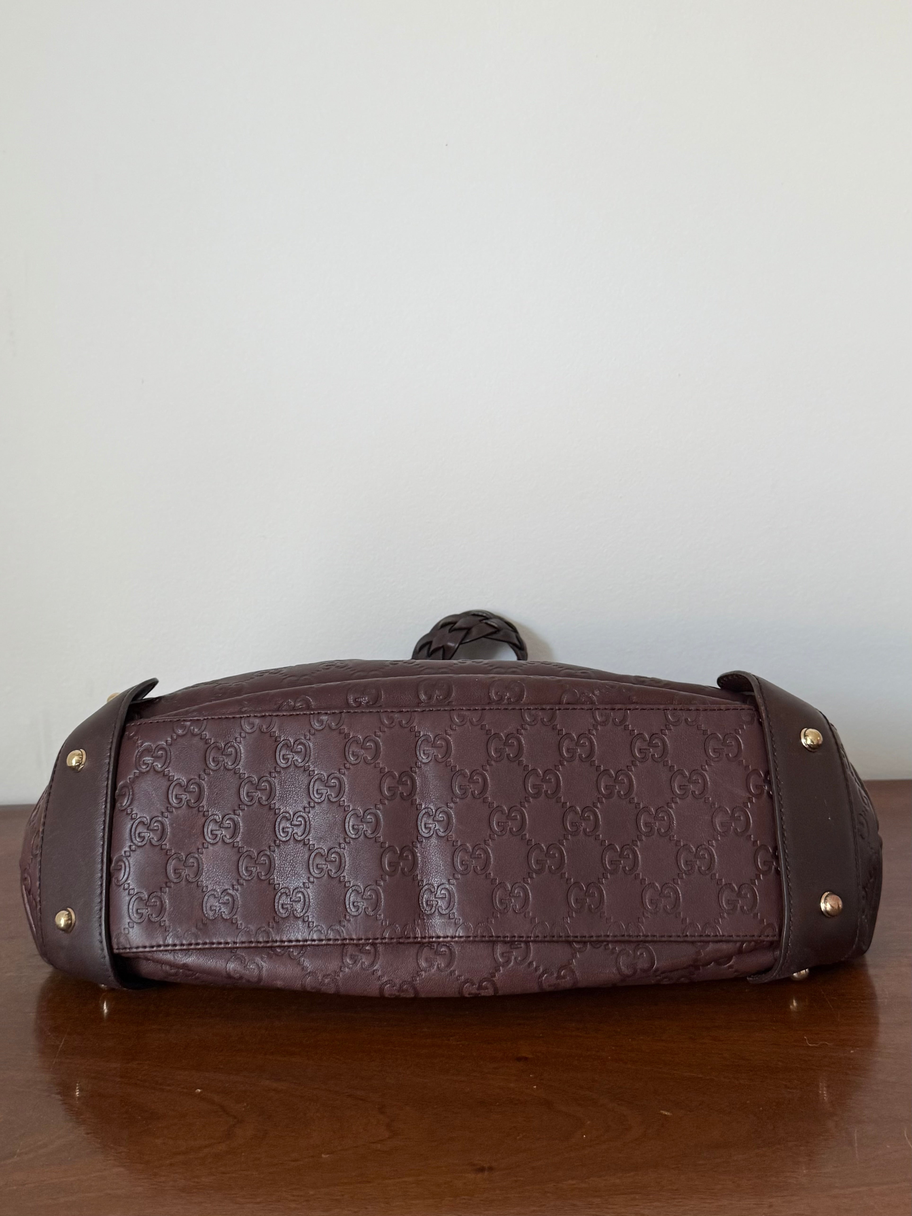 Rare vintage Gucci Guccissima Horsebit Pelham Shoulder Bag with braided leather handles and goldtone horsebit hardware. The spacious interior, lined with horsebit printed canvas, provides room for all your essentials. The bag fits a laptop and comes with original certificate of authenticity.
