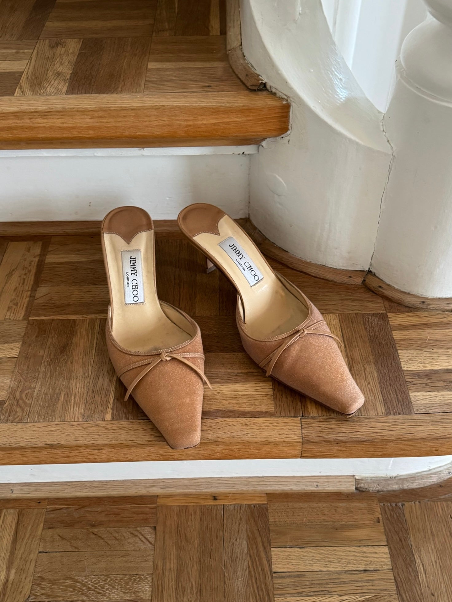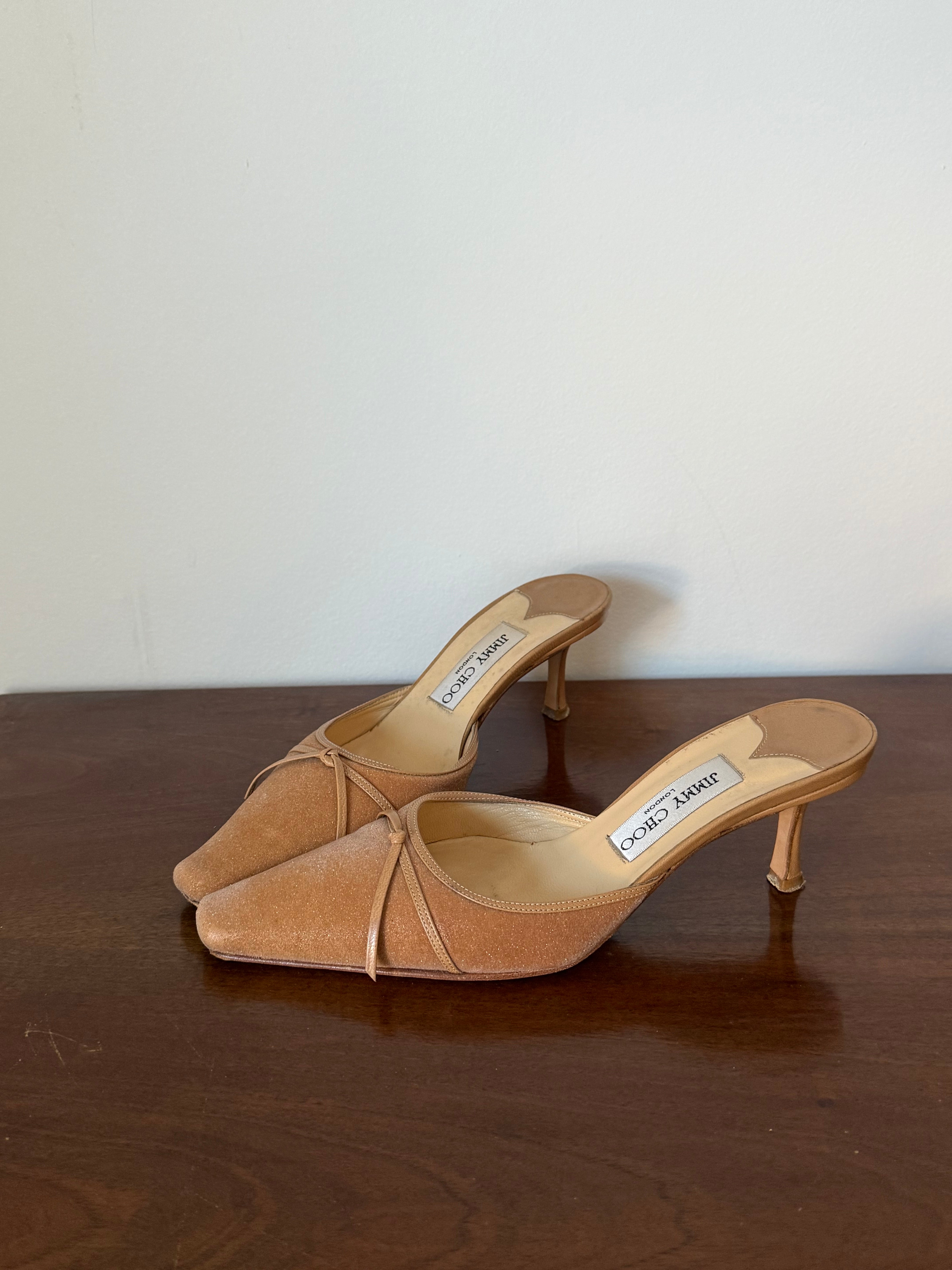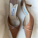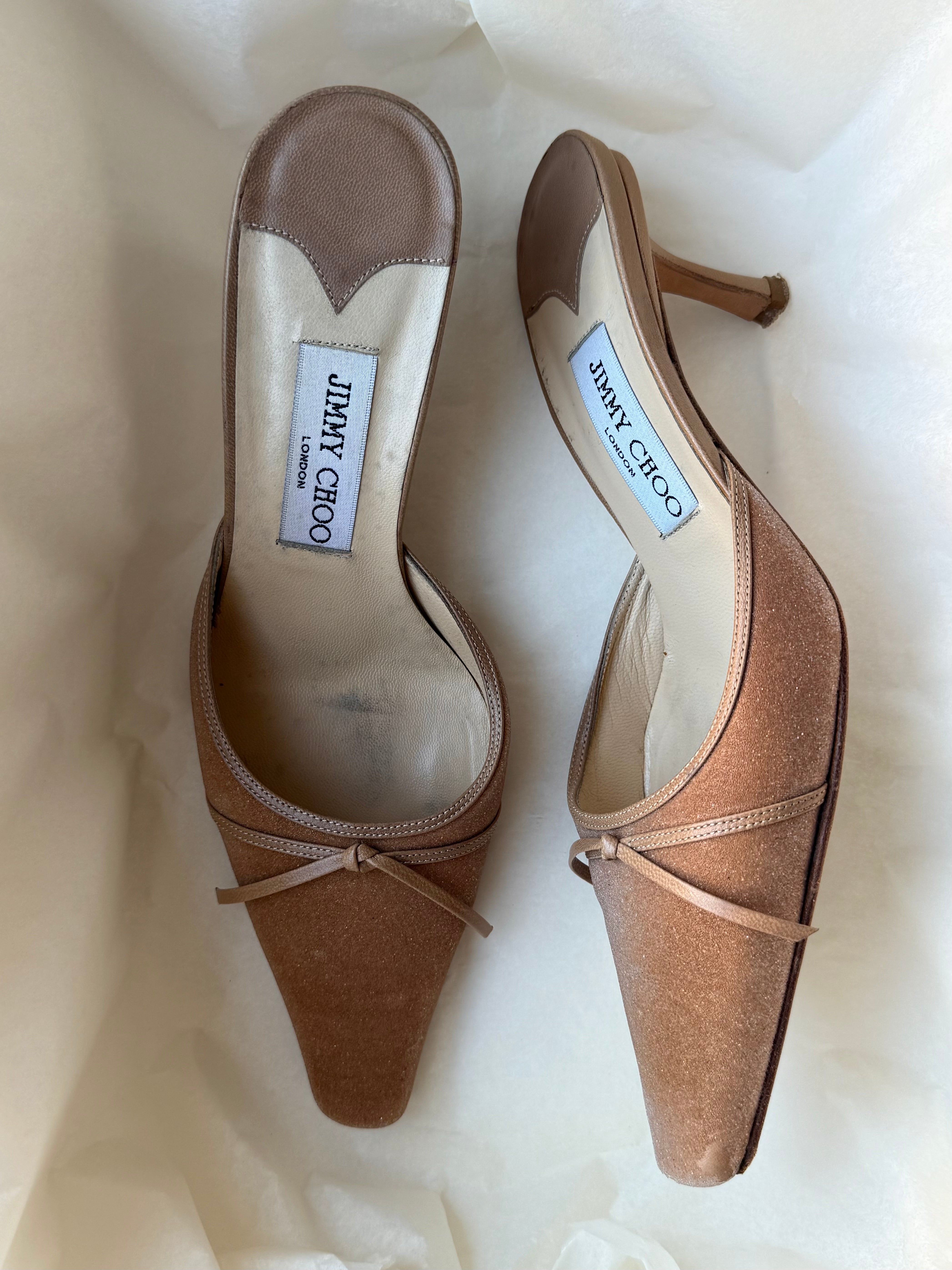 Vintage shimmering Jimmy Choo kitten heels with a pointed toe and slim leather bow detail.