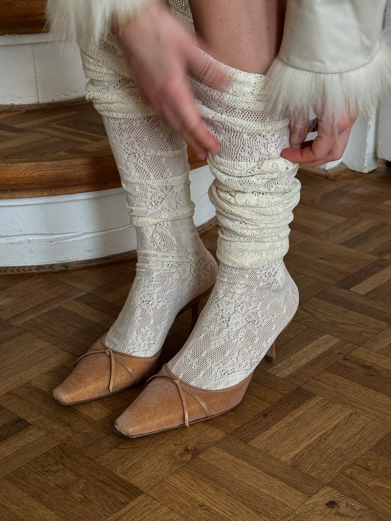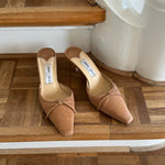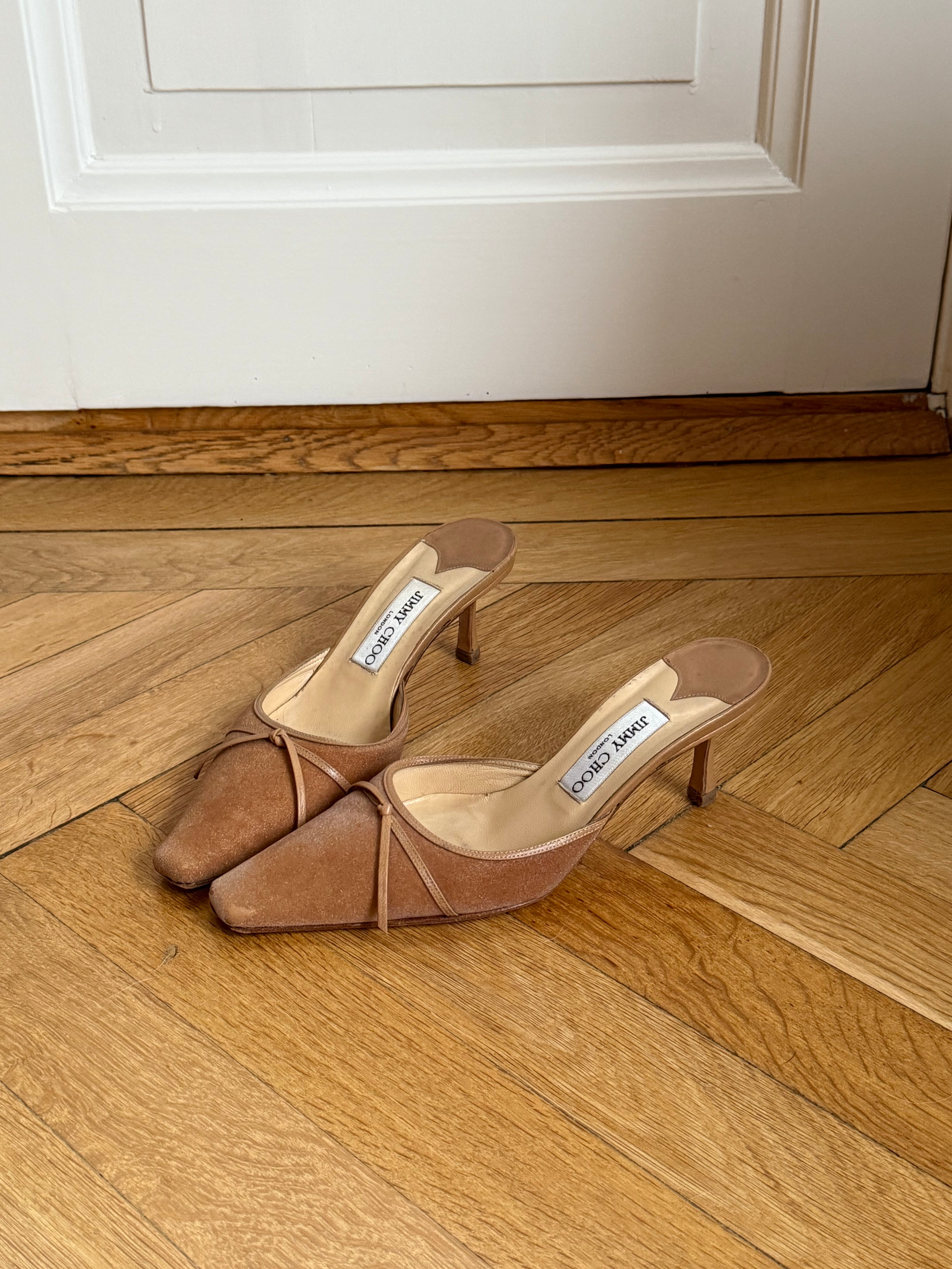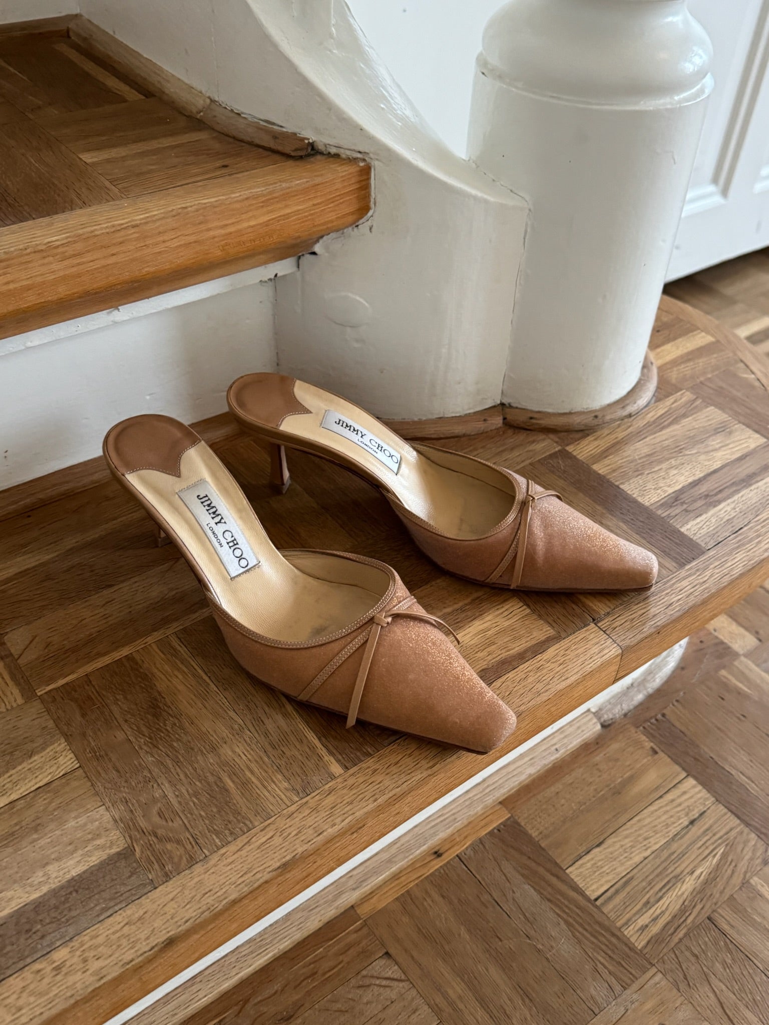 Vintage shimmering Jimmy Choo kitten heels with a pointed toe and slim leather bow detail.