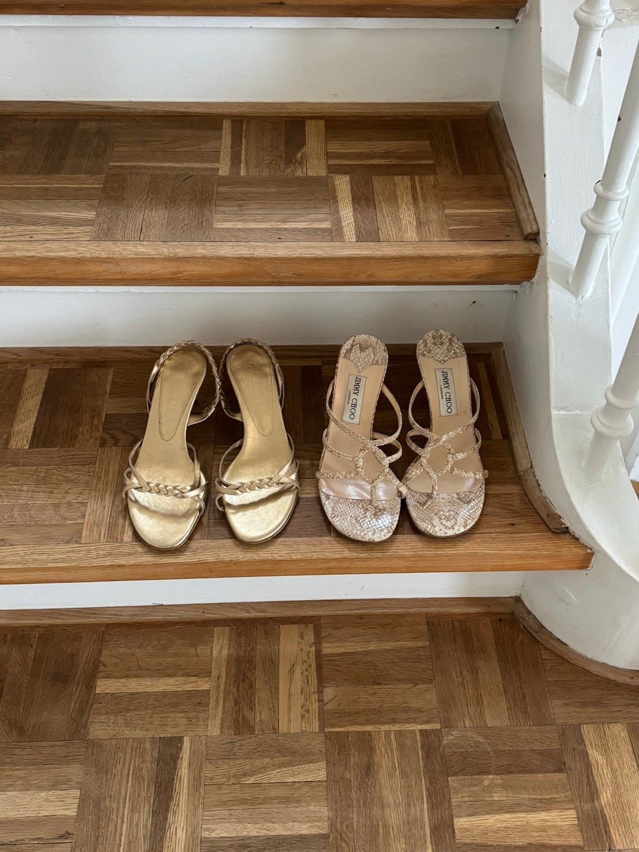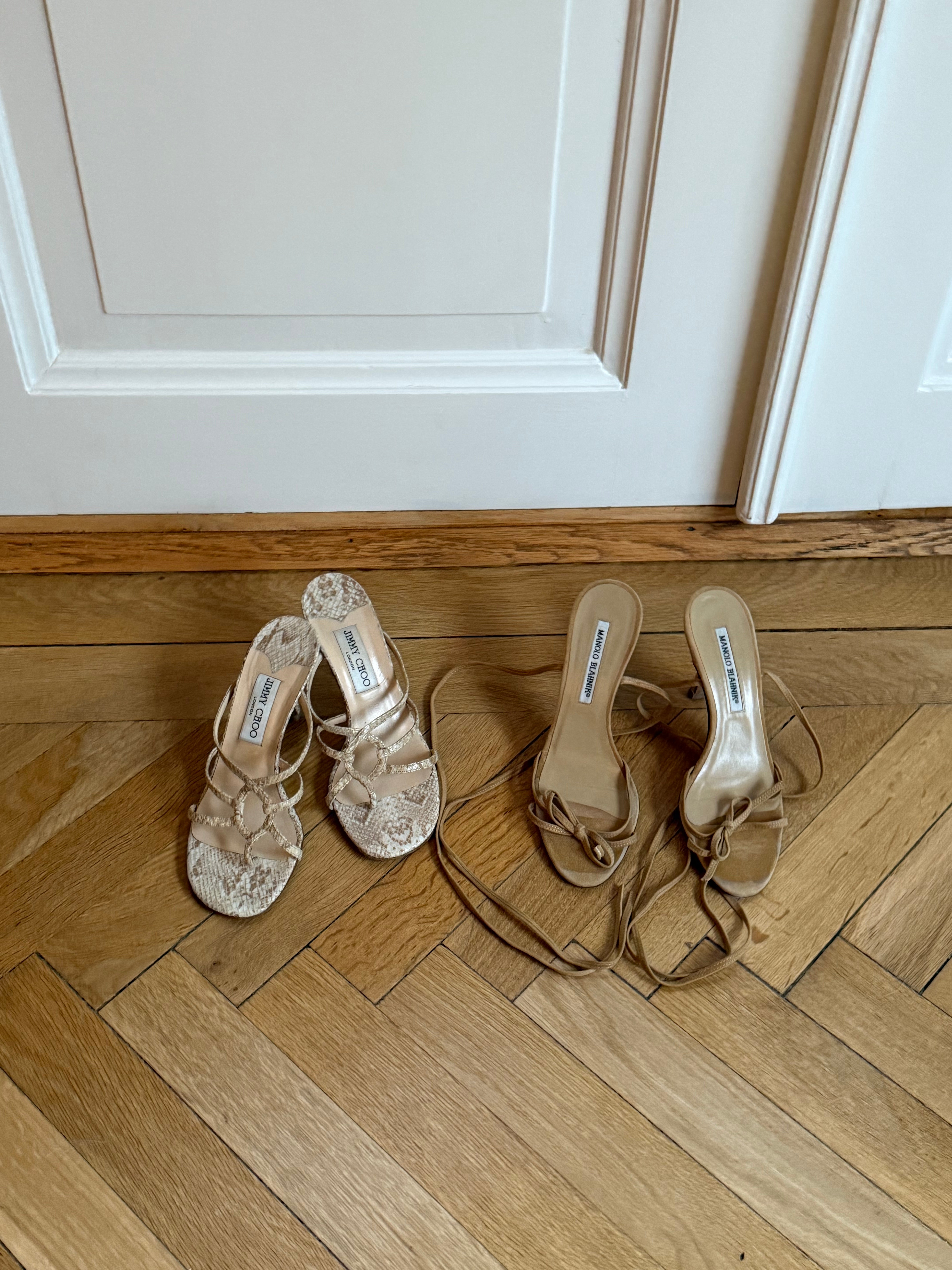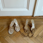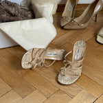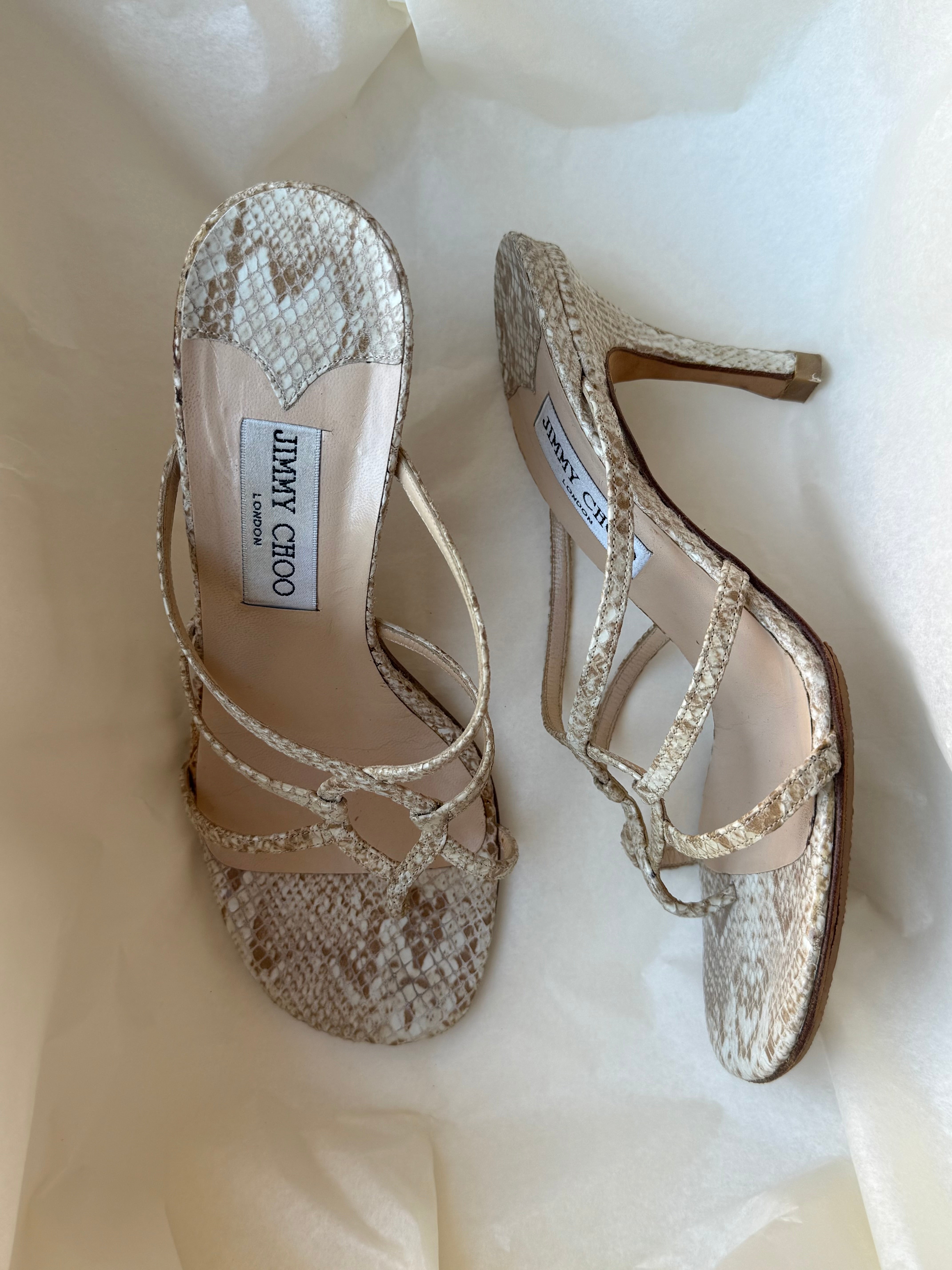 Beautiful Jimmy Choo heeled sandals in beige snakeskin leather with slim straps and an open silhouette.