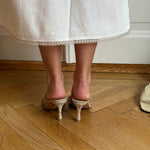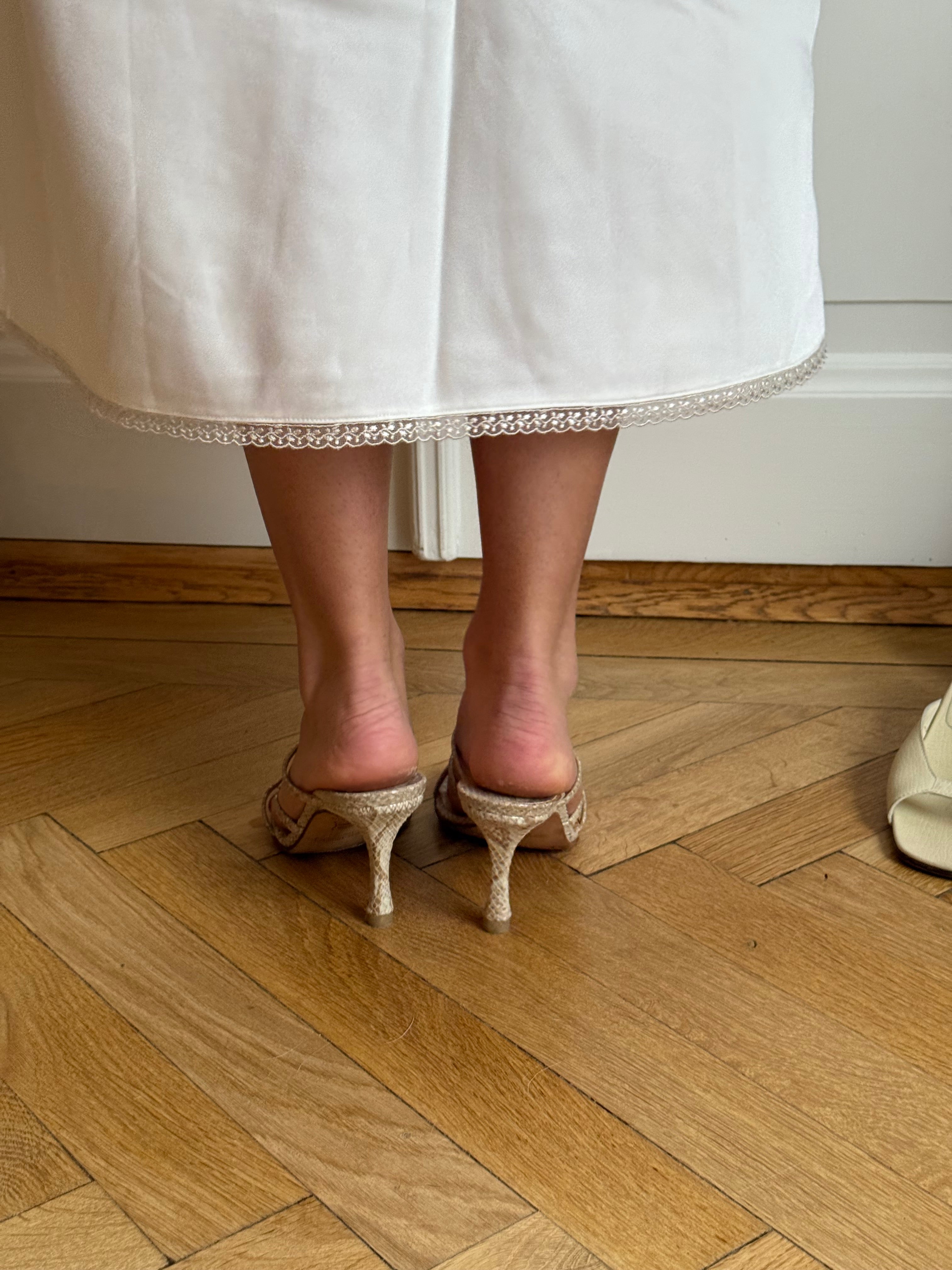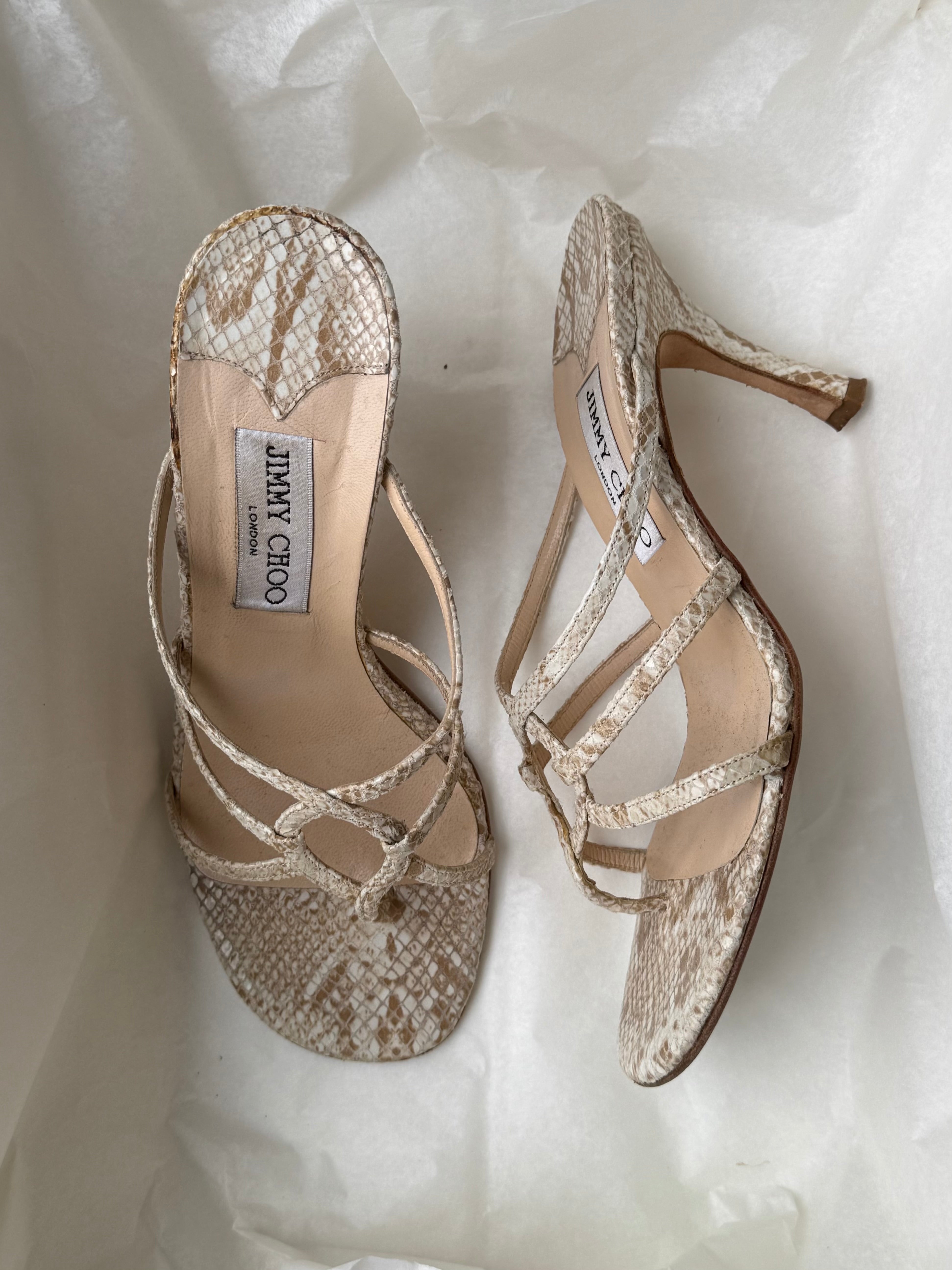 Beautiful Jimmy Choo heeled sandals in beige snakeskin leather with slim straps and an open silhouette. They come in the original box.