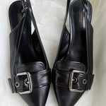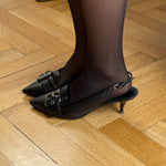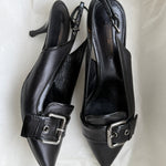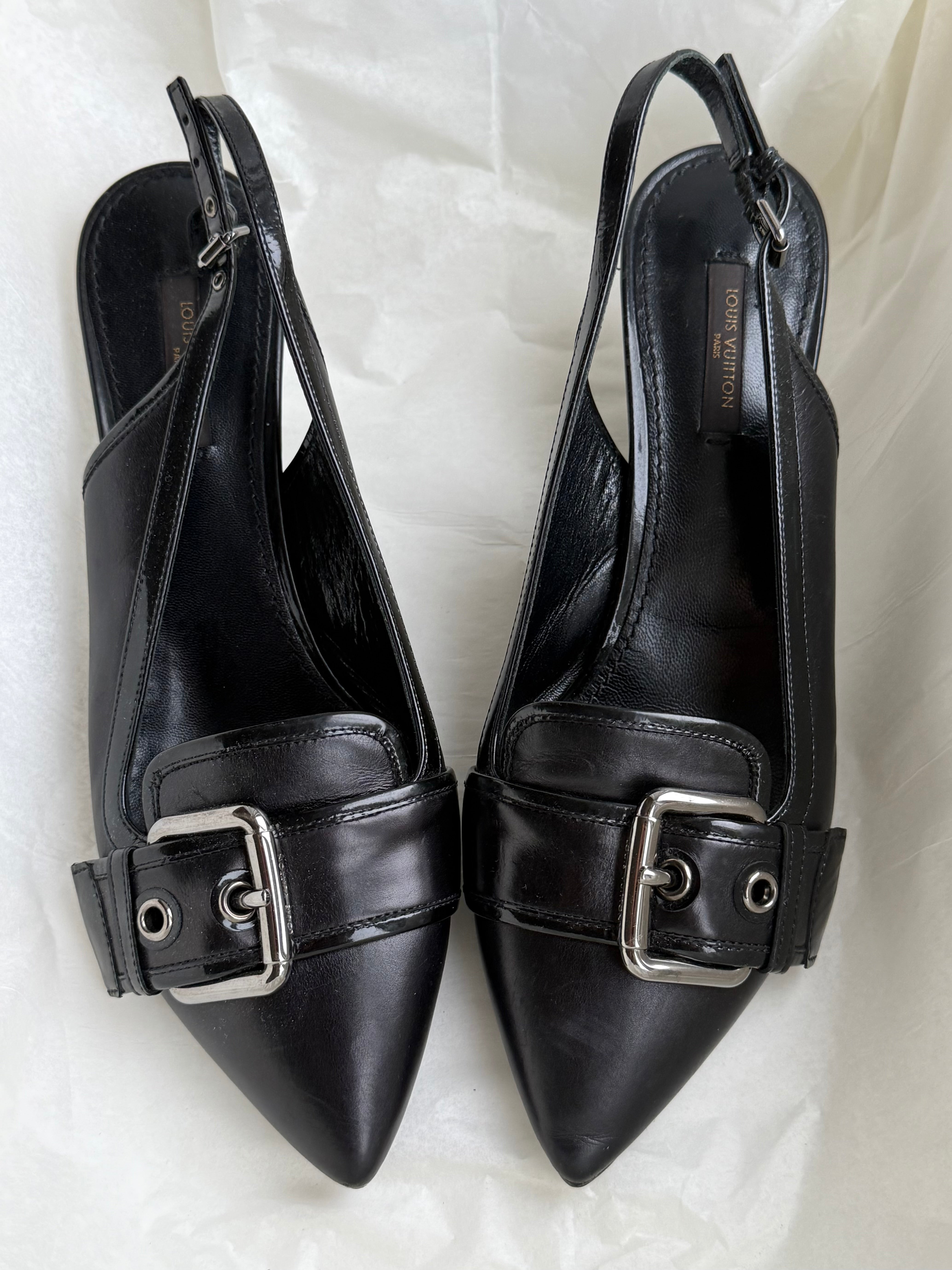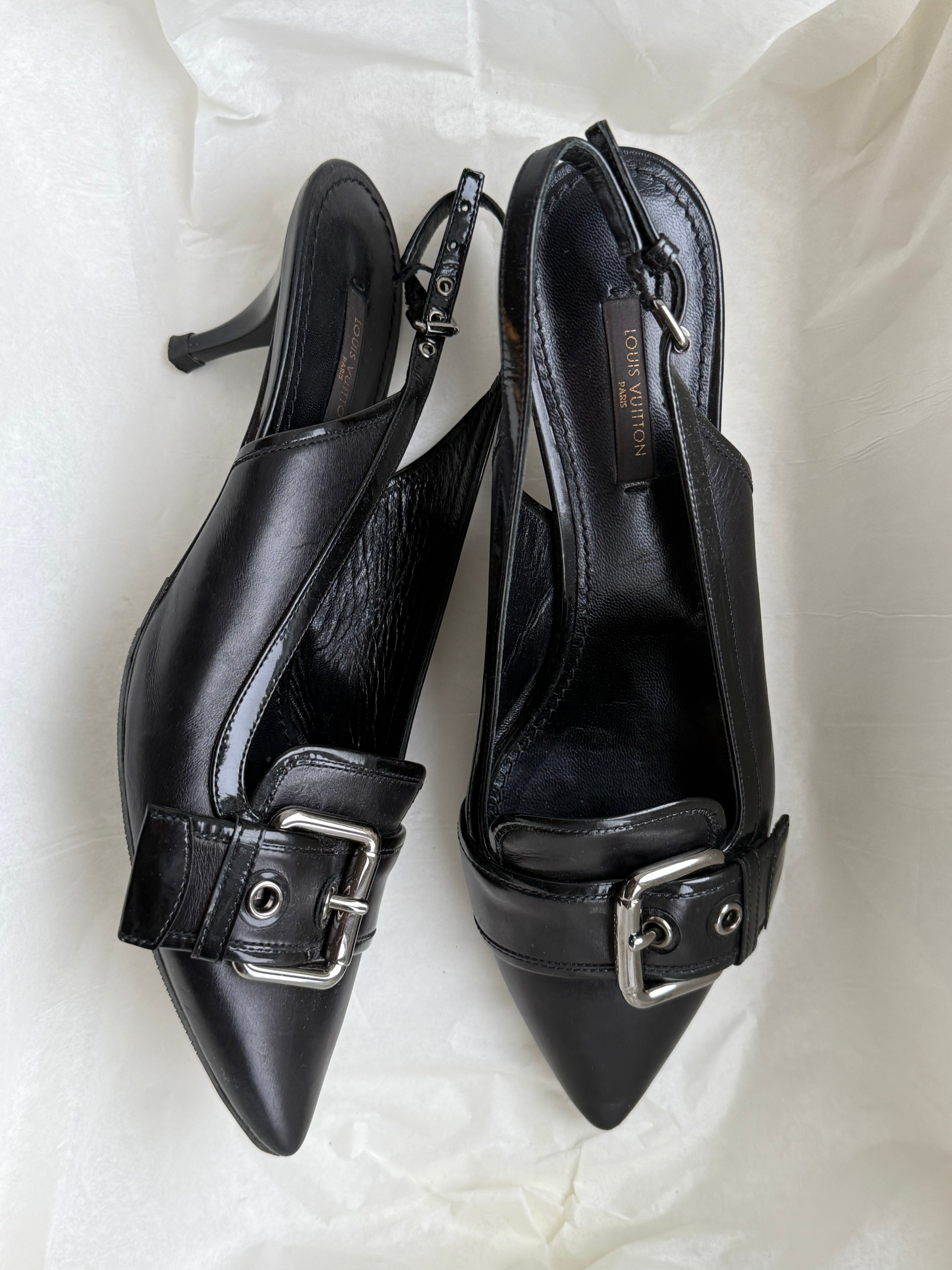 Louis Vuitton black leather slingback heels featuring a pointed toe and bold silver-tone buckle detail.